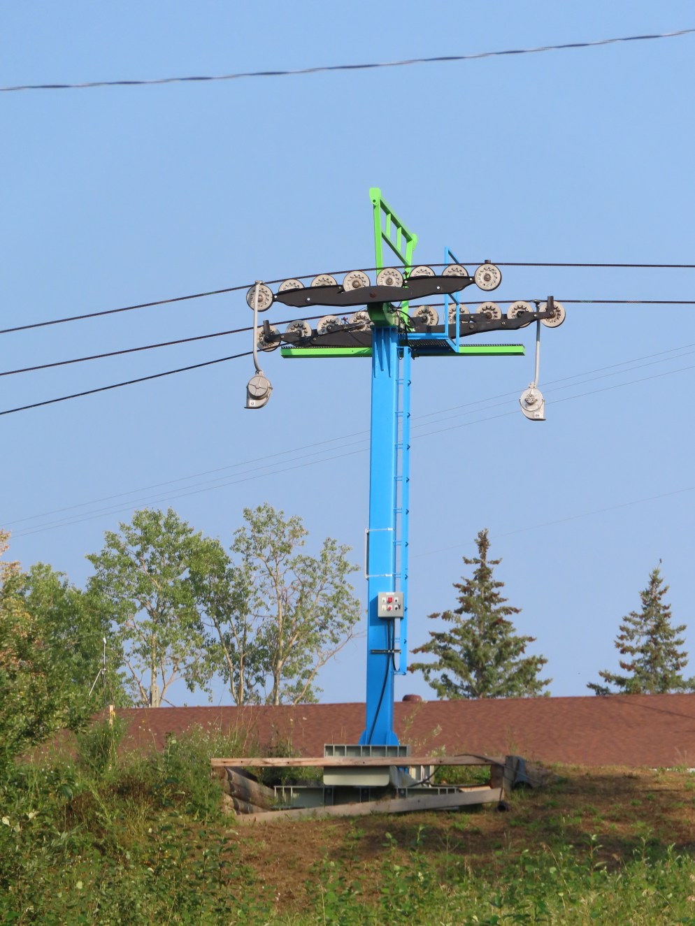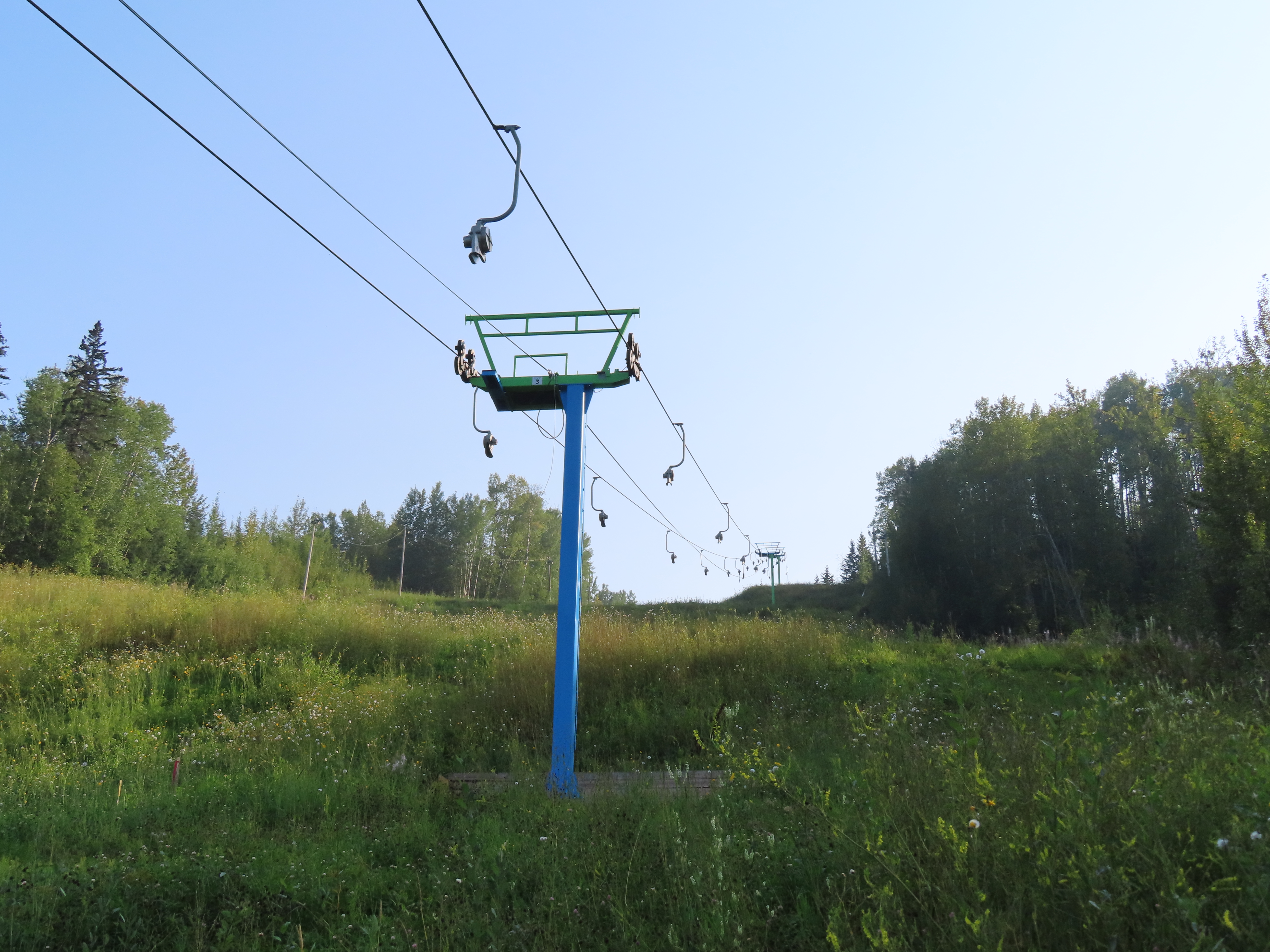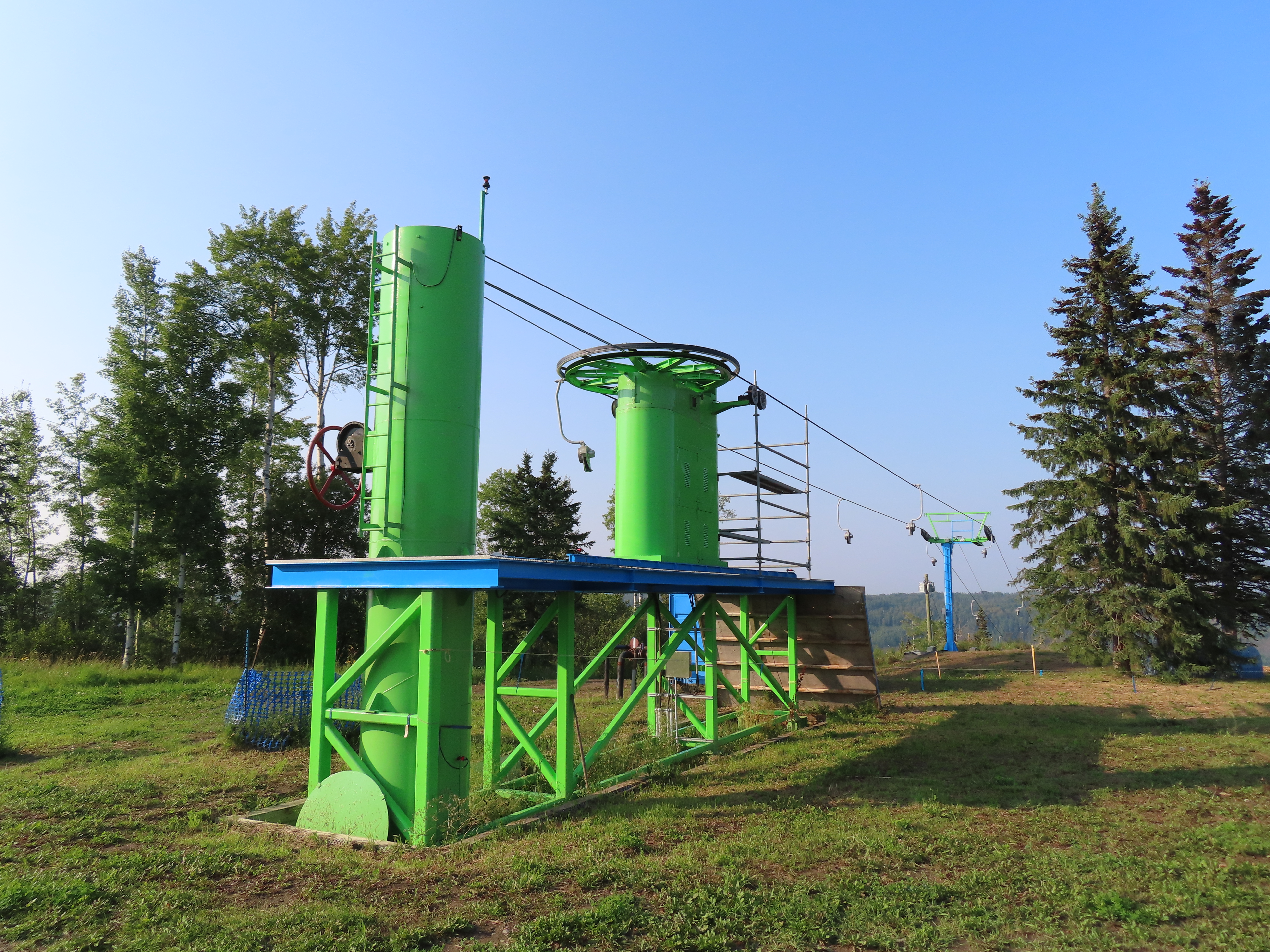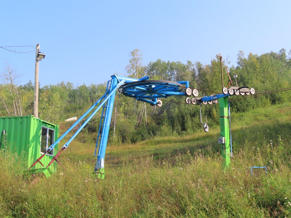 This lift came used from Lake Louise and was converted from a platter to a T-Bar.All the towers are adjustable due to possible ground movement.View up the line from the base terminal.This was the top terminal at Lake Louise but is the bottom here.Another view of the return station.Tower 2.View up at tower 3.Tower foundation.Looking down the line.Upper part of the lift line.Tower 7 side view.View from the summit.Top station with drive and tensioning.Upper station overview.
