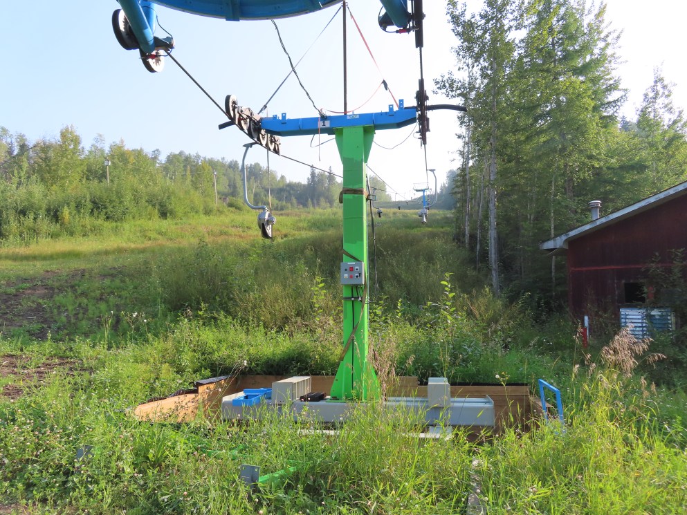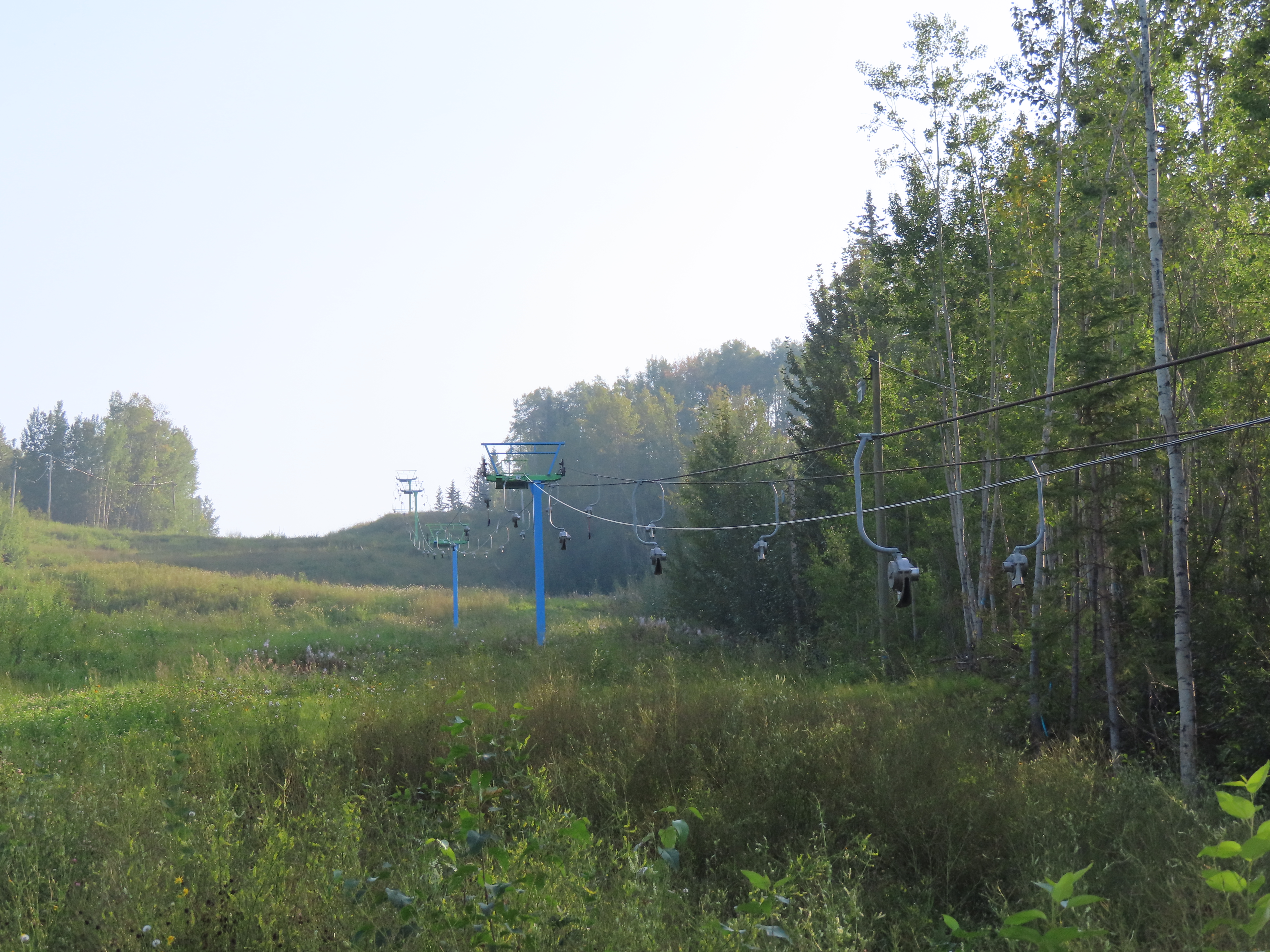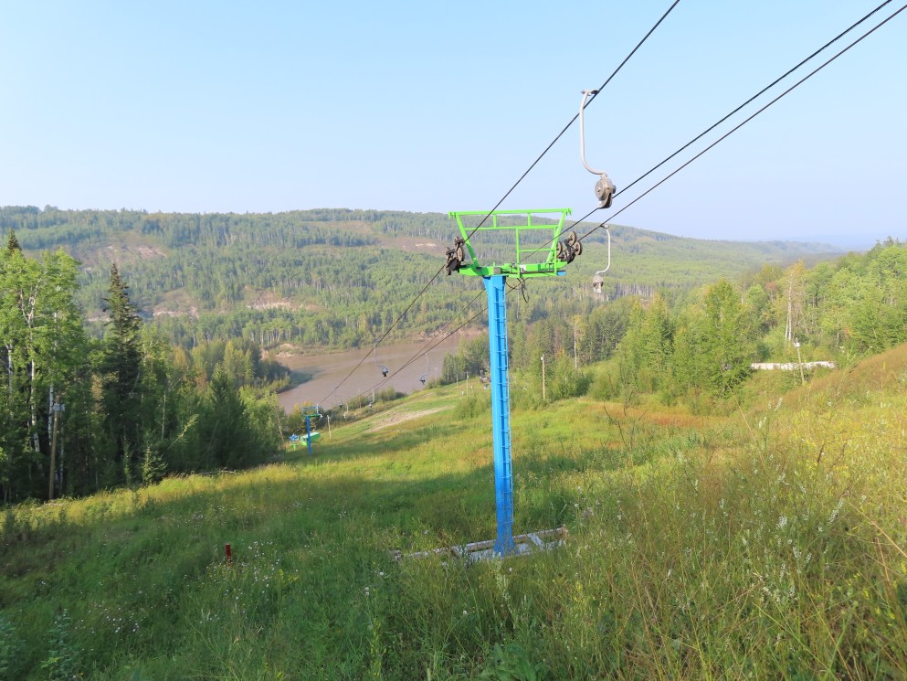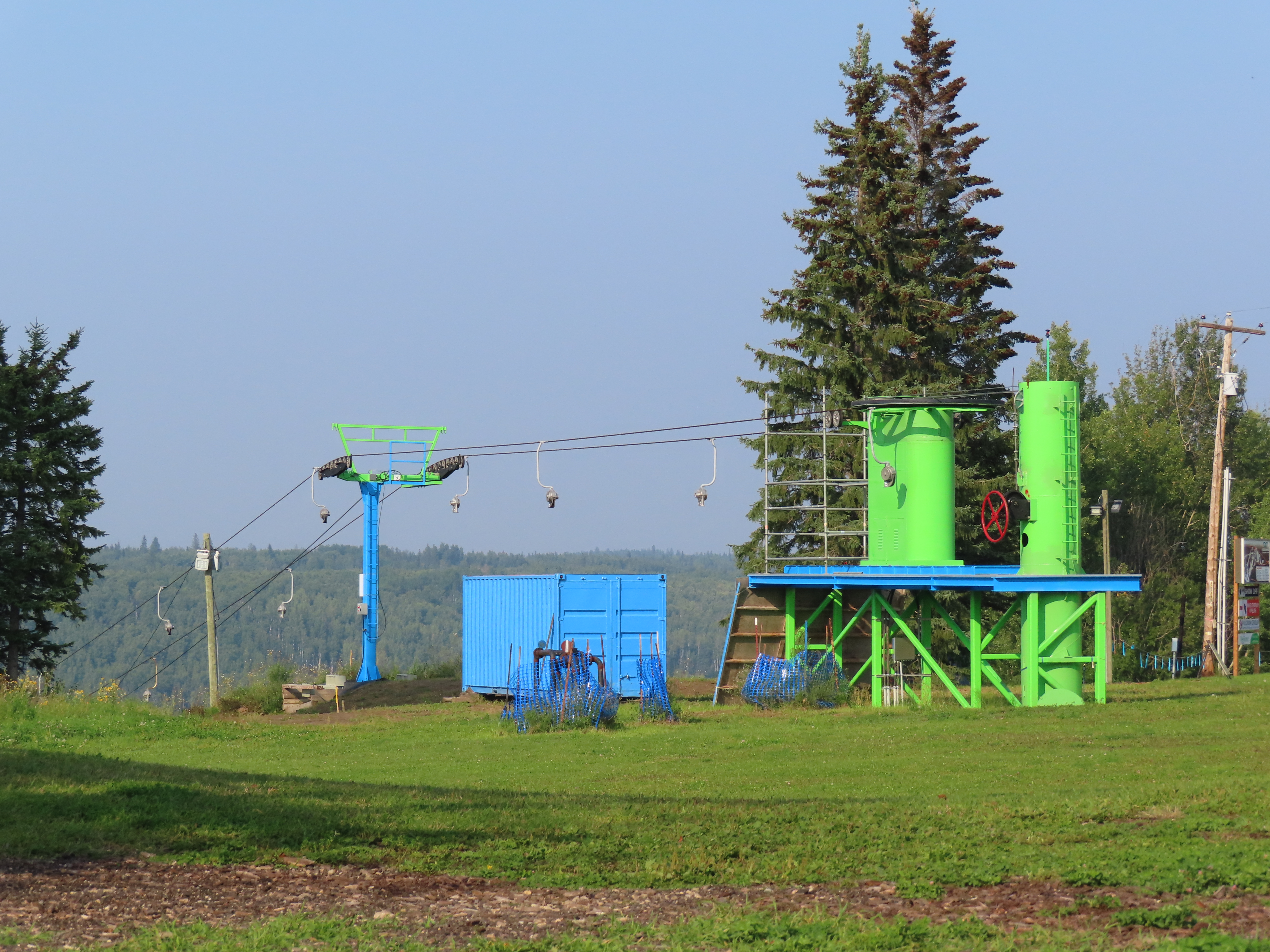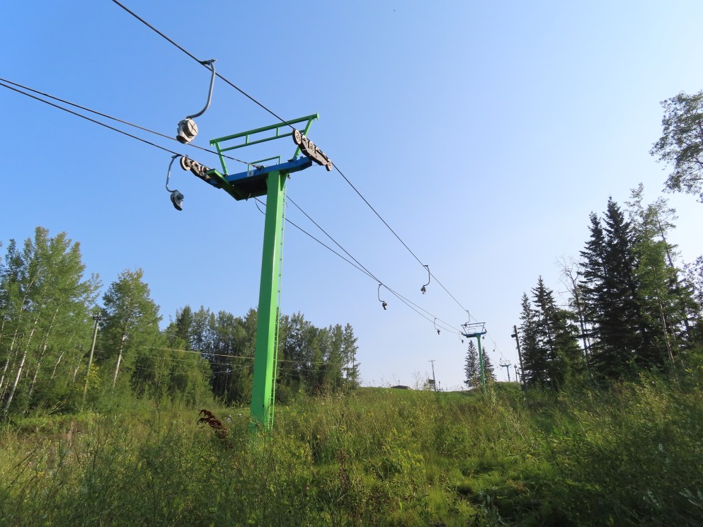 This lift came used from Lake Louise and was converted from a platter to a T-Bar.All the towers are adjustable due to possible ground movement.View up the line from the base terminal.This was the top terminal at Lake Louise but is the bottom here.Another view of the return station.Tower 2.View up at tower 3.Tower foundation.Looking down the line.Upper part of the lift line.Tower 7 side view.View from the summit.Top station with drive and tensioning.Upper station overview.