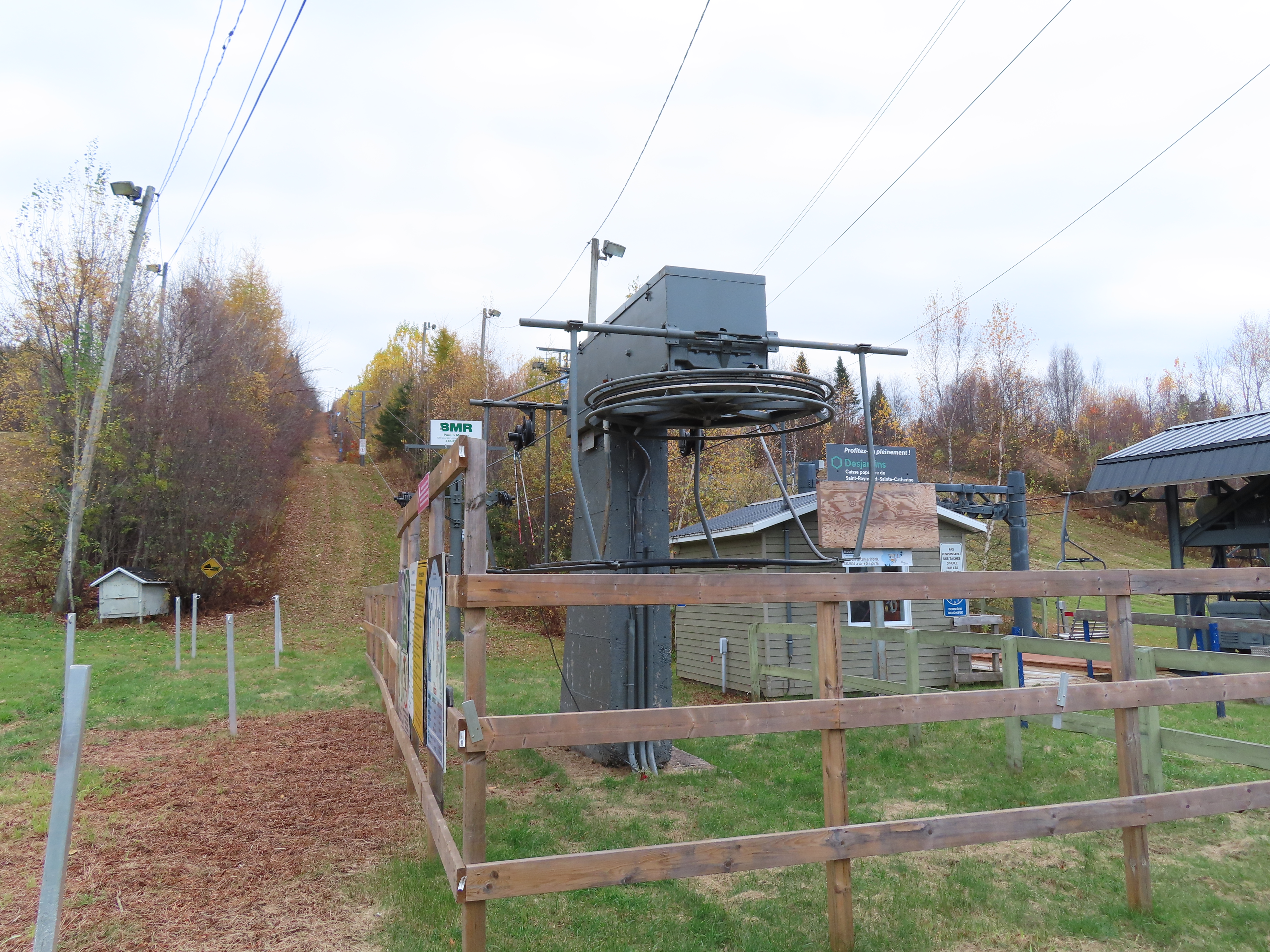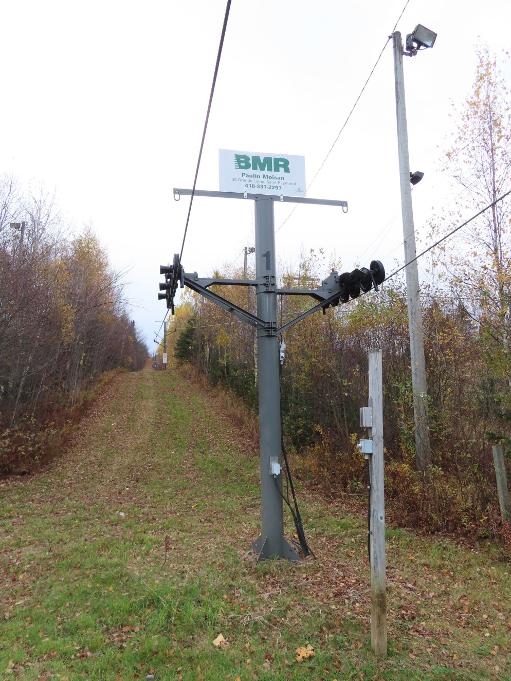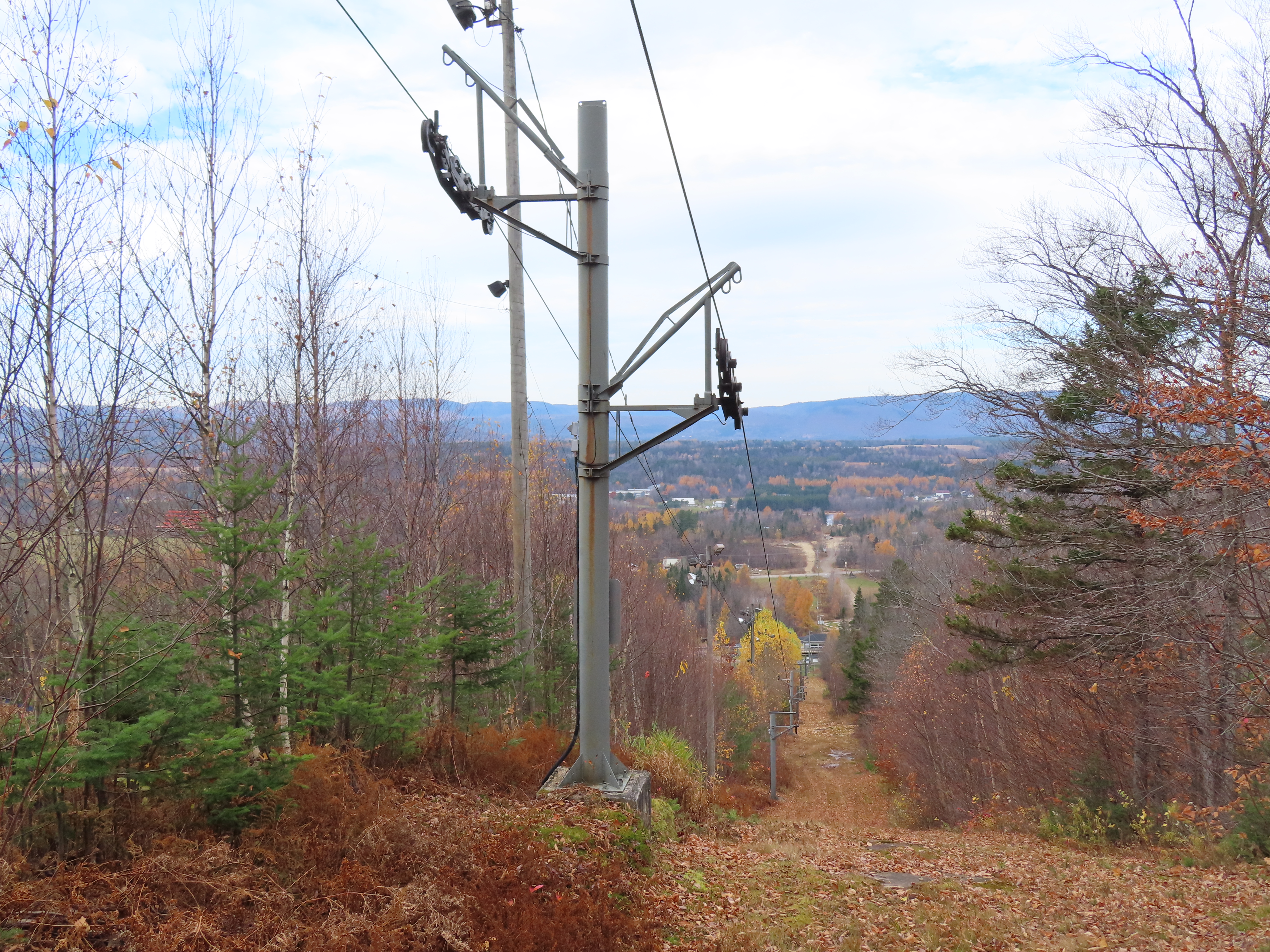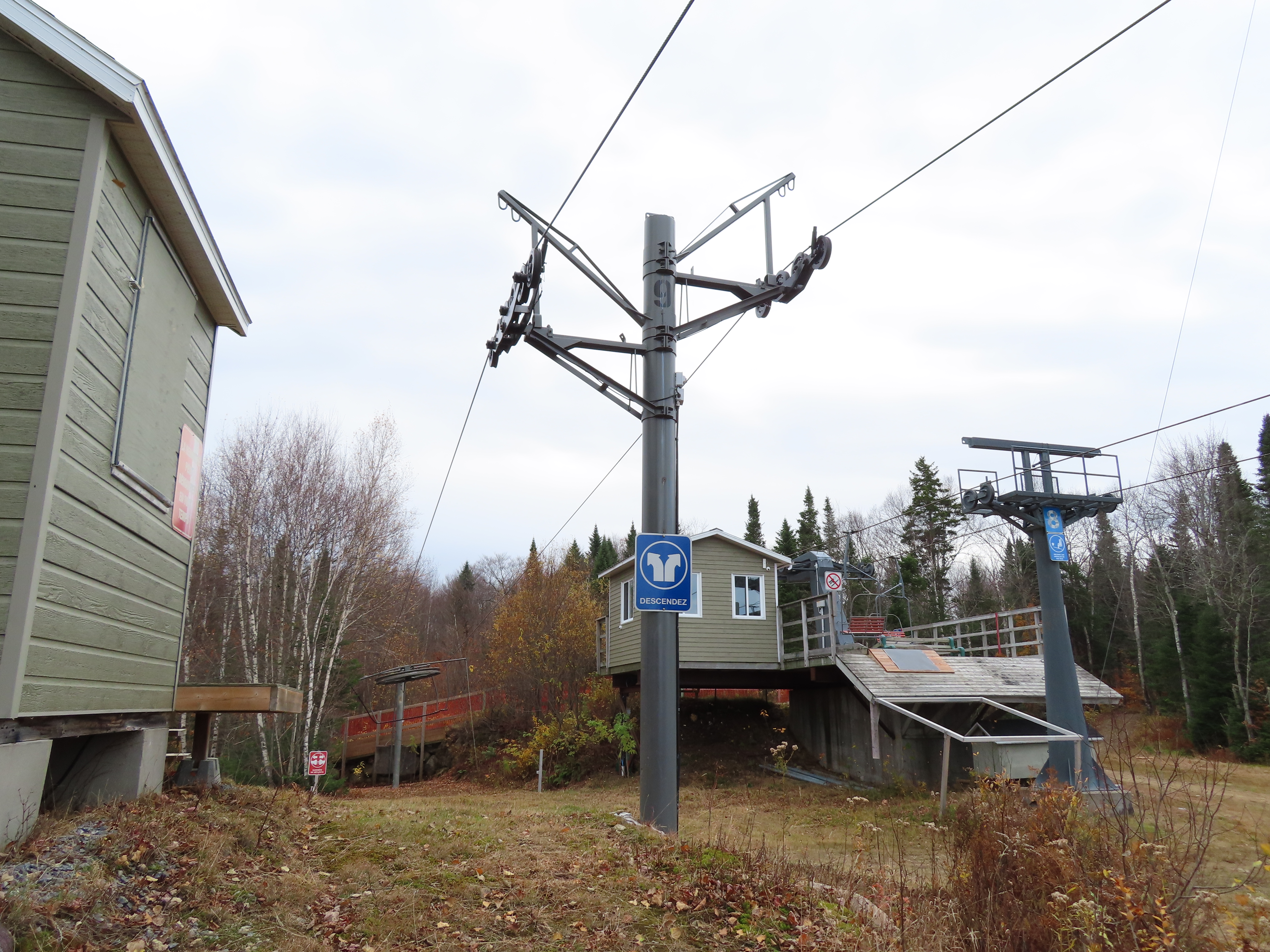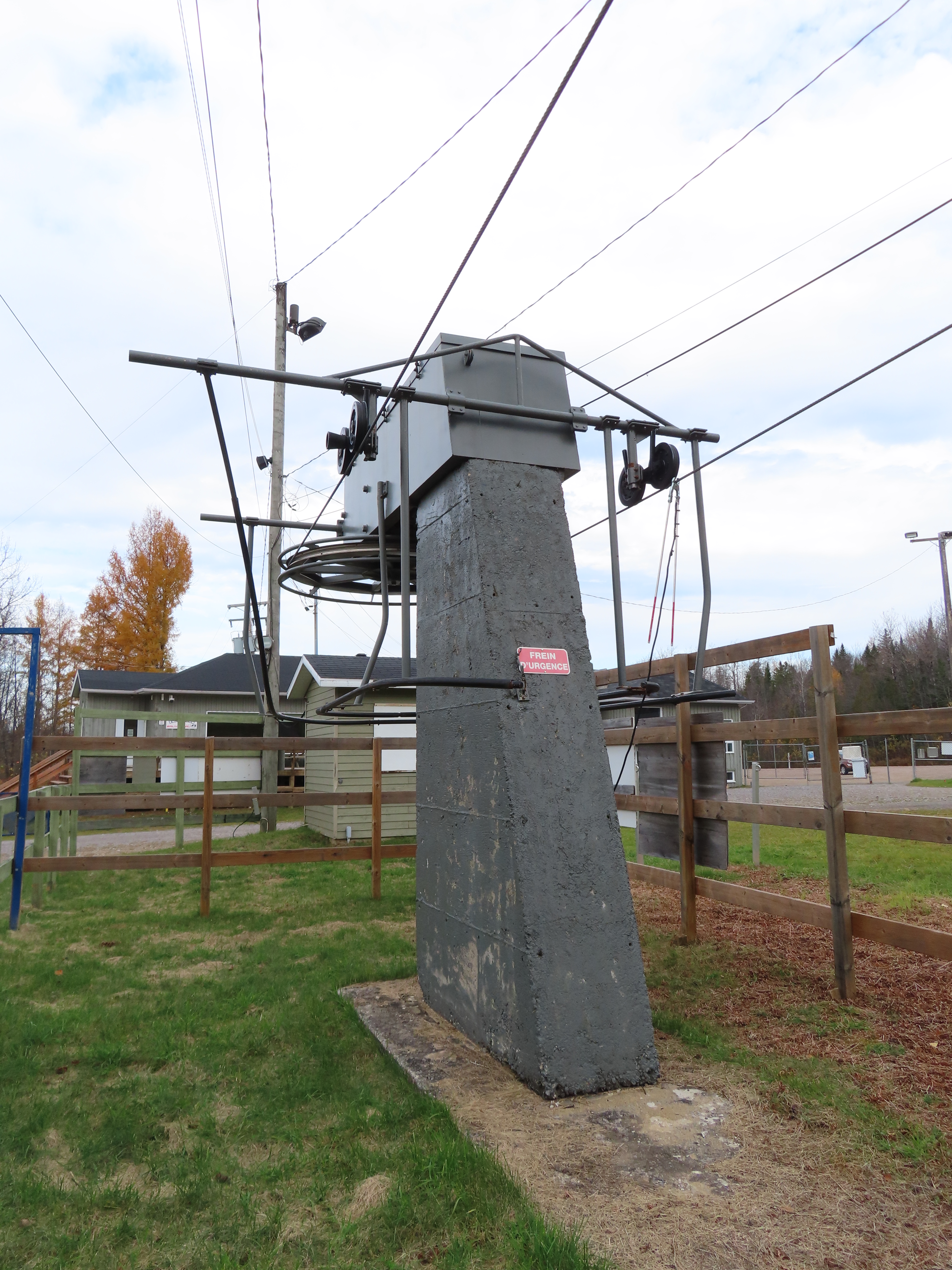 Drive terminal at the base.Tower 1 at the load point.Side view of the drive.Return bullwheel up top.Floating bullwheel and counterweight.Tower 9.Upper station next to a double chair.View from the top.Half tower.Looking up the line with night lighting.Name plate.Lift overview.
