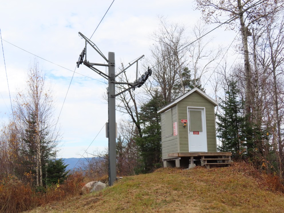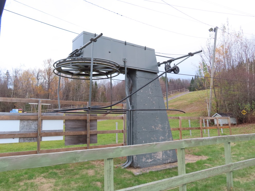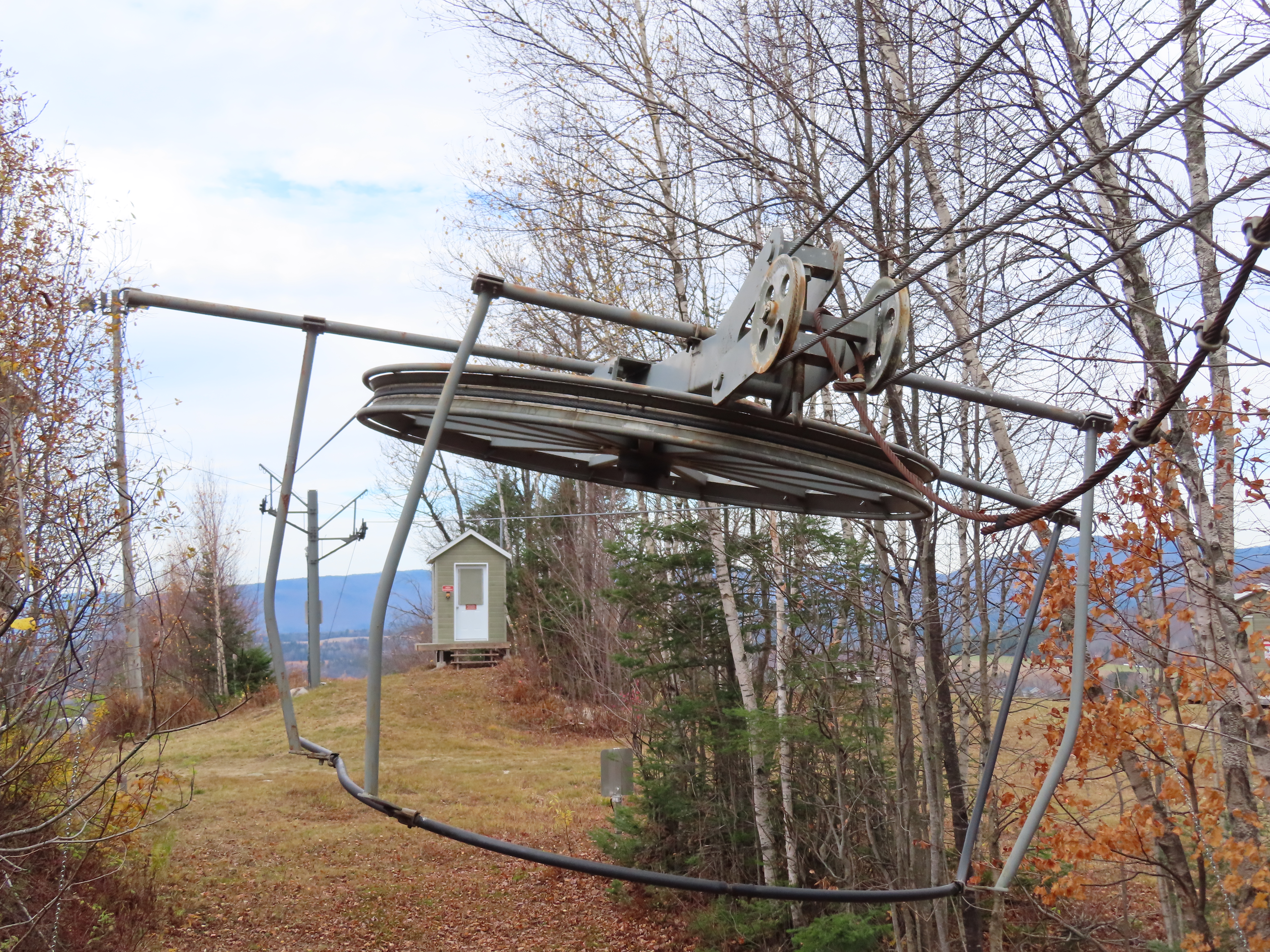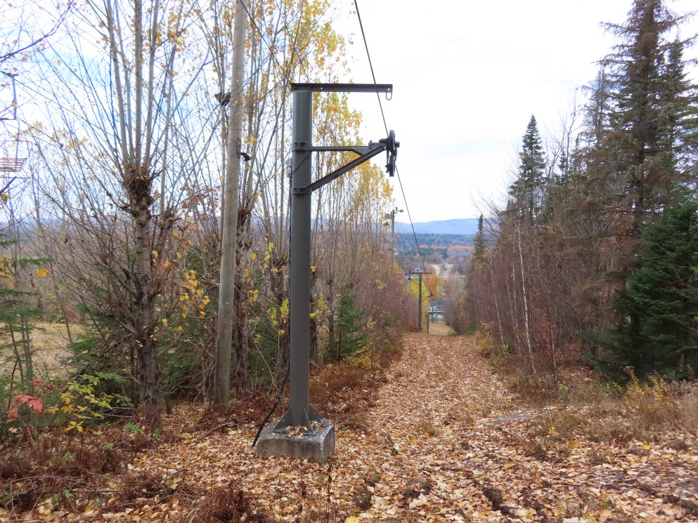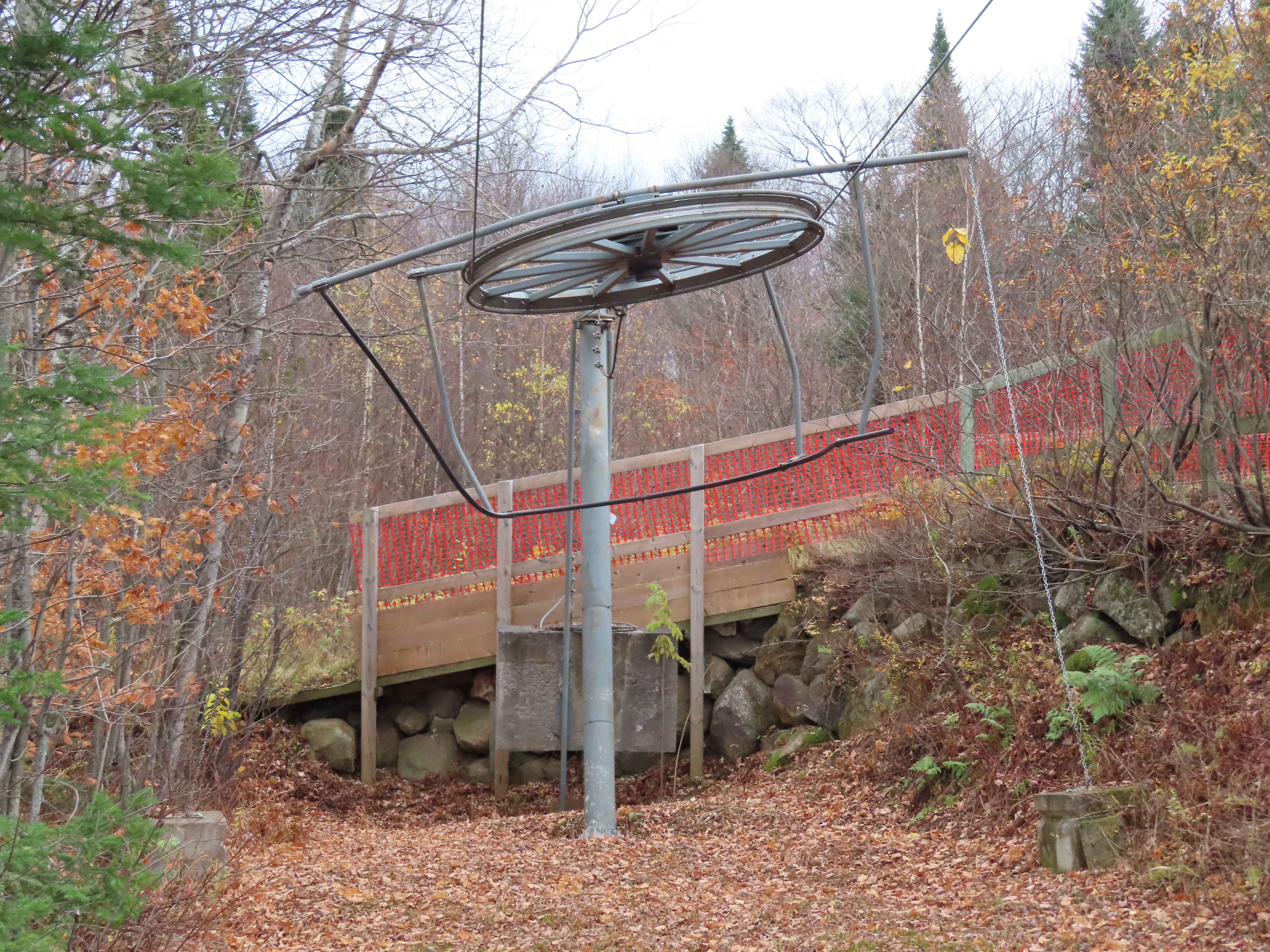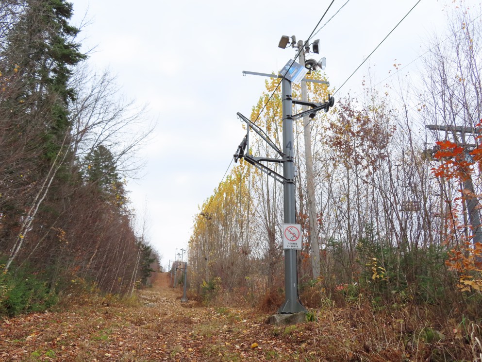 Drive terminal at the base.Tower 1 at the load point.Side view of the drive.Return bullwheel up top.Floating bullwheel and counterweight.Tower 9.Upper station next to a double chair.View from the top.Half tower.Looking up the line with night lighting.Name plate.Lift overview.