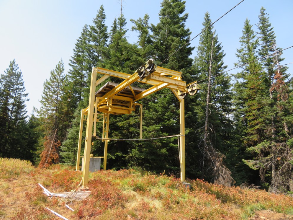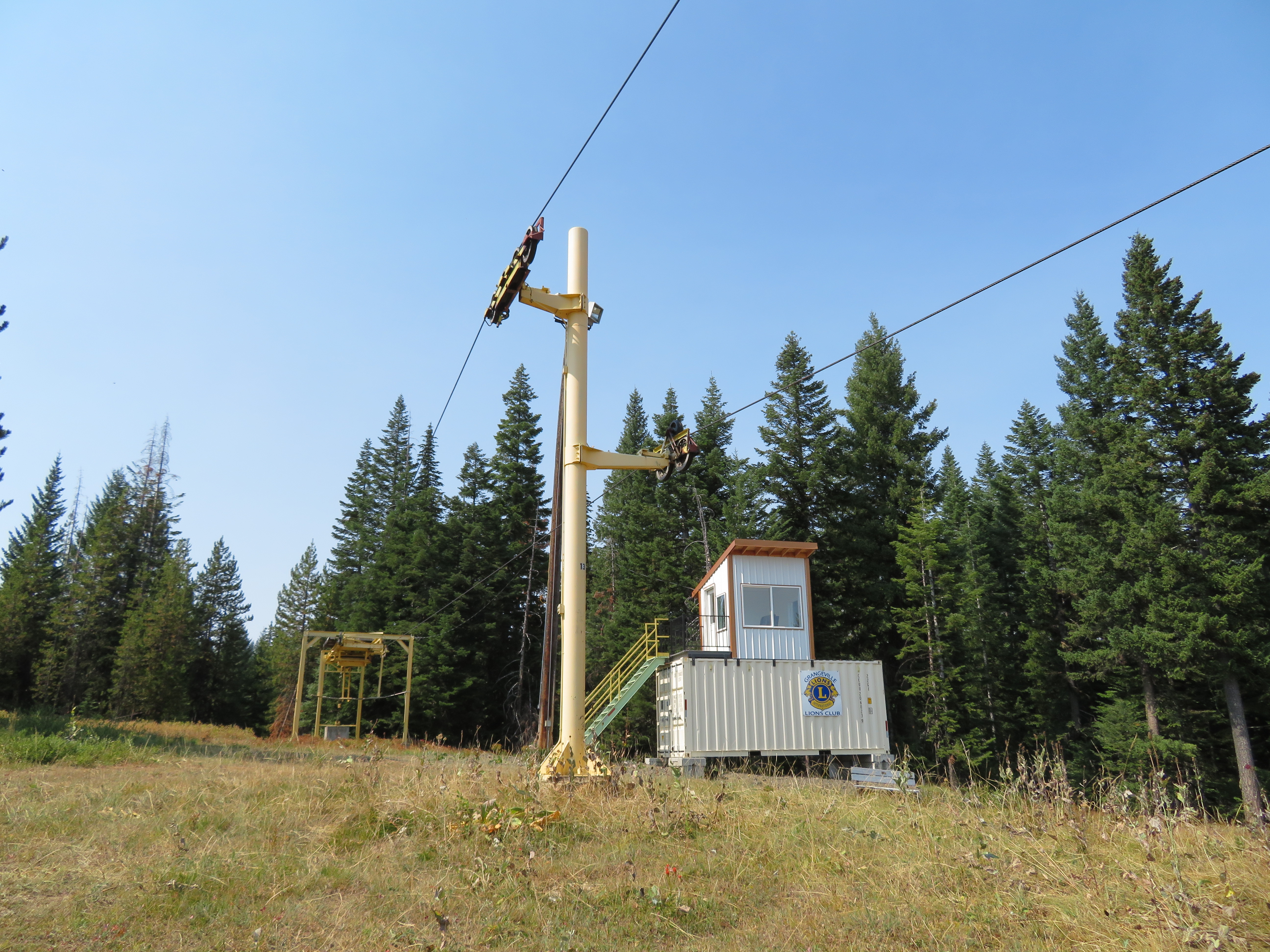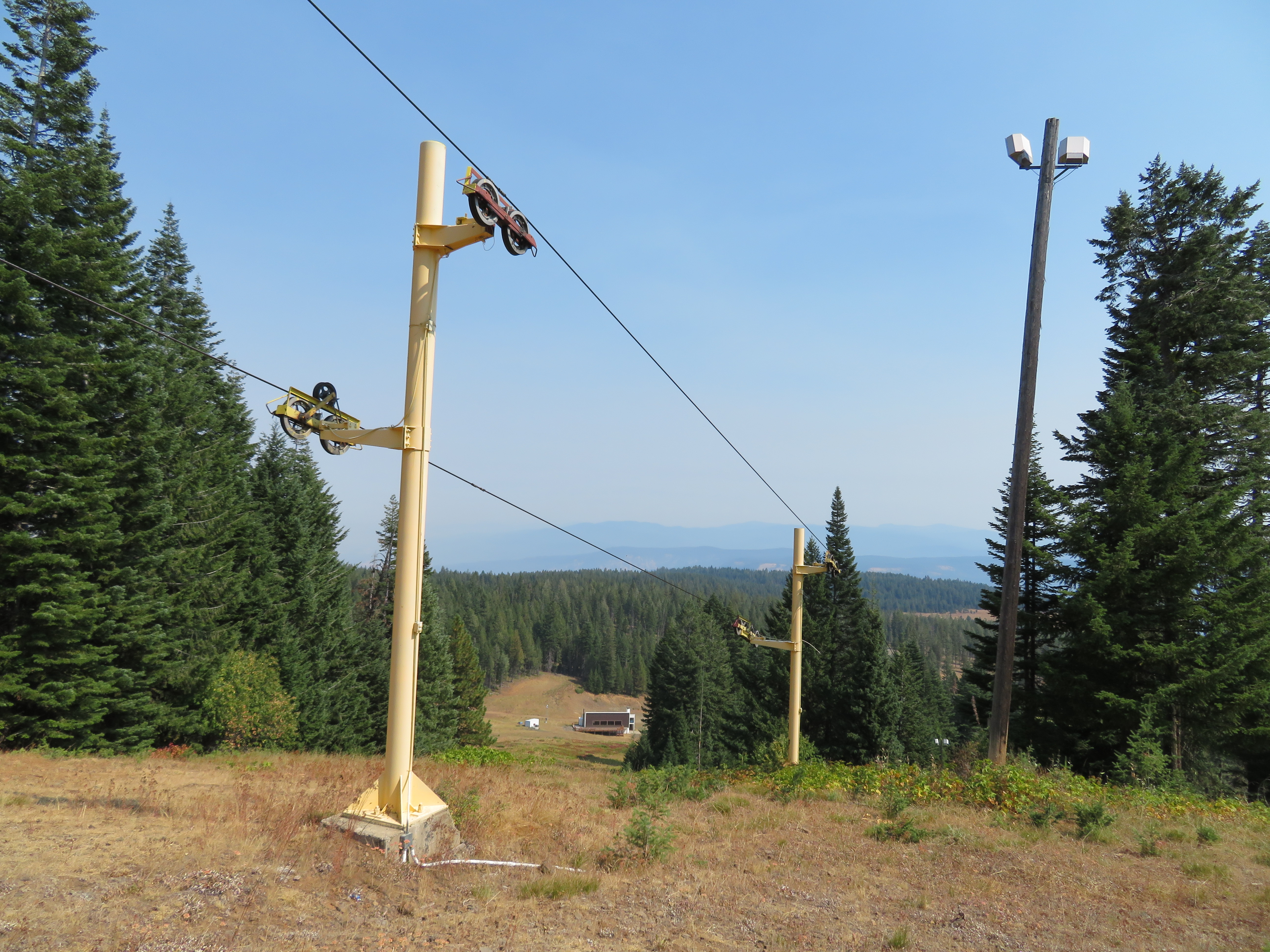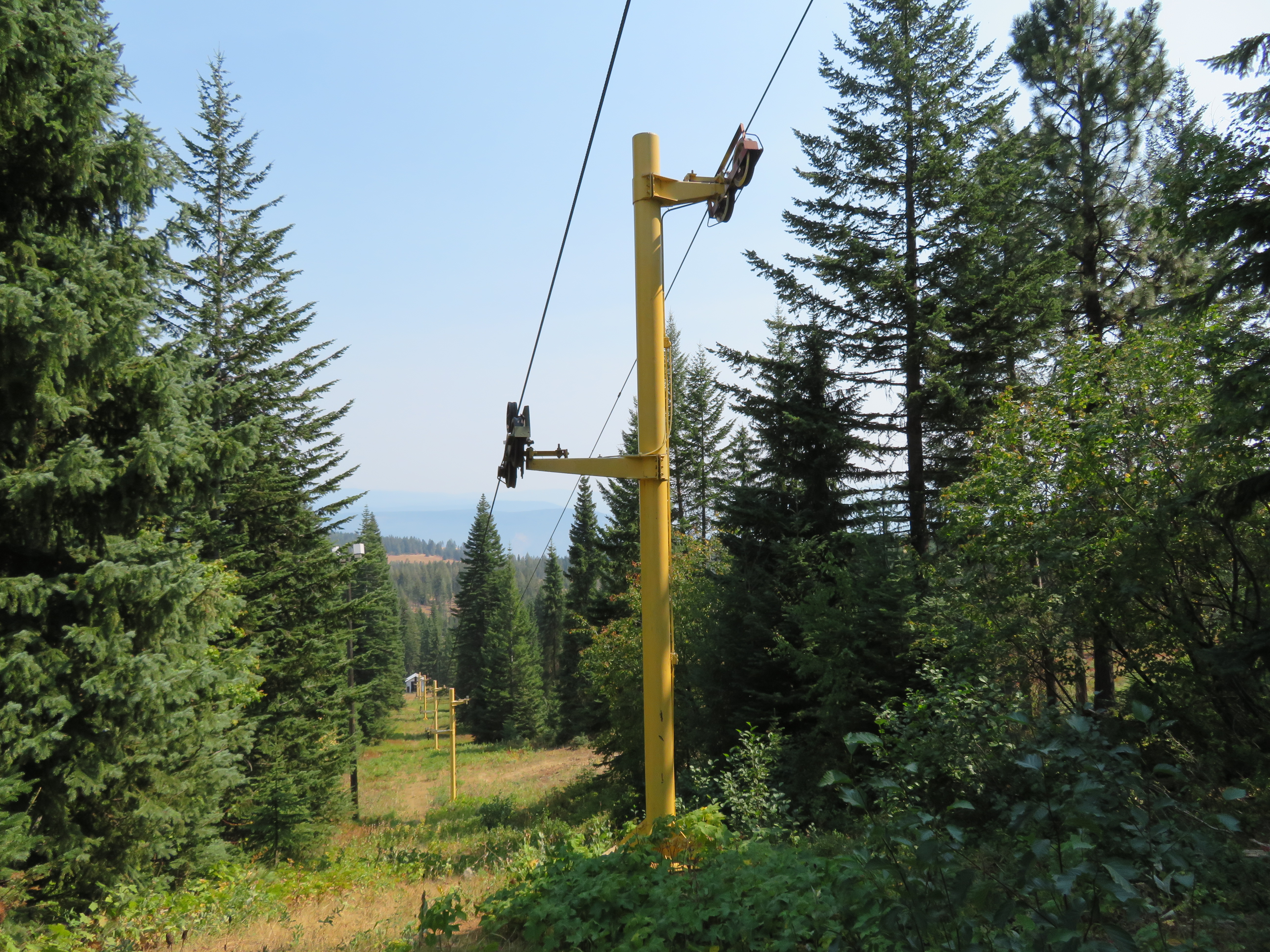 This Hall T-Bar was installed new in 1972 and serves the entire ski area.Bottom drive terminal building.Tower 3.Middle part of the lift line.View back down with a split tower.Breakover towers.Nearing the unload.New elevated operator house up top.Tension return unit.Counterweight tensioning and carriage.Drive bullwheel.