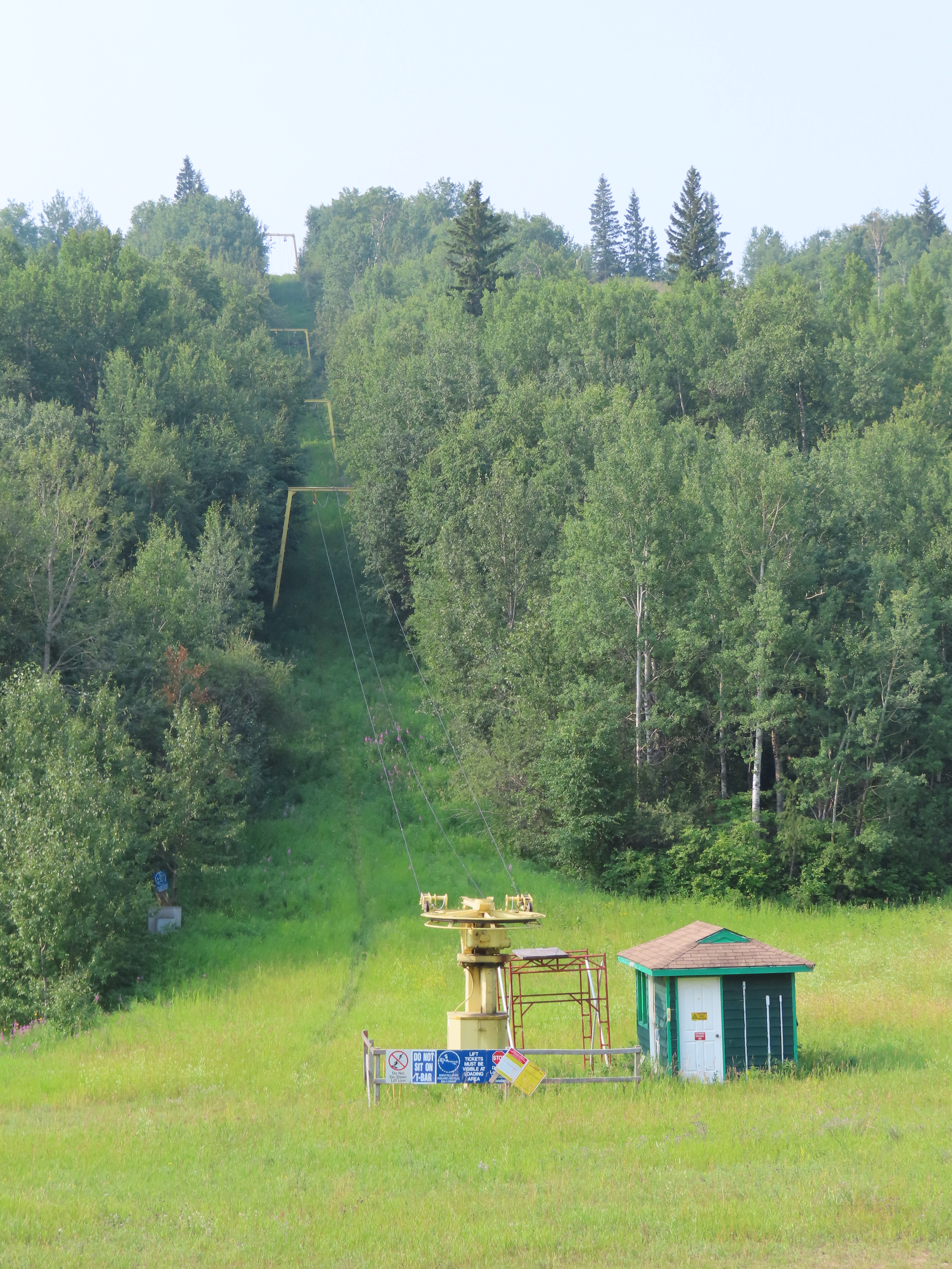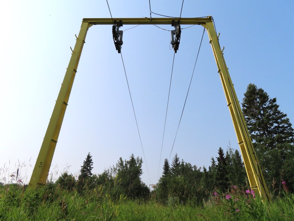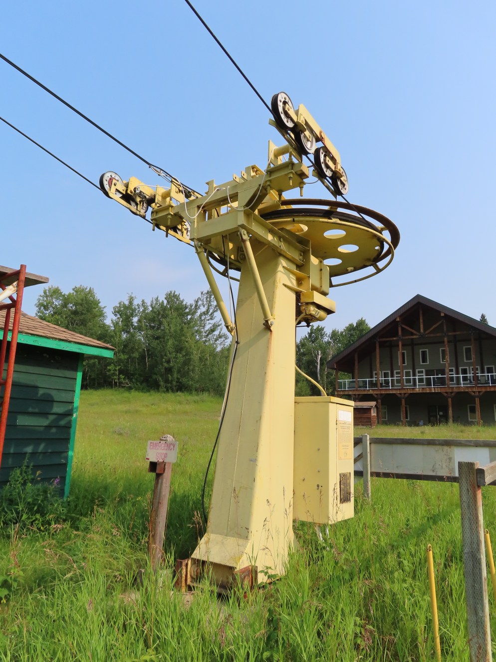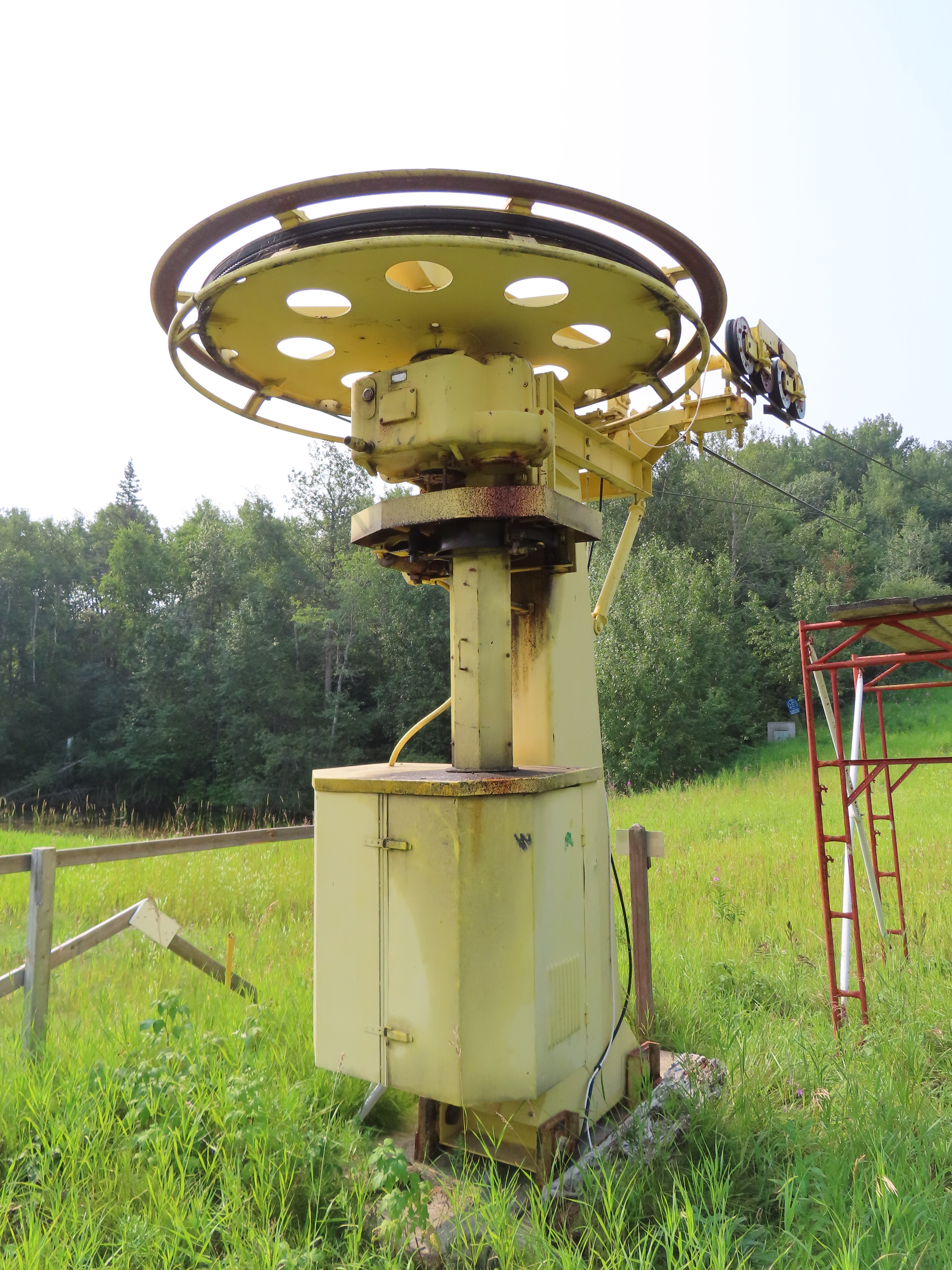 This ski area opened in 1992 with a relocated Doppelmayr T-Bar.Drive station below the base lodge.Loading area.Tower 1.Middle section of the lift line.Looking up at the top two towers.Unloading area at the summit.Side view of the top terminal.Elevated return station with counterweight.The top terminal is located significantly past the unload point in the trees.Motor cover and gearbox.