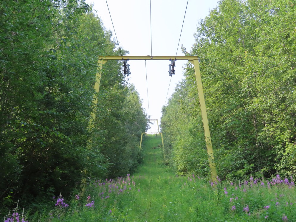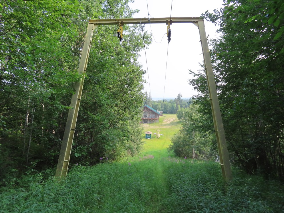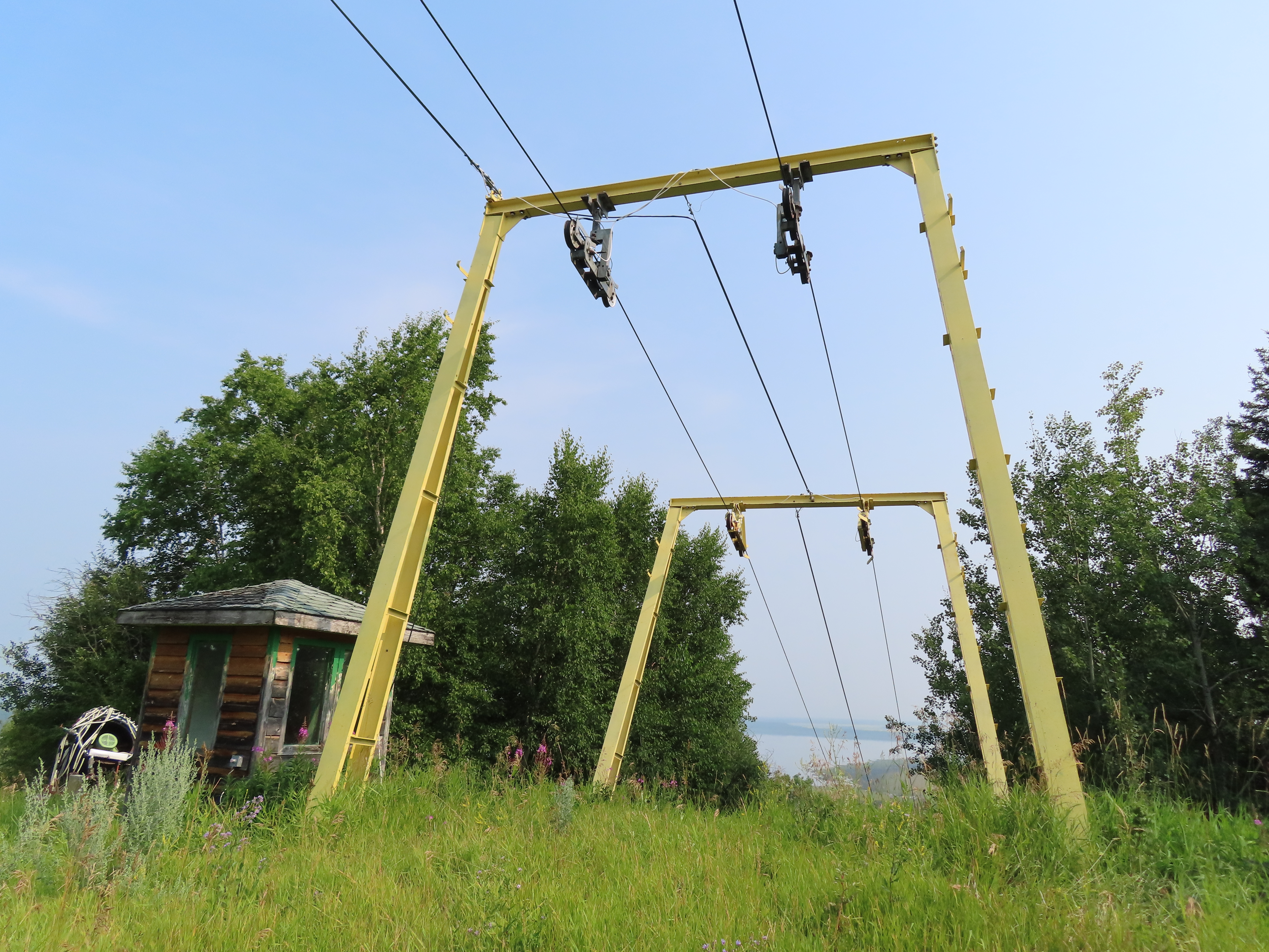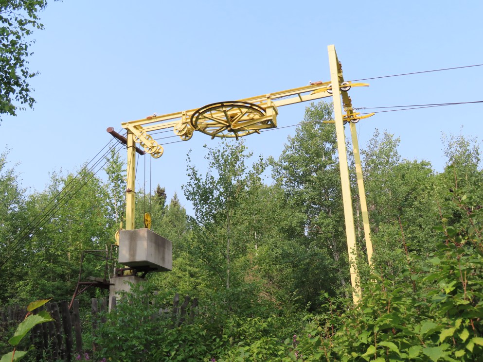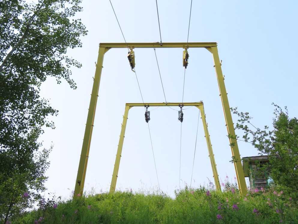 This ski area opened in 1992 with a relocated Doppelmayr T-Bar.Drive station below the base lodge.Loading area.Tower 1.Middle section of the lift line.Looking up at the top two towers.Unloading area at the summit.Side view of the top terminal.Elevated return station with counterweight.The top terminal is located significantly past the unload point in the trees.Motor cover and gearbox.