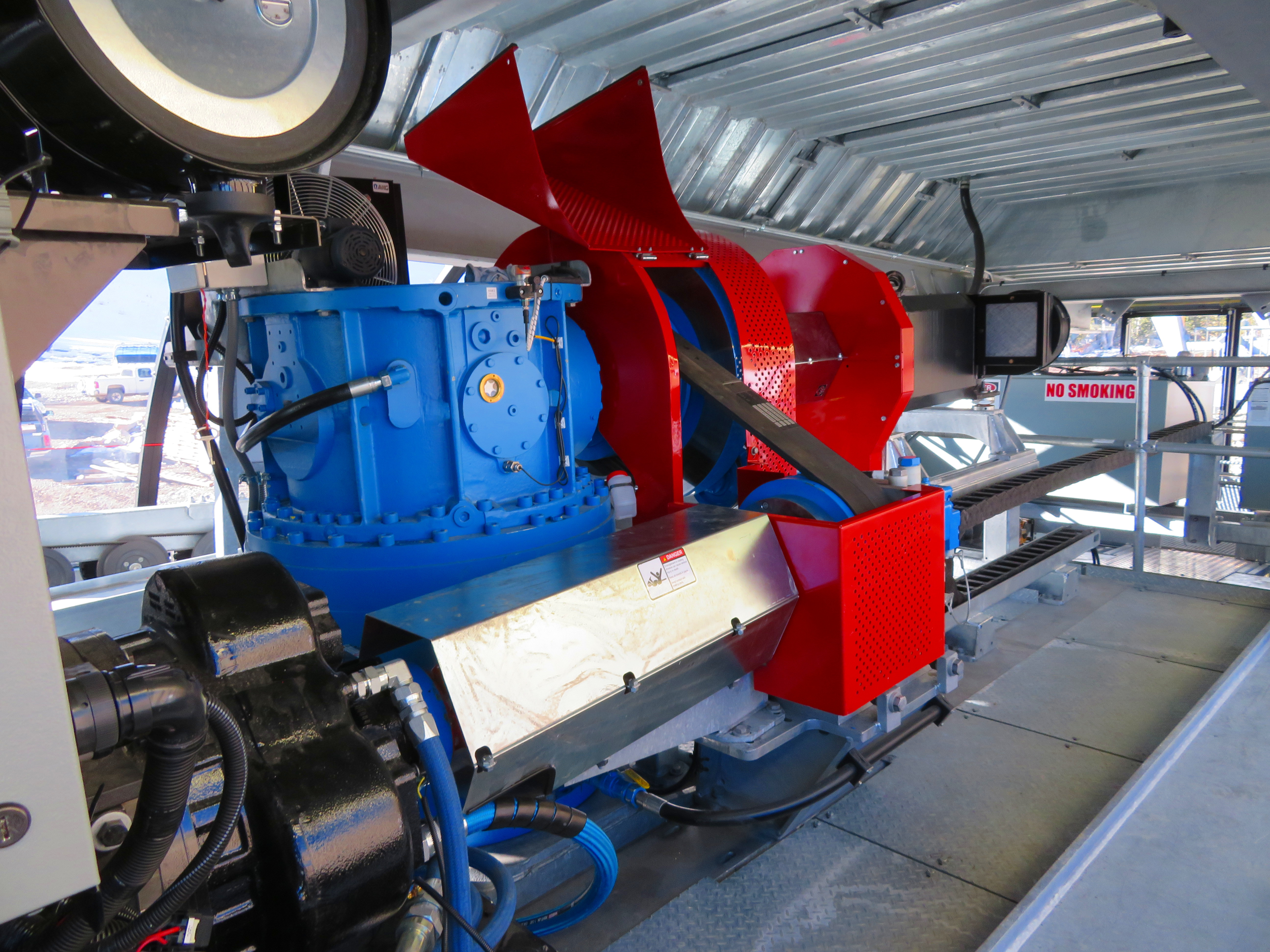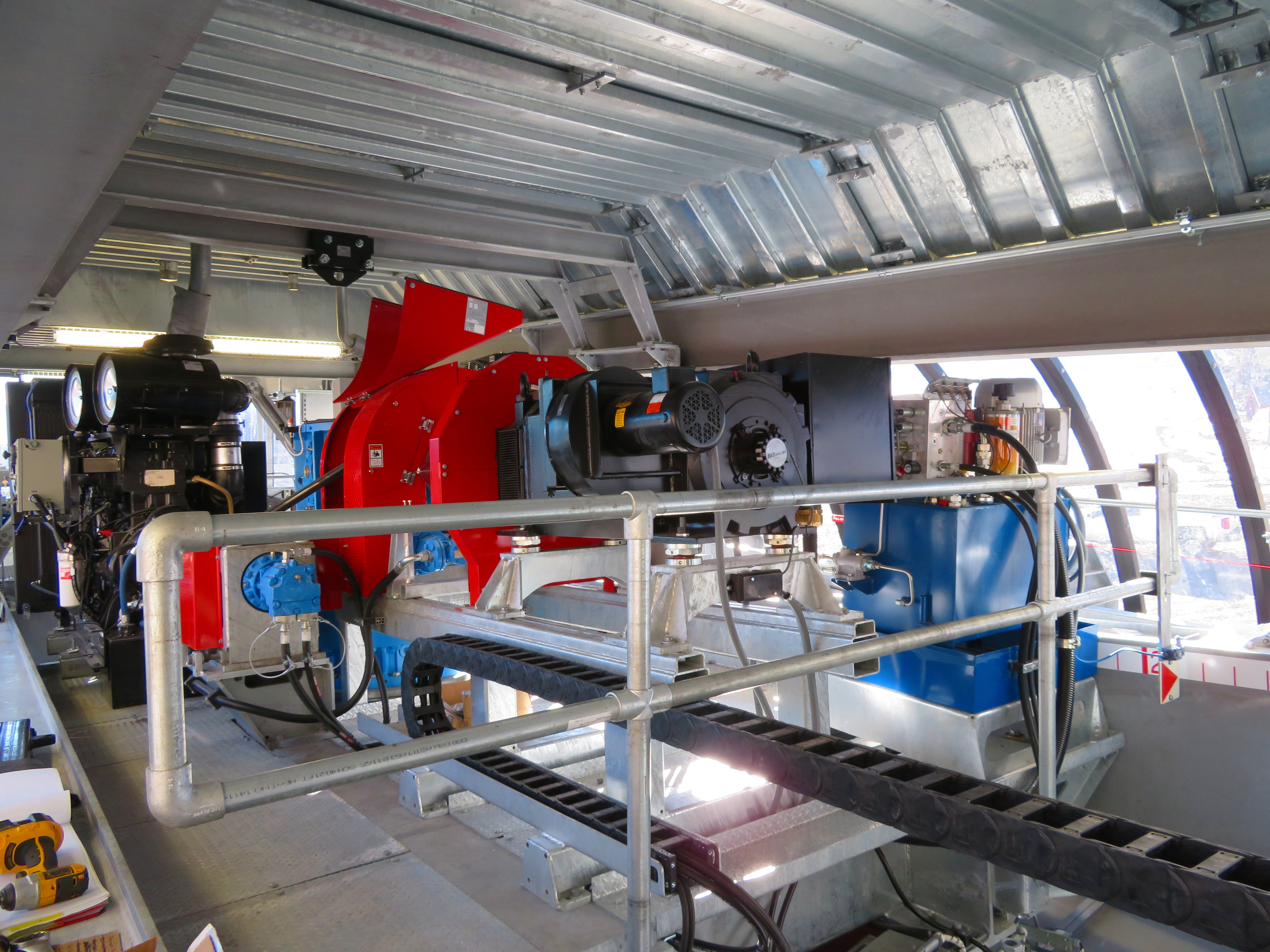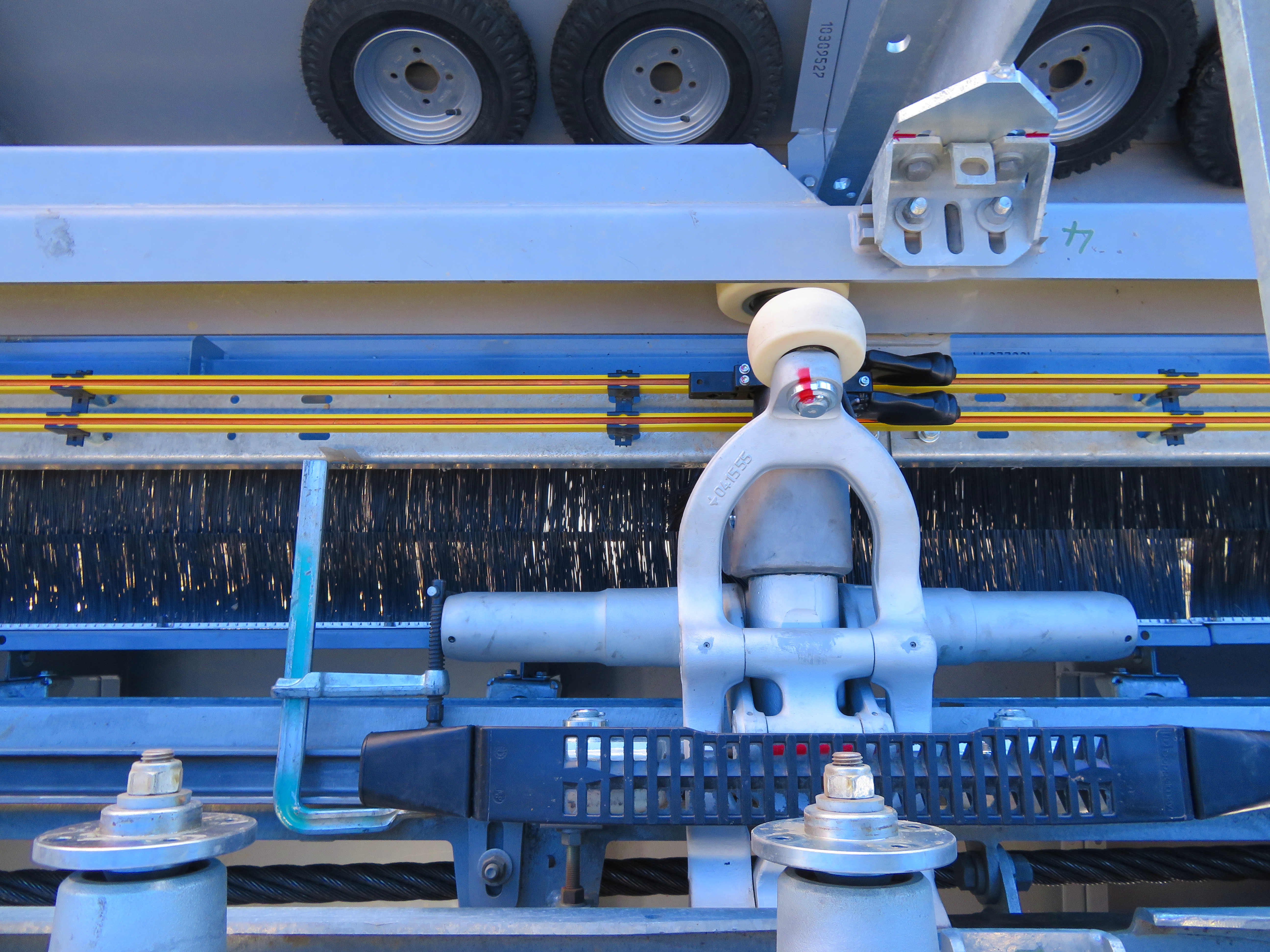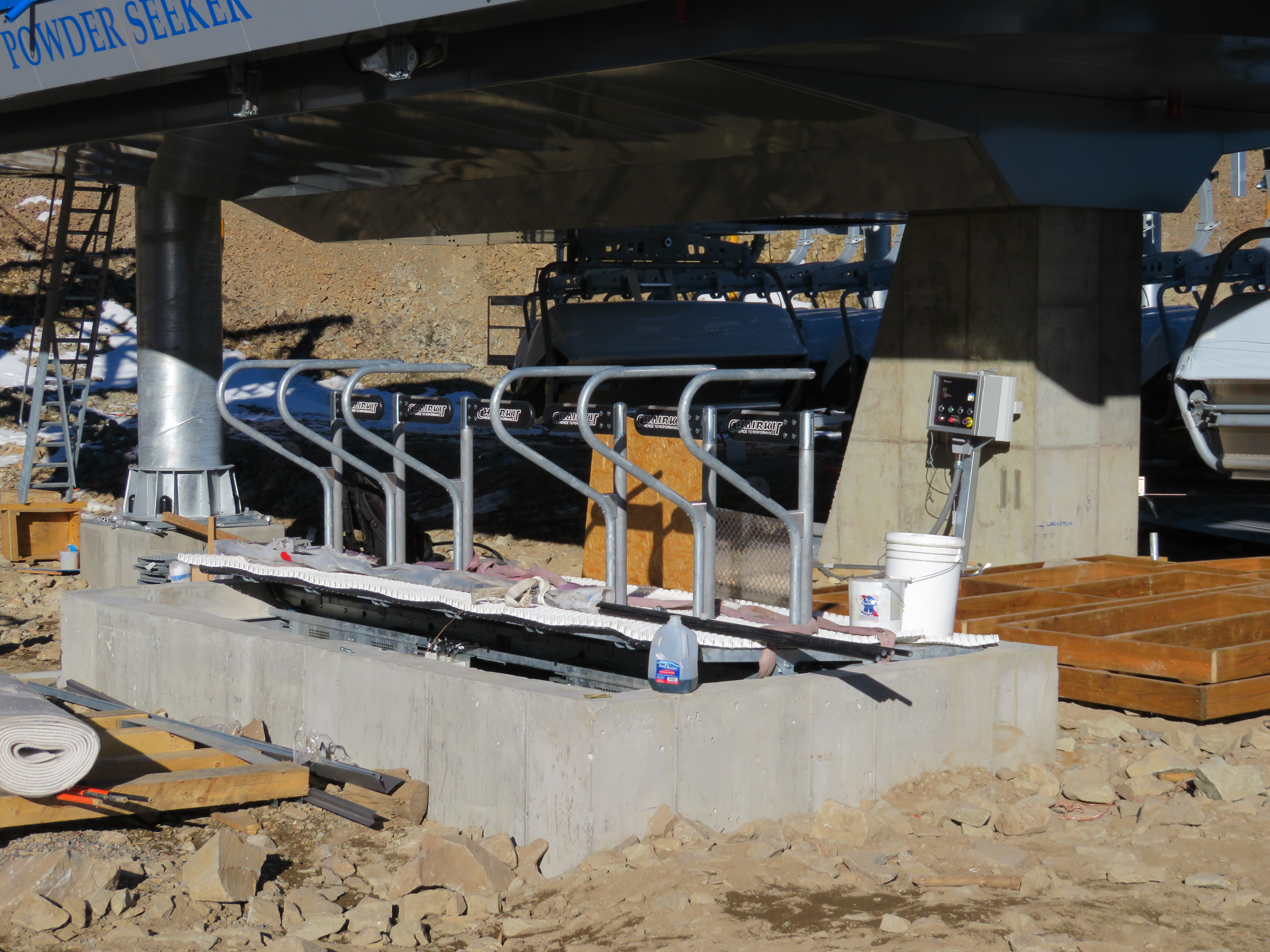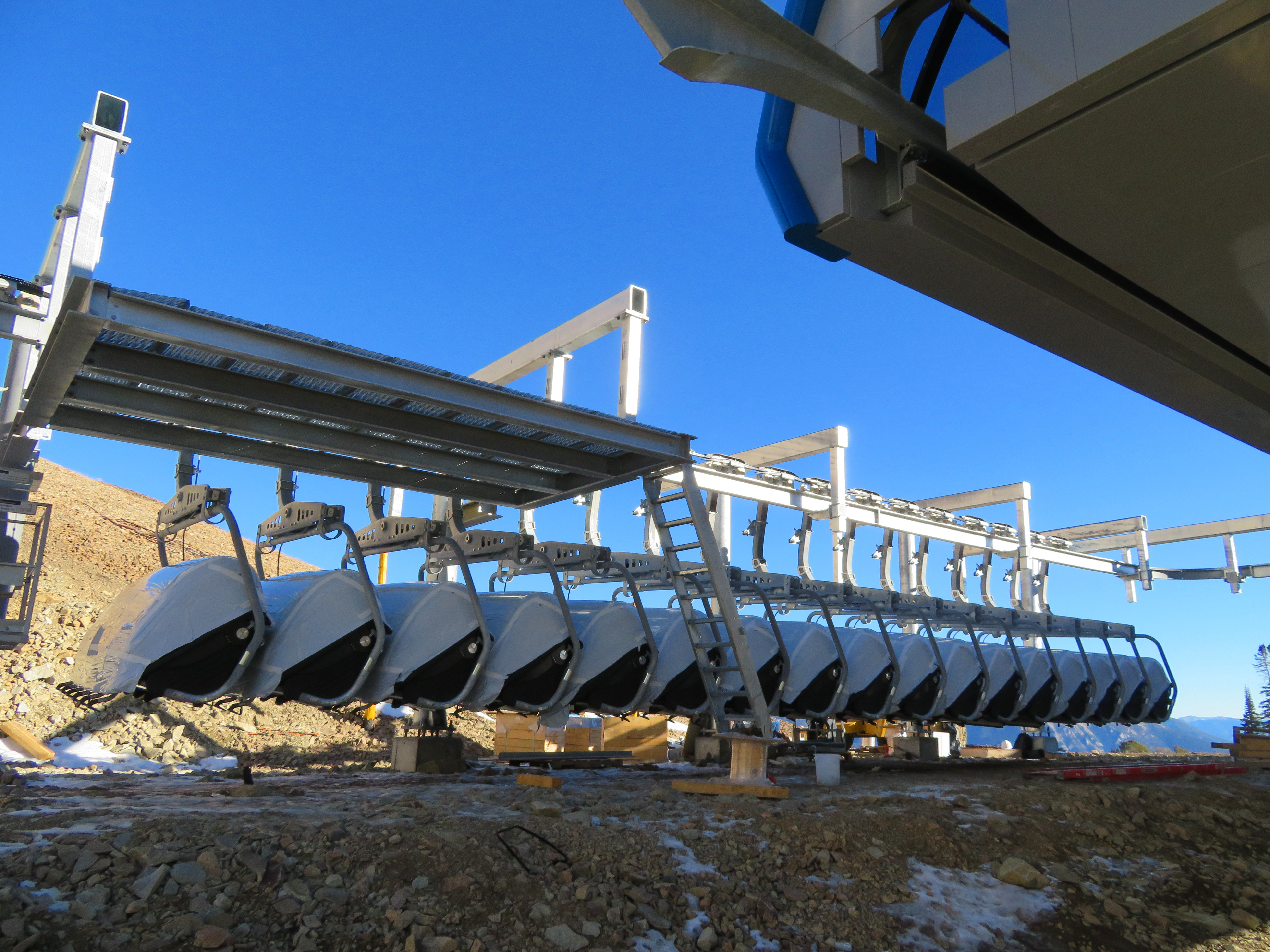 The lower station features Chairkit gates, 90-degree loading, an AC prime mover, Doppelmayr-Lohmann gearbox and two Cummins diesel backups. The seat heating system can be seen in the pictures above with yellow charging rails and black contacts attached to the DT grips. Another cool feature is a headset in the motor room connected to the lift’s phone system so that mechanics will be able to hear communications, like a helicopter pilot can.