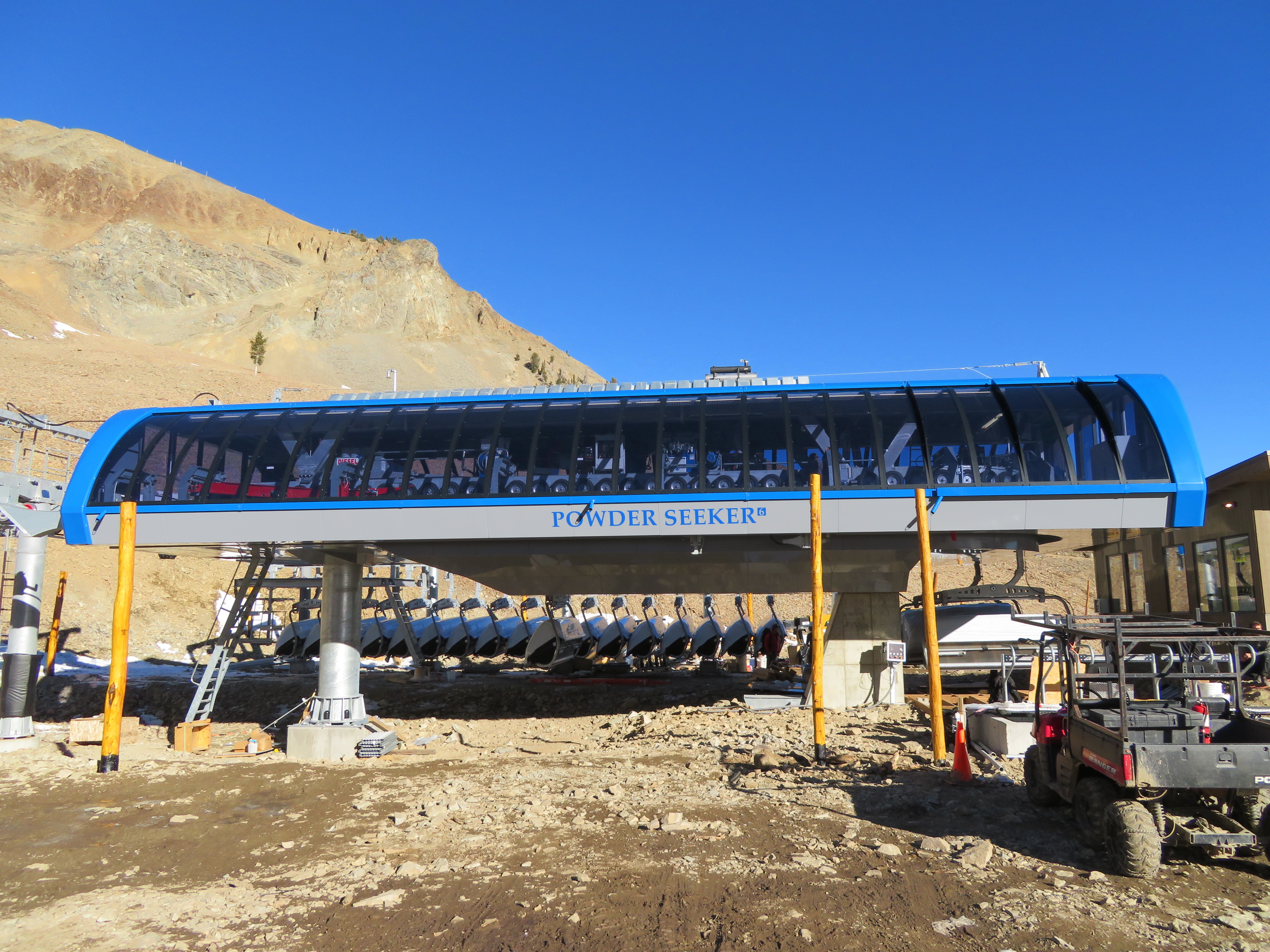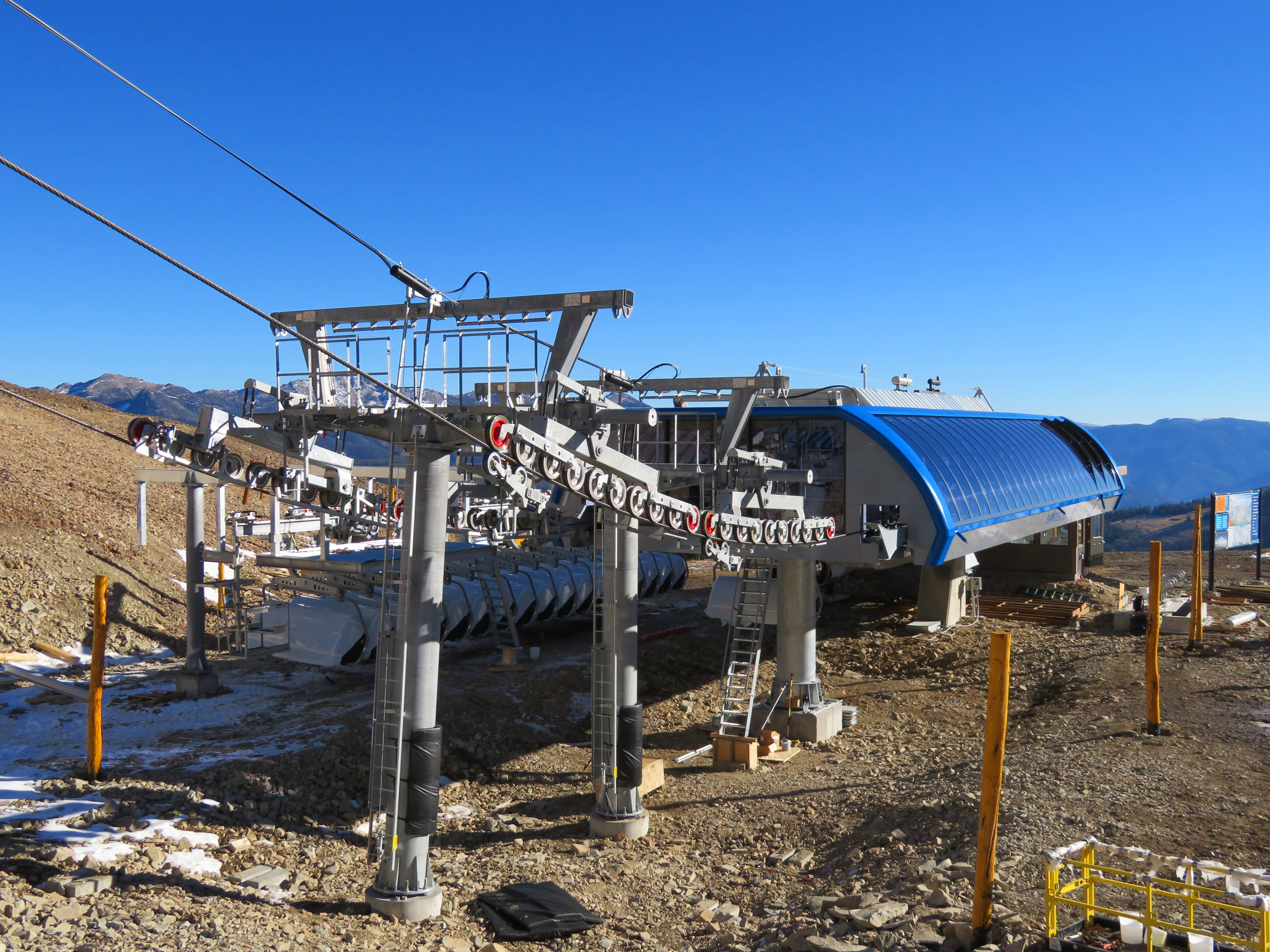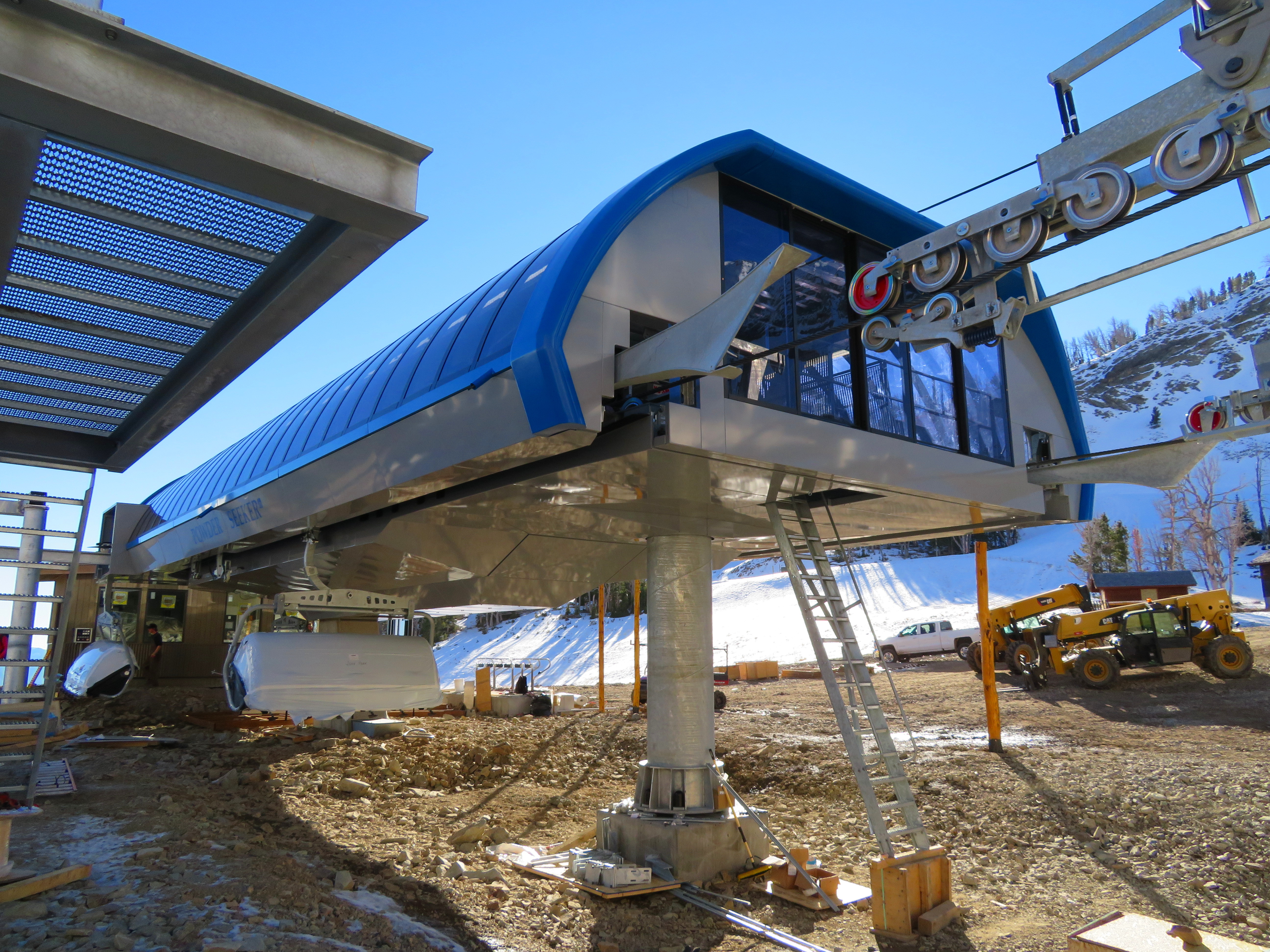 A six-pack dubbed Powder Seeker is the new the crown jewel of Big Sky’s 26-lift fleet, with blue bubbles, heated seats and headrests. Servicing the above treeline terrain in the Bowl, Powder Seeker is just over 2,600′ long with 14 towers and an 823′ vertical rise. With a 6.1 meter line gauge and 45 mm haul rope, it should be able to spin through all but the harshest Montana winds. In addition to a chair parking rail that will eventually be enclosed, the Uni-G-M stations feature tire banks that can raise hydraulically to park chairs. Thirty-one carriers will go on the line initially; Big Sky also bought two spares and can add more as as needed.