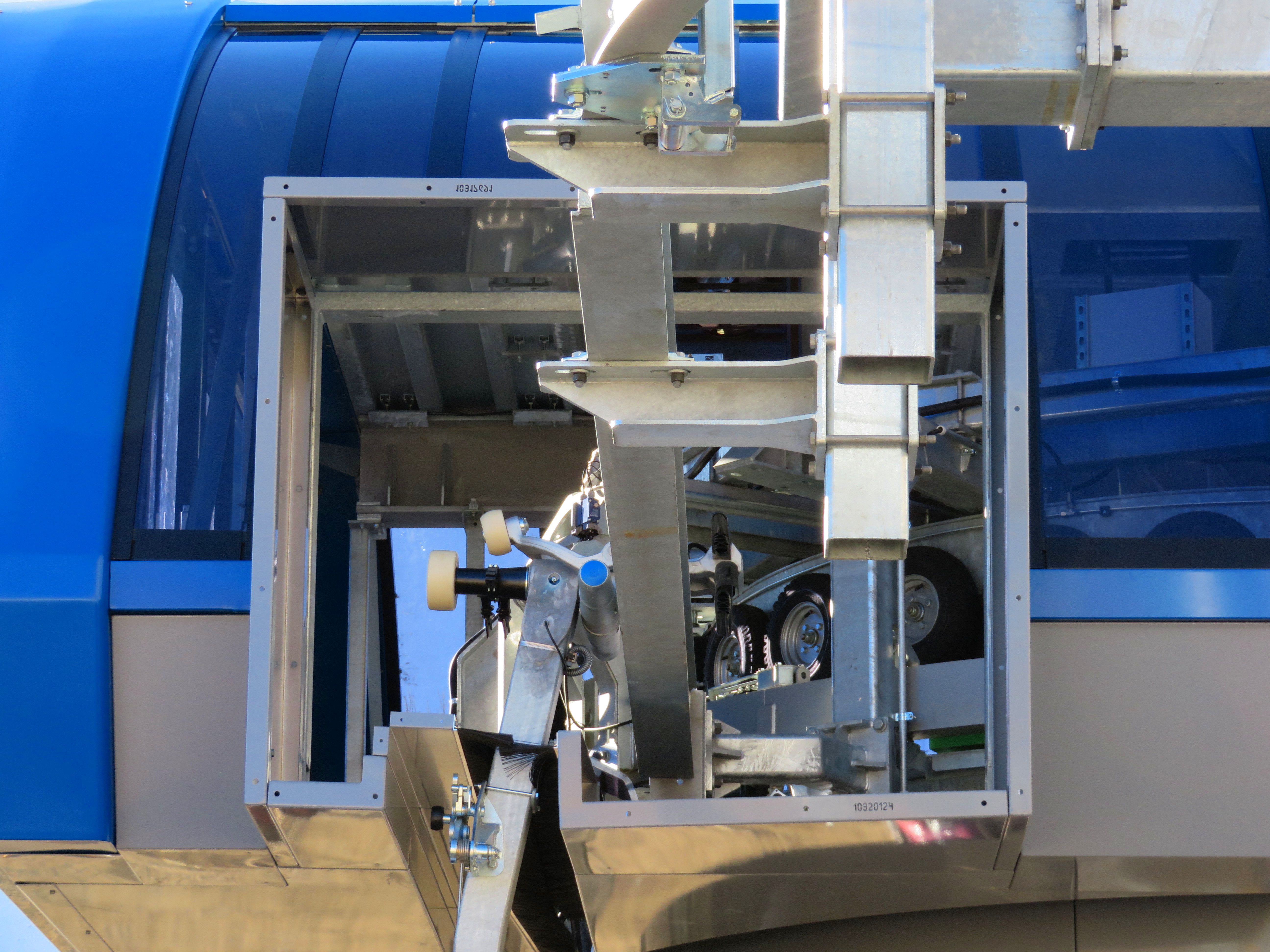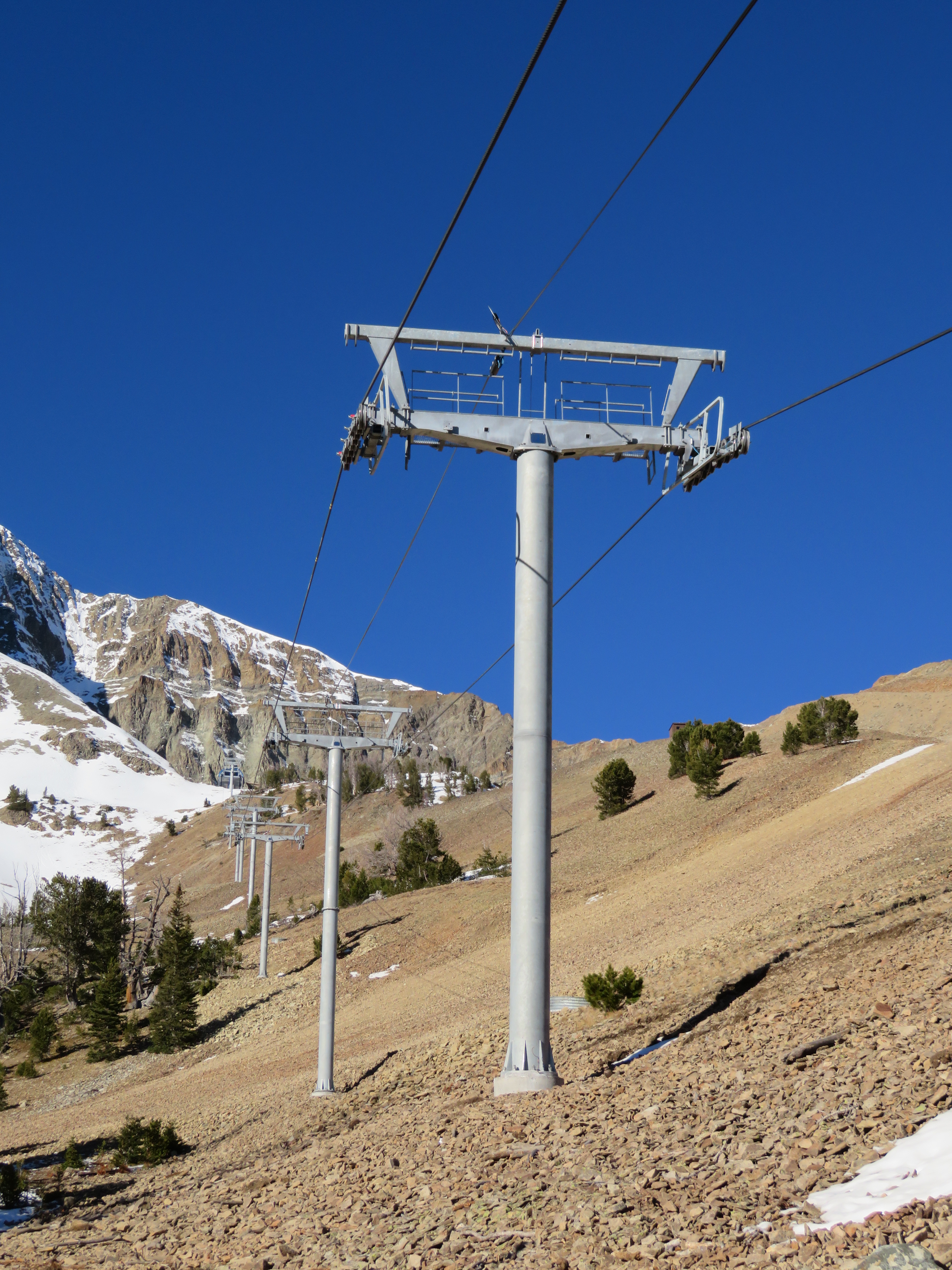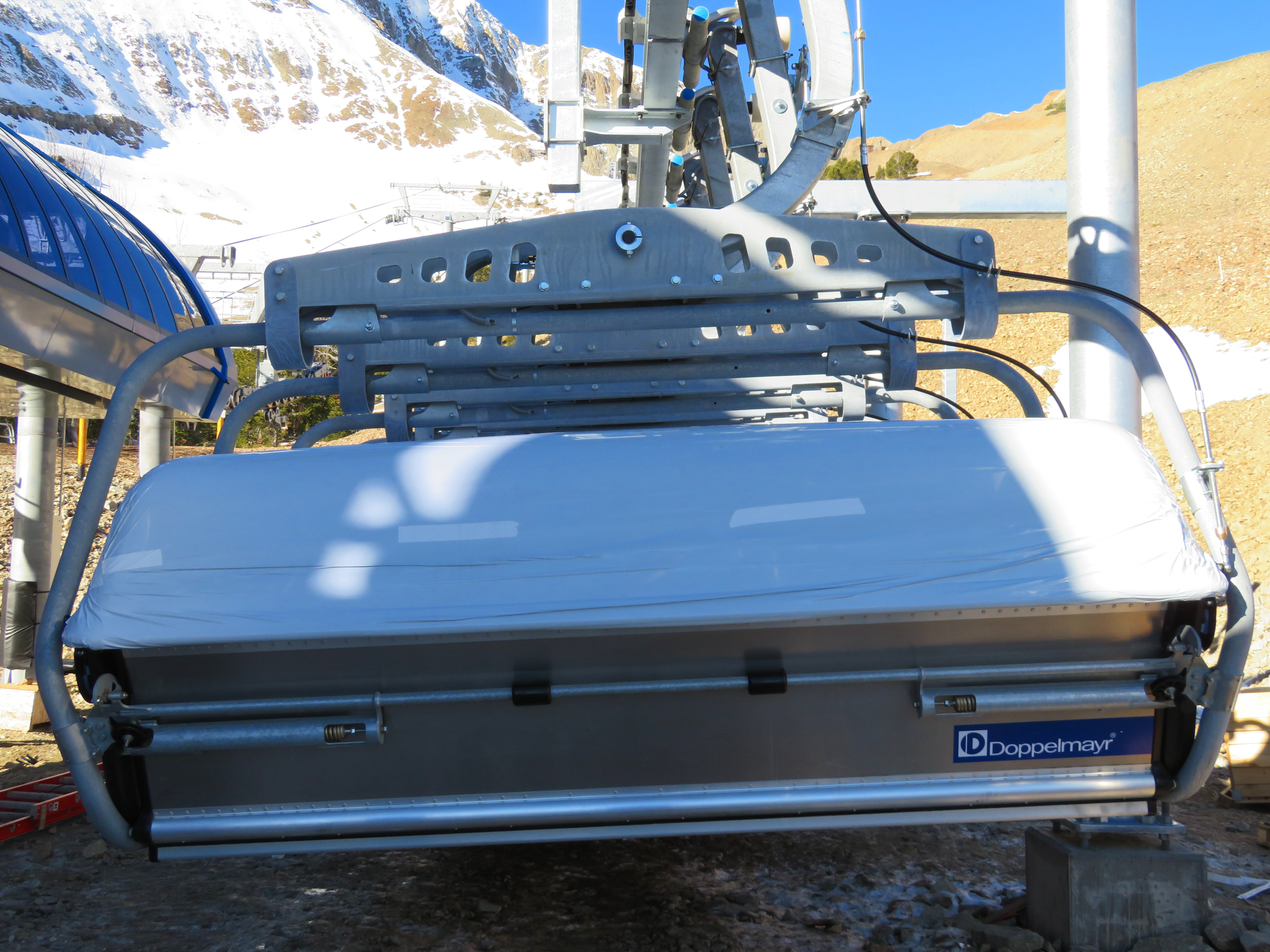 A six-pack dubbed Powder Seeker is the new the crown jewel of Big Sky’s 26-lift fleet, with blue bubbles, heated seats and headrests. Servicing the above treeline terrain in the Bowl, Powder Seeker is just over 2,600′ long with 14 towers and an 823′ vertical rise. With a 6.1 meter line gauge and 45 mm haul rope, it should be able to spin through all but the harshest Montana winds. In addition to a chair parking rail that will eventually be enclosed, the Uni-G-M stations feature tire banks that can raise hydraulically to park chairs. Thirty-one carriers will go on the line initially; Big Sky also bought two spares and can add more as as needed.