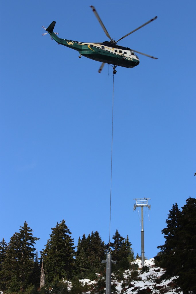 A helicopter pilot was forced to release a tower head bound for Cypress Mountain’s new chairlift Friday when weather conditions became unfavorable. The Sikorsky S-61 helicopter landed safely but the uppermost section of tower 6 was damaged beyond repair. “A fog bank moved quickly and unexpectedly into the work zone as the assembly was being set,” read a statement from the resort. “During the helicopter’s exit from the fog – as required by safety protocols – the load was jettisoned to allow the helicopter to safely reposition to an area with greater visibility, then navigate back to and land at the base area,” the statement continued. The helicopter was being operated by VIH Aviation Group of North Saanich, British Columbia and had been hired by Doppelmayr Canada to install towers at Cypress. Work was temporarily suspended after the incident and Worksafe BC as well as aviation authorities are investigating.