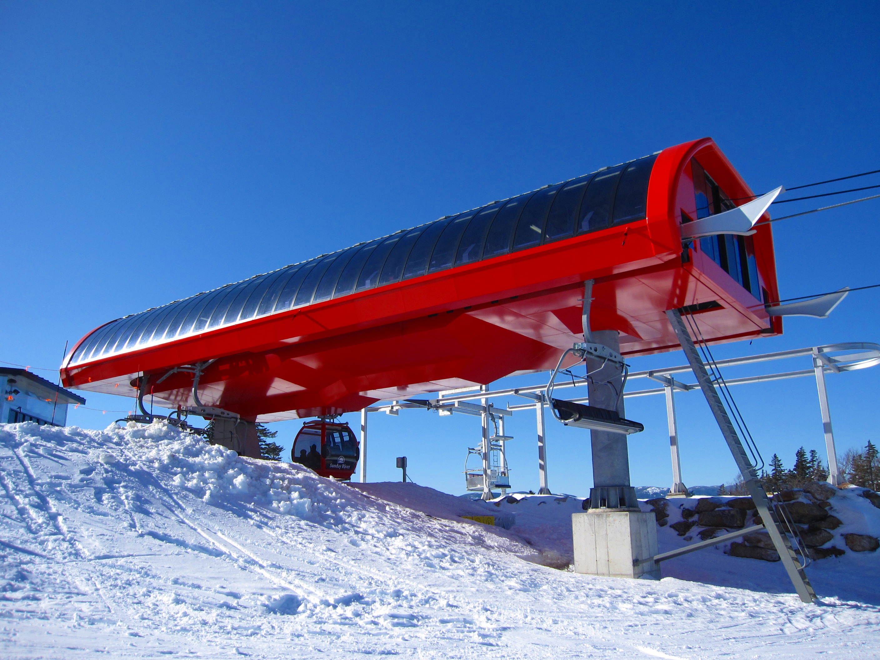 At $7.2 million, the Chondola is one of the most expensive lifts ever built in New England. It is also one of only five combination lifts in North America, the others being at Telluride, Beaver Creek, Mont Orford and Northstar. It is one of only eleven lifts in North America with Doppelmayr’s European towers. Sixty-four six passenger chairs alternate with 16 eight passenger cabins that move a combined 2,330 passengers an hour. The chairs are Doppelmayr’s extra comfy “flying couches” from Austria. The Chondola is Sunday River’s longest lift at 6,427 feet although the vertical is a modest 1,138’. Continue reading →