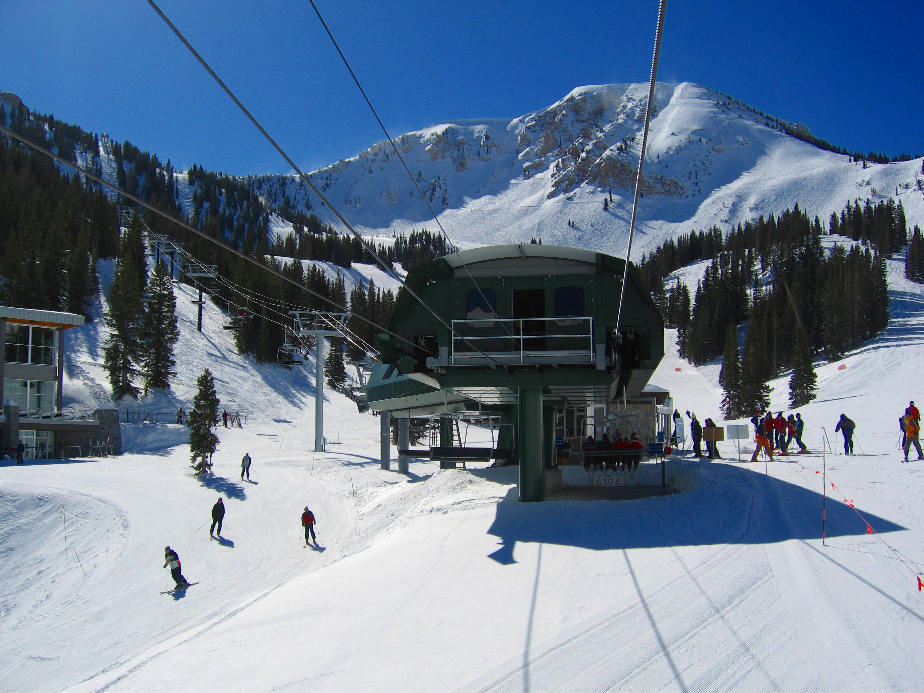 The angle station adjacent to Watson Shelter houses 500-HP drive motors for both sections. There is no unloading at the angle station but skiers can load empty up-bound chairs. Automated gates prevent skiers (remember this is Alta – no snowboarders) from attempting to load occupied chairs. The last time I was at Alta, there was no loading at the mid-station until after 10 am to allow maximum capacity out of the base area. After that, every 6th chair was left empty at the base to allow for loading at the mid-station.