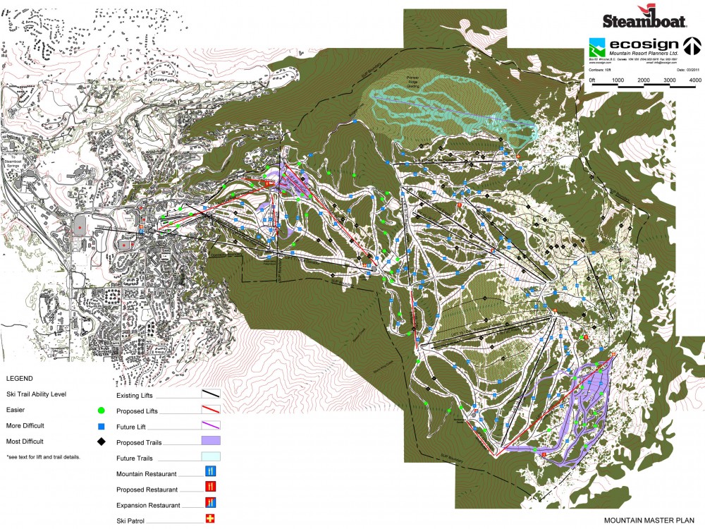 Steamboat is the fourth largest ski resort in Colorado with 19 lifts and almost 3,000 acres of terrain on 10,568 foot Mt. Werner. In 2011, Steamboat Ski & Resort Corporation commissioned Ecosign Mountain Resort Planners to perform a detailed mountain analysis and update the resort’s master plan. The Routt National Forest approved the plan in 2013, which envisions seven new lifts installed over the next ten years to better serve skiers. Included are a mid-mountain learning center served by a second gondola, a new lift on Sunshine Peak and replacement of four lifts with upgraded equipment. The first of the upgrade projects already underway, replacing the Elkhead triple (a 1984 Yan) with a Doppelmayr detachable quad. Initially proposed as a six-pack, Steamboat opted to build a 4-place detachable instead. The new Elkhead will be the first Doppelmayr lift built here since 1997 following four new Leitner-Poma lifts built at Steamboat in the 2000s.