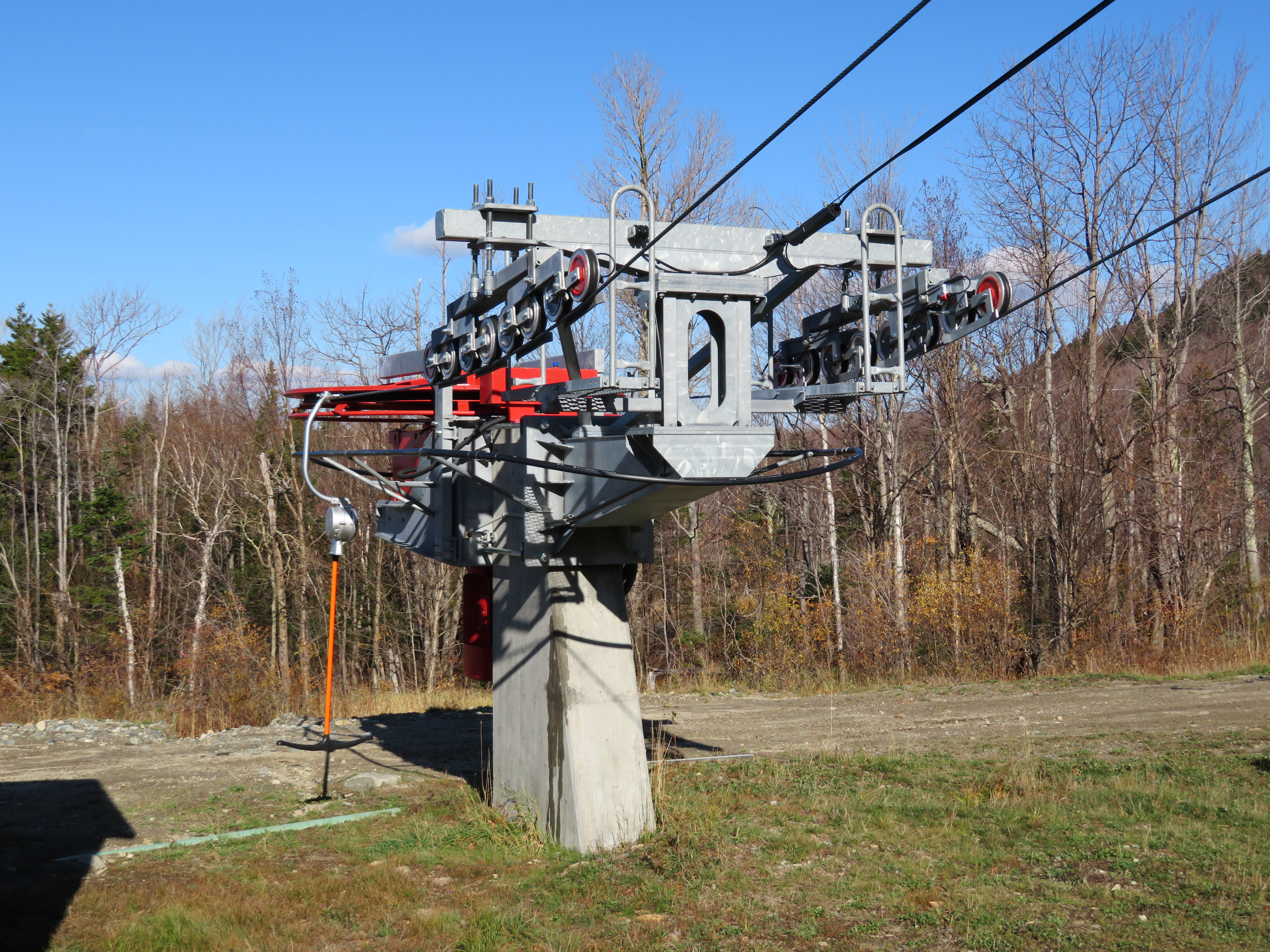 Yesterday I visited both Burke Mountain, Vermont and Cannon Mountain, New Hampshire, where local ski clubs recently partnered to build dedicated surface lifts on terrain used for racing. In some cases, these types of lifts are open to the public but other times not. New T-Bars are relatively cheap with costs typically covered by donors and/or program fees. Another reason for this application is speed; every T-Bar built since 2011 can move at least 550 feet per minute, significantly faster than most fixed-grip chairlifts. The Franconia Notch Ski Club’s new T was built by LST Ropeways and goes up to 690 fpm; Burke Mountain Academy’s nearly-finished one is a Leitner, shown below.