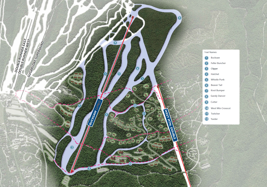 The high speed quad servicing Sugarloaf’s planned West Mountain expansion got a name today: Bucksaw Express. The moniker is a nod to the Bucksaw double, a Stadeli which served the northwest edge of the mountain from 1969 to 2015. Sugarloaf began construction on the 450 acre expansion today and it is expected to open to skiers in February 2024.