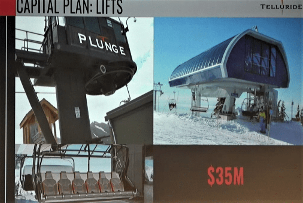 All told, the Hornings are looking at spending $35 million on lifts. Ownership said Telluride will remain a Doppelmayr mountain with fixed grip, UNI-G and D-Line options all under consideration. They noted global steel and copper demands are impacting lift prices but both parties are eager to make a deal.