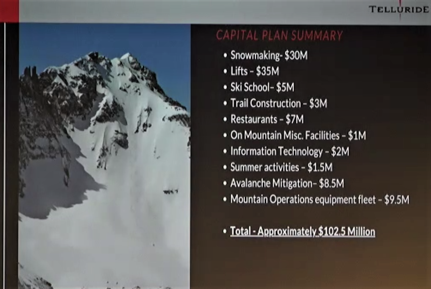 Telluride Ski & Golf owners Chuck and Chad Horning hosted a community meeting tonight, outlining a nine figure capital plan for the next five to ten years. While no lift contracts have been signed, Telski officials revealed they are close to a deal with Doppelmayr for a new detachable quad and are working on three additional projects to be built in seasons to come. Telluride also outlined new employee housing and hotel initiatives which are key to supporting future growth.