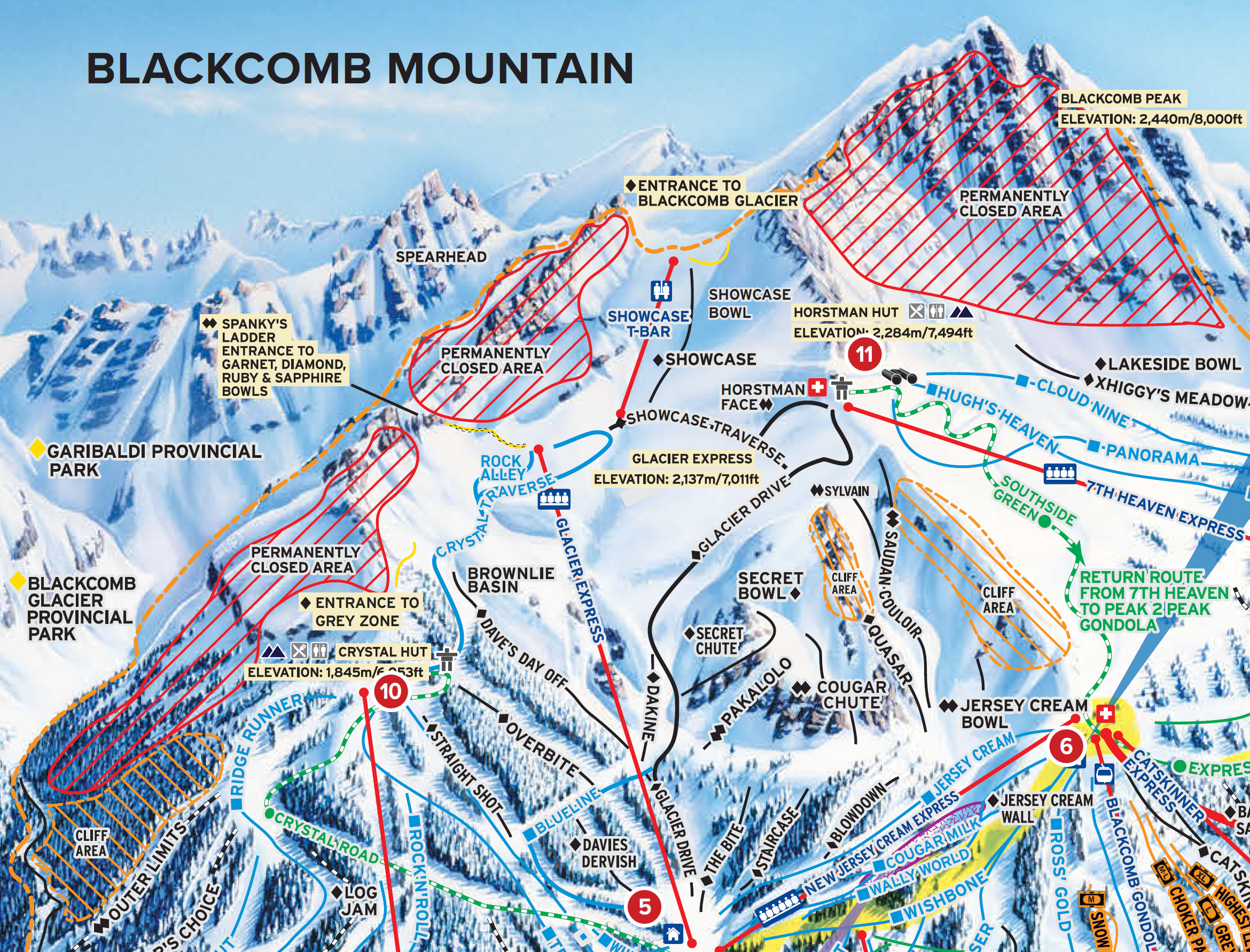 Opened in 1988, the Showcase T-Bar crests the upper part of Horstman Glacier near Blackcomb Peak. For much of its history, the T-Bar ran throughout winter, spring and summer; servicing a wide variety of terrain. In recent years, glacial recession caused the Doppelmayr T-Bar to operate sporadically. Three of Showcase’s towers are pinned on ice, requiring periodic maintenance and repair. When snow levels drop too low, the track becomes too steep for safe riding. Vail removed the nearby Horstman T-Bar without replacement in 2020 due to recession on the lower part of the glacier.