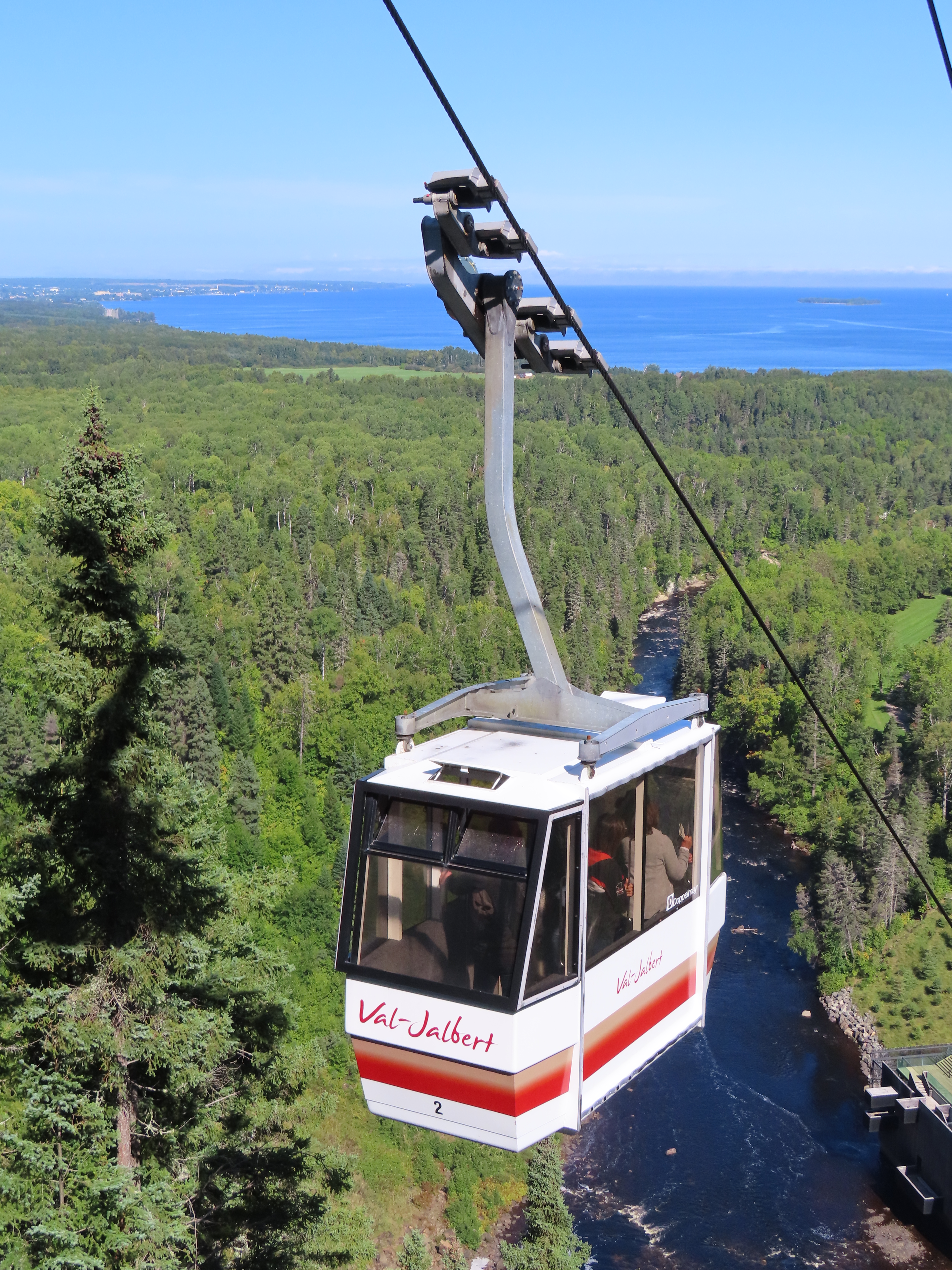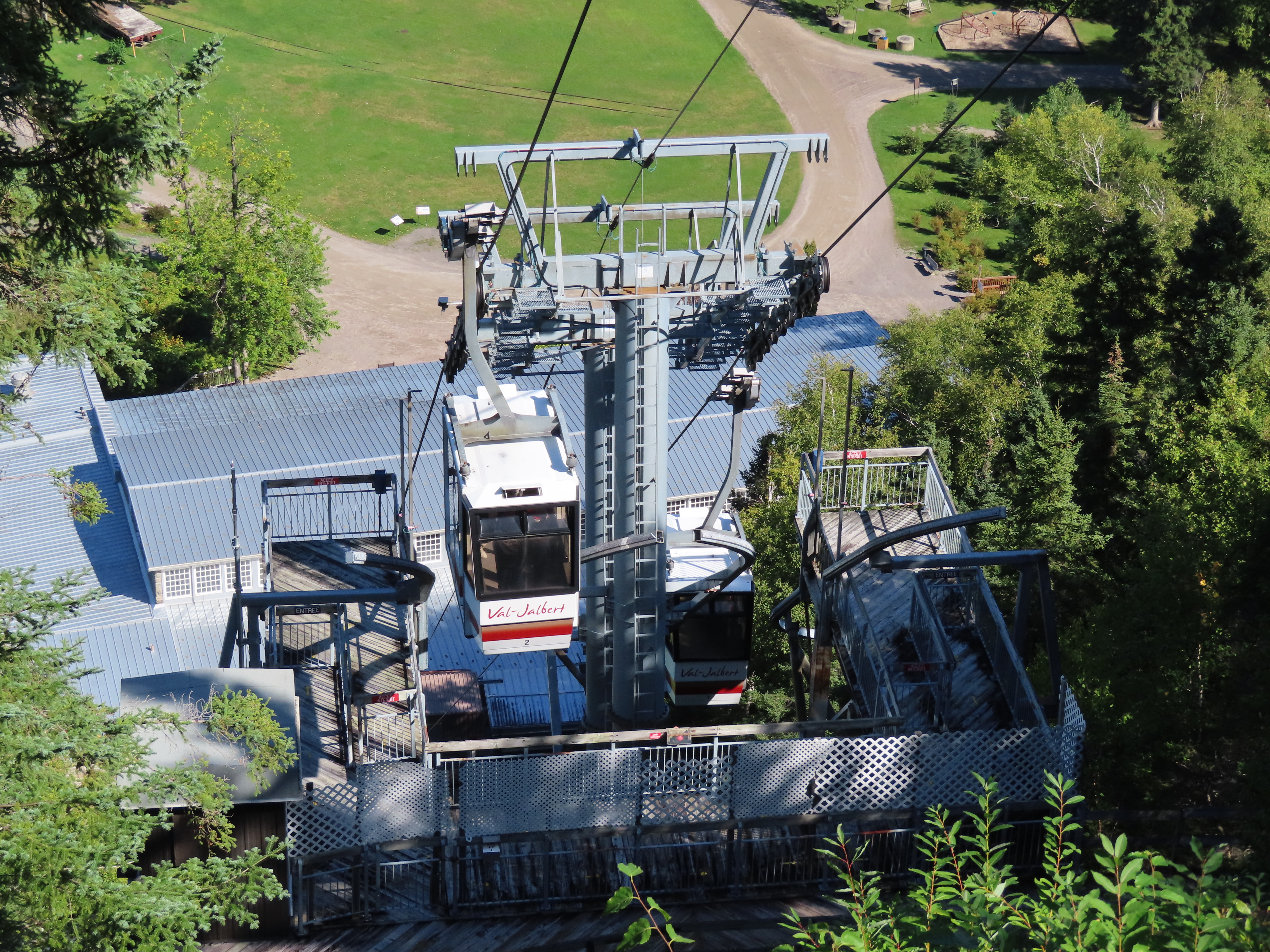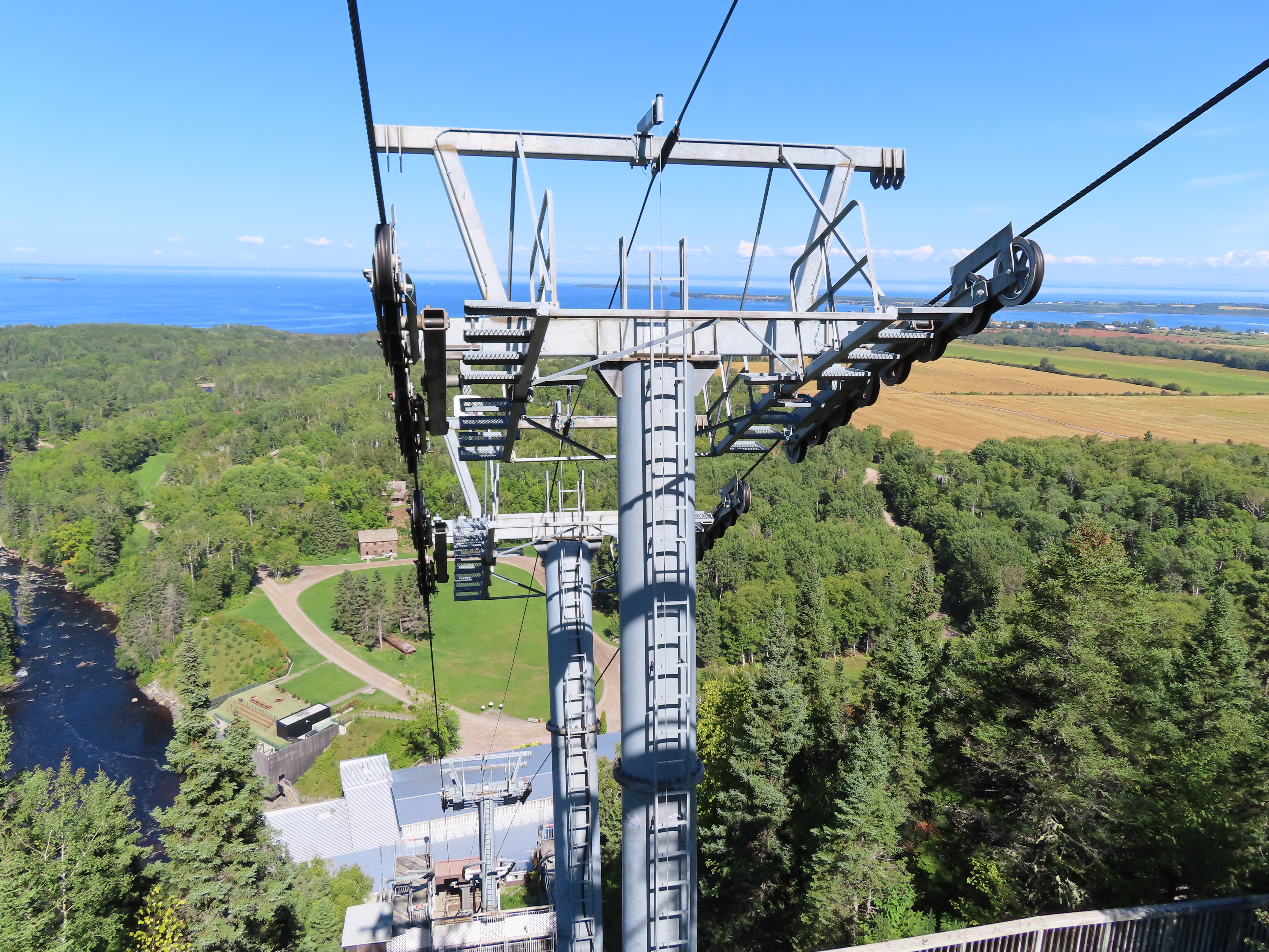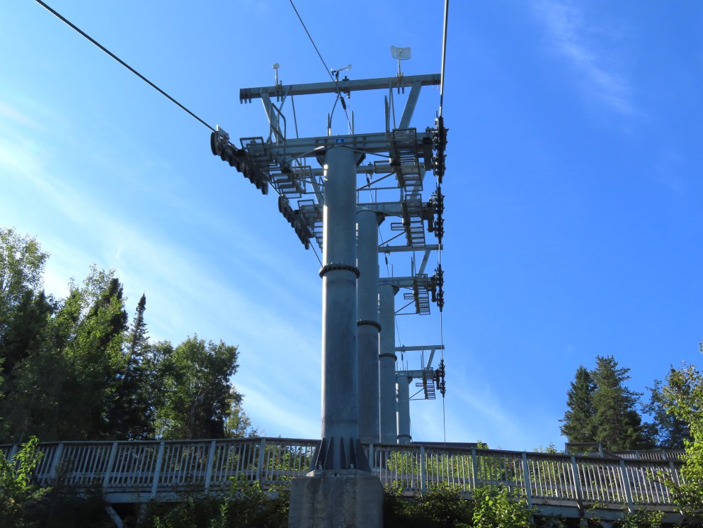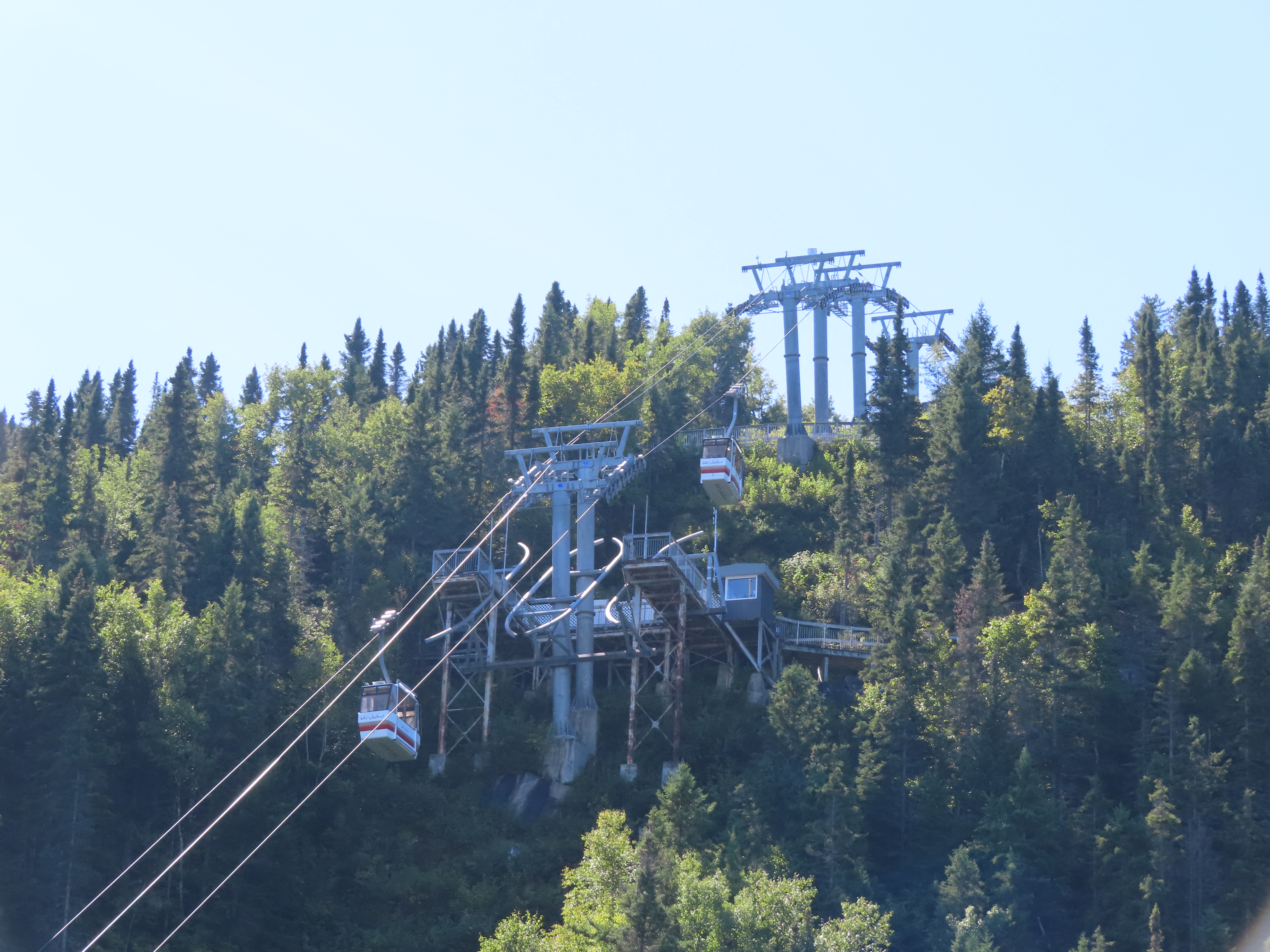 This lift connects a ghost town and mill to the top of a waterfall.Bottom fixed drive station.Carriage with four spring grips.The top breakover.Another view of the same four towers.View up the steep lift line from the loading area.Upgraded Doppelmayr operator controls.The top station with hydraulic tensioning.Upper station seen from below.Towers 4 and 5 with views of Lac-Saint-Jean.Breakover towers seen from the side.Cabin 1 above the middle station.Cabins stop at a middle station every trip.Cabin 2 with room for 15 passengers.Towers 6 and 7.Side view of the mid-station, which is no longer in use as of 2023.Cabin 2 in the middle station.Even though the mid-station is no longer used, the lift still stops when both cabins reach the there.Loading area.Steep climb out of the bottom station.Drive station controls.Return station sheave assemblies. Technically this is tower 8.Another view of the top bullwheel.View riding down at tower 5.Middle station.Bottom station seen from above.A cabin with manual doors and no operator.