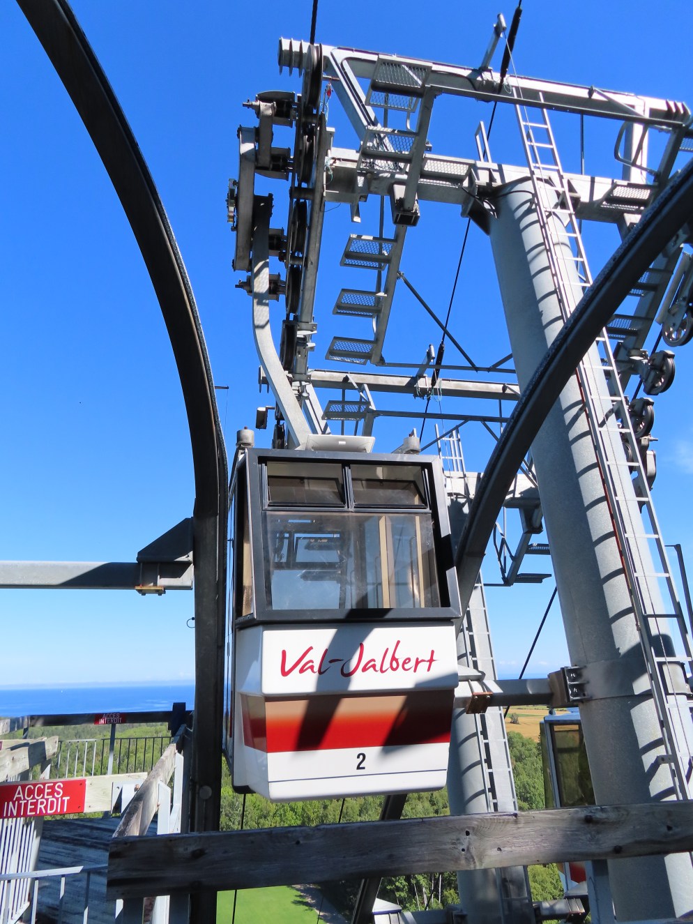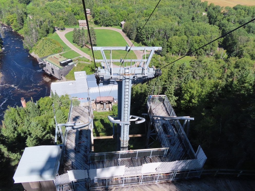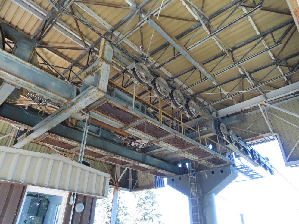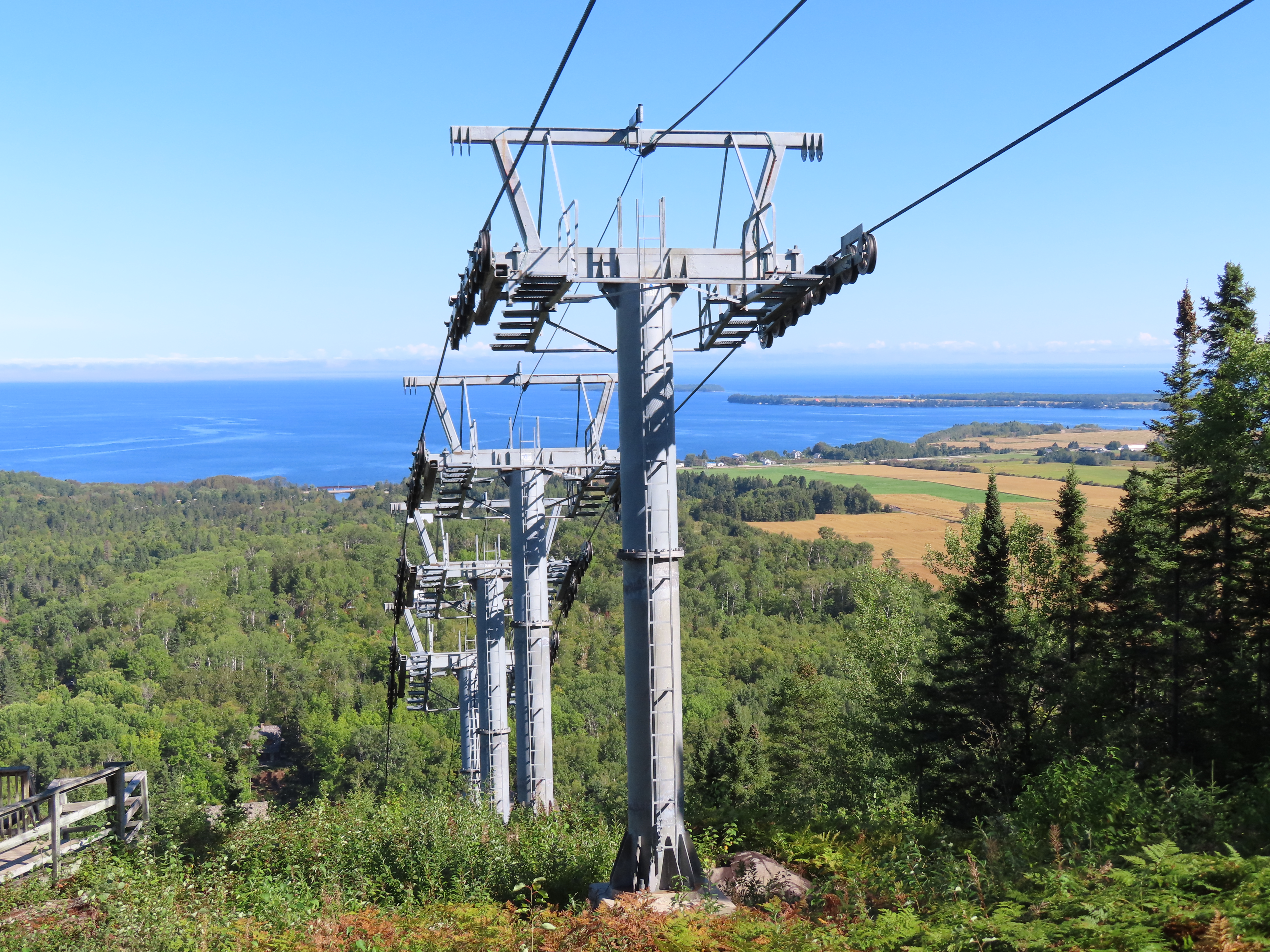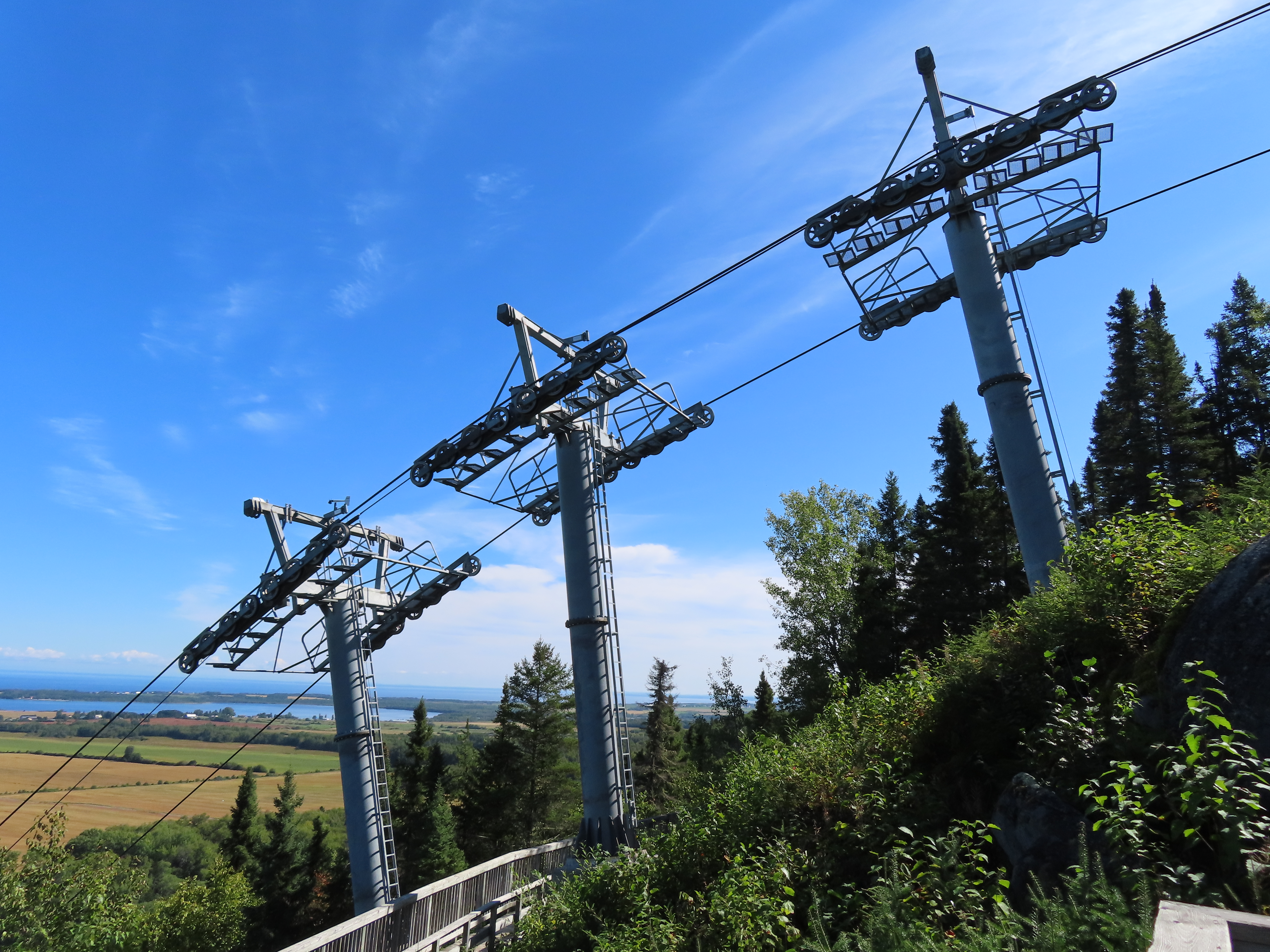 This lift connects a ghost town and mill to the top of a waterfall.Bottom fixed drive station.Carriage with four spring grips.The top breakover.Another view of the same four towers.View up the steep lift line from the loading area.Upgraded Doppelmayr operator controls.The top station with hydraulic tensioning.Upper station seen from below.Towers 4 and 5 with views of Lac-Saint-Jean.Breakover towers seen from the side.Cabin 1 above the middle station.Cabins stop at a middle station every trip.Cabin 2 with room for 15 passengers.Towers 6 and 7.Side view of the mid-station, which is no longer in use as of 2023.Cabin 2 in the middle station.Even though the mid-station is no longer used, the lift still stops when both cabins reach the there.Loading area.Steep climb out of the bottom station.Drive station controls.Return station sheave assemblies. Technically this is tower 8.Another view of the top bullwheel.View riding down at tower 5.Middle station.Bottom station seen from above.A cabin with manual doors and no operator.