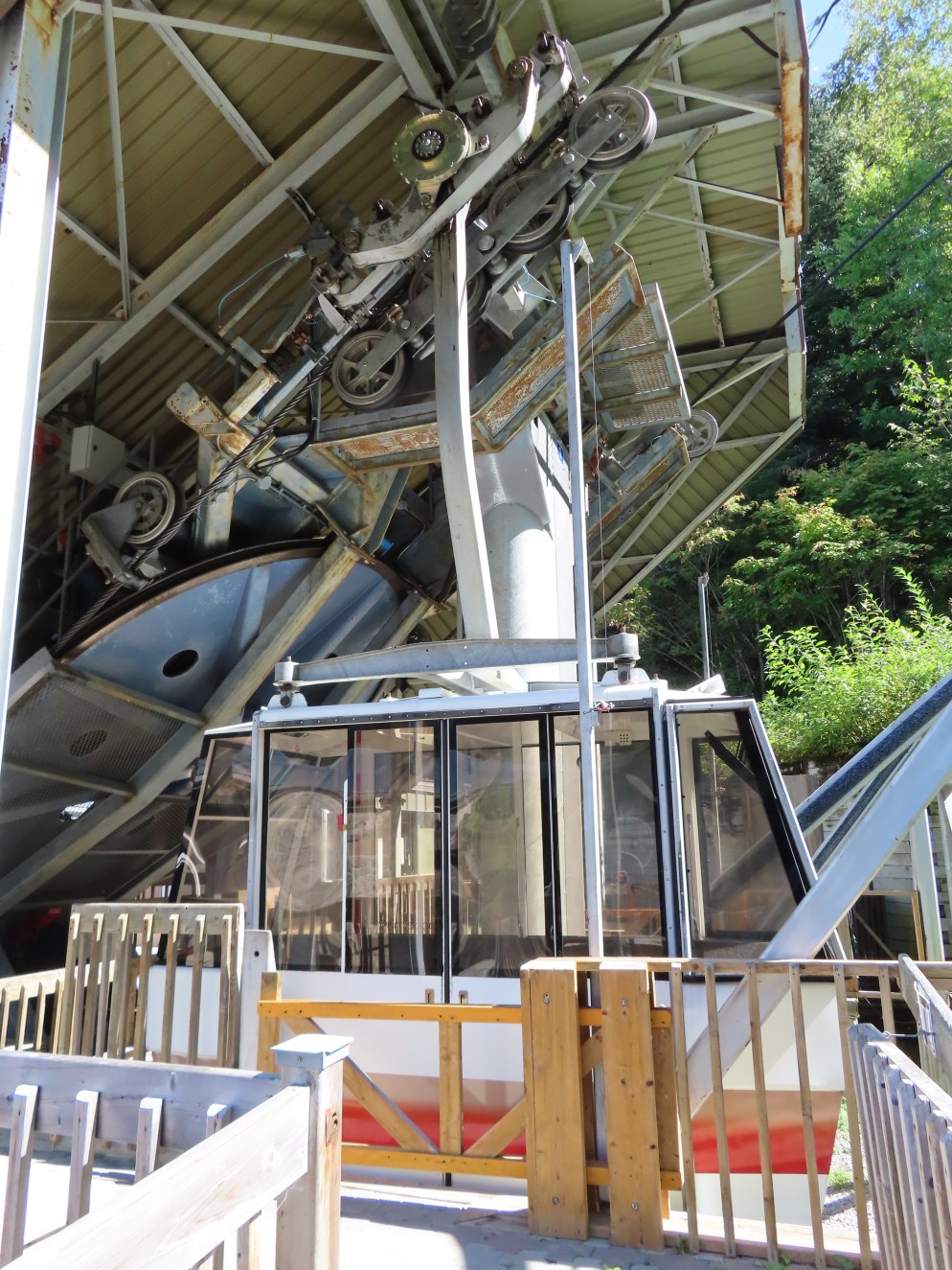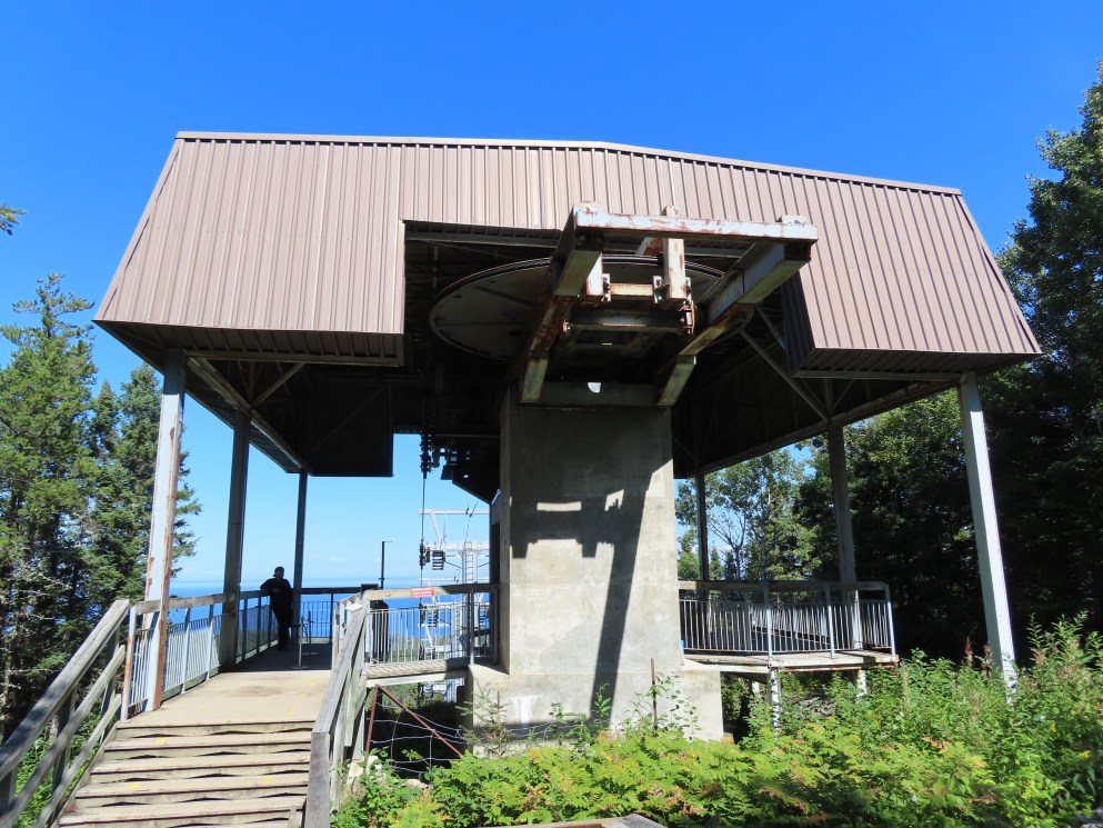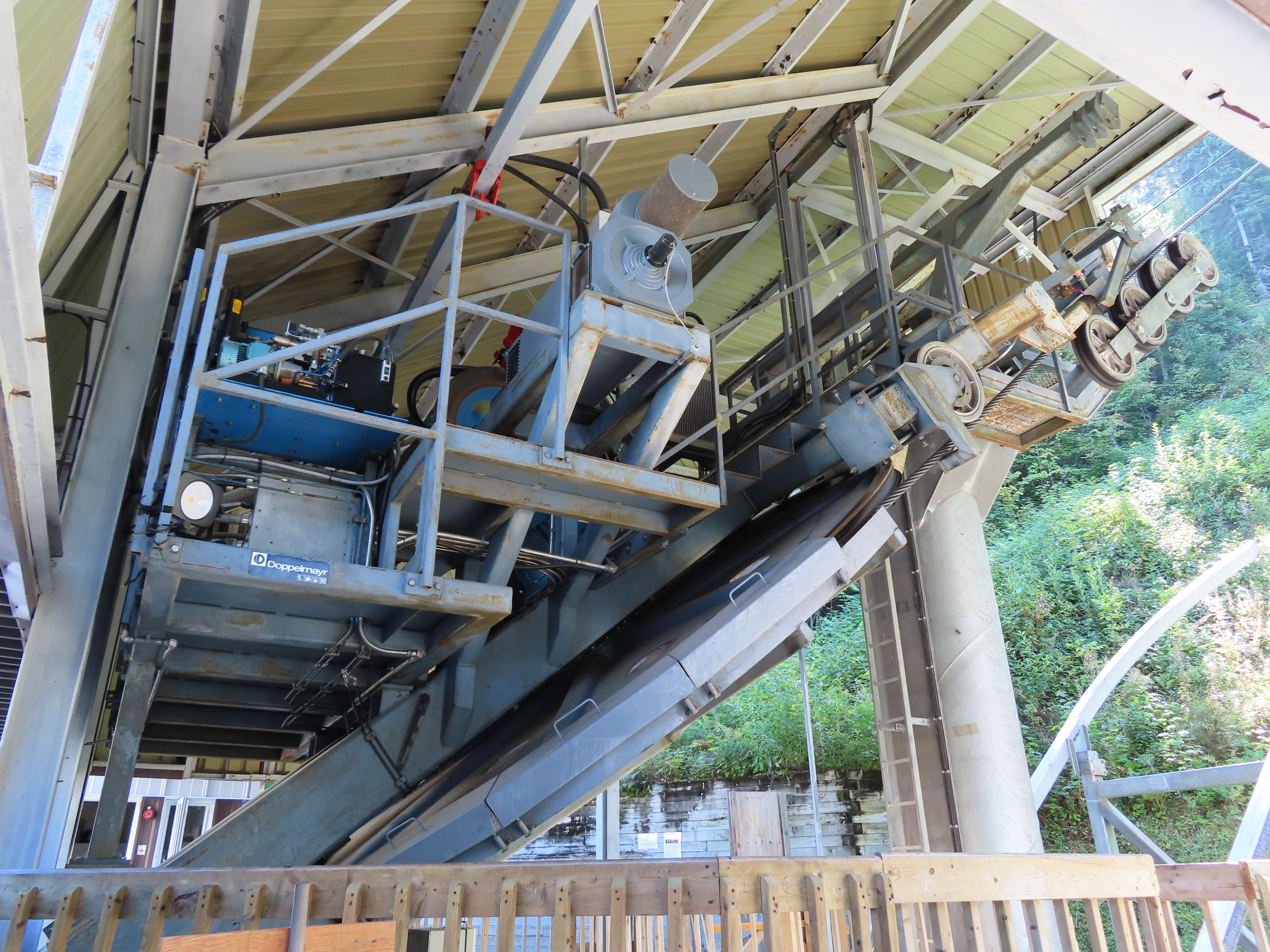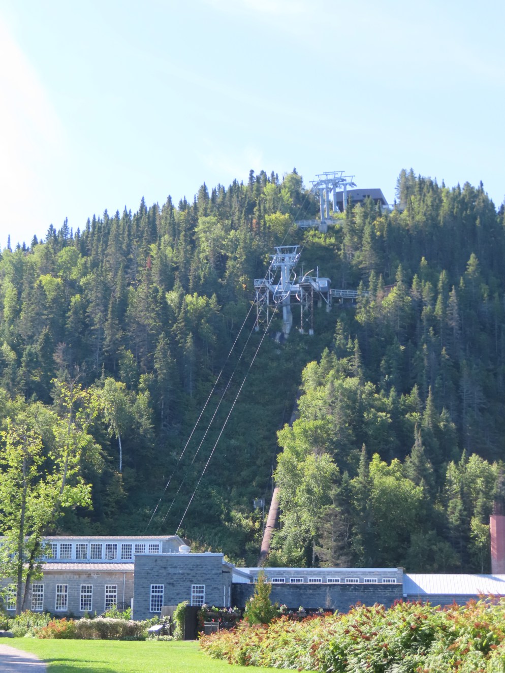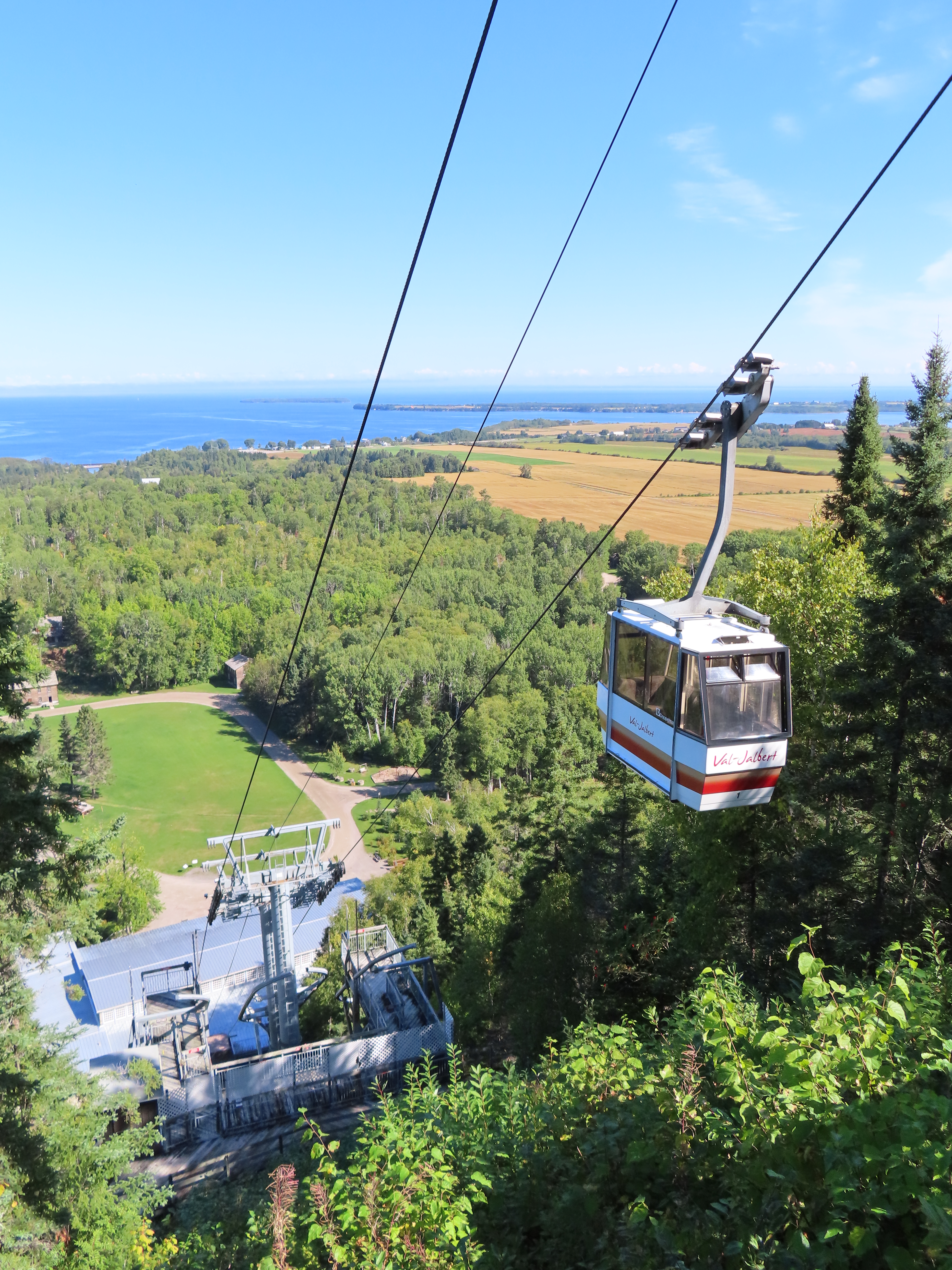 This lift connects a ghost town and mill to the top of a waterfall.Bottom fixed drive station.Carriage with four spring grips.The top breakover.Another view of the same four towers.View up the steep lift line from the loading area.Upgraded Doppelmayr operator controls.The top station with hydraulic tensioning.Upper station seen from below.Towers 4 and 5 with views of Lac-Saint-Jean.Breakover towers seen from the side.Cabin 1 above the middle station.Cabins stop at a middle station every trip.Cabin 2 with room for 15 passengers.Towers 6 and 7.Side view of the mid-station, which is no longer in use as of 2023.Cabin 2 in the middle station.Even though the mid-station is no longer used, the lift still stops when both cabins reach the there.Loading area.Steep climb out of the bottom station.Drive station controls.Return station sheave assemblies. Technically this is tower 8.Another view of the top bullwheel.View riding down at tower 5.Middle station.Bottom station seen from above.A cabin with manual doors and no operator.