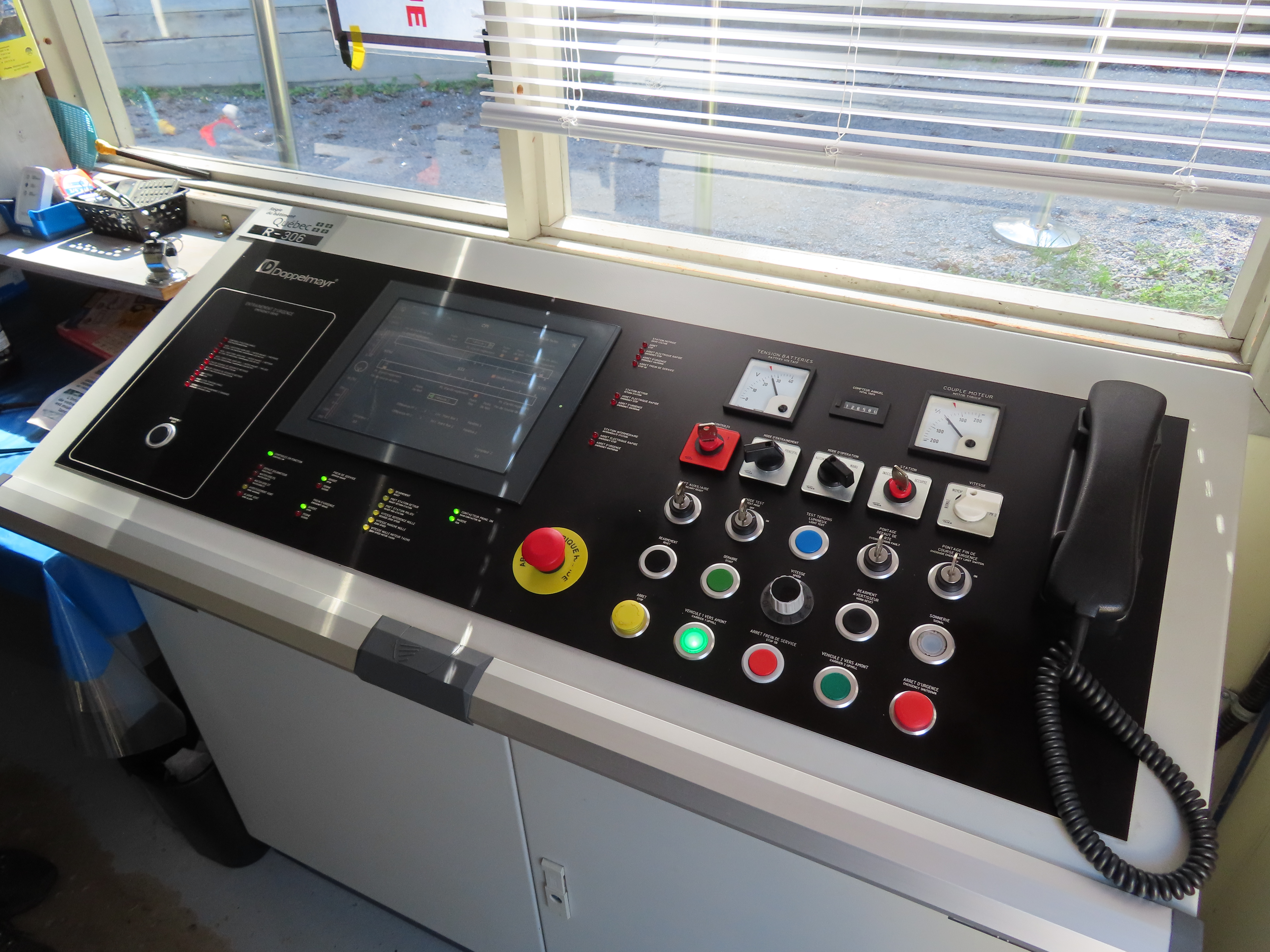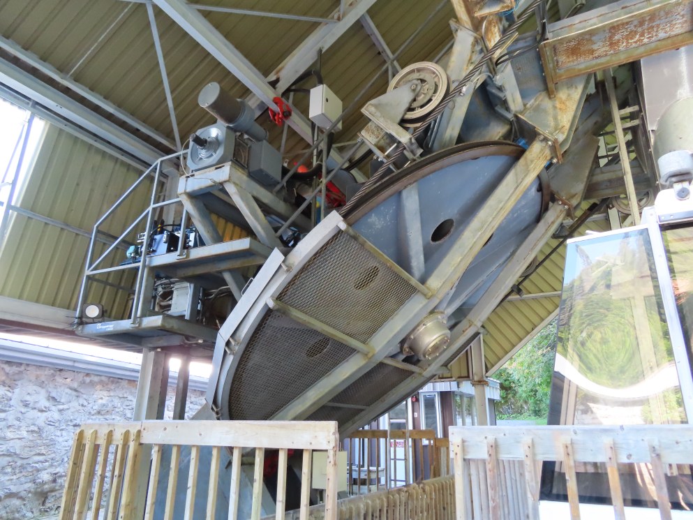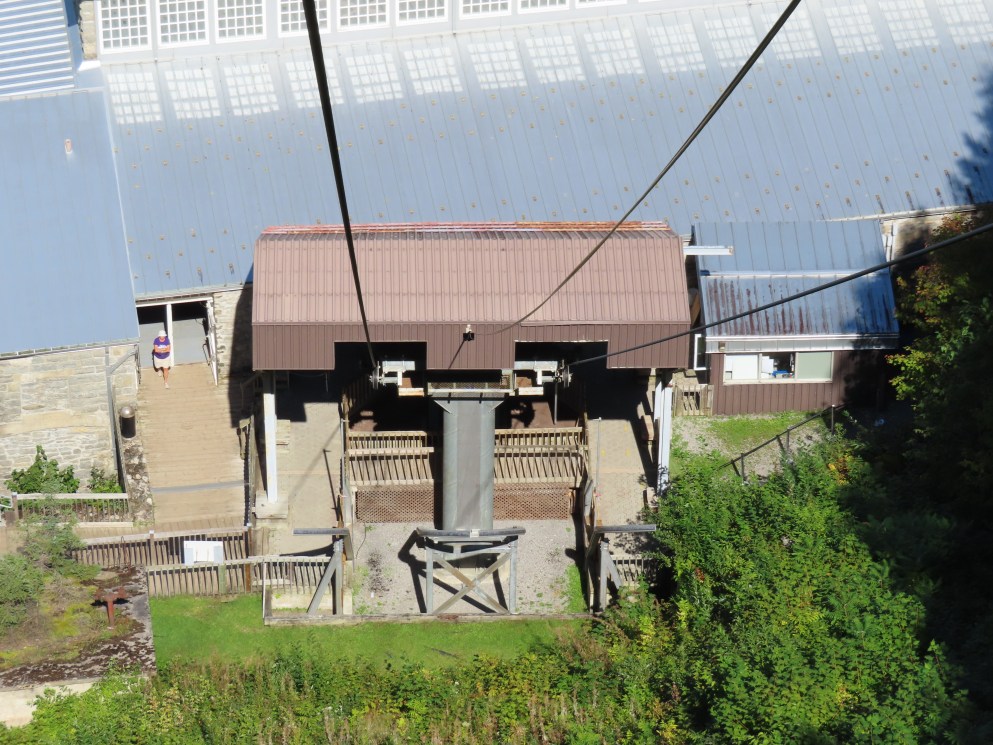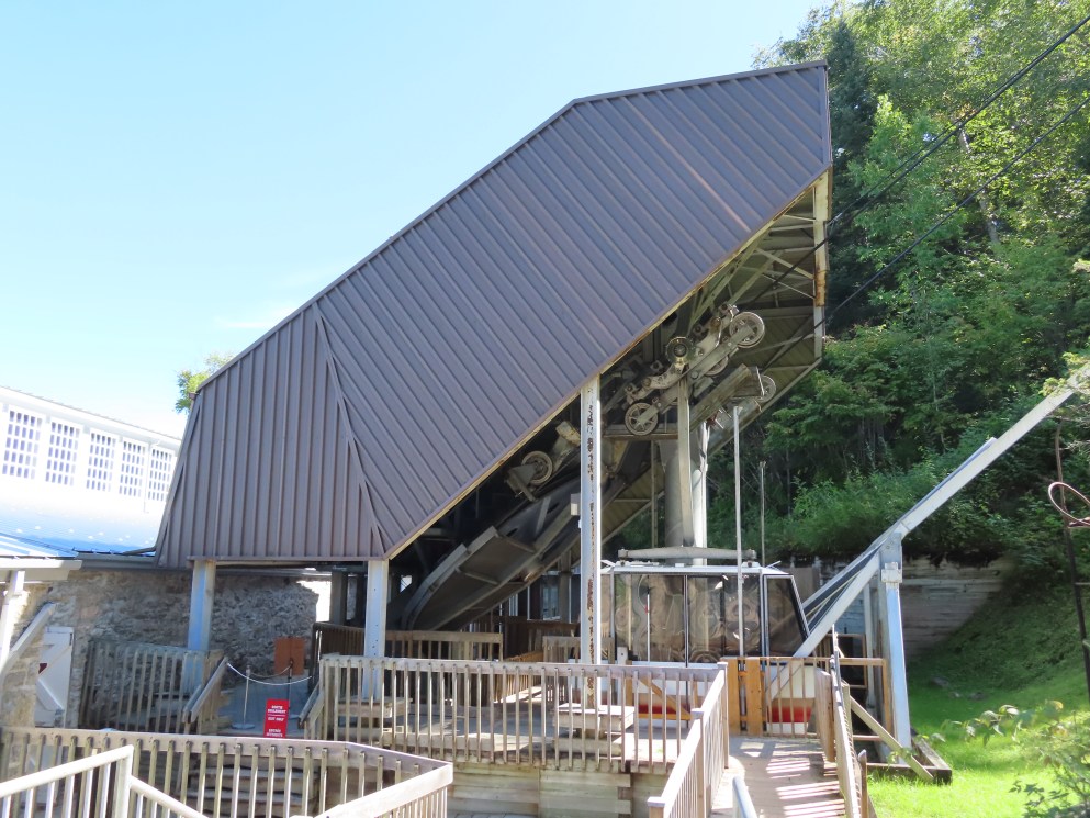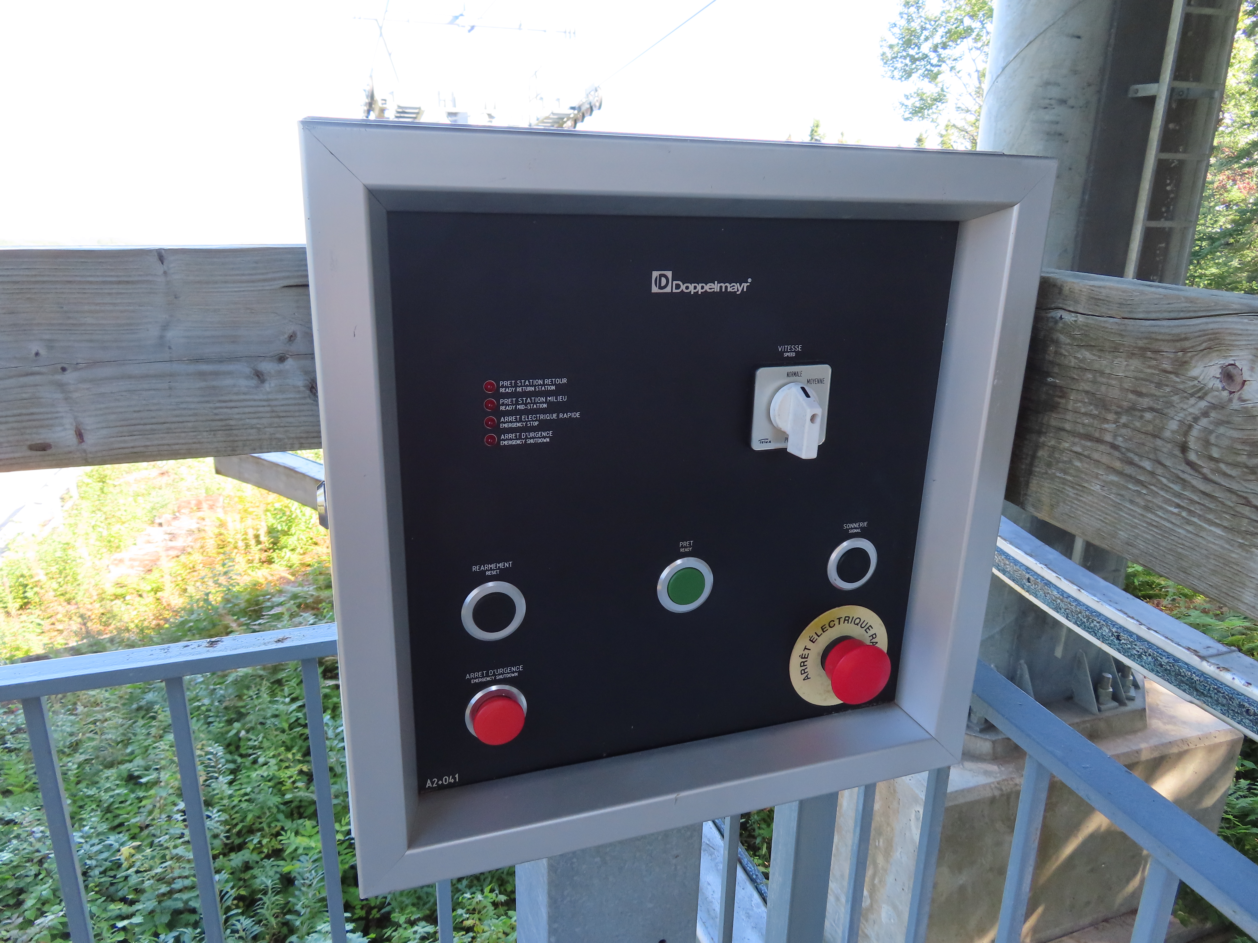 This lift connects a ghost town and mill to the top of a waterfall.Bottom fixed drive station.Carriage with four spring grips.The top breakover.Another view of the same four towers.View up the steep lift line from the loading area.Upgraded Doppelmayr operator controls.The top station with hydraulic tensioning.Upper station seen from below.Towers 4 and 5 with views of Lac-Saint-Jean.Breakover towers seen from the side.Cabin 1 above the middle station.Cabins stop at a middle station every trip.Cabin 2 with room for 15 passengers.Towers 6 and 7.Side view of the mid-station, which is no longer in use as of 2023.Cabin 2 in the middle station.Even though the mid-station is no longer used, the lift still stops when both cabins reach the there.Loading area.Steep climb out of the bottom station.Drive station controls.Return station sheave assemblies. Technically this is tower 8.Another view of the top bullwheel.View riding down at tower 5.Middle station.Bottom station seen from above.A cabin with manual doors and no operator.