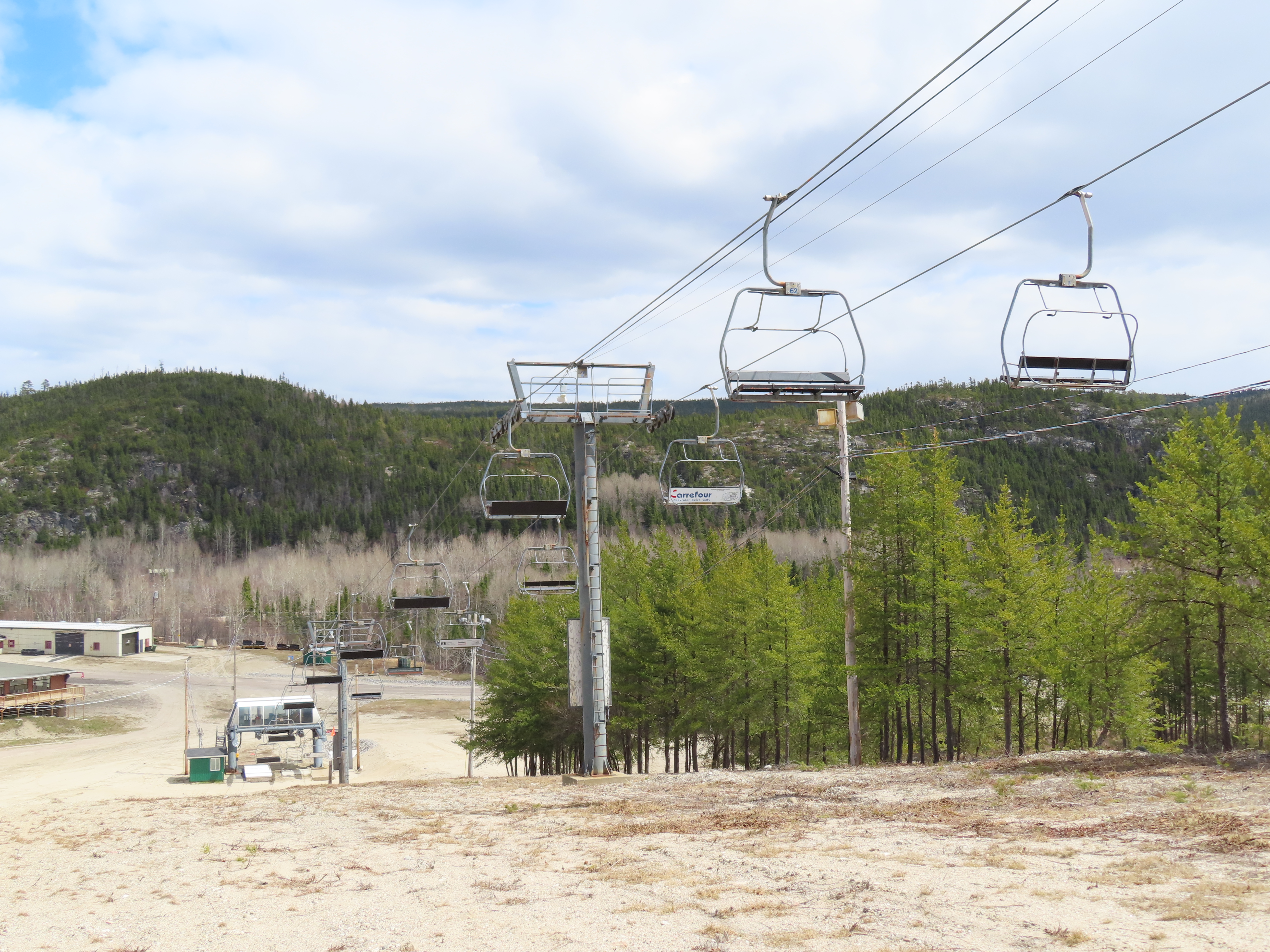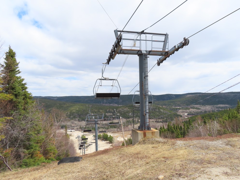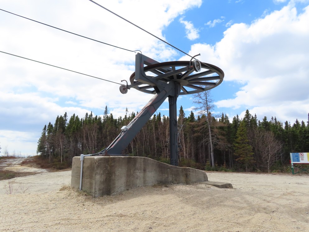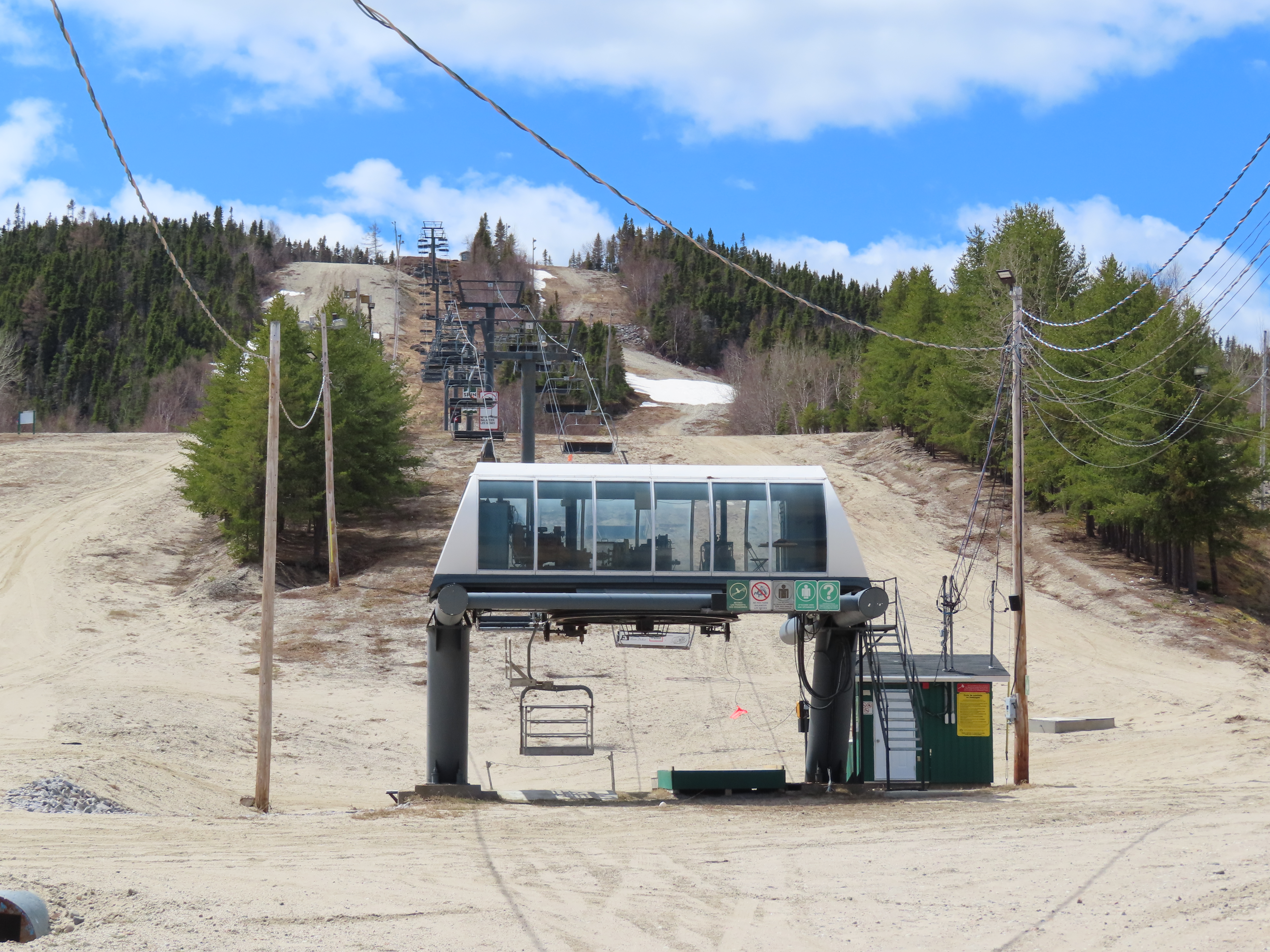 This Poma quad services the middle of three separate mountains at Ti-Basse.Rare Poma lift for Quebec.View down the lift line.Another view of the line.Middle section of the line.Top return terminal.Upper station overview.The first few towers.Lift overview.View up from tower 3.