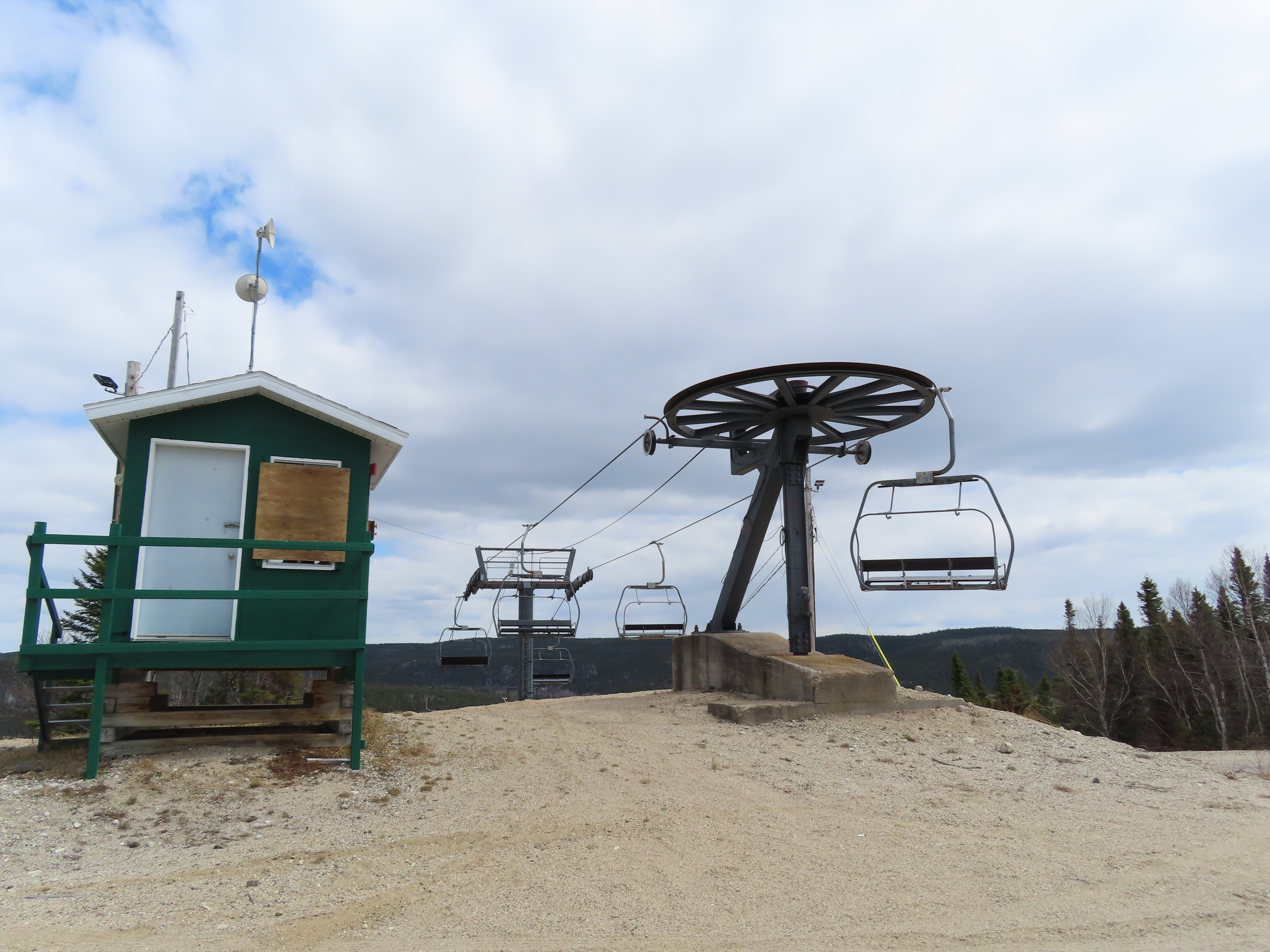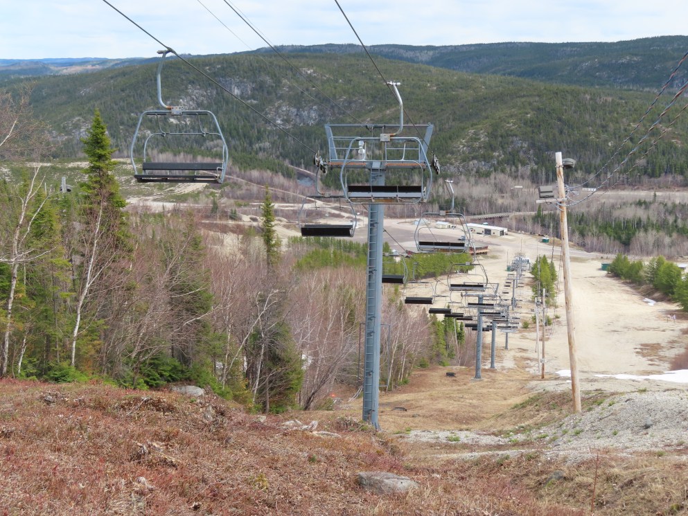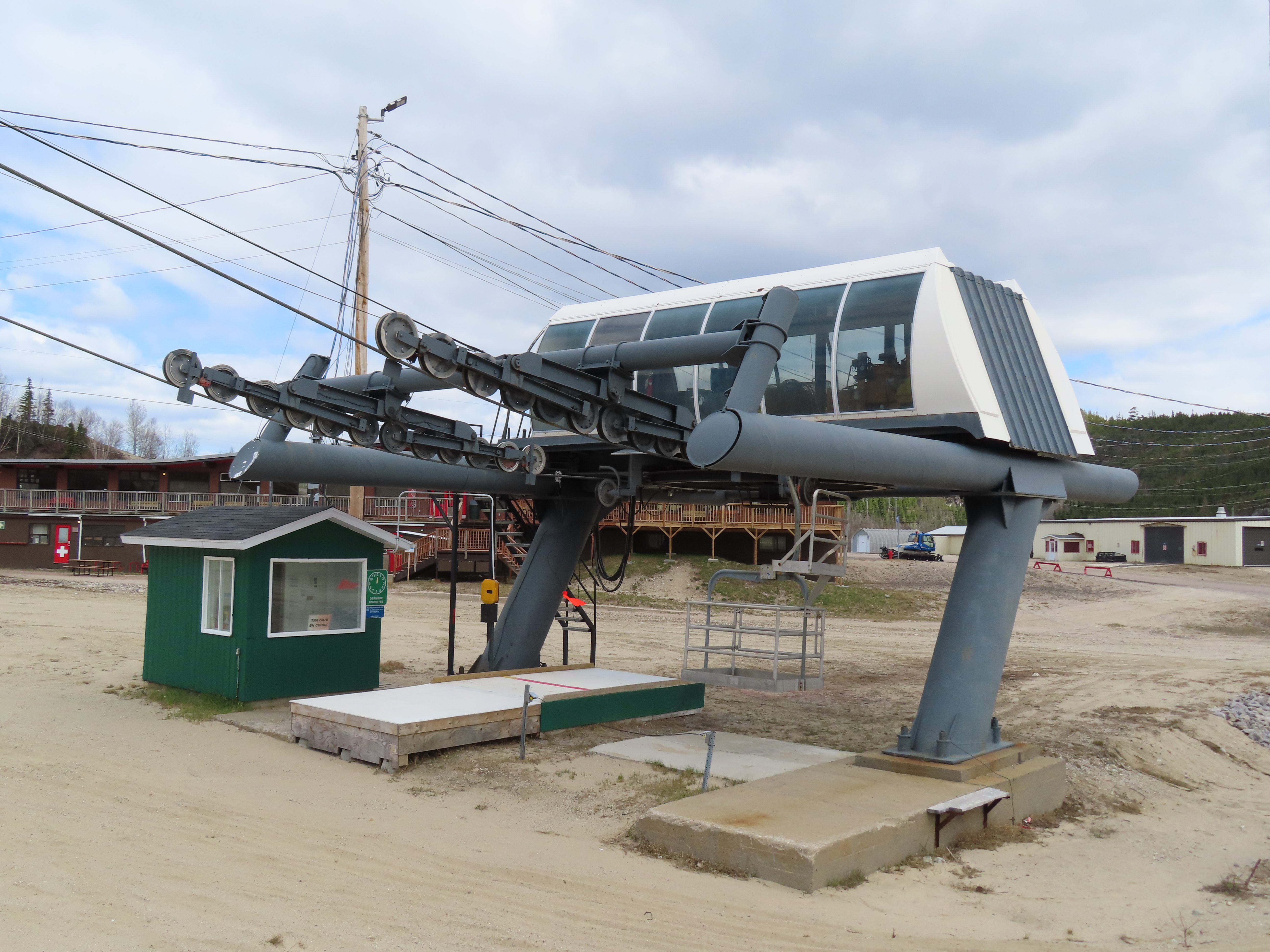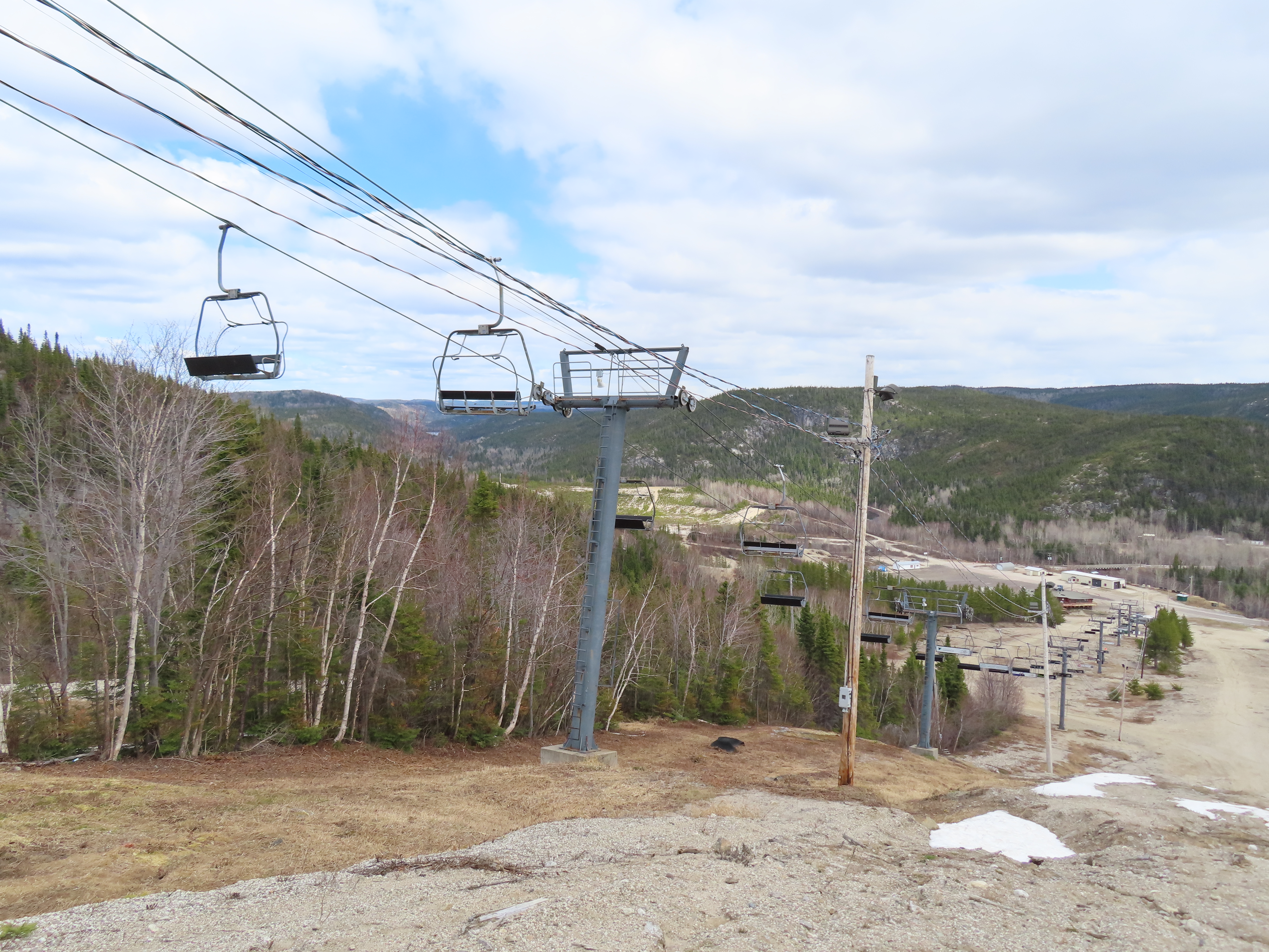 This Poma quad services the middle of three separate mountains at Ti-Basse.Rare Poma lift for Quebec.View down the lift line.Another view of the line.Middle section of the line.Top return terminal.Upper station overview.The first few towers.Lift overview.View up from tower 3.