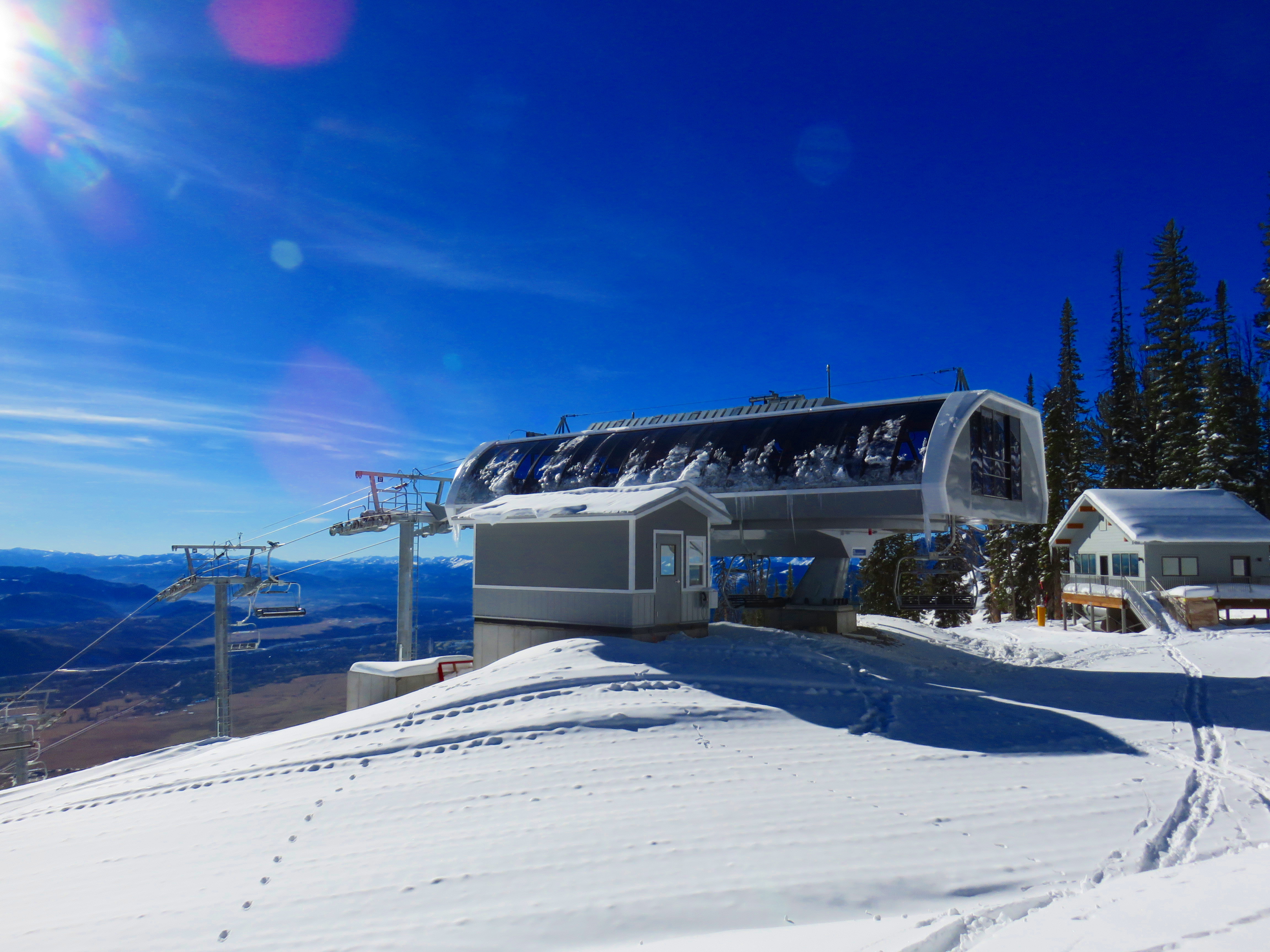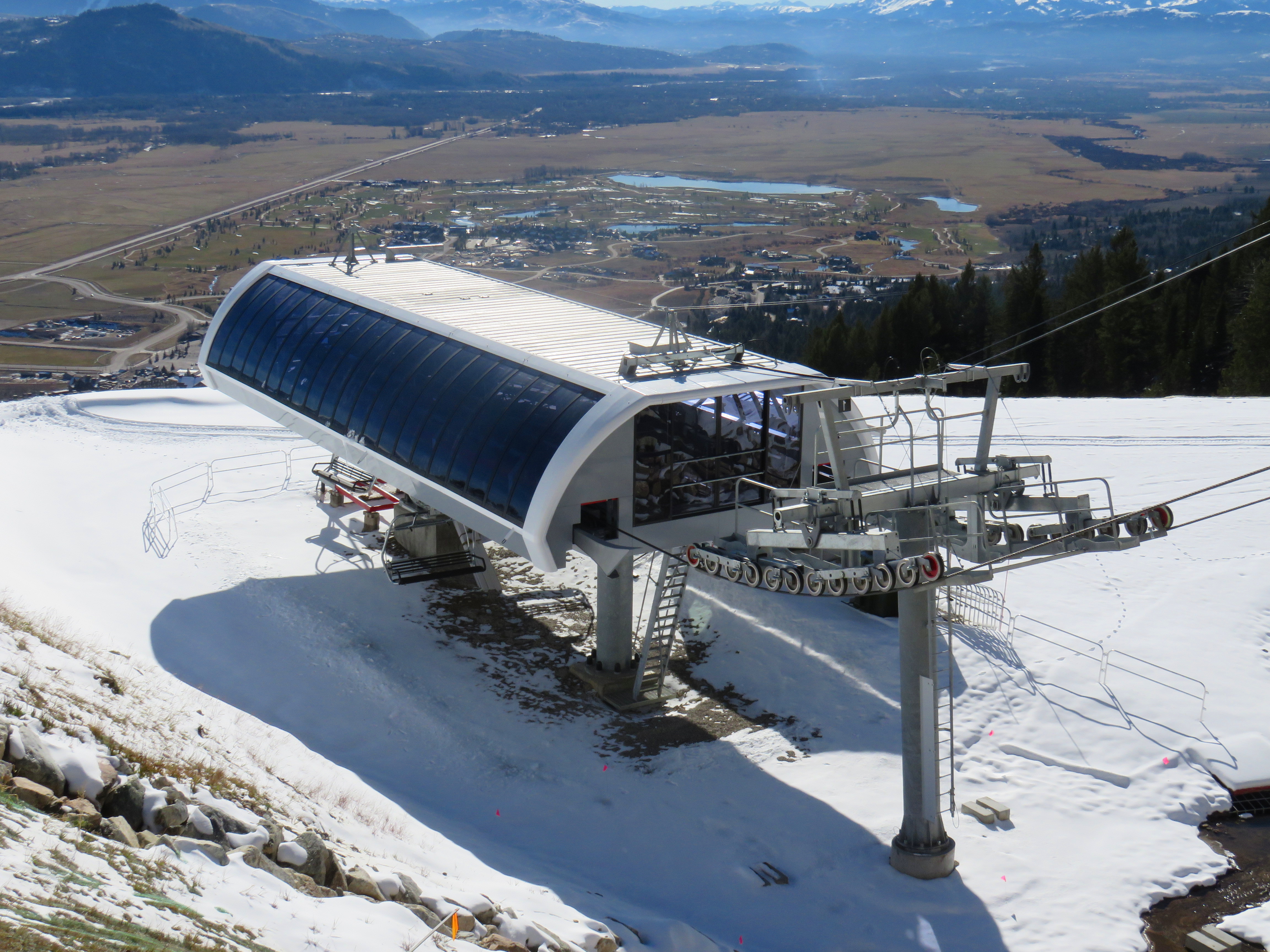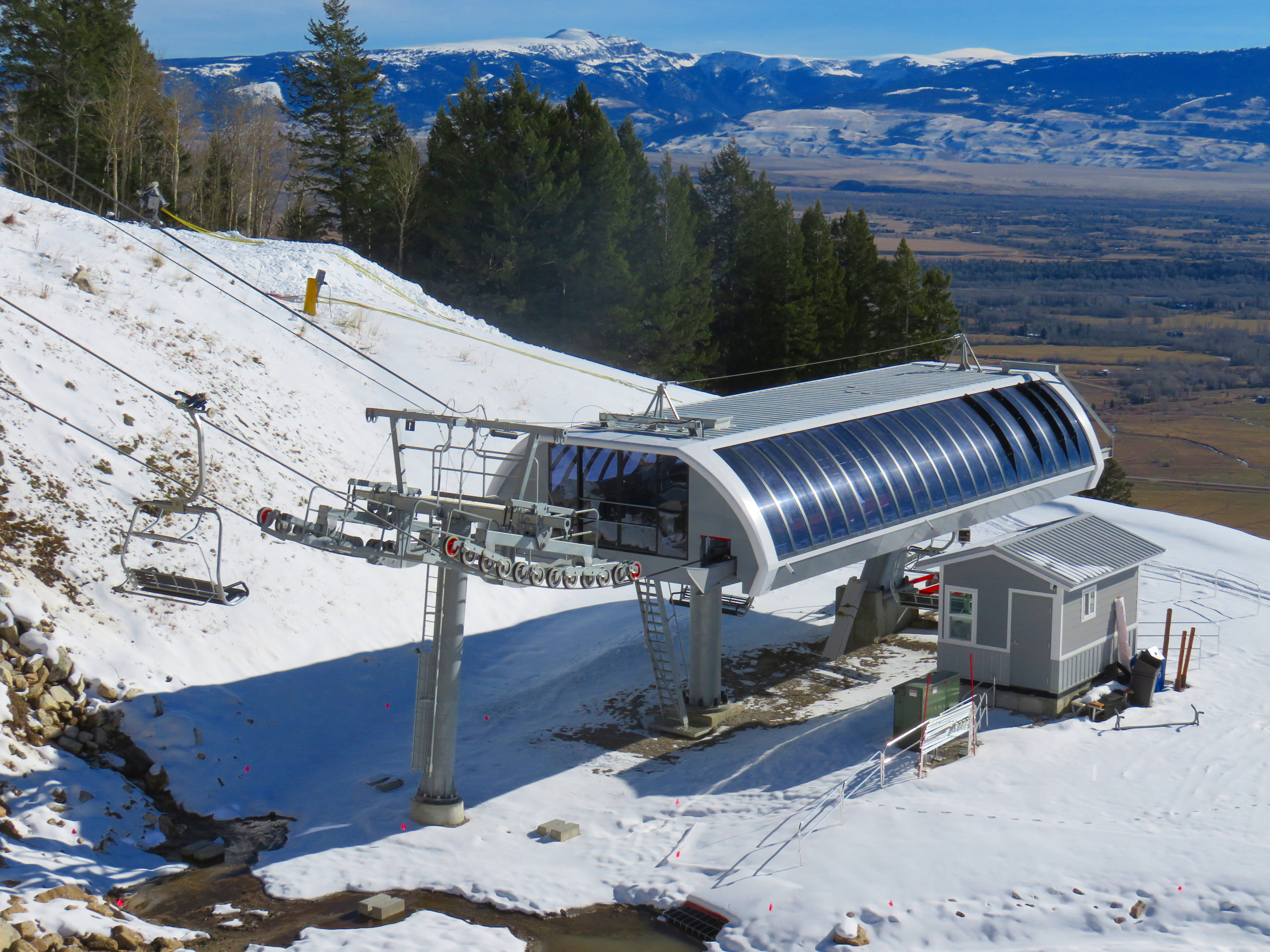 Tower 12.The top terminal and patrol station from below.Doppelmayr Uni-G drive terminal.Snow up high, dry down low.Side view of the top terminal.View down the line.Summit terminal underskin.Another look down line.Lower section of the lift.Looking up the line.Bottom terminal and tower 1.Another look at the return terminal.90-degree loading.Lift overview.Loading platform and control pedestal.Another view of the return.Close-up of the departure side.Depression tower 1.