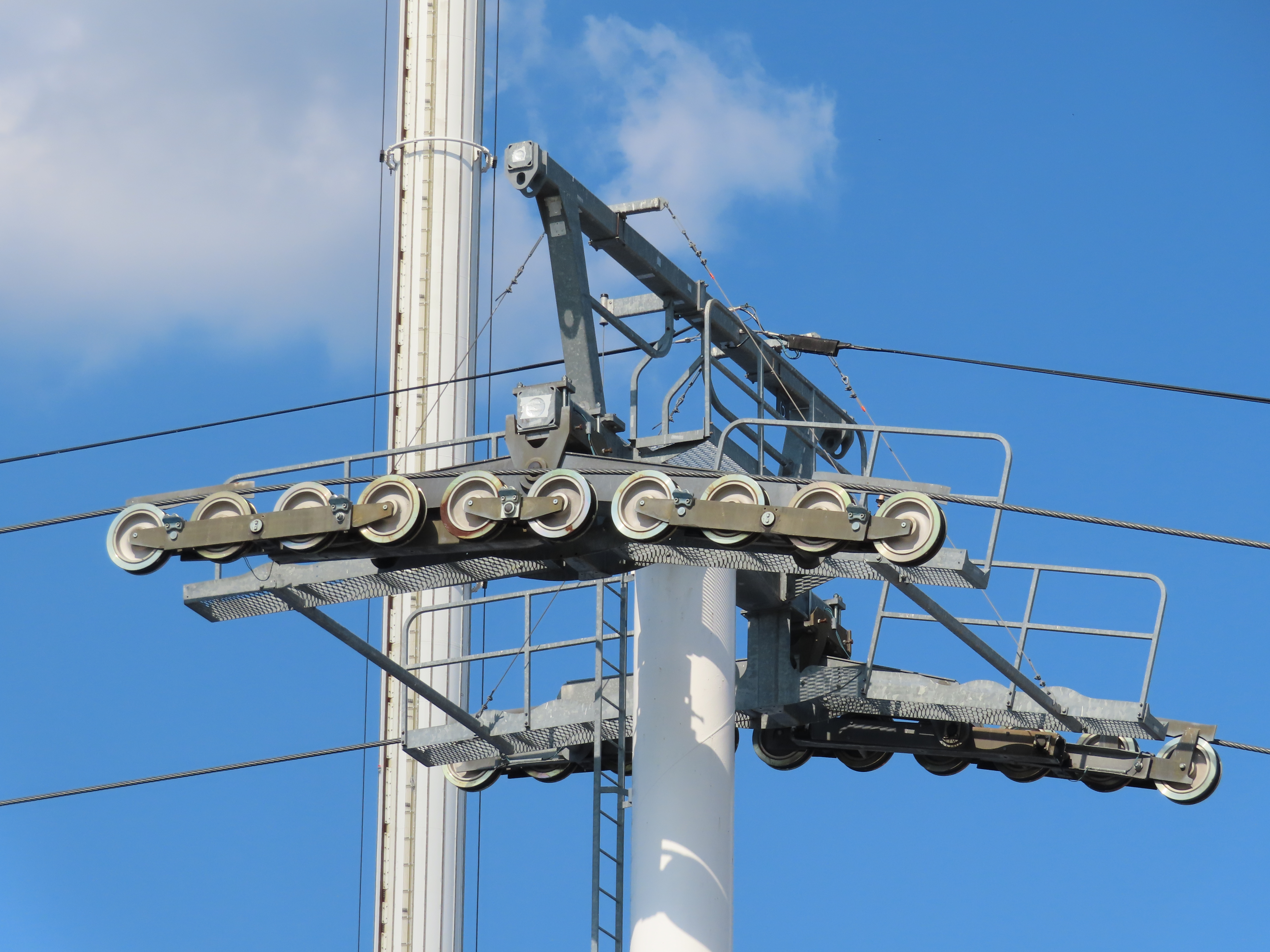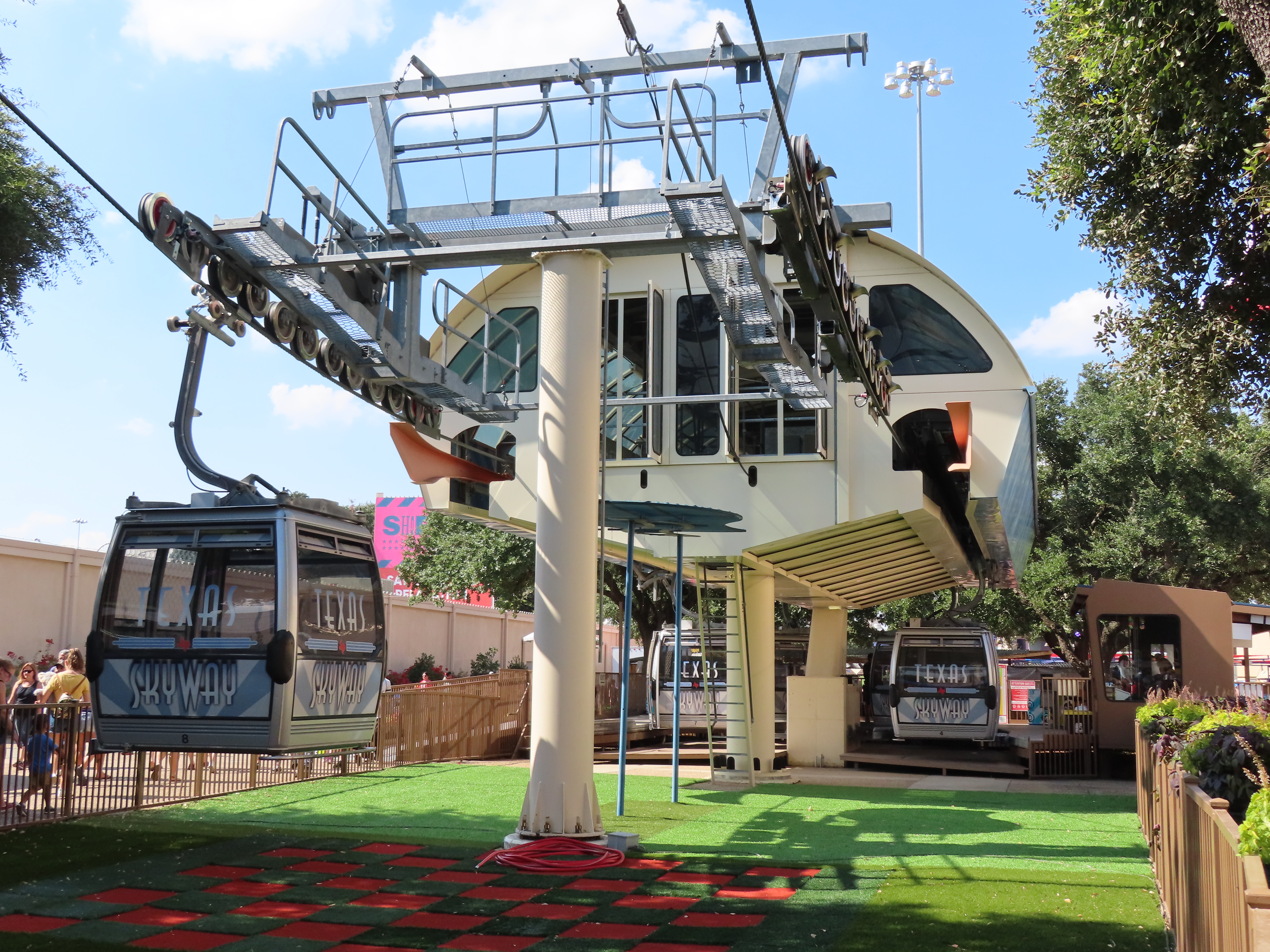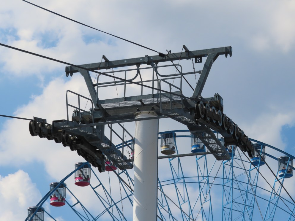 This Doppelmayr CTEC Uni-GS detachable opened in 2007.The drive terminal was built at elevation with a fair entrance later added below.Tower 6.The drive station seen from below.CWA Ethos 8 cabin with a DT-108 grip. Look closely and you’ll see a charging contact for night lighting.Tall towers on the midway.Tower 1.Another view of the first tower.The return terminal at ground level.Side view of a Uni-GS station.Depression assembly.The western station.View east.Riding along the line.Passing tower 6.Loading and unloading is allowed at both stations.A cabin arrives at the Pennsylvania Avenue station.Tower head.Interestingly, the towers are numbered from the return station rather than the drive.T6.Towers 7 and 8.The lift is called the Texas Skyway.Turnaround loading area.Curiously, the cabins were manufactured five years before the lift went in.Tower 5.T4.Tower 3.Middle part of the lift line.Arriving at the return terminal.Some of the cabins have two outer benches while others have benched in the middle facing out.Cabins are Texas-sized.Support sheave assemblies.Drive station overview.There is full cabin parking at the eastern terminal.