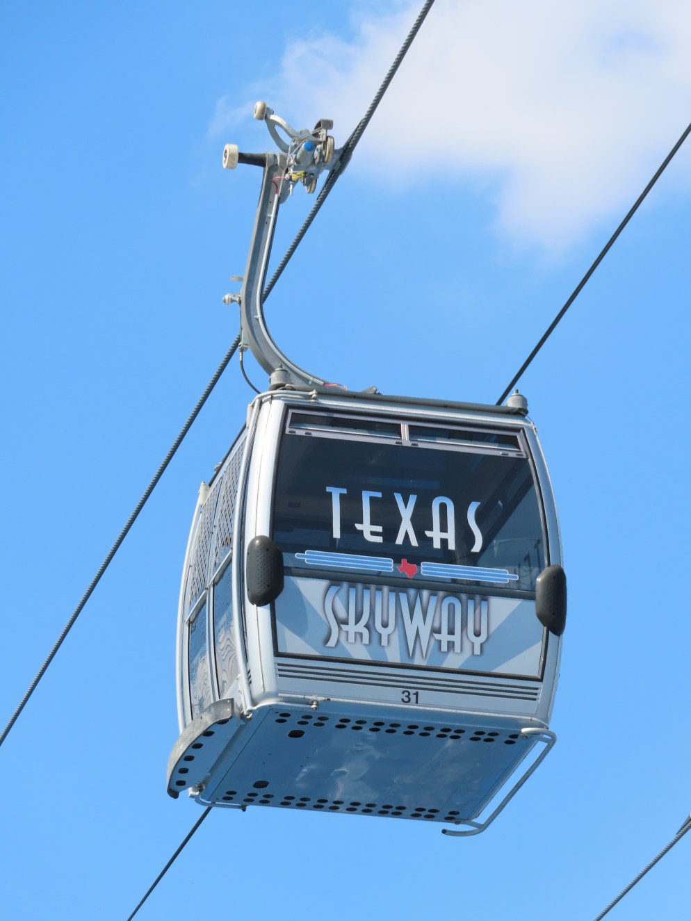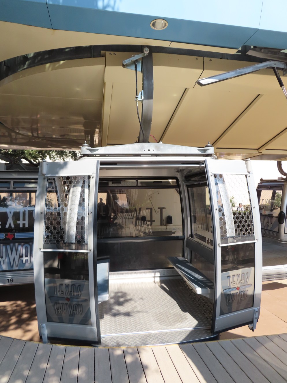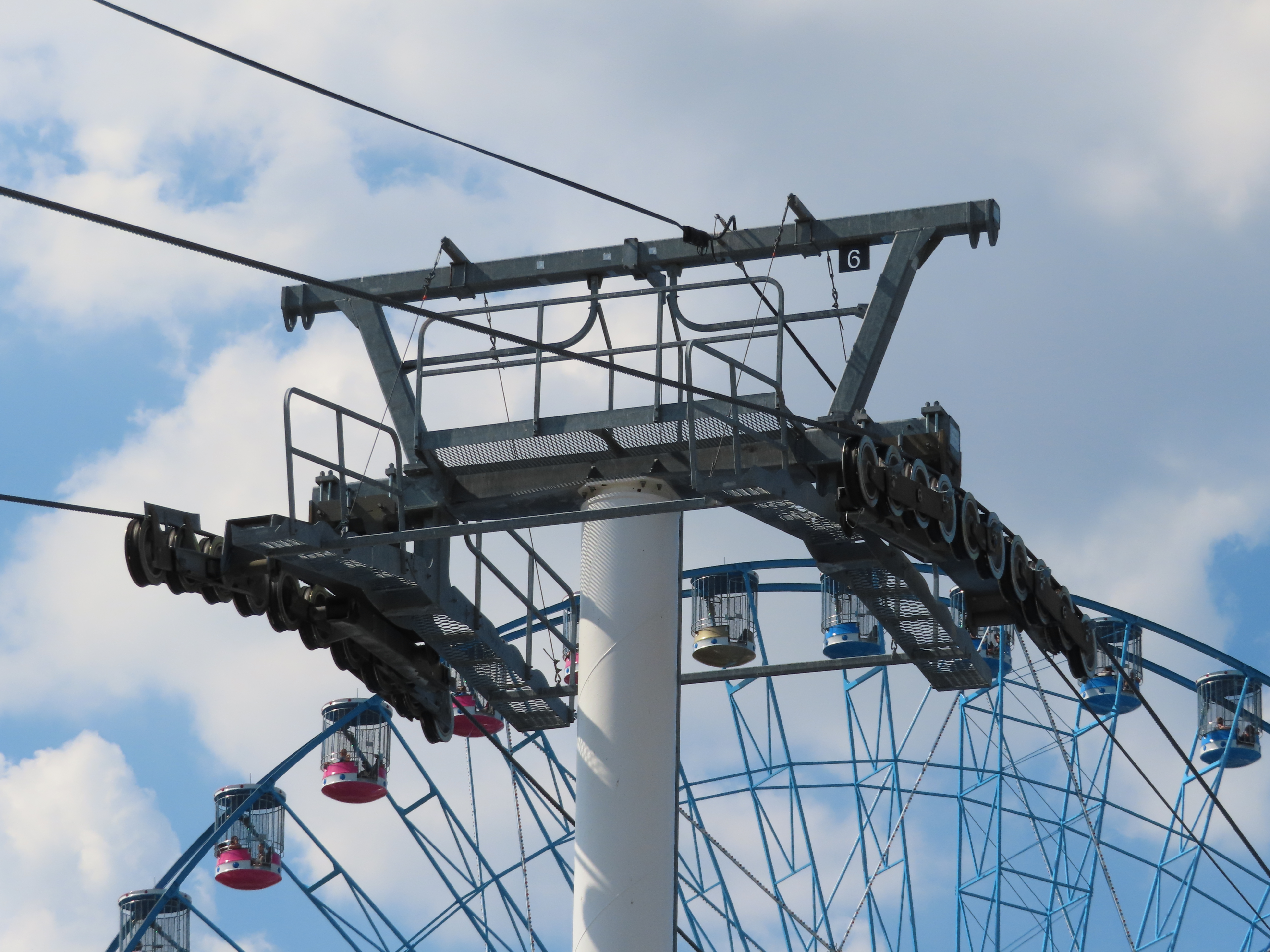 This Doppelmayr CTEC Uni-GS detachable opened in 2007.The drive terminal was built at elevation with a fair entrance later added below.Tower 6.The drive station seen from below.CWA Ethos 8 cabin with a DT-108 grip. Look closely and you’ll see a charging contact for night lighting.Tall towers on the midway.Tower 1.Another view of the first tower.The return terminal at ground level.Side view of a Uni-GS station.Depression assembly.The western station.View east.Riding along the line.Passing tower 6.Loading and unloading is allowed at both stations.A cabin arrives at the Pennsylvania Avenue station.Tower head.Interestingly, the towers are numbered from the return station rather than the drive.T6.Towers 7 and 8.The lift is called the Texas Skyway.Turnaround loading area.Curiously, the cabins were manufactured five years before the lift went in.Tower 5.T4.Tower 3.Middle part of the lift line.Arriving at the return terminal.Some of the cabins have two outer benches while others have benched in the middle facing out.Cabins are Texas-sized.Support sheave assemblies.Drive station overview.There is full cabin parking at the eastern terminal.
