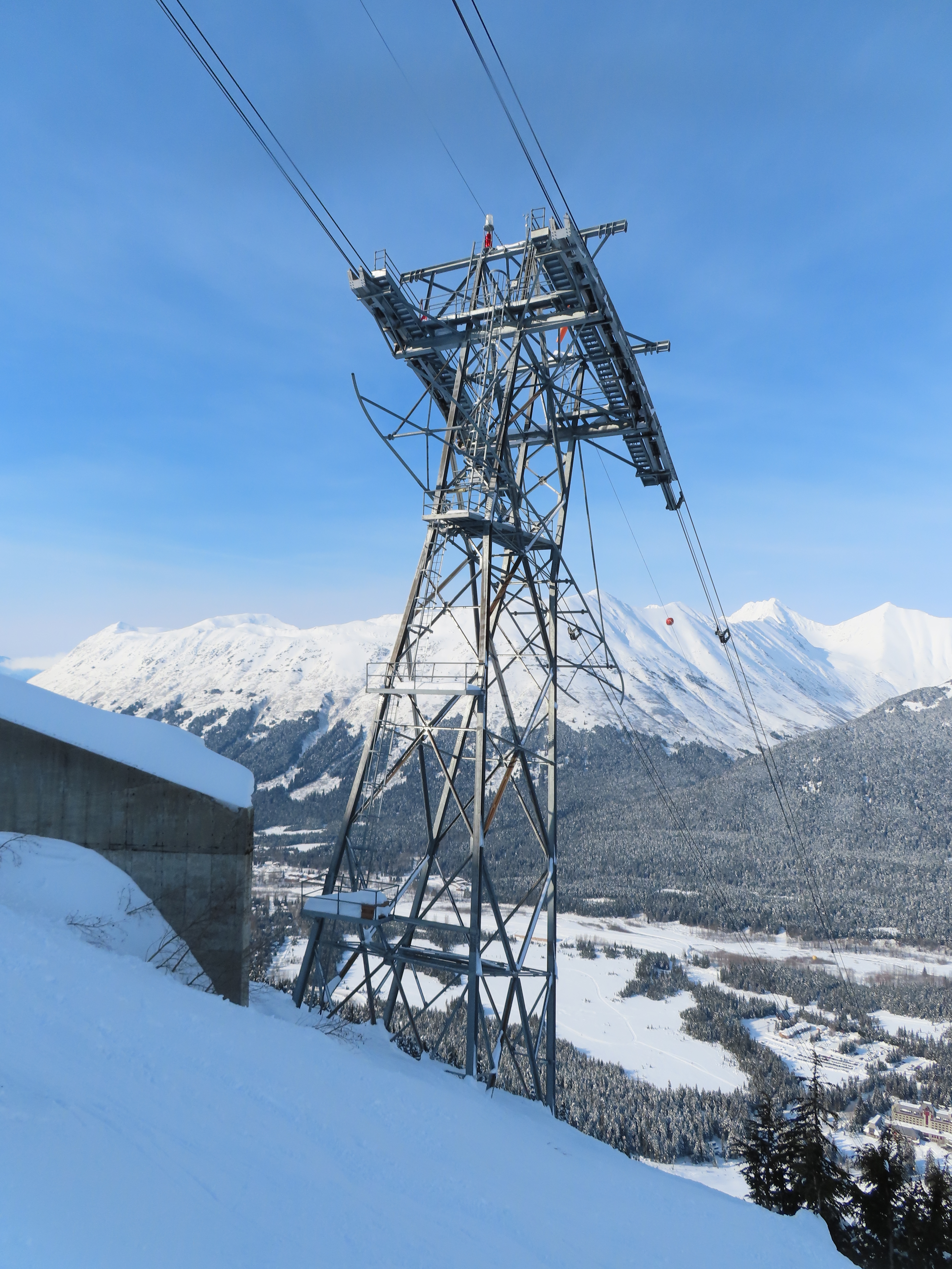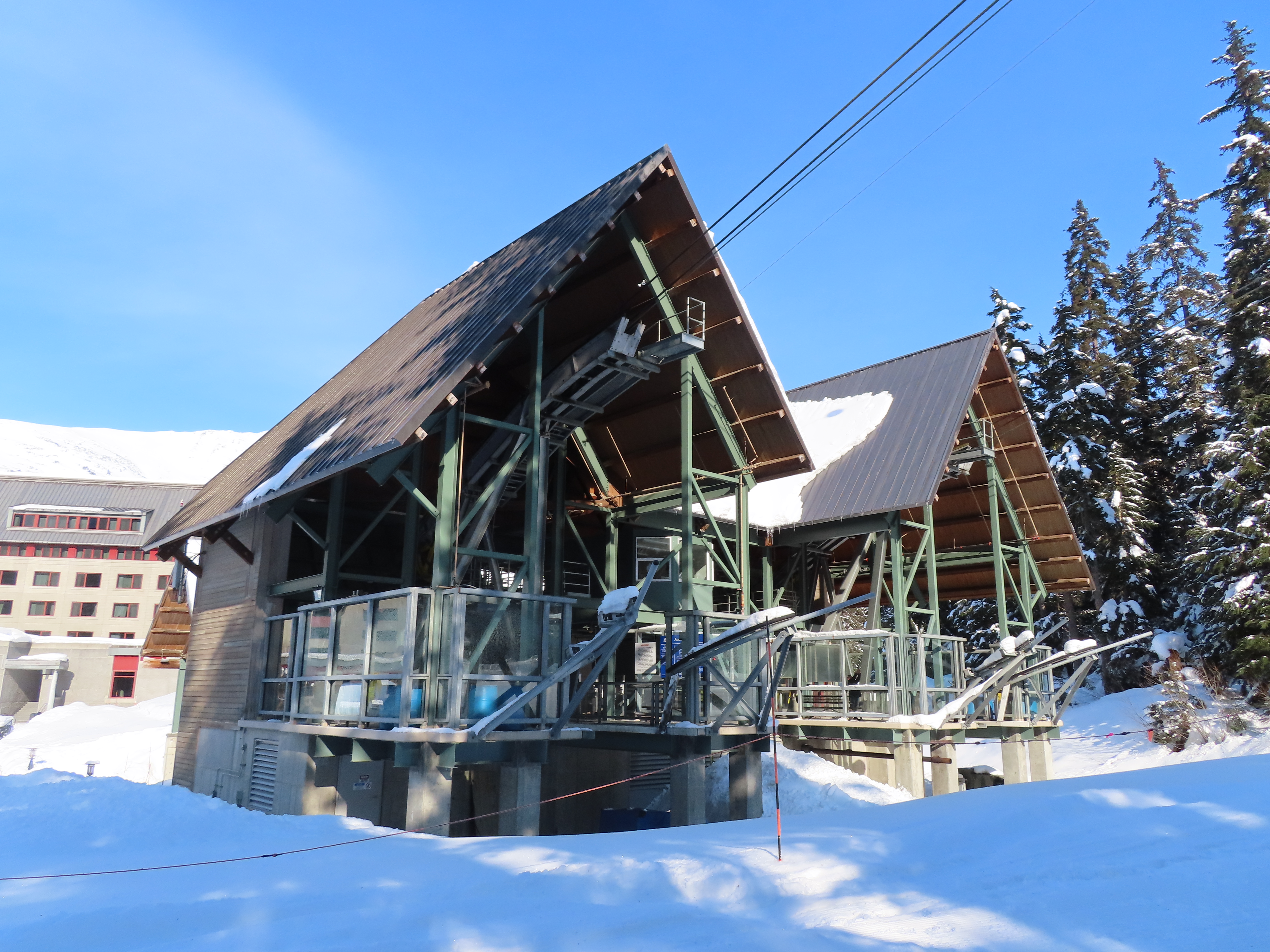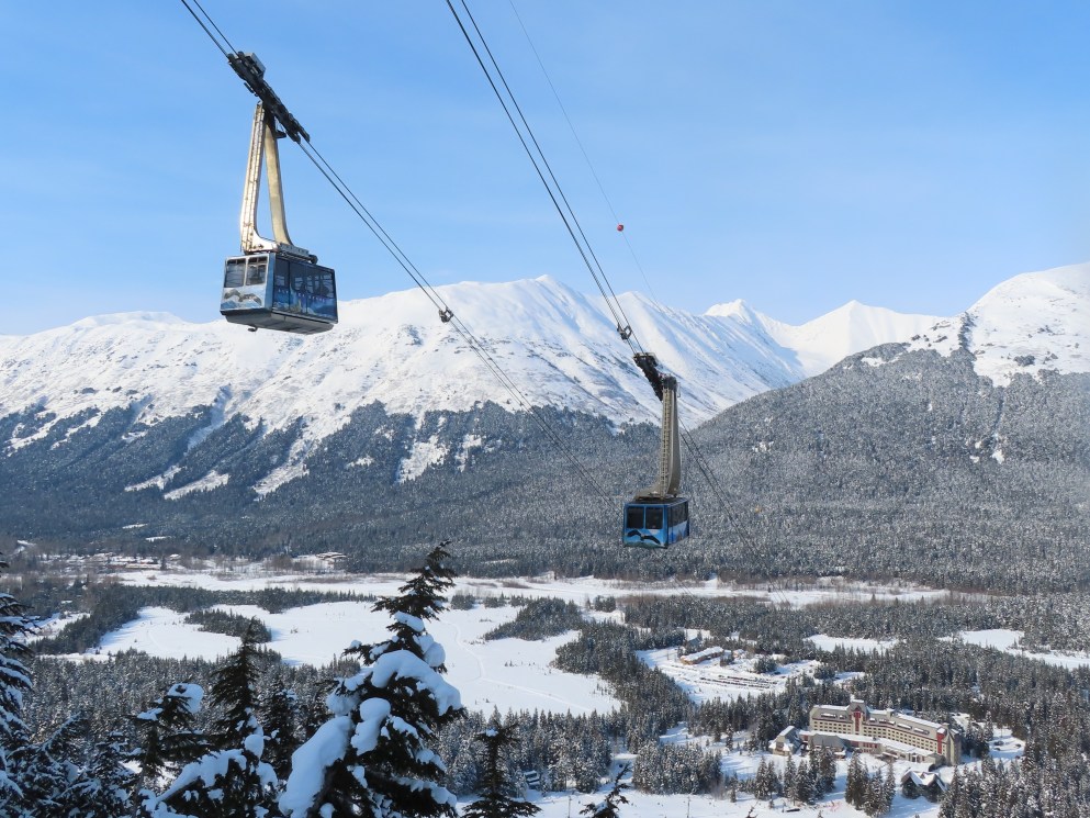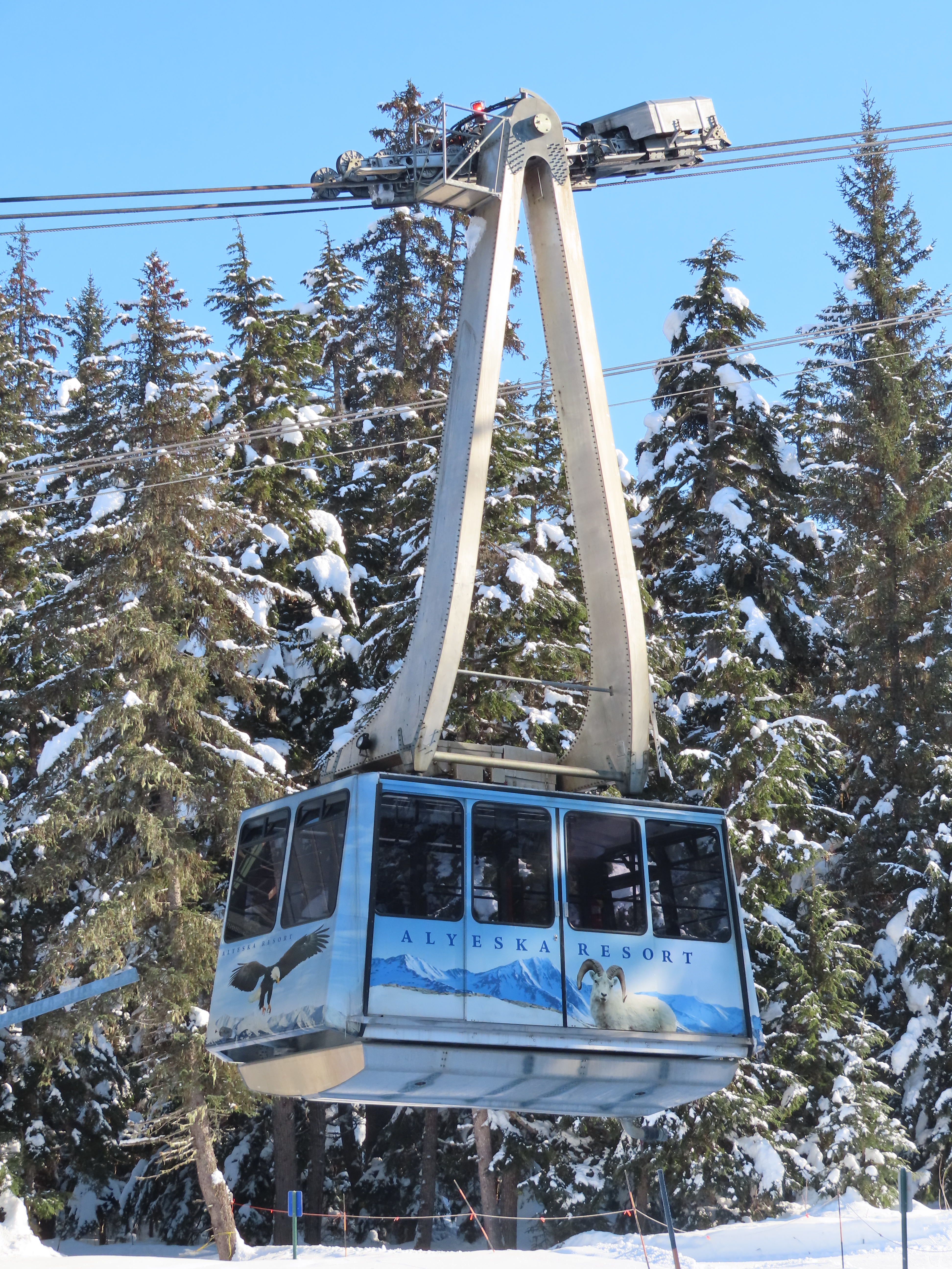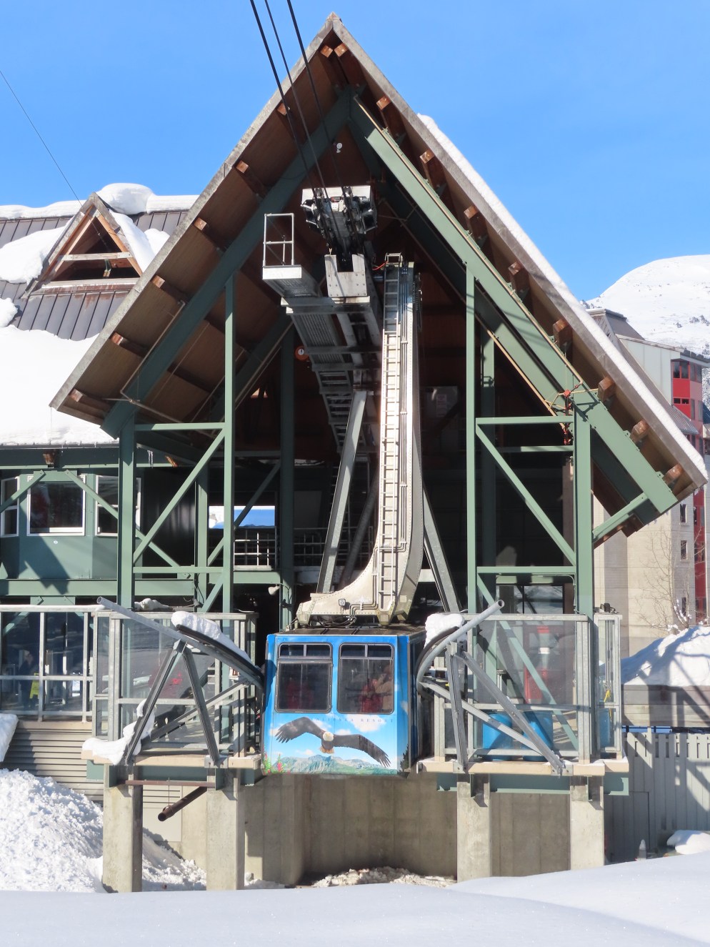 This aerial tramway opened as part of a major northern expansion of Alyeska Resort in 1992.The top terminal complex includes multiple restaurants and shops.Track rope bollard.A cabin in the top dock.View down from the top terminal.There are many bullwheels in the top terminal.Avalanches are a huge consideration here and so the only tower has a huge protective wall.Top dock with restaurant above.A cabin with vinyl graphics.View up the lift line.The line gauge on this lift is very wide.Each bottom dock has its own roof structure.CWA cabin.The lift was built by VonRoll tramways.Upper part of the lift line.Lower station building.Side view of the bottom station building.This building also houses drive equipment.Tram car with water tank.Looking up at the top terminal.A cabin with a view.The only tower.Another view of the tower.Cabin swinging over the tower.The tram opened alongside a Poma quad and huge hotel development.Cabins passing at the halfway point.The hangers on these cabins are very tall due to the steep profile of the lift.The bottom part of the line is very high off the ground.This lift ascends the north face of the resort.Another view of the tower.Floating haul rope counterweight.Lift overview.The tower and top building.Operator controls.Line speed is 2,000 feet per minute and the ride is very quick.