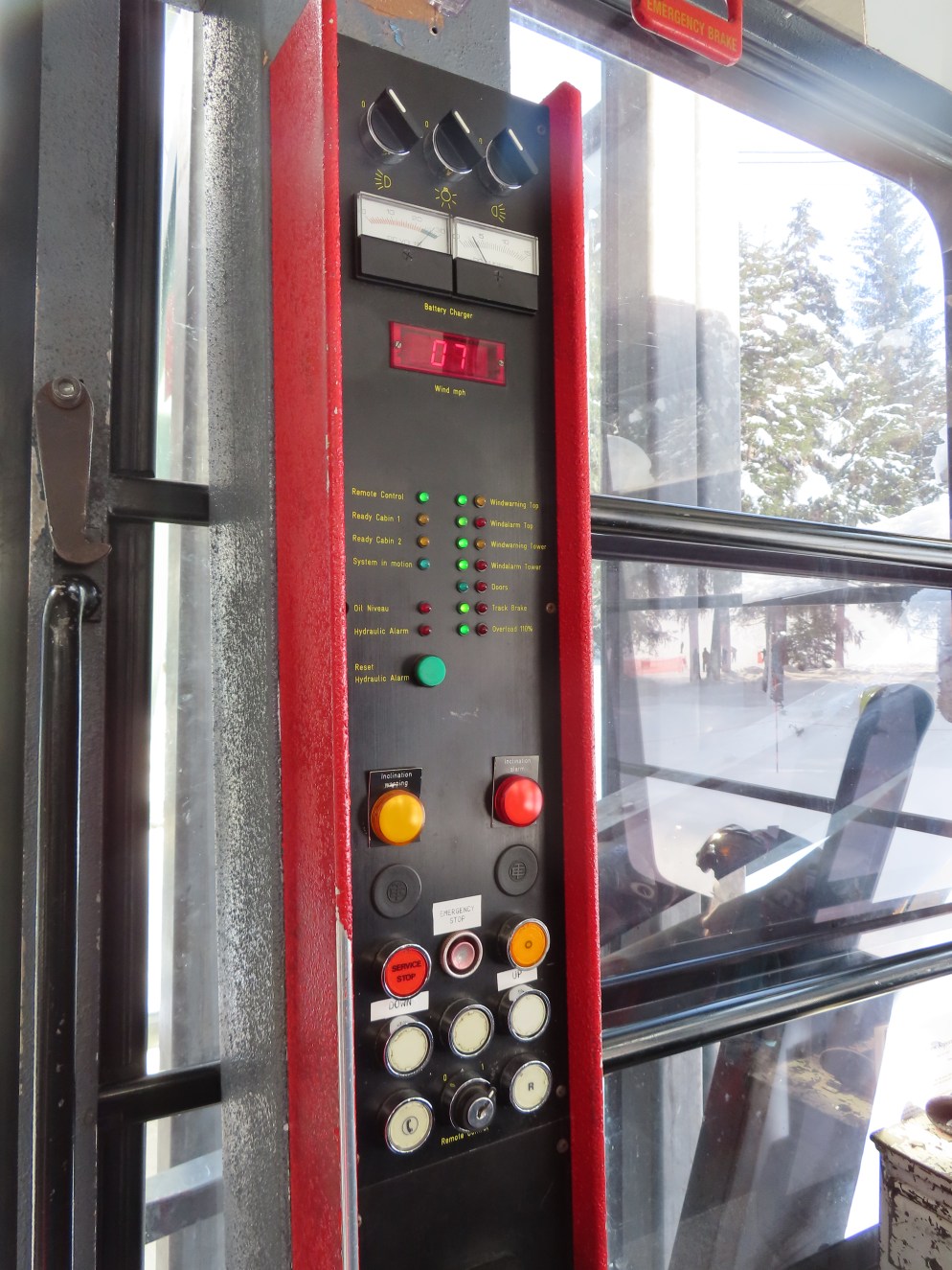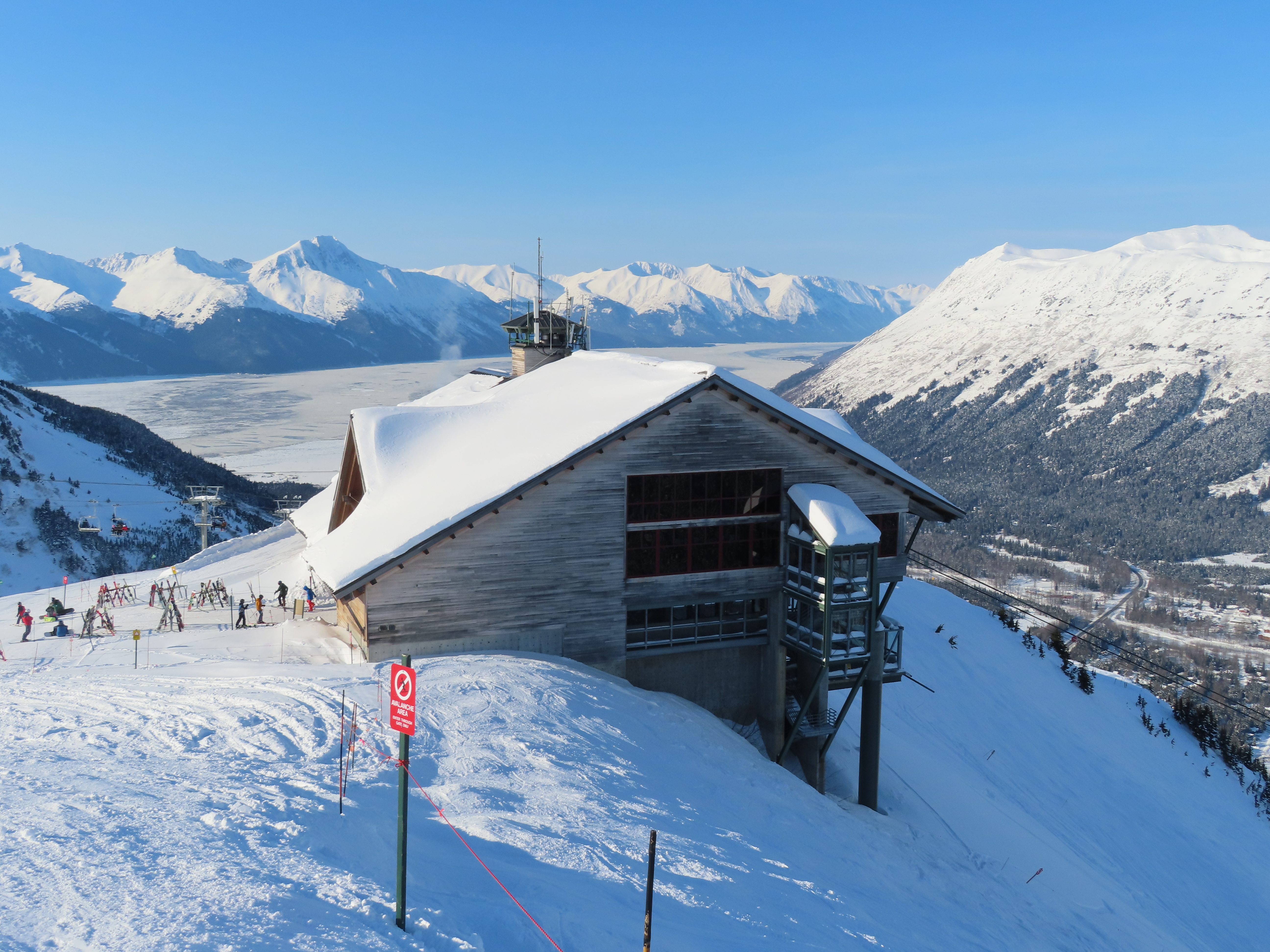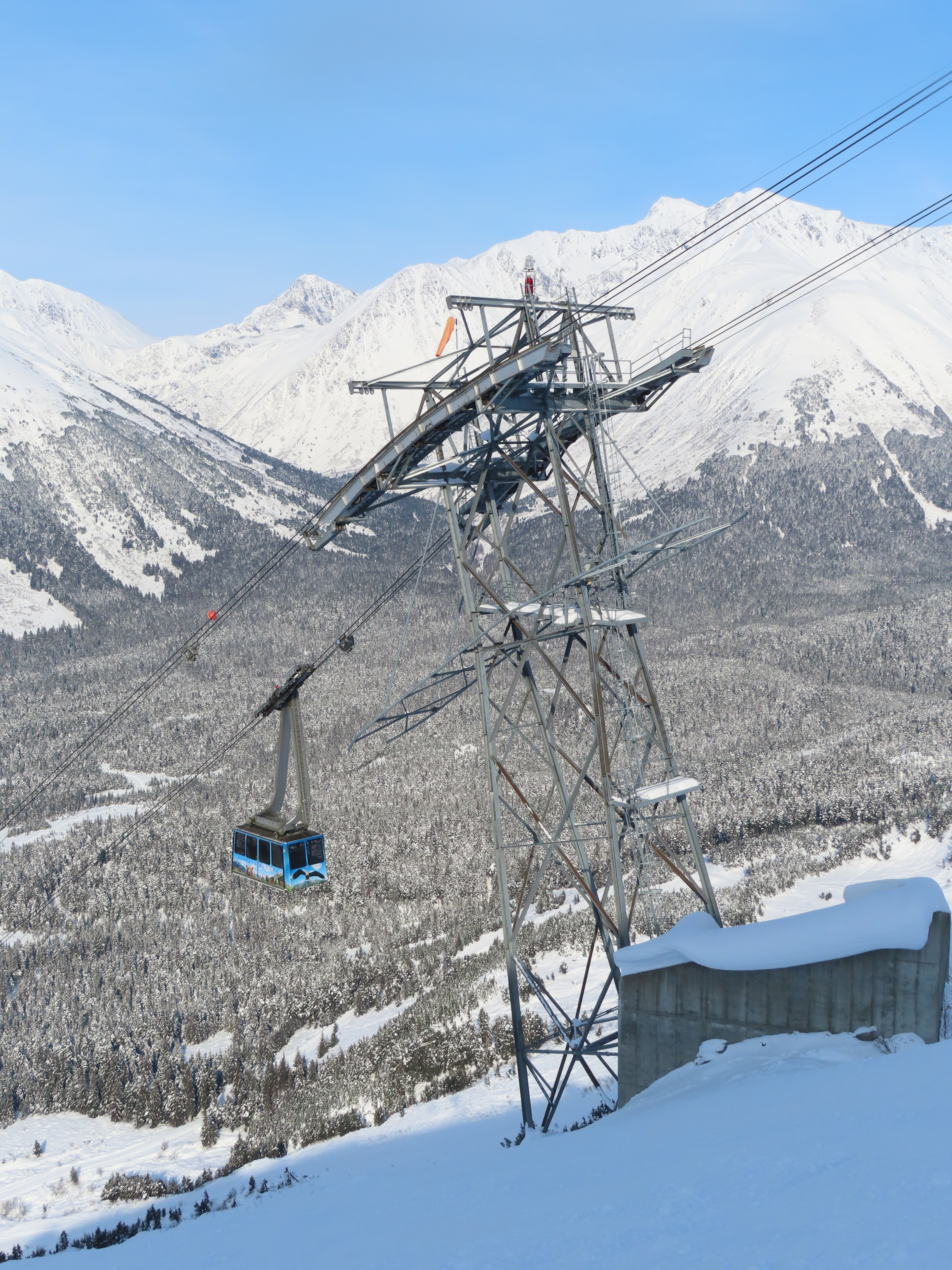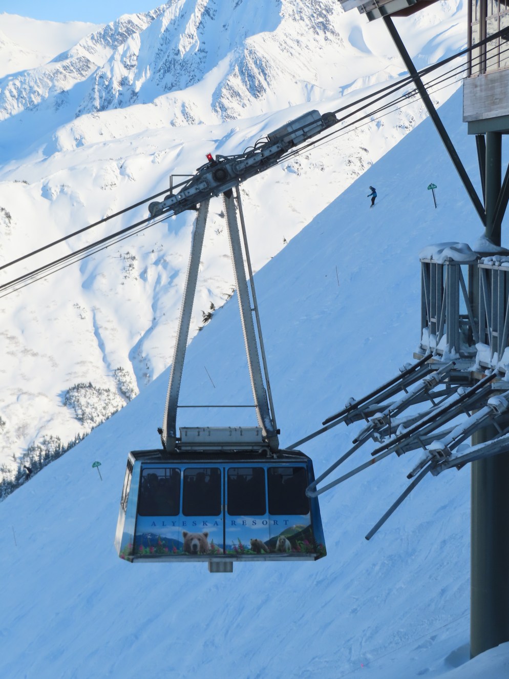 This aerial tramway opened as part of a major northern expansion of Alyeska Resort in 1992.The top terminal complex includes multiple restaurants and shops.Track rope bollard.A cabin in the top dock.View down from the top terminal.There are many bullwheels in the top terminal.Avalanches are a huge consideration here and so the only tower has a huge protective wall.Top dock with restaurant above.A cabin with vinyl graphics.View up the lift line.The line gauge on this lift is very wide.Each bottom dock has its own roof structure.CWA cabin.The lift was built by VonRoll tramways.Upper part of the lift line.Lower station building.Side view of the bottom station building.This building also houses drive equipment.Tram car with water tank.Looking up at the top terminal.A cabin with a view.The only tower.Another view of the tower.Cabin swinging over the tower.The tram opened alongside a Poma quad and huge hotel development.Cabins passing at the halfway point.The hangers on these cabins are very tall due to the steep profile of the lift.The bottom part of the line is very high off the ground.This lift ascends the north face of the resort.Another view of the tower.Floating haul rope counterweight.Lift overview.The tower and top building.Operator controls.Line speed is 2,000 feet per minute and the ride is very quick.