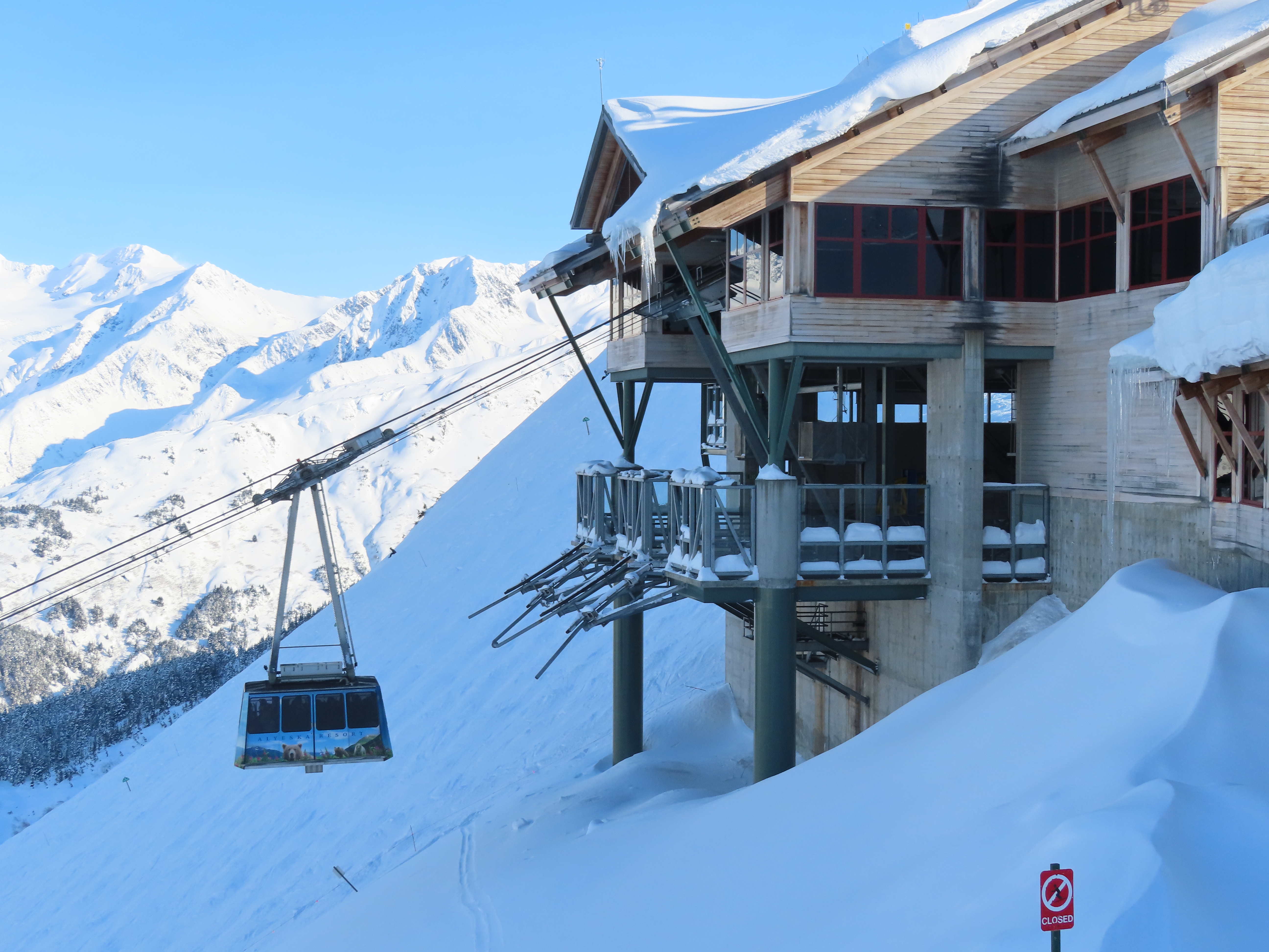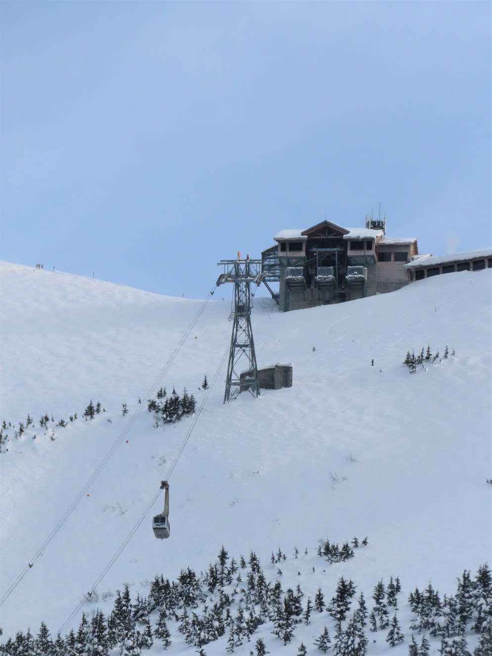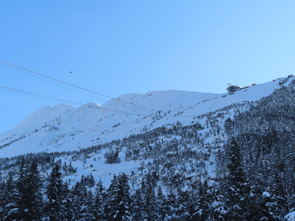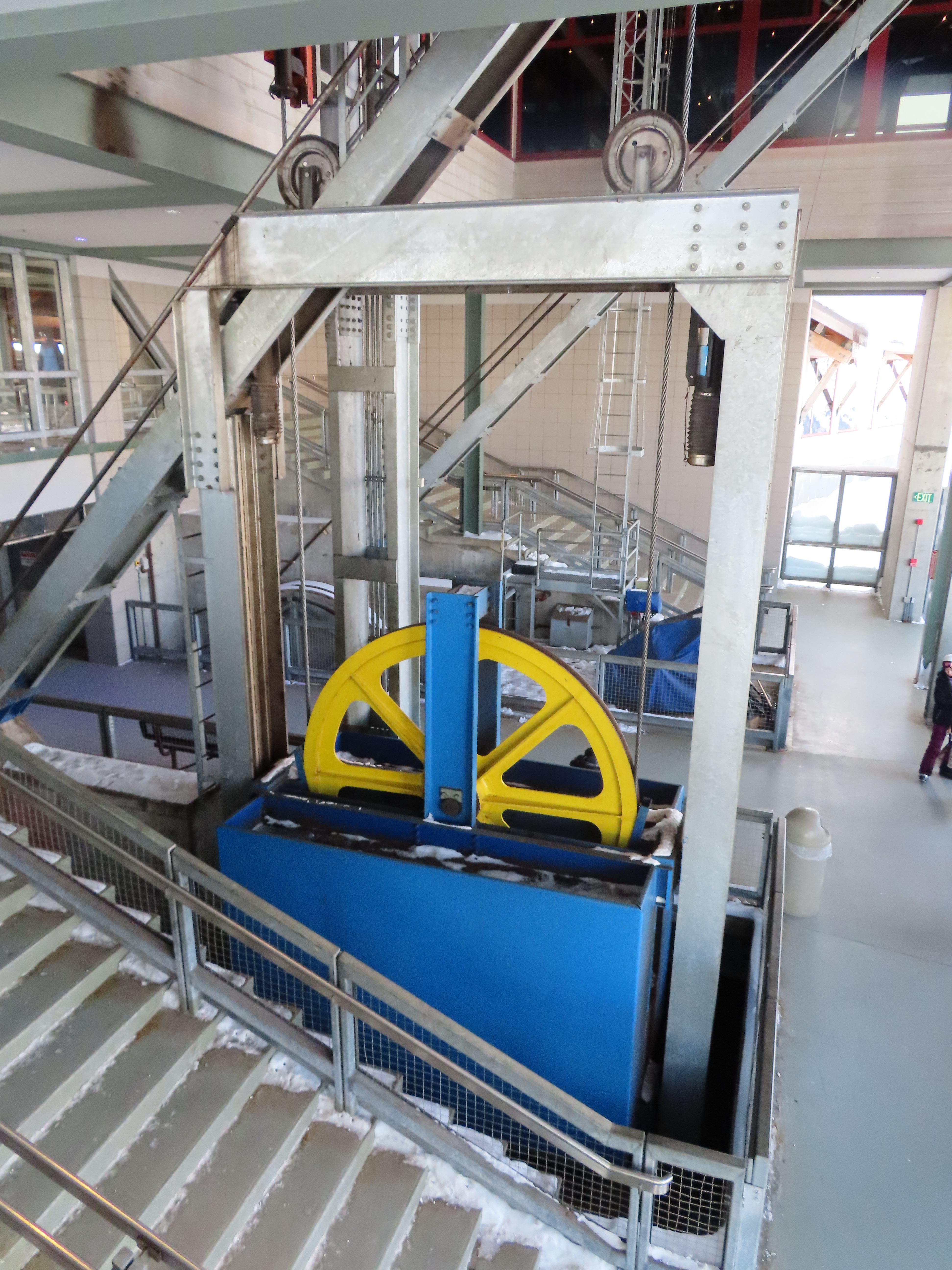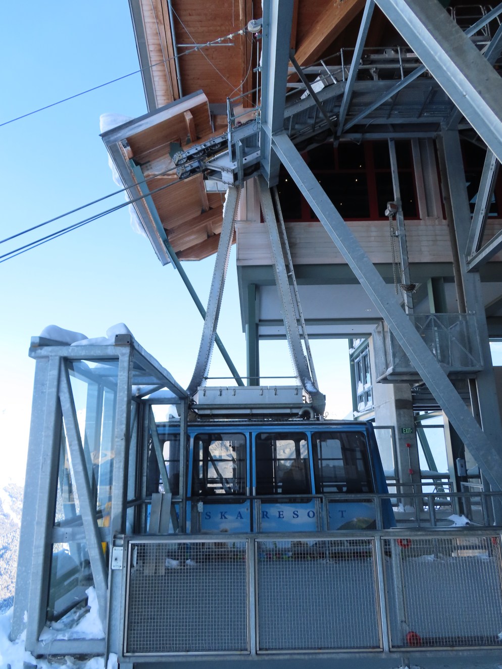 This aerial tramway opened as part of a major northern expansion of Alyeska Resort in 1992.The top terminal complex includes multiple restaurants and shops.Track rope bollard.A cabin in the top dock.View down from the top terminal.There are many bullwheels in the top terminal.Avalanches are a huge consideration here and so the only tower has a huge protective wall.Top dock with restaurant above.A cabin with vinyl graphics.View up the lift line.The line gauge on this lift is very wide.Each bottom dock has its own roof structure.CWA cabin.The lift was built by VonRoll tramways.Upper part of the lift line.Lower station building.Side view of the bottom station building.This building also houses drive equipment.Tram car with water tank.Looking up at the top terminal.A cabin with a view.The only tower.Another view of the tower.Cabin swinging over the tower.The tram opened alongside a Poma quad and huge hotel development.Cabins passing at the halfway point.The hangers on these cabins are very tall due to the steep profile of the lift.The bottom part of the line is very high off the ground.This lift ascends the north face of the resort.Another view of the tower.Floating haul rope counterweight.Lift overview.The tower and top building.Operator controls.Line speed is 2,000 feet per minute and the ride is very quick.