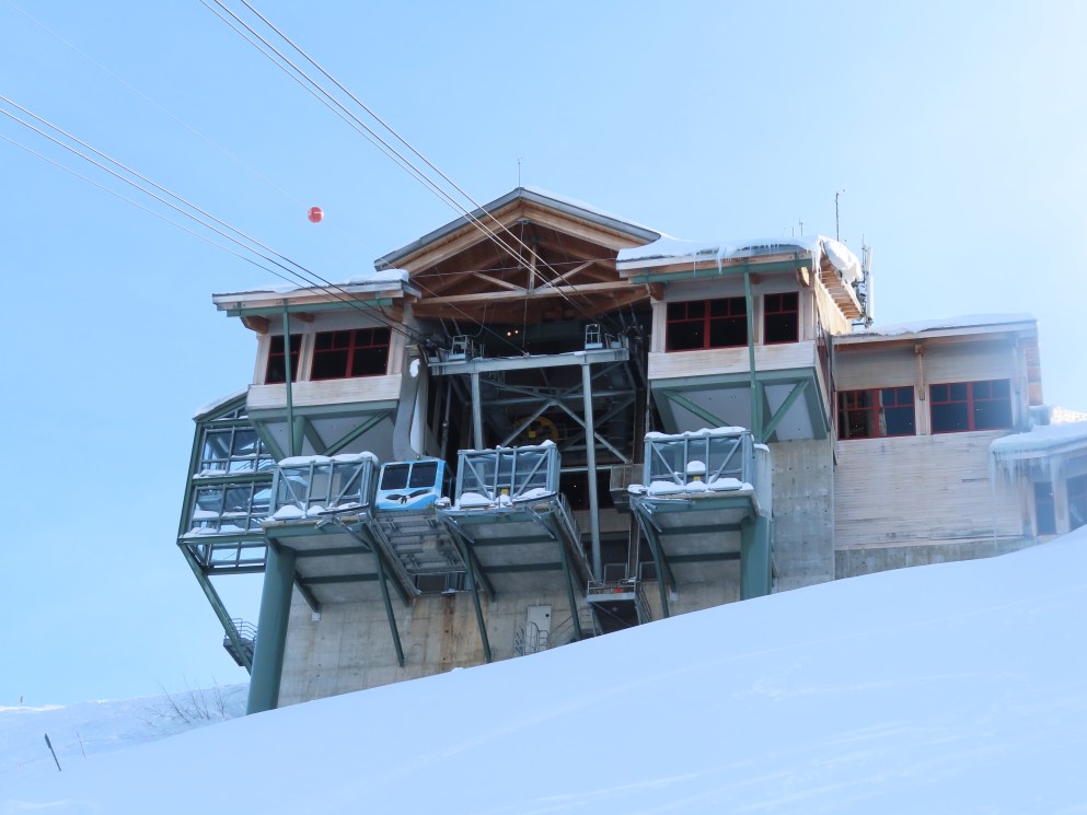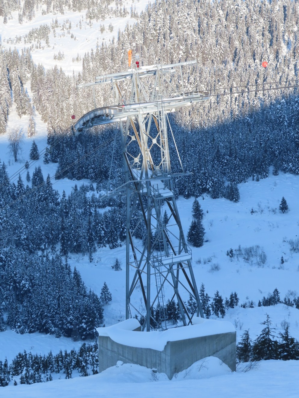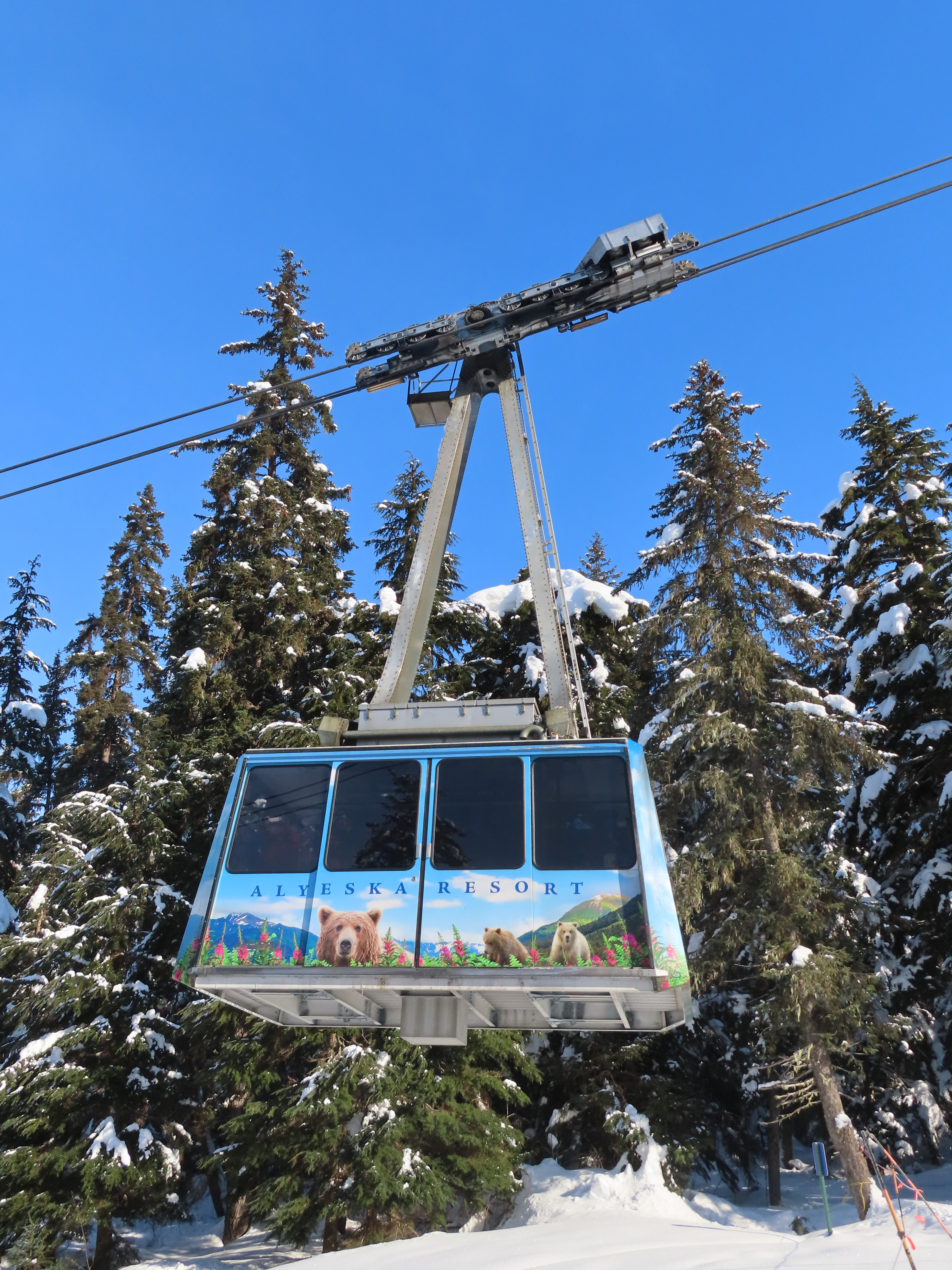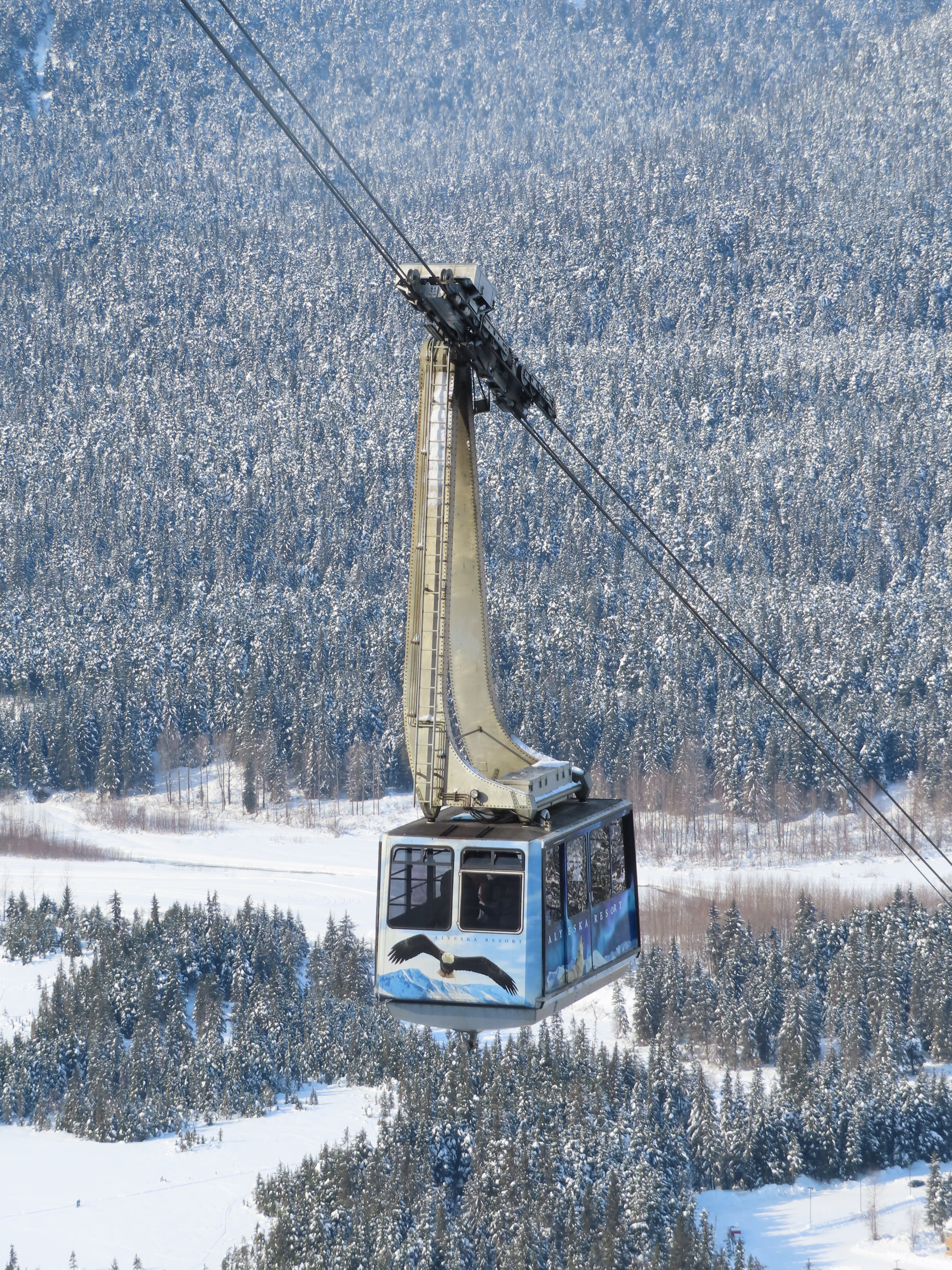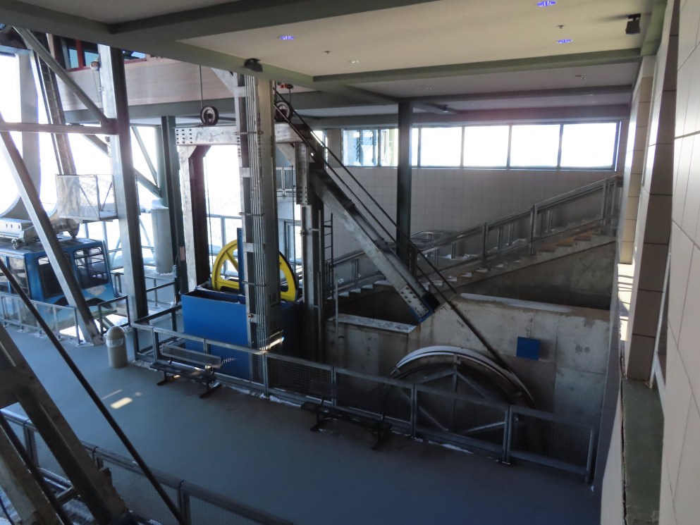 This aerial tramway opened as part of a major northern expansion of Alyeska Resort in 1992.The top terminal complex includes multiple restaurants and shops.Track rope bollard.A cabin in the top dock.View down from the top terminal.There are many bullwheels in the top terminal.Avalanches are a huge consideration here and so the only tower has a huge protective wall.Top dock with restaurant above.A cabin with vinyl graphics.View up the lift line.The line gauge on this lift is very wide.Each bottom dock has its own roof structure.CWA cabin.The lift was built by VonRoll tramways.Upper part of the lift line.Lower station building.Side view of the bottom station building.This building also houses drive equipment.Tram car with water tank.Looking up at the top terminal.A cabin with a view.The only tower.Another view of the tower.Cabin swinging over the tower.The tram opened alongside a Poma quad and huge hotel development.Cabins passing at the halfway point.The hangers on these cabins are very tall due to the steep profile of the lift.The bottom part of the line is very high off the ground.This lift ascends the north face of the resort.Another view of the tower.Floating haul rope counterweight.Lift overview.The tower and top building.Operator controls.Line speed is 2,000 feet per minute and the ride is very quick.