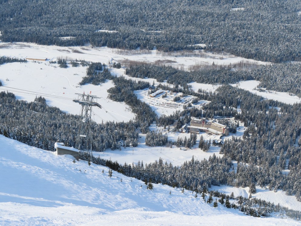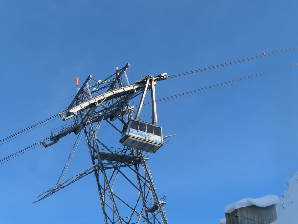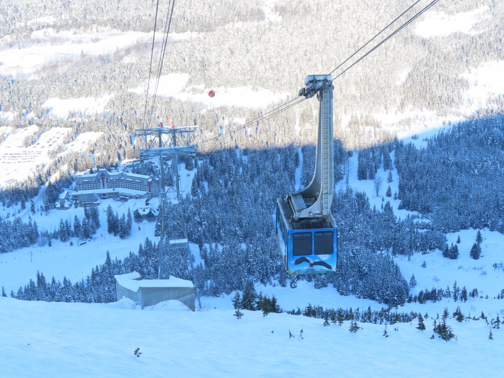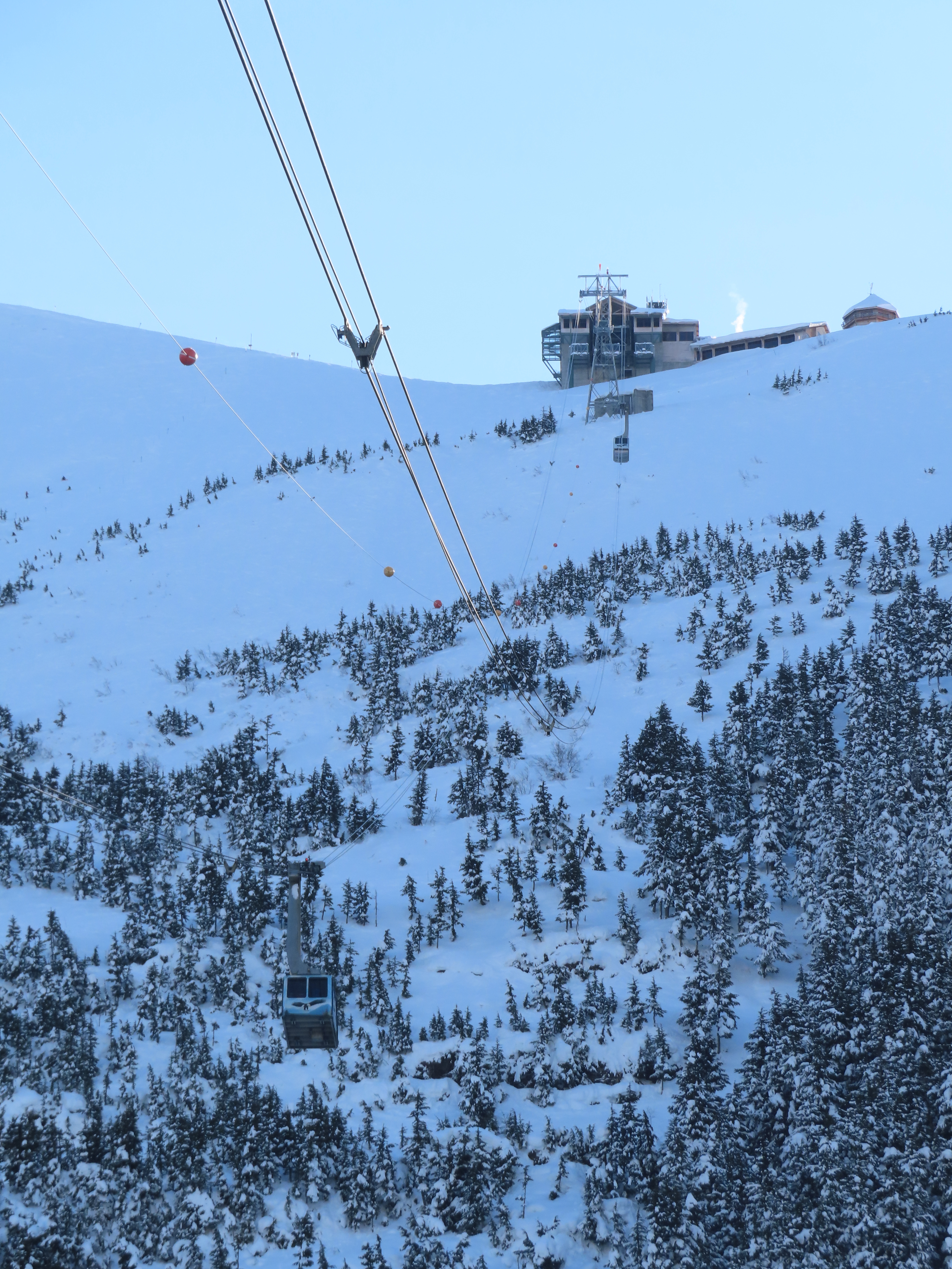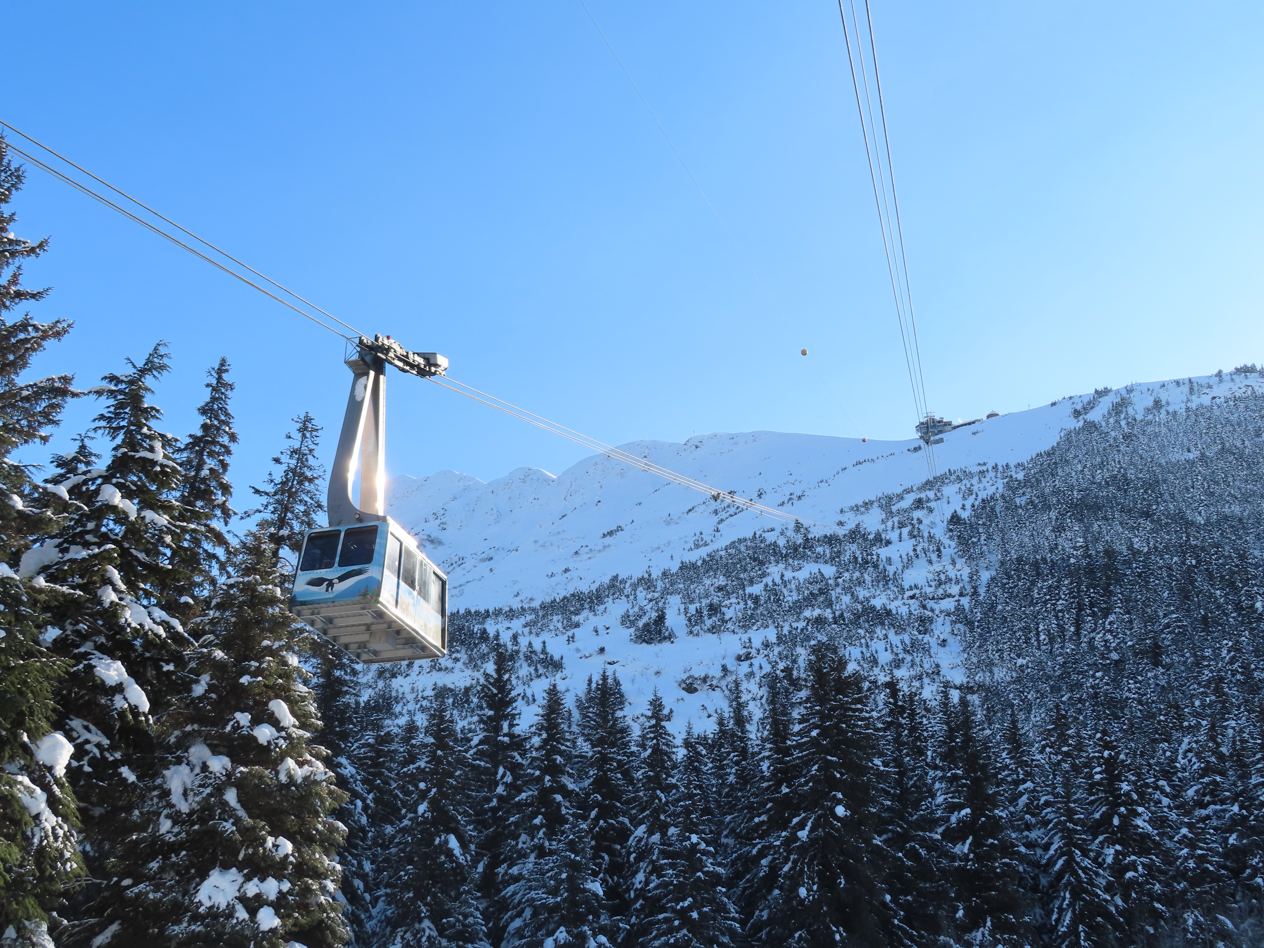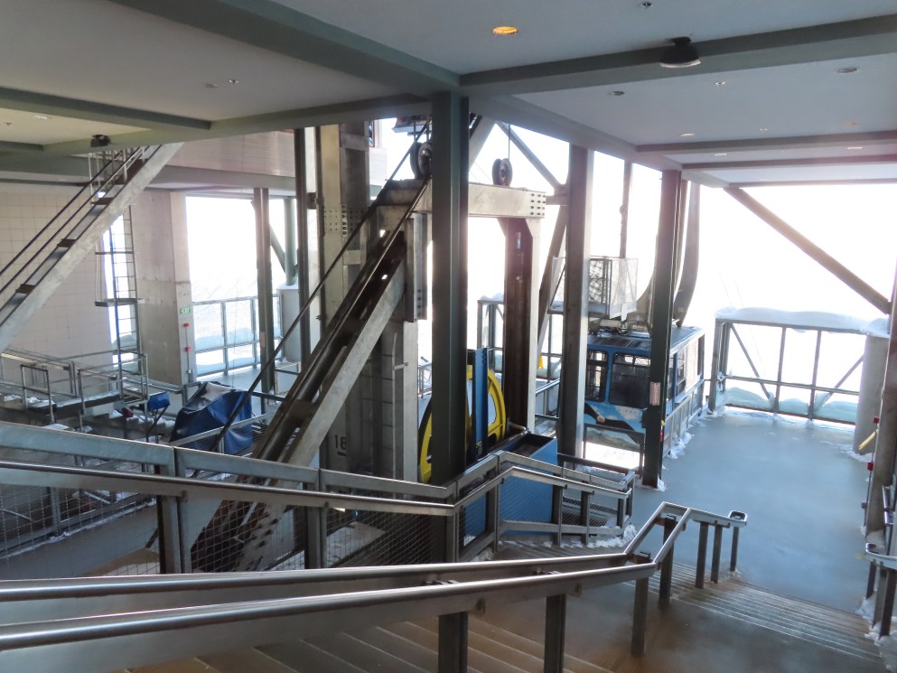 This aerial tramway opened as part of a major northern expansion of Alyeska Resort in 1992.The top terminal complex includes multiple restaurants and shops.Track rope bollard.A cabin in the top dock.View down from the top terminal.There are many bullwheels in the top terminal.Avalanches are a huge consideration here and so the only tower has a huge protective wall.Top dock with restaurant above.A cabin with vinyl graphics.View up the lift line.The line gauge on this lift is very wide.Each bottom dock has its own roof structure.CWA cabin.The lift was built by VonRoll tramways.Upper part of the lift line.Lower station building.Side view of the bottom station building.This building also houses drive equipment.Tram car with water tank.Looking up at the top terminal.A cabin with a view.The only tower.Another view of the tower.Cabin swinging over the tower.The tram opened alongside a Poma quad and huge hotel development.Cabins passing at the halfway point.The hangers on these cabins are very tall due to the steep profile of the lift.The bottom part of the line is very high off the ground.This lift ascends the north face of the resort.Another view of the tower.Floating haul rope counterweight.Lift overview.The tower and top building.Operator controls.Line speed is 2,000 feet per minute and the ride is very quick.
