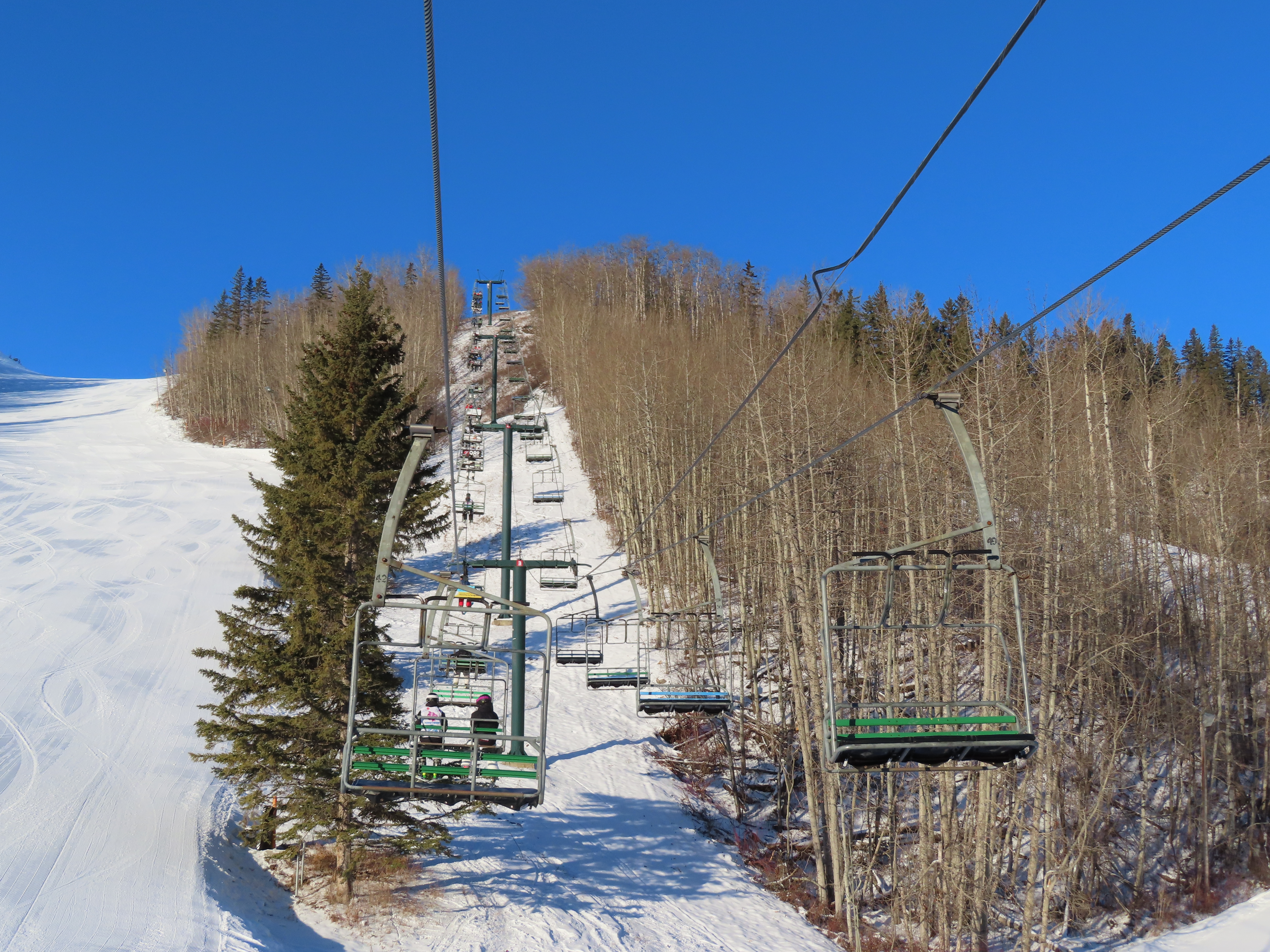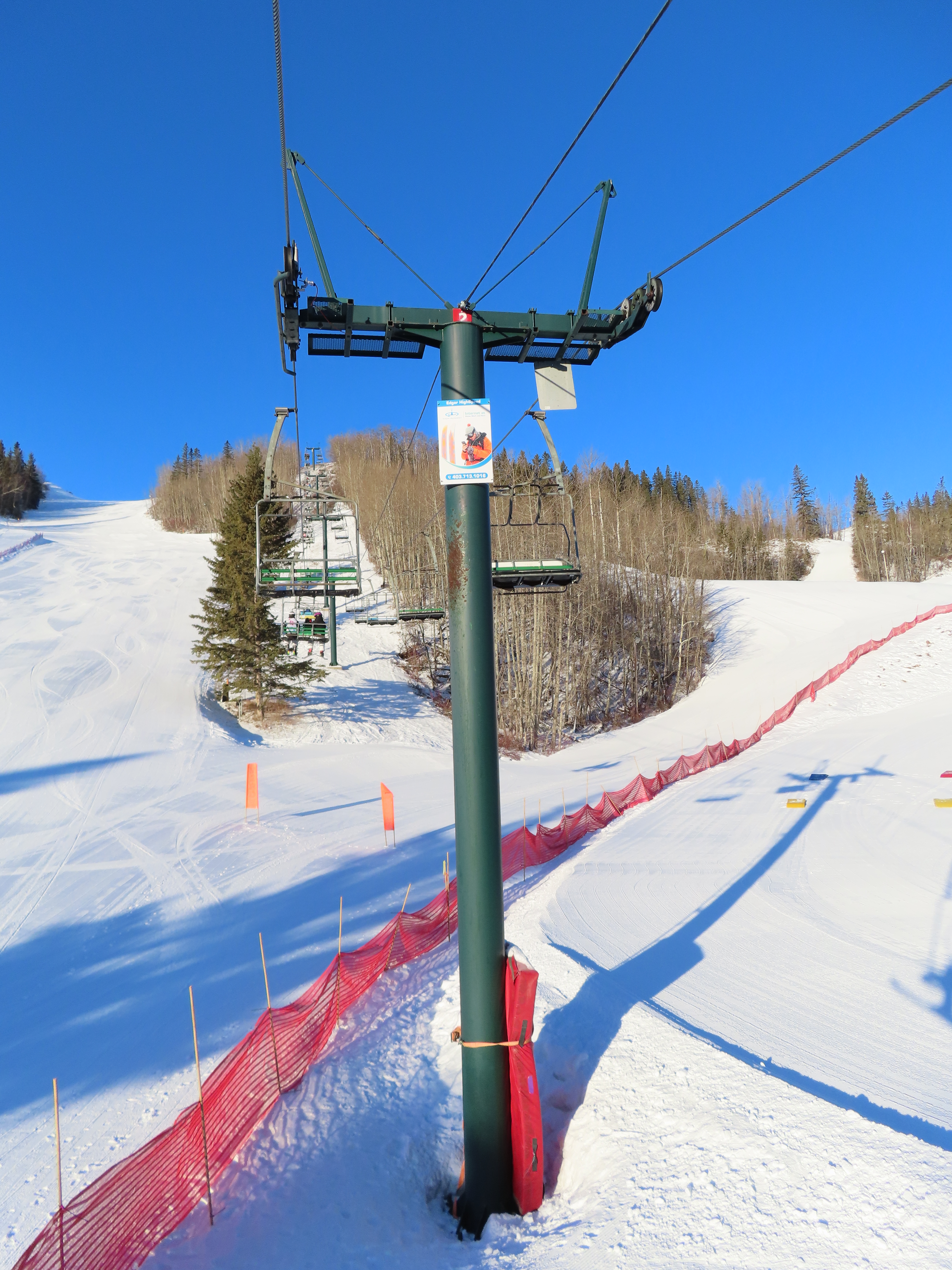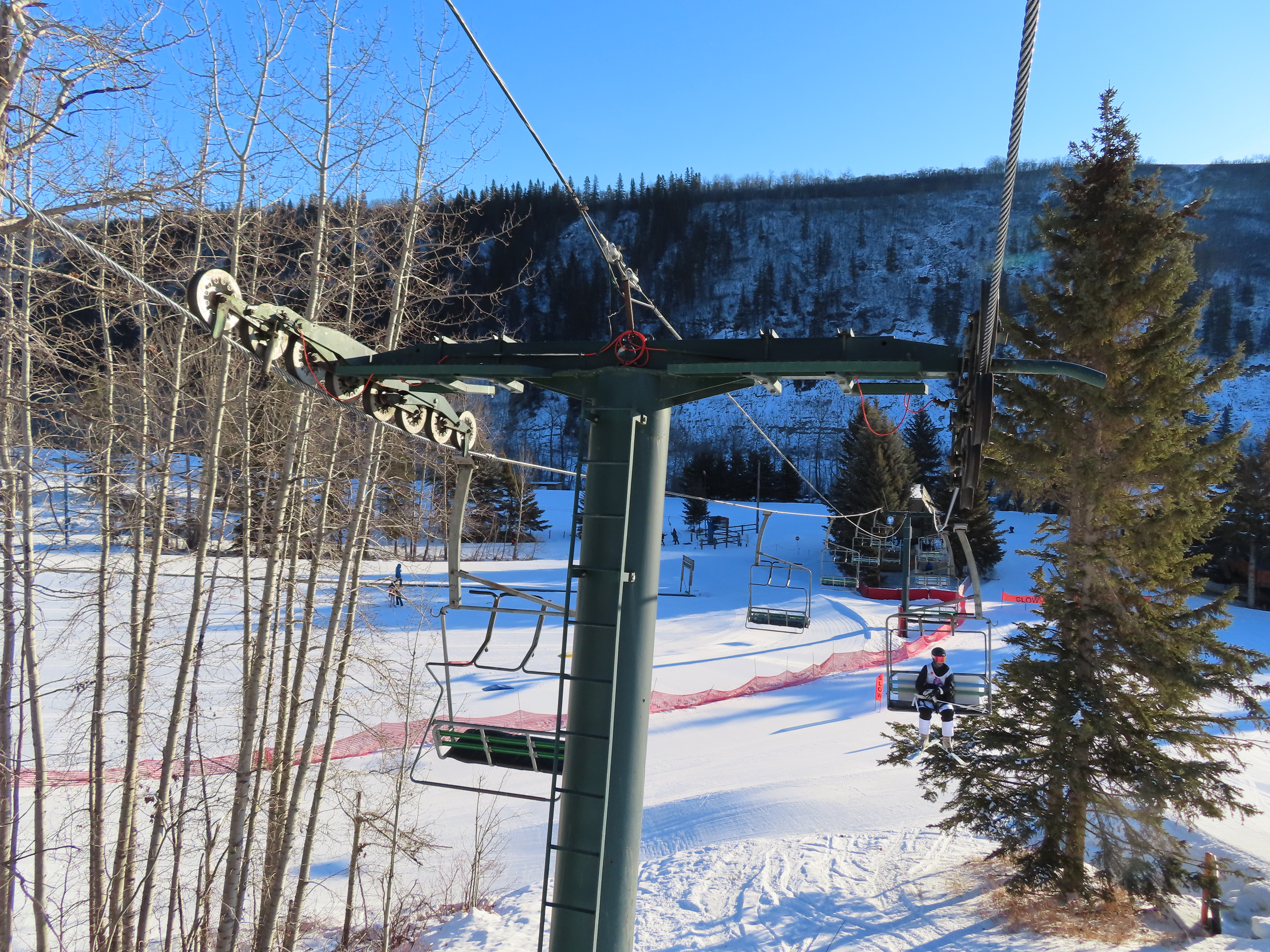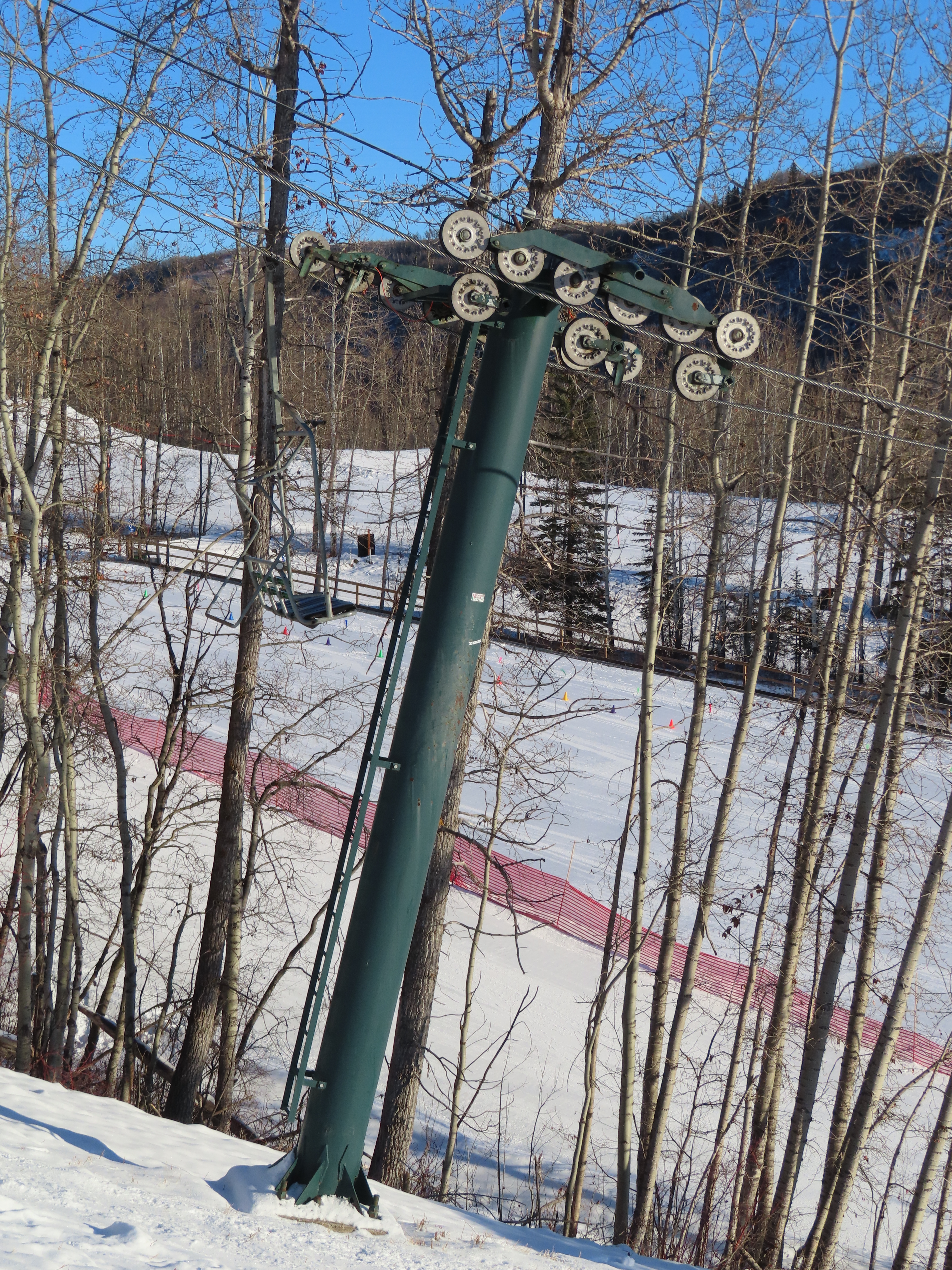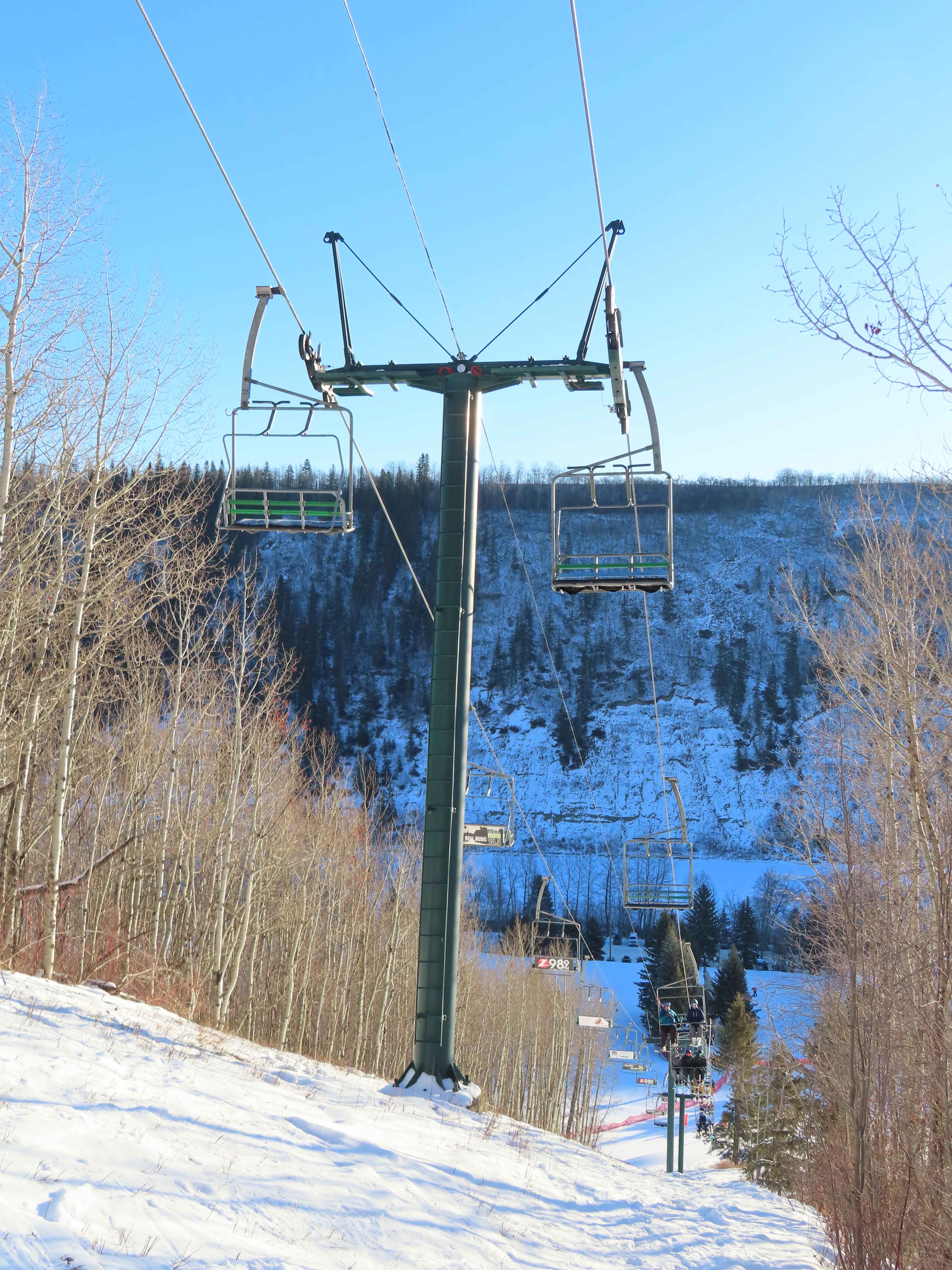 This is the main out-front-of-lodge lift at Canyon.Late model Mueller tower.Upper part of the lift line.View from the summit.Looking down the steep lift line.View up the line.Heavily forested bottom station.Steep lift line.Loading area.Tower 2.View riding up.Tower with hold down on the light side and combination on the heavy side.Tower 7.The top station.Unique combination assemby.Lift overview.
