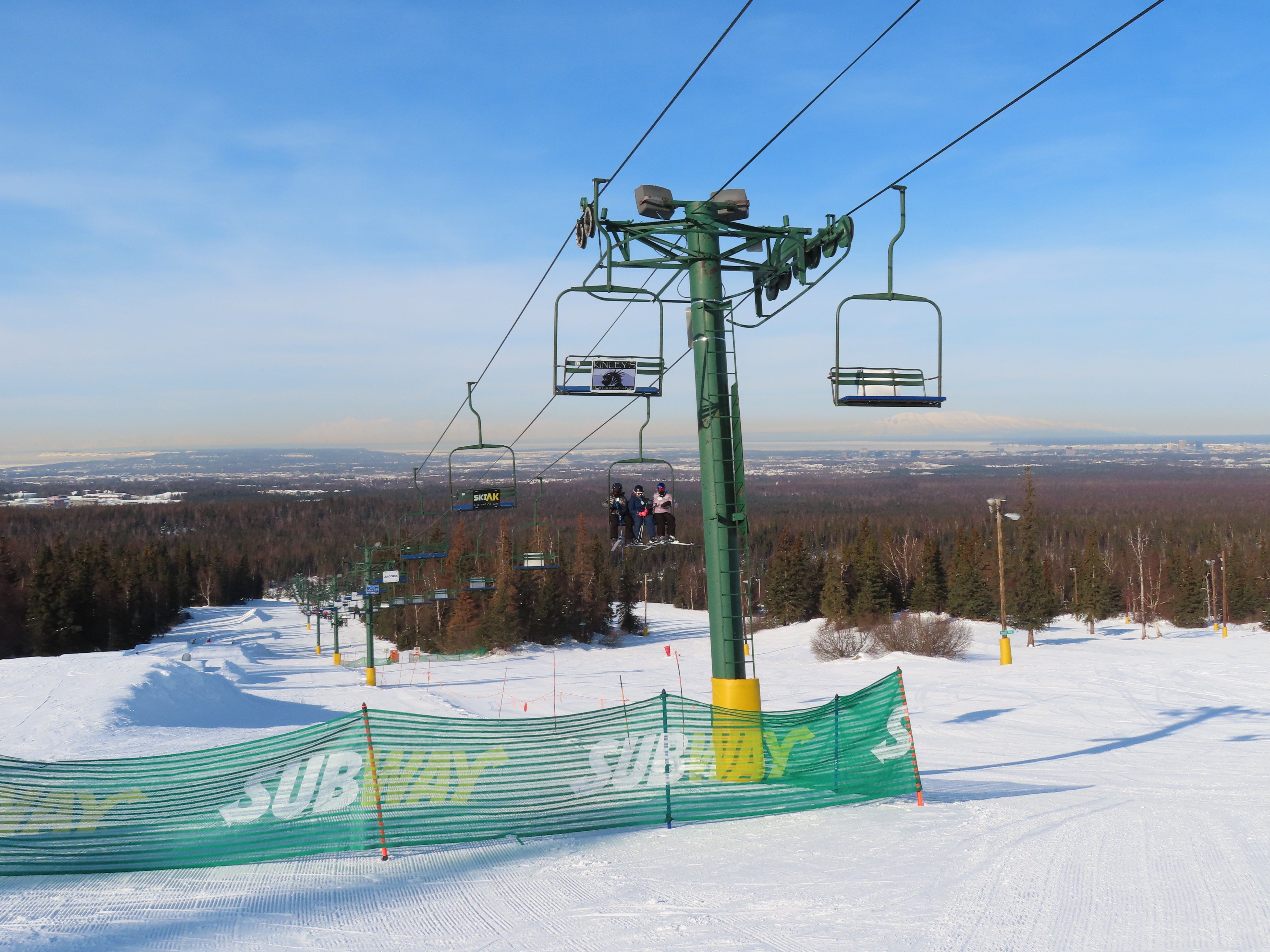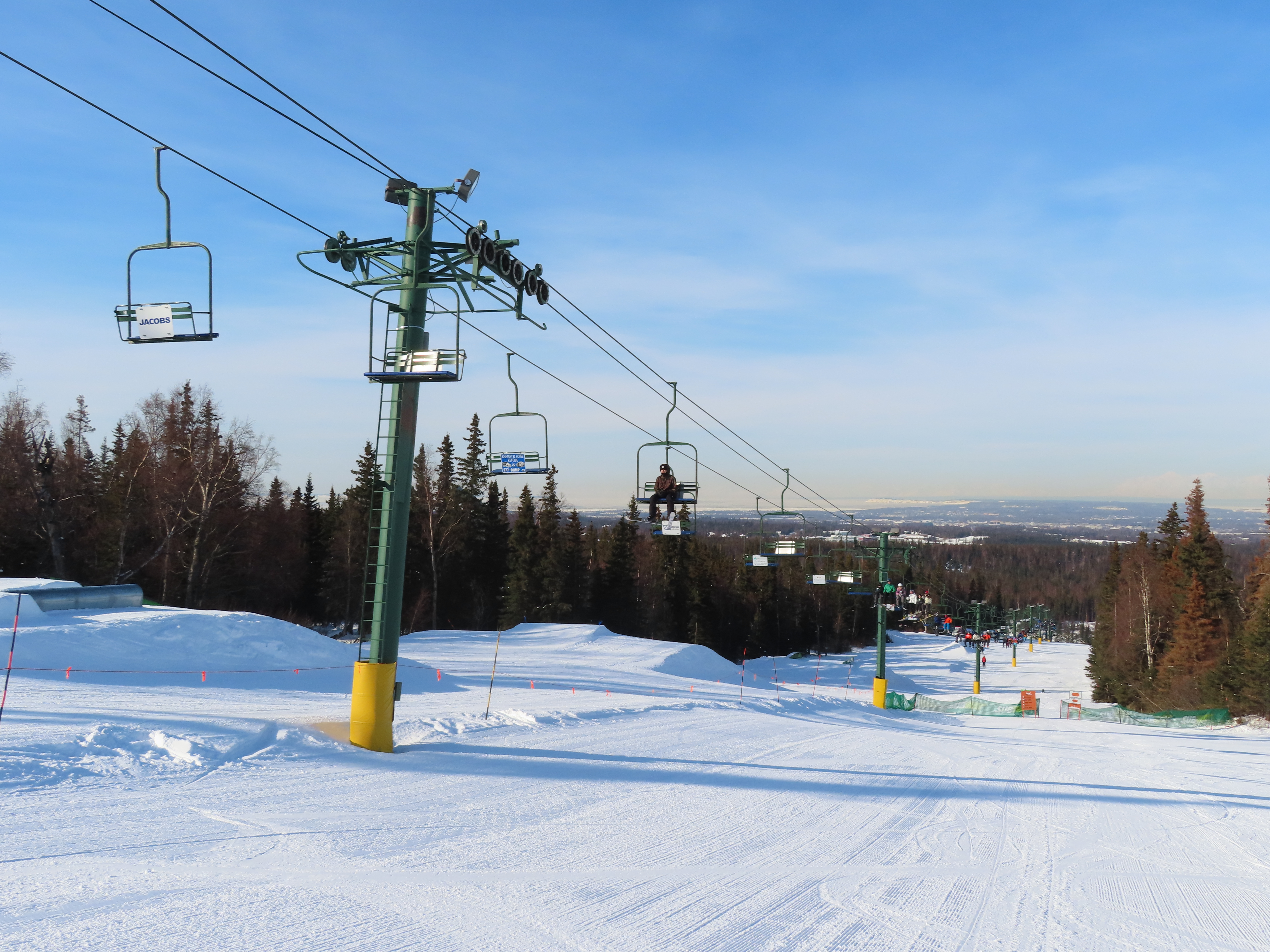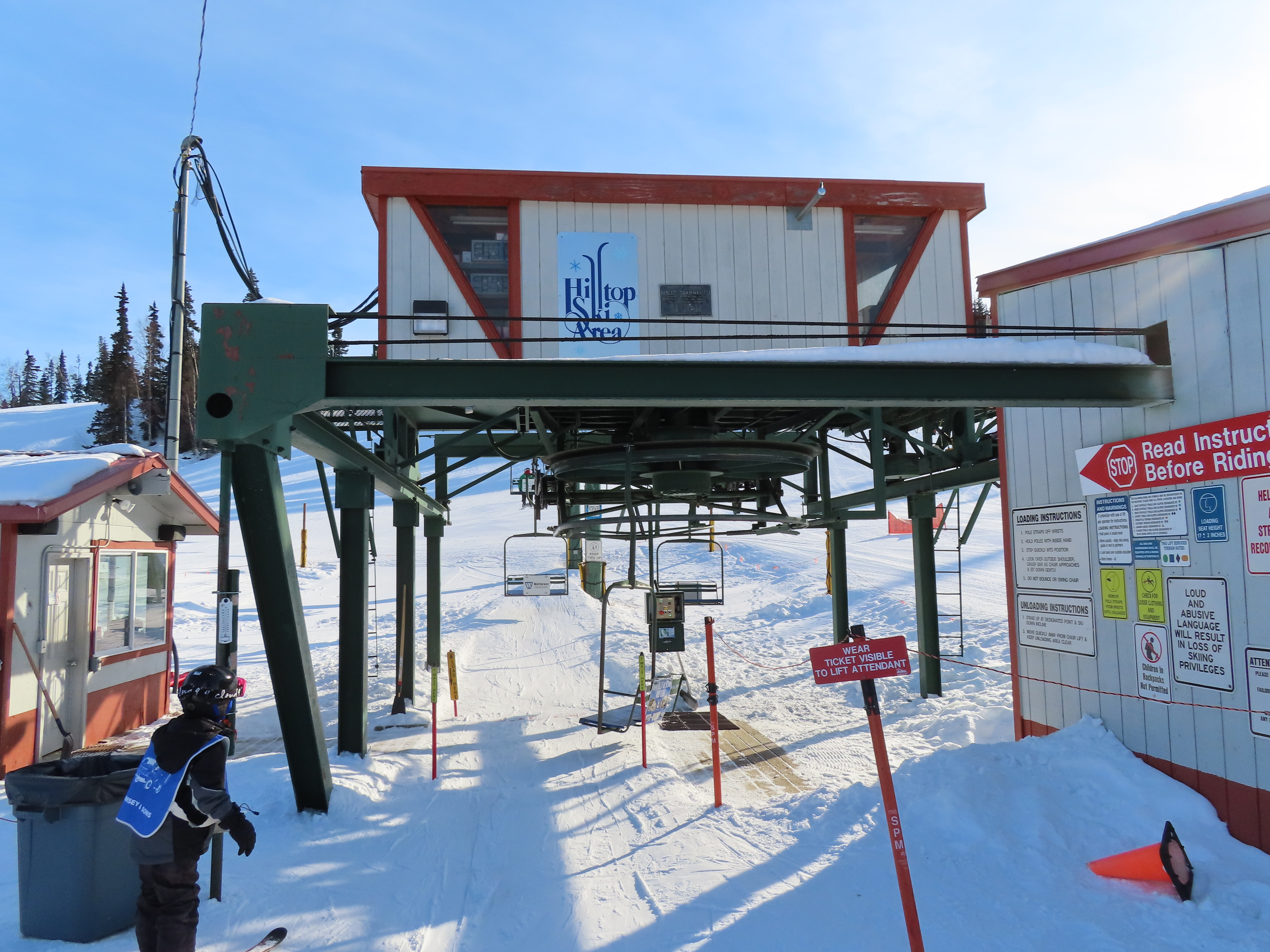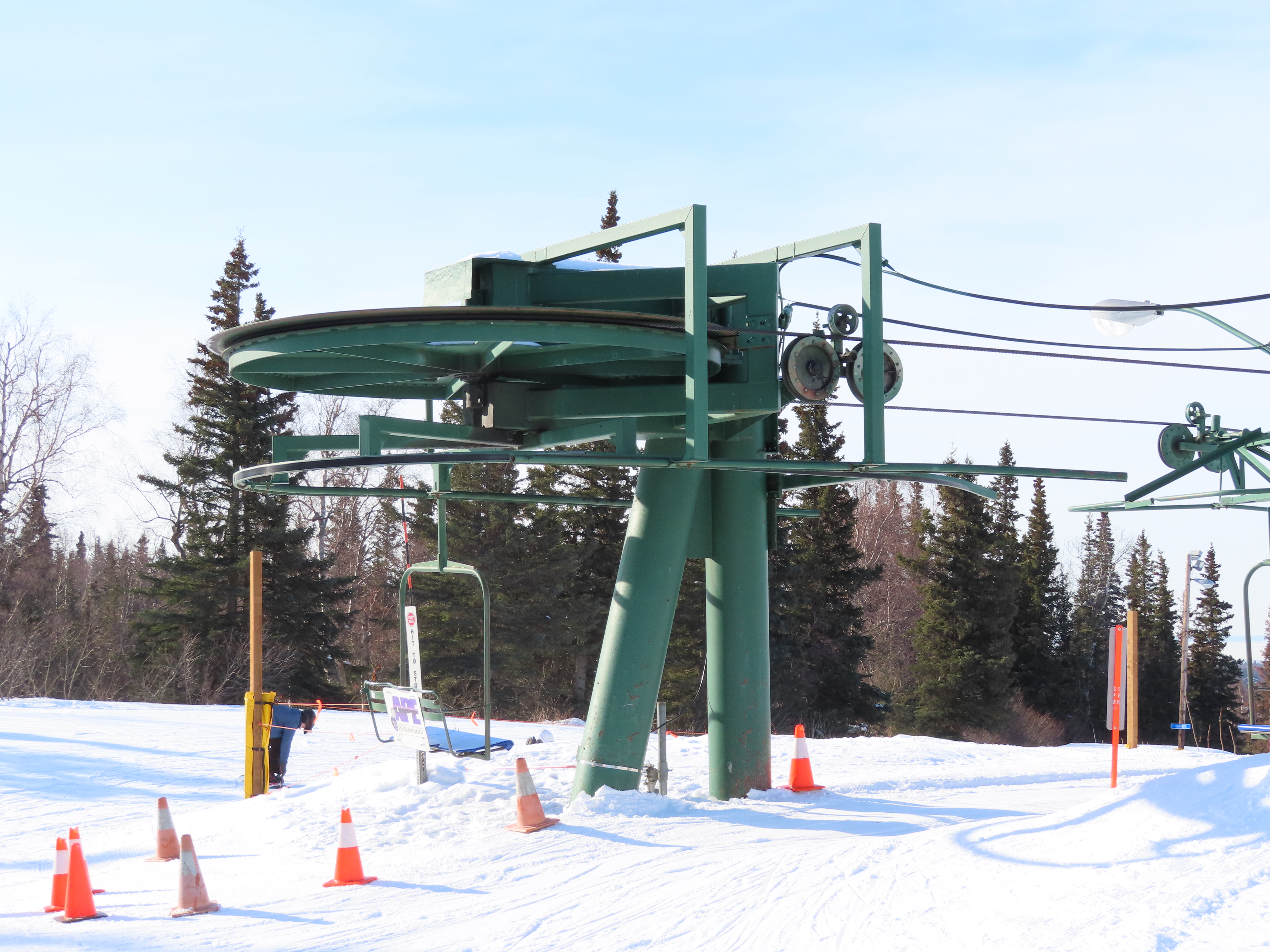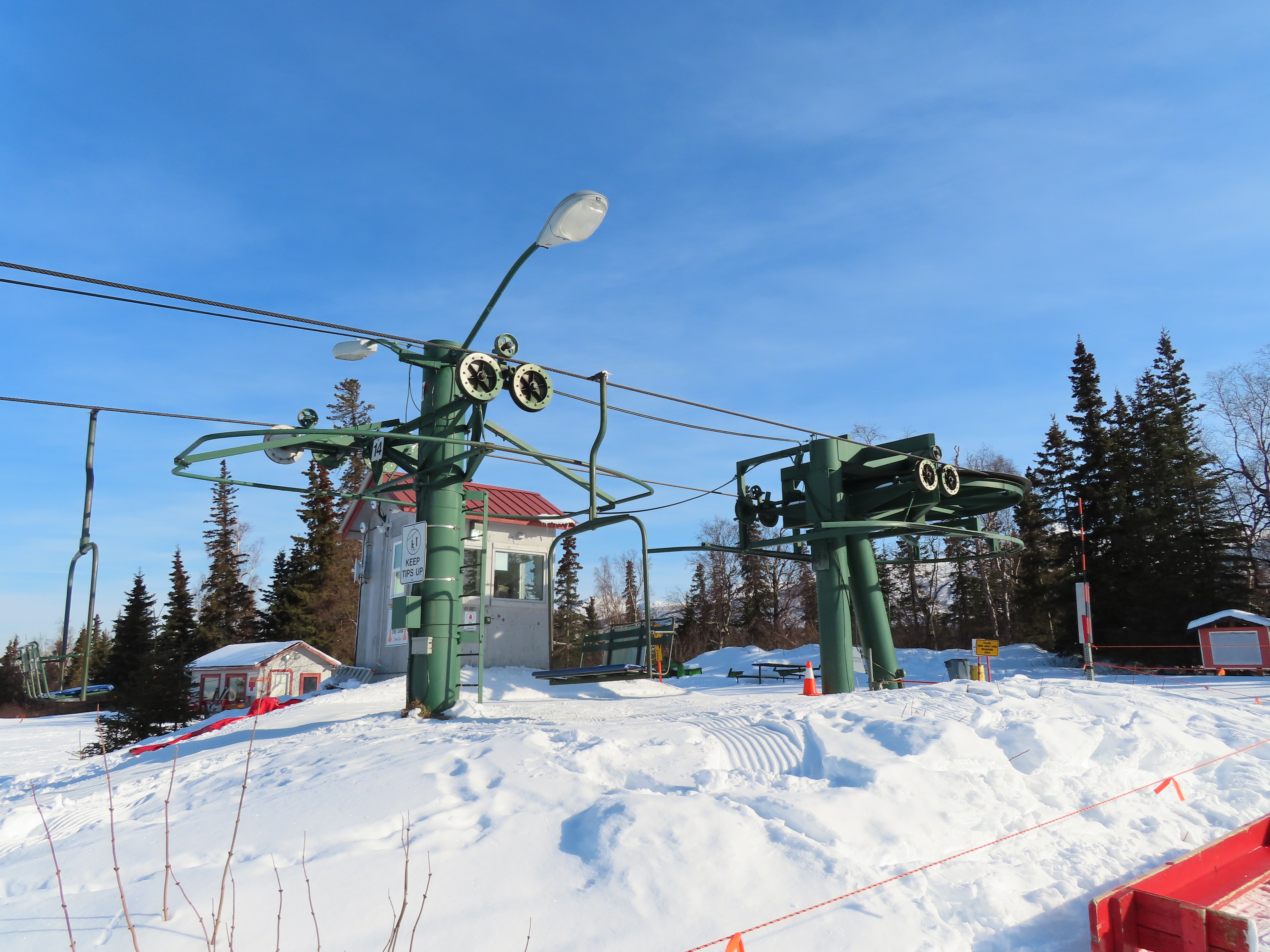 This nonprofit ski area operates in a city park.Loading area for this Riblet triple.Top terminal looking towards downtown Anchorage.Tower 14 and the top terminal.View from the summit.The upper half of the line is very low angle.View up at tower 9.Middle lift line.Breakover towers above the base lodge.The first few towers.Drive terminal and counterweight.Riding up the line.Another view of the bottom terminal.Unloading ramp.