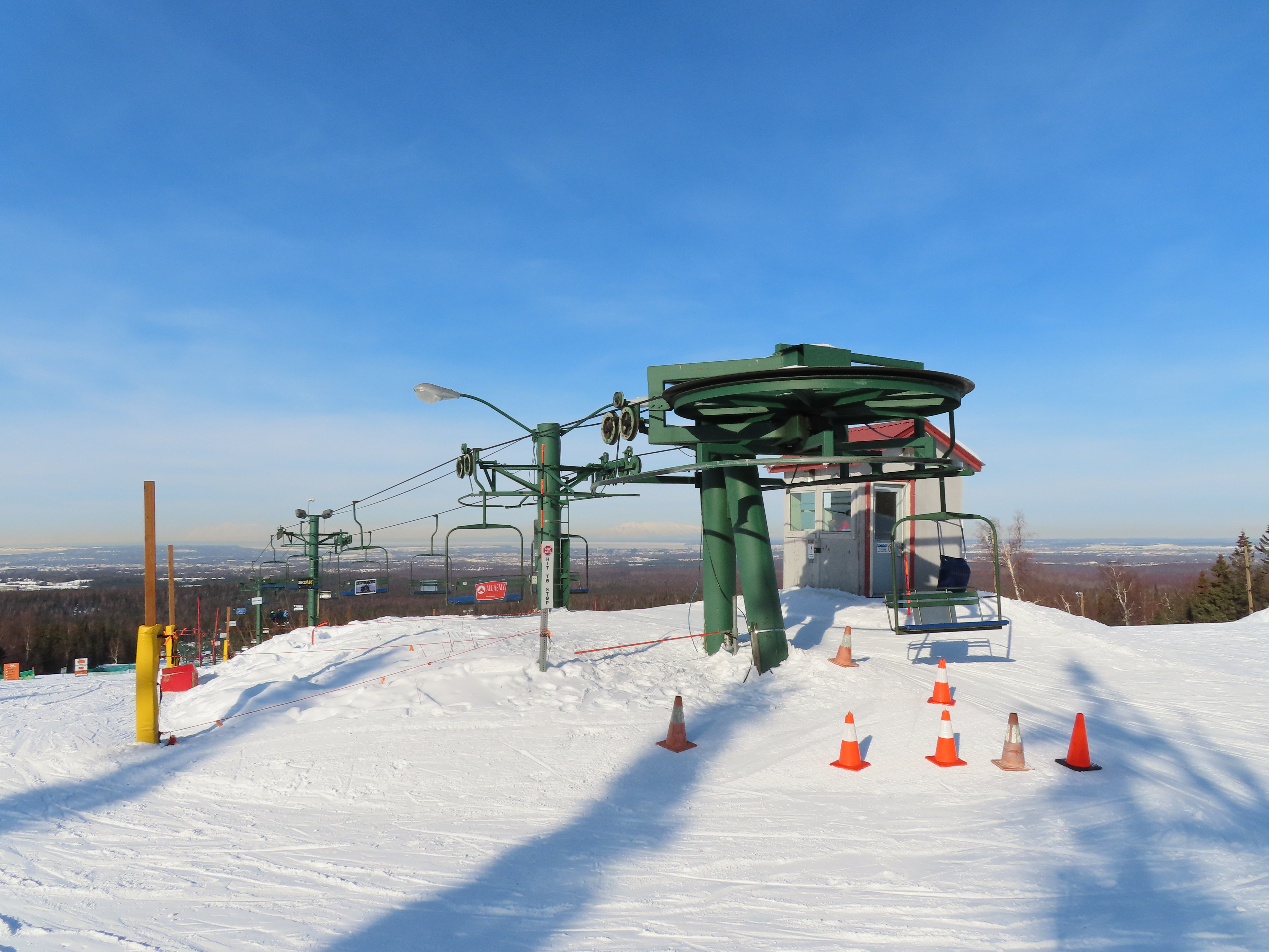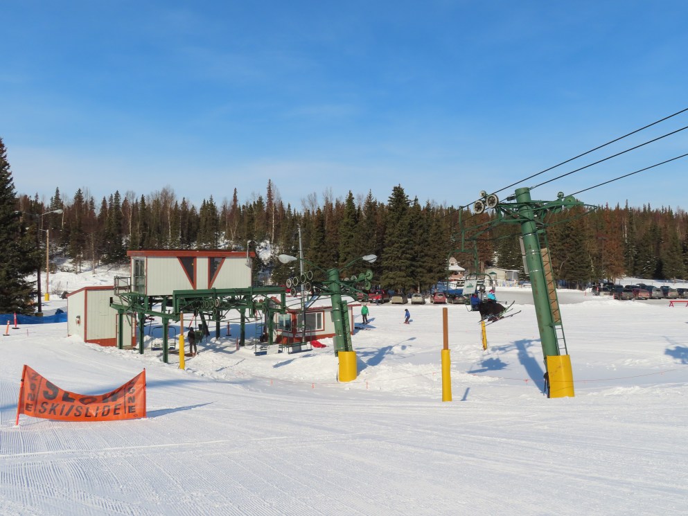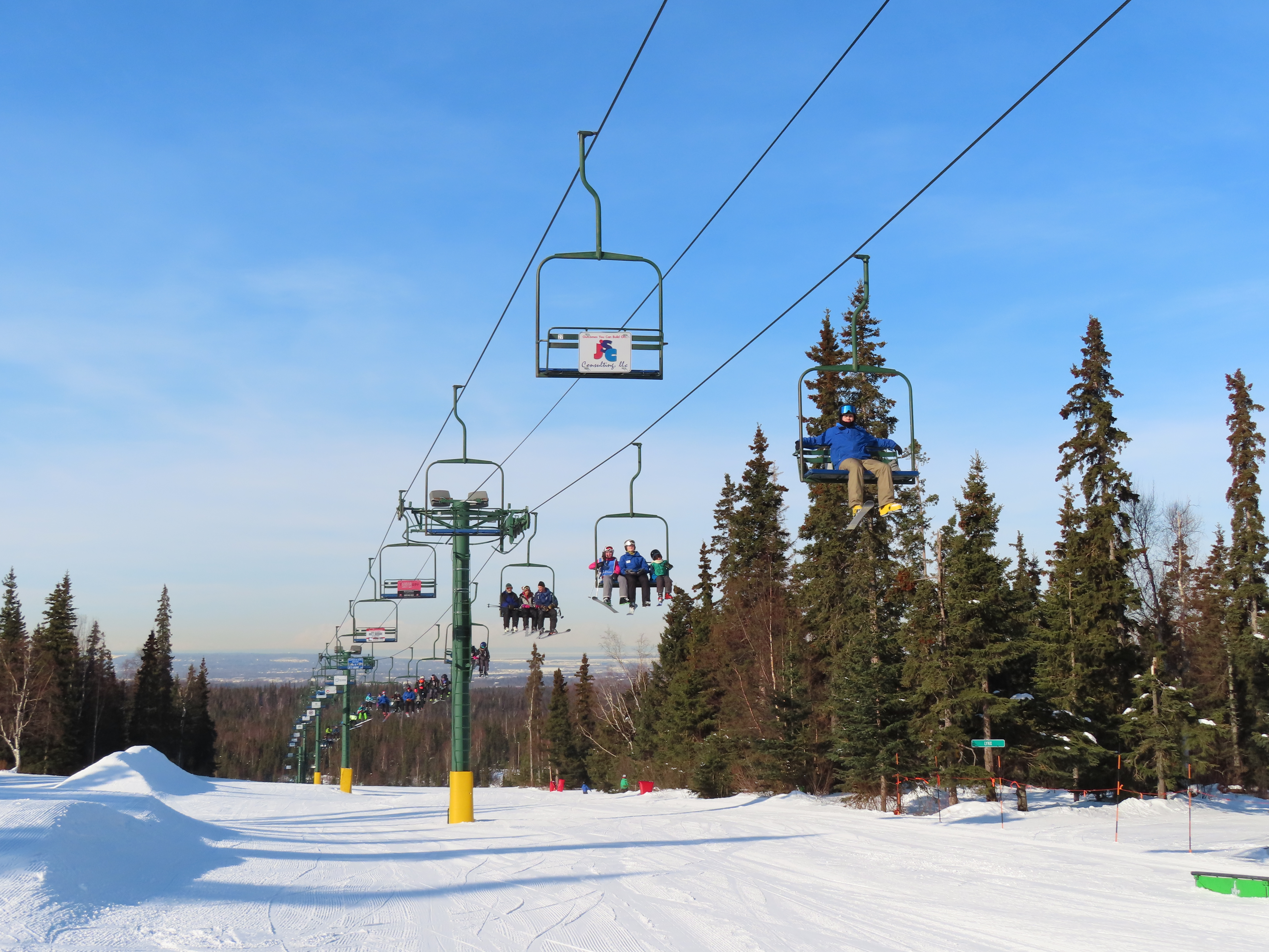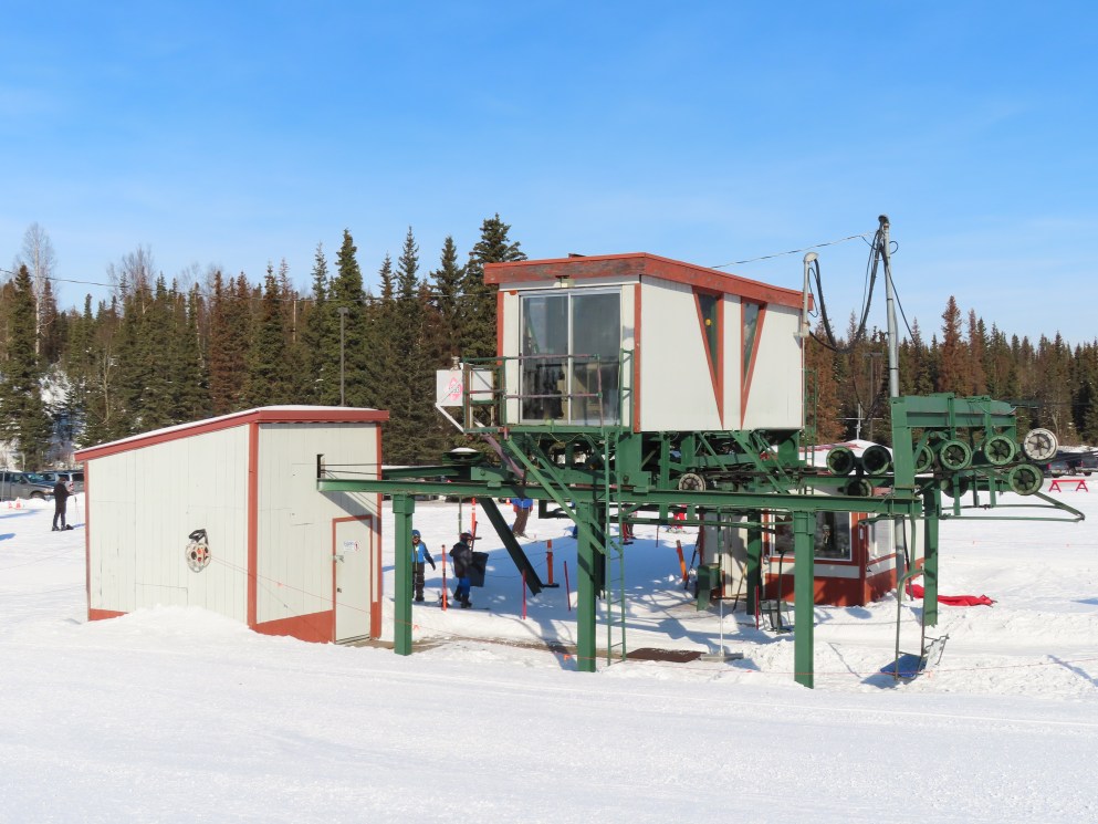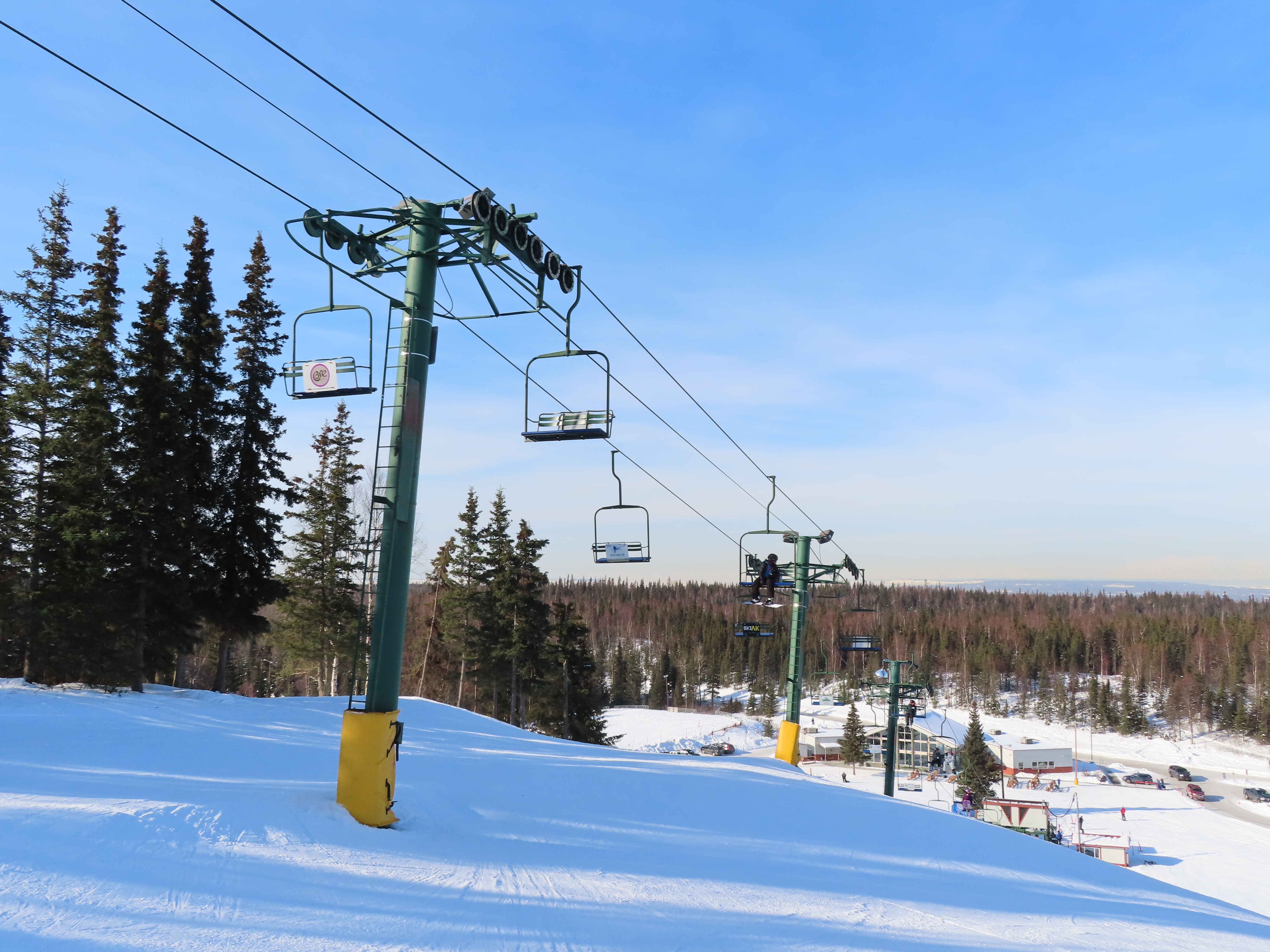 This nonprofit ski area operates in a city park.Loading area for this Riblet triple.Top terminal looking towards downtown Anchorage.Tower 14 and the top terminal.View from the summit.The upper half of the line is very low angle.View up at tower 9.Middle lift line.Breakover towers above the base lodge.The first few towers.Drive terminal and counterweight.Riding up the line.Another view of the bottom terminal.Unloading ramp.