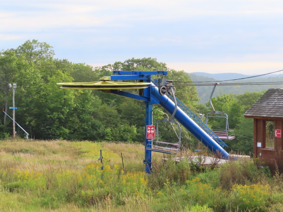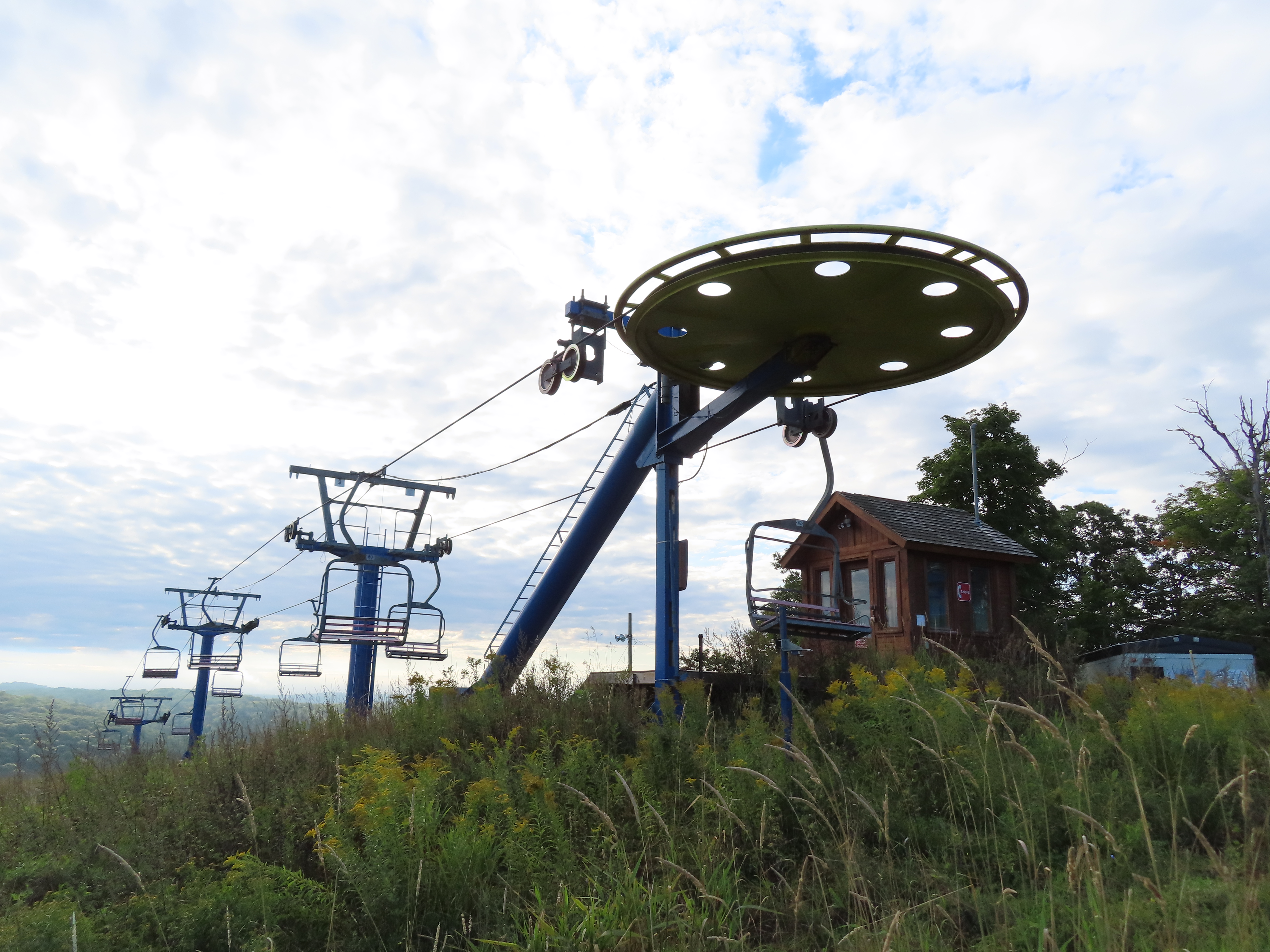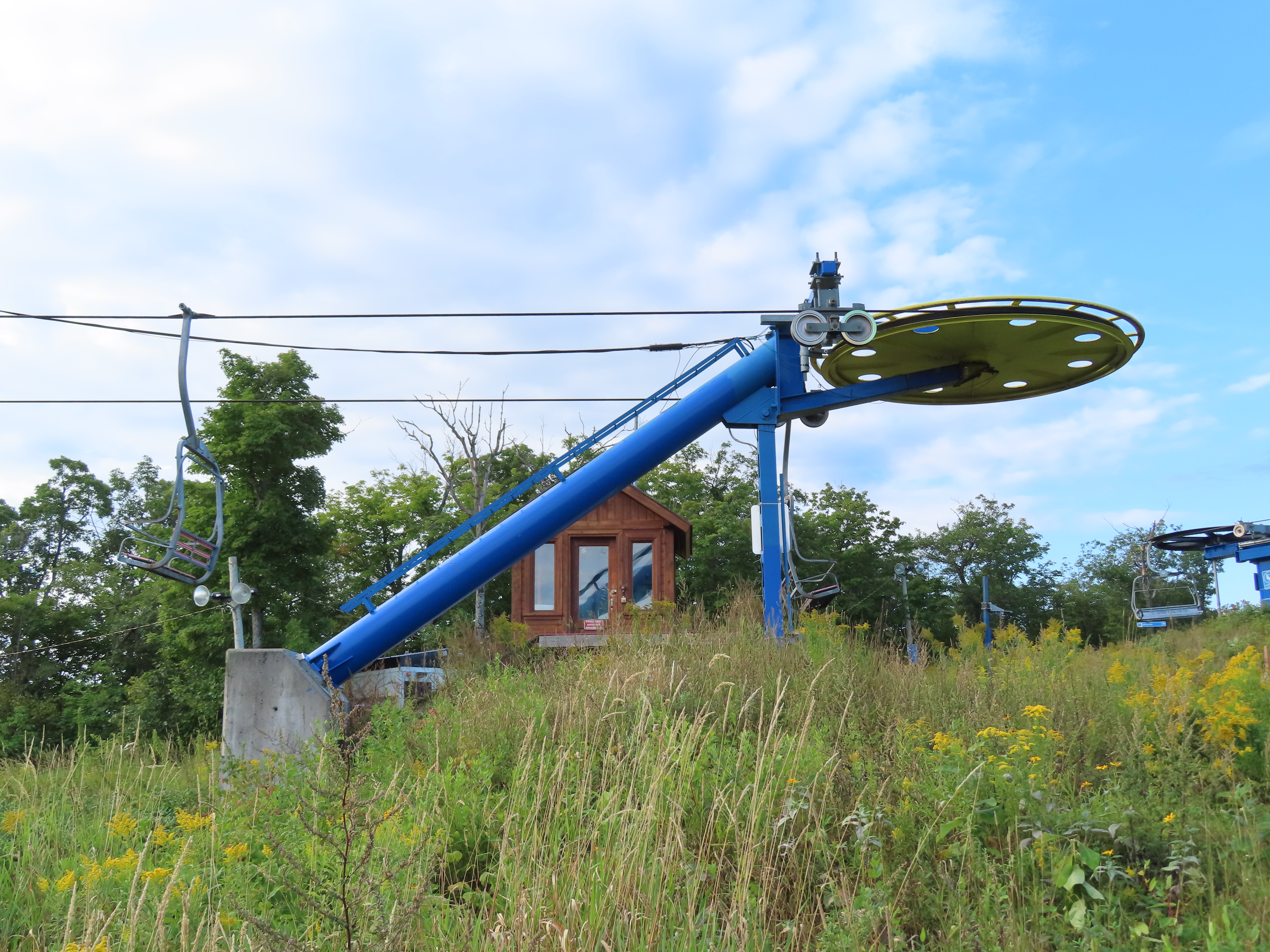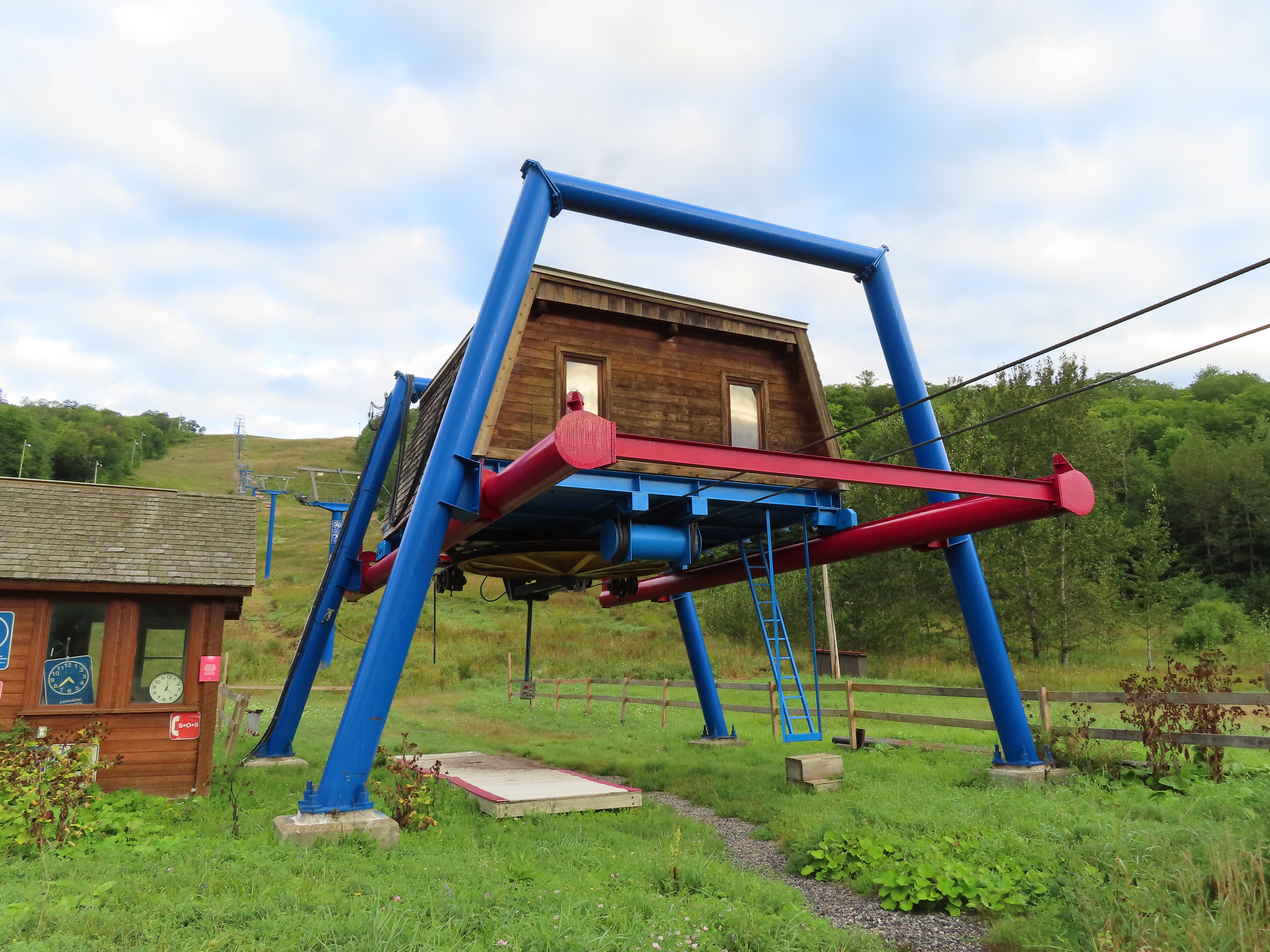 This lift was relocated from the front side of the mountain.Side view of the drive-tension station.Loading area.Counterweight tensioning.Lift overview.The top terminal.Unloading area and breakover towers.Side view of the fixed return.The final tower and top station.View down the line.