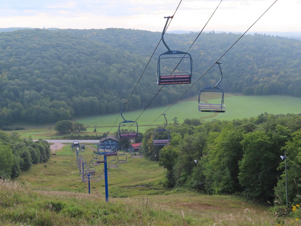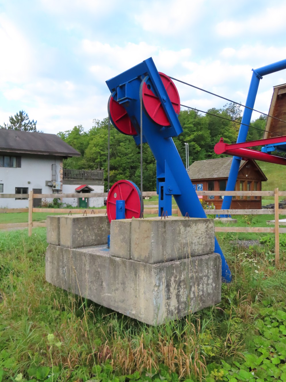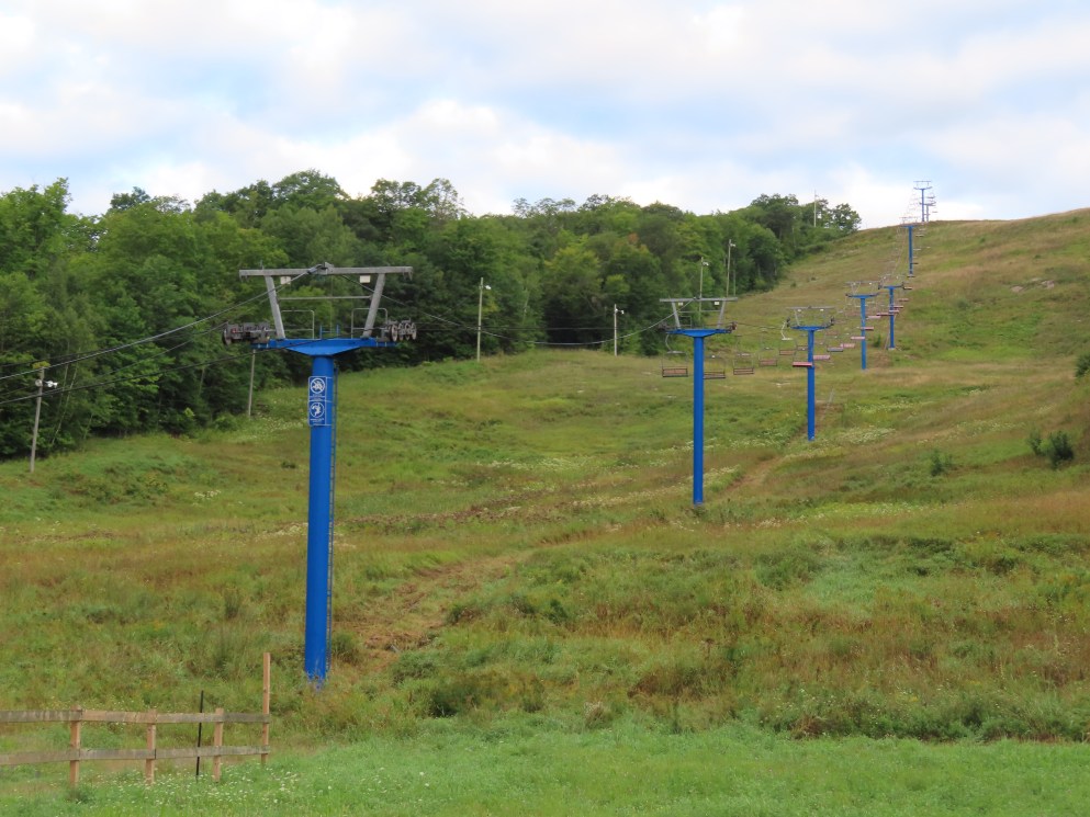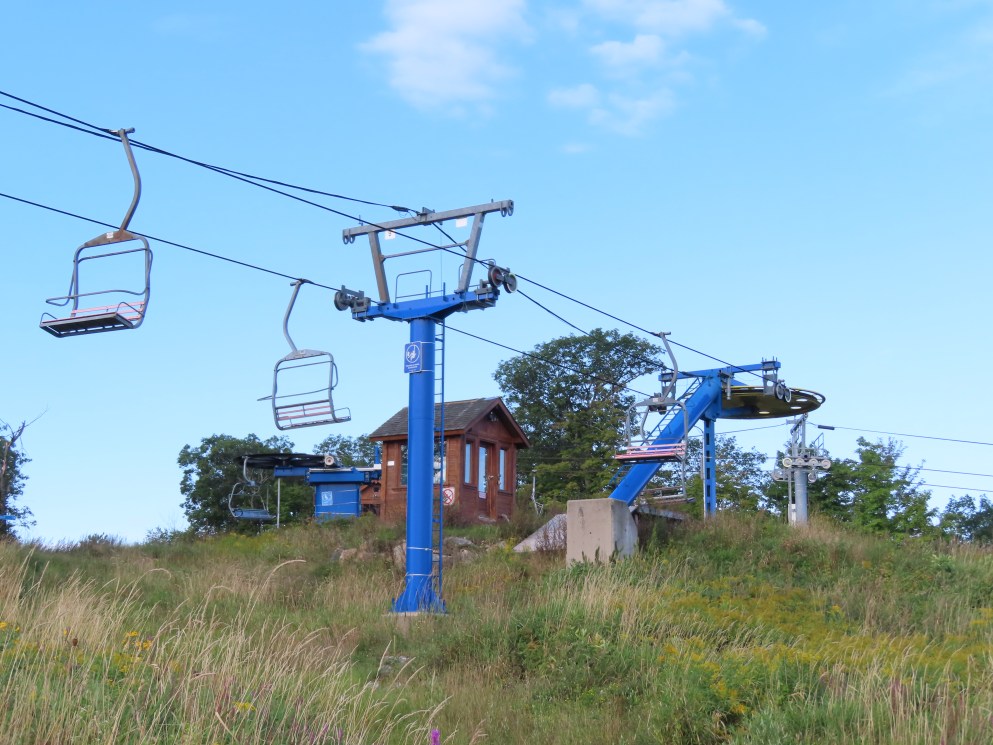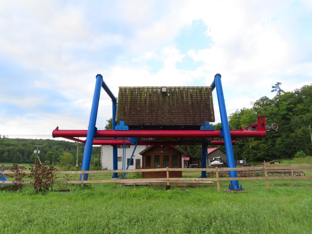 This lift was relocated from the front side of the mountain.Side view of the drive-tension station.Loading area.Counterweight tensioning.Lift overview.The top terminal.Unloading area and breakover towers.Side view of the fixed return.The final tower and top station.View down the line.