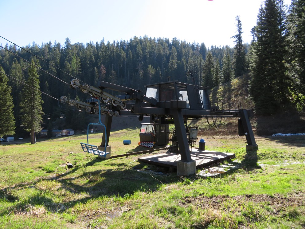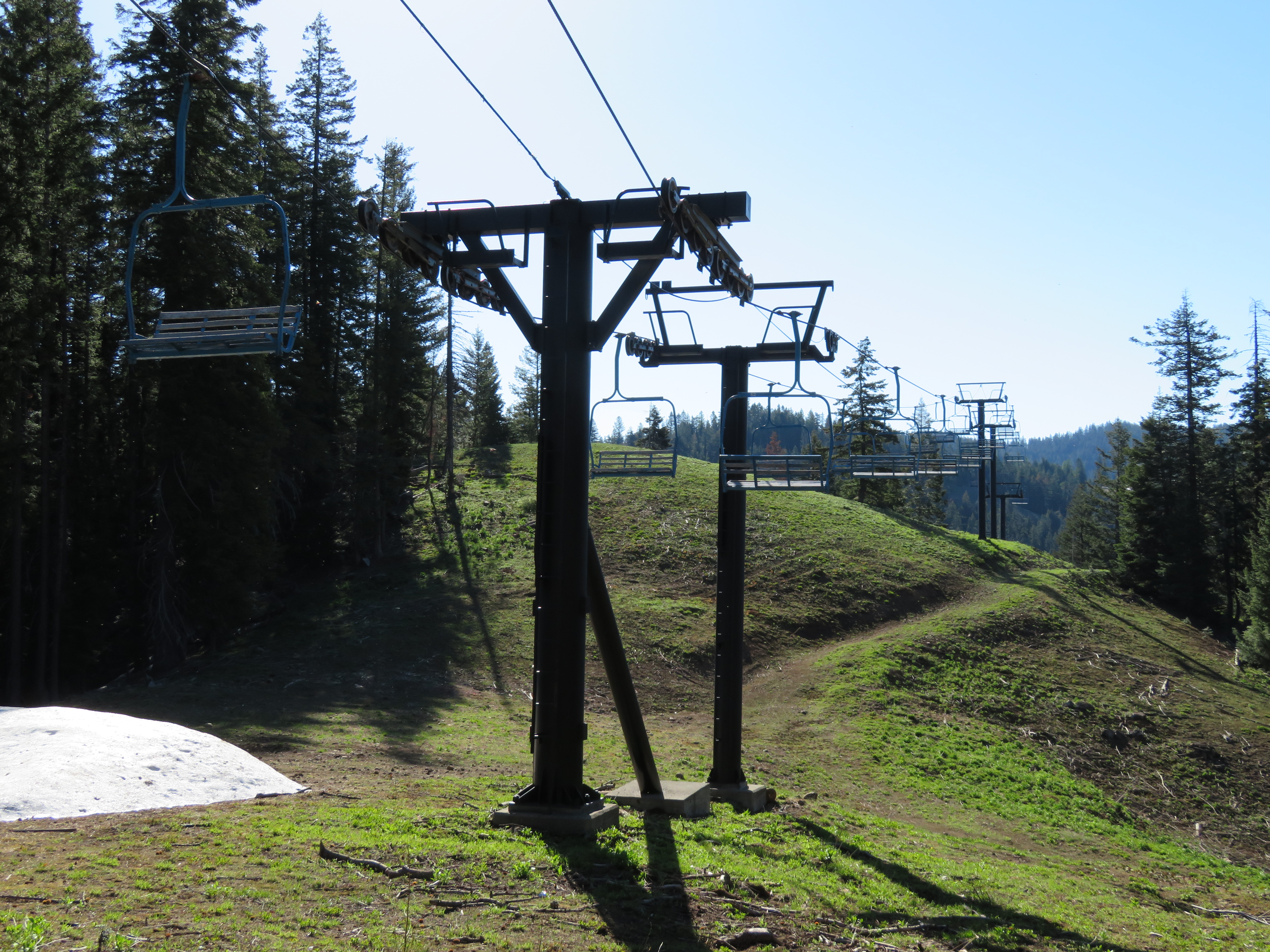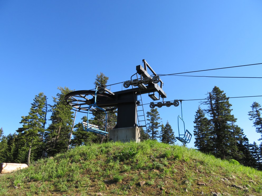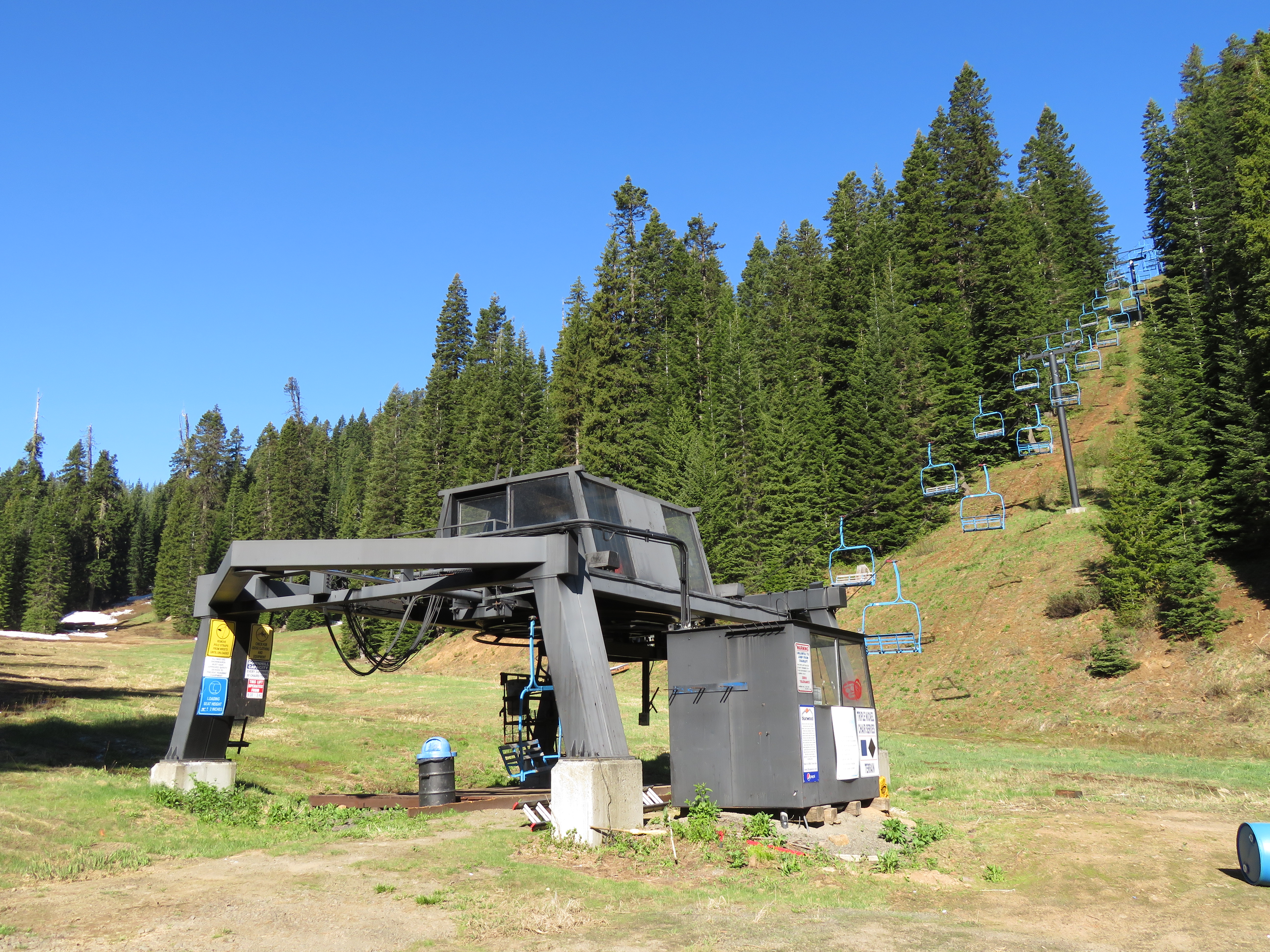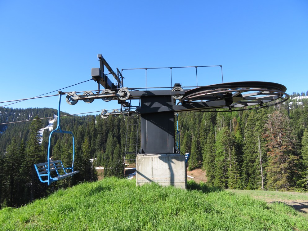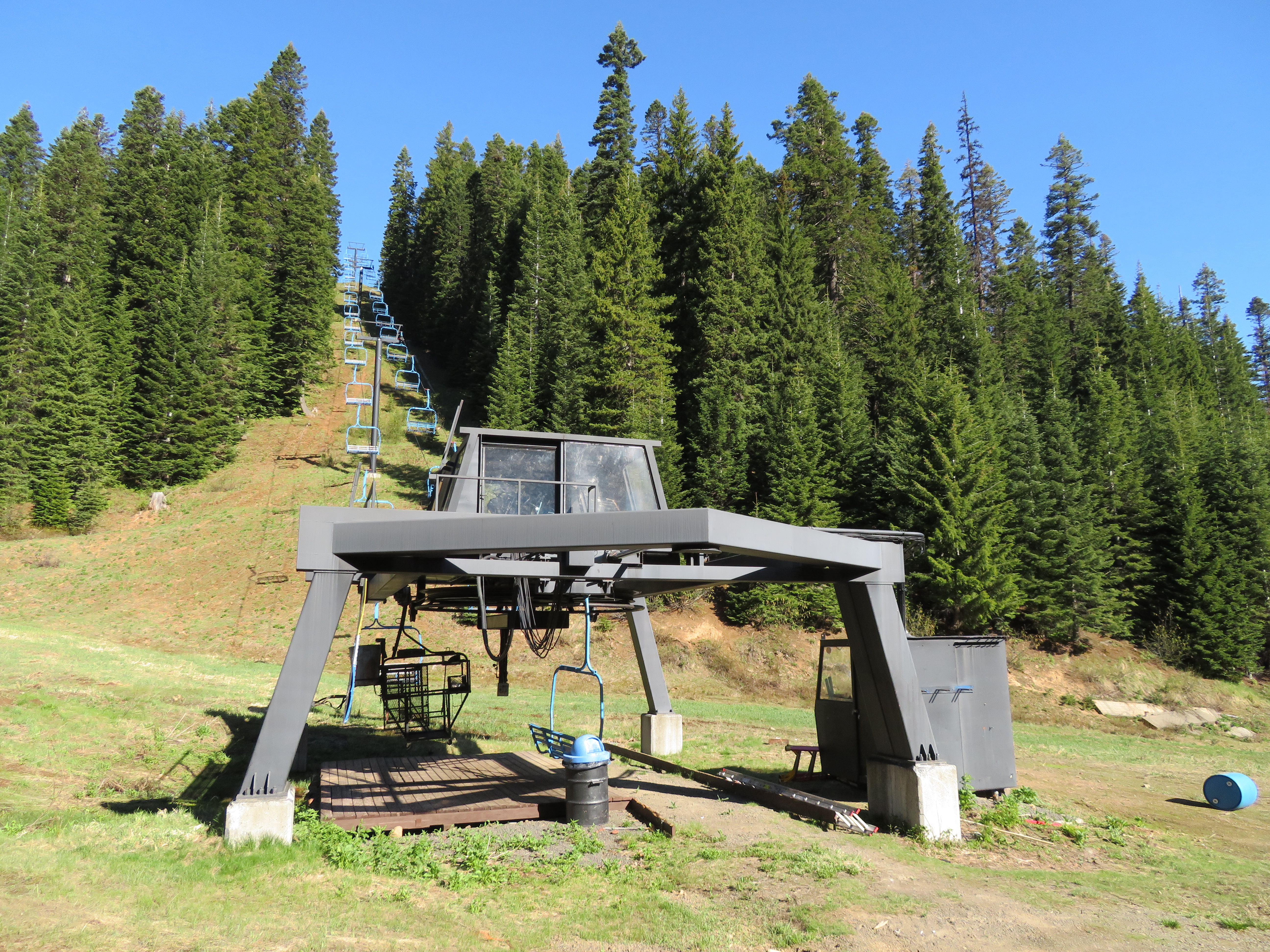 Triple nickel has a unique profile with a downhill section.Borvig top bullwheel.Top operator house.View down from the summit.Side view of the return.Middle part of the line.Upper lift line.Steep first part of the line.Standard Borvig drive-tension station.Loading area and work chair.Lift overview.Another view up the line from the base area.
