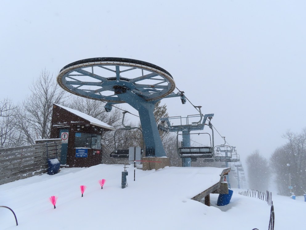This rare Canadian Borvig has been upgraded with Poma chairs.Bottom terminal with drive and tensioning.View leaving the base.1980s style Borvig tower.Riding up the line.Tower 8.Snowflake bullwheel.Upper part of the lift line.Top station overview.Looking down the line.Loading area.