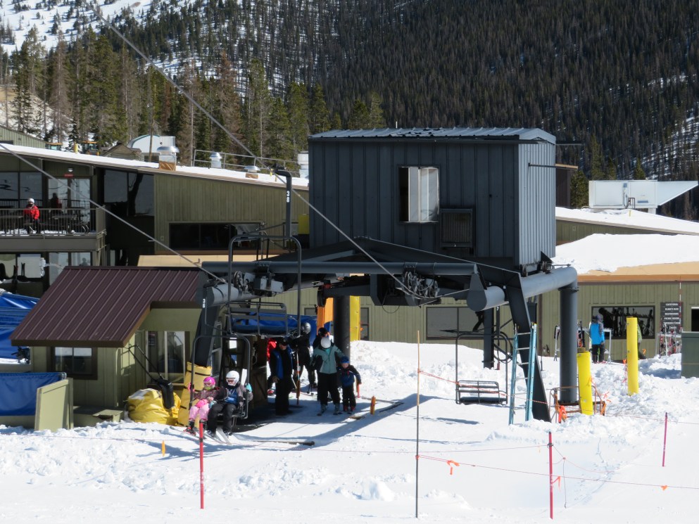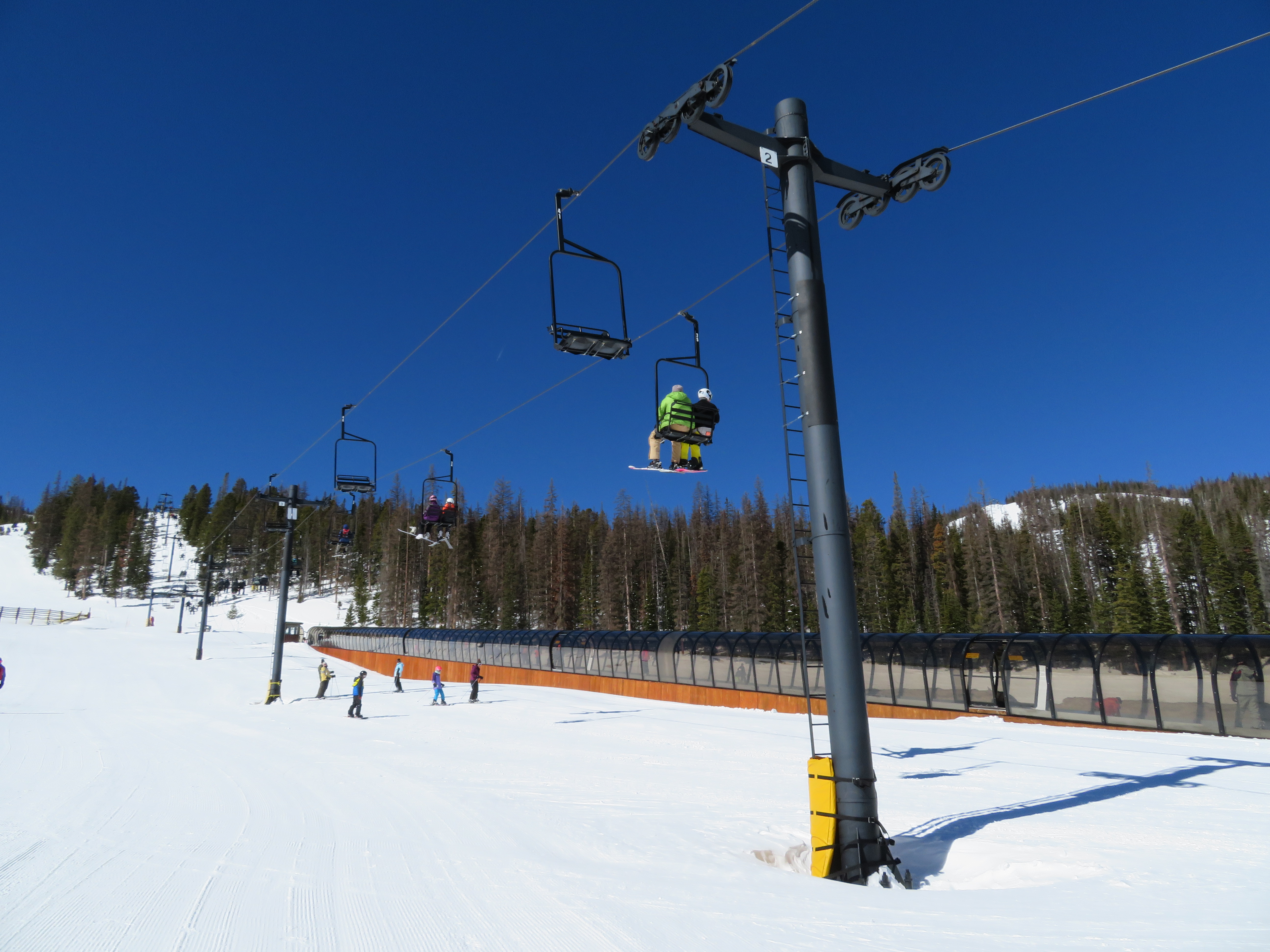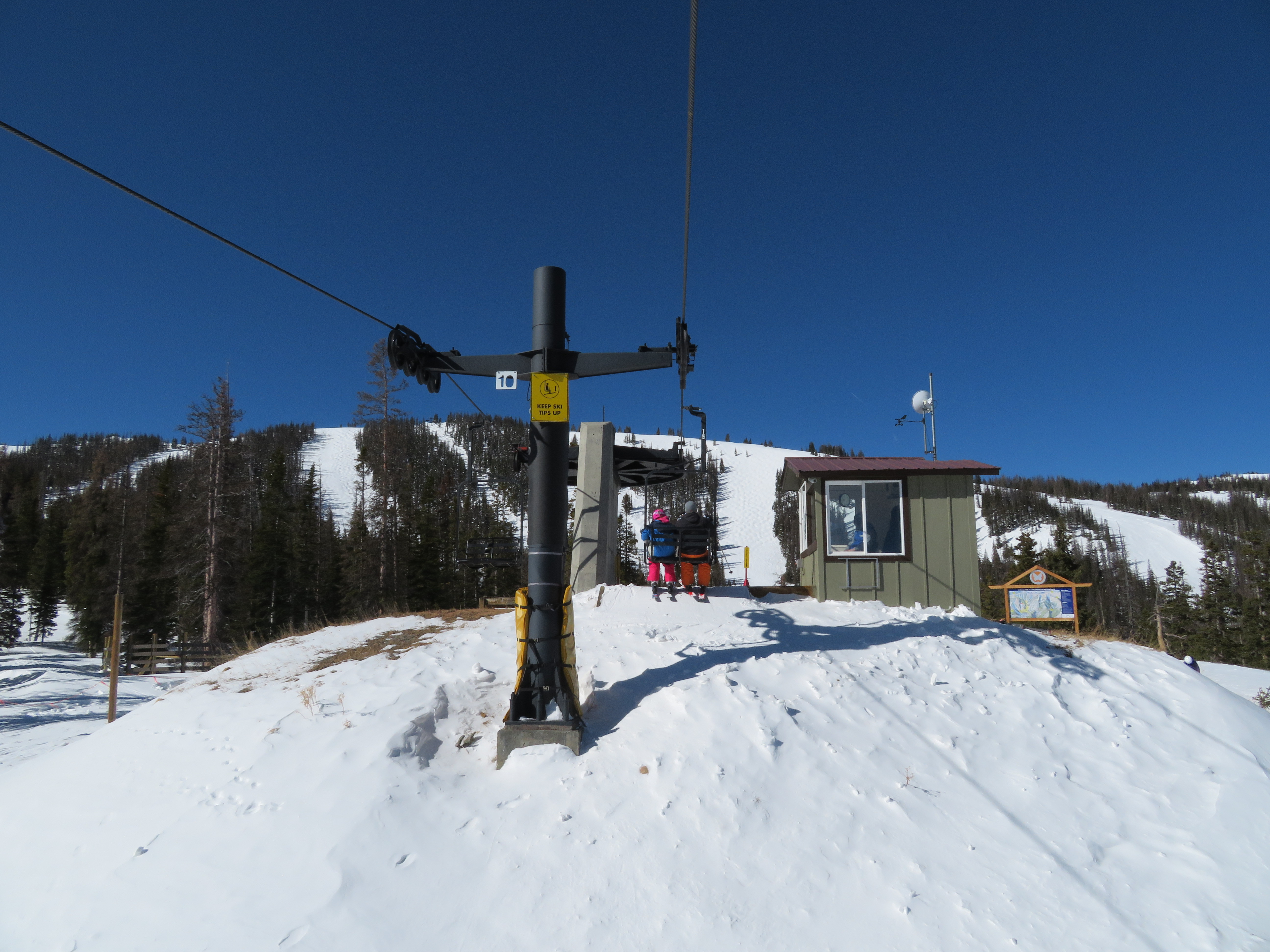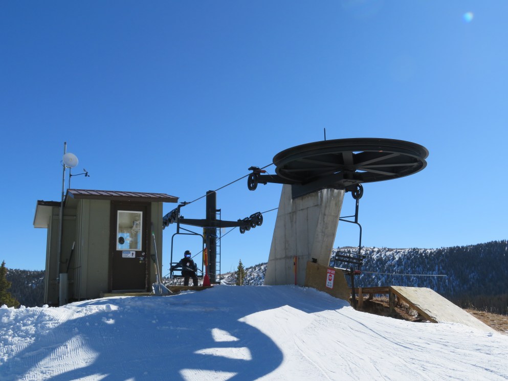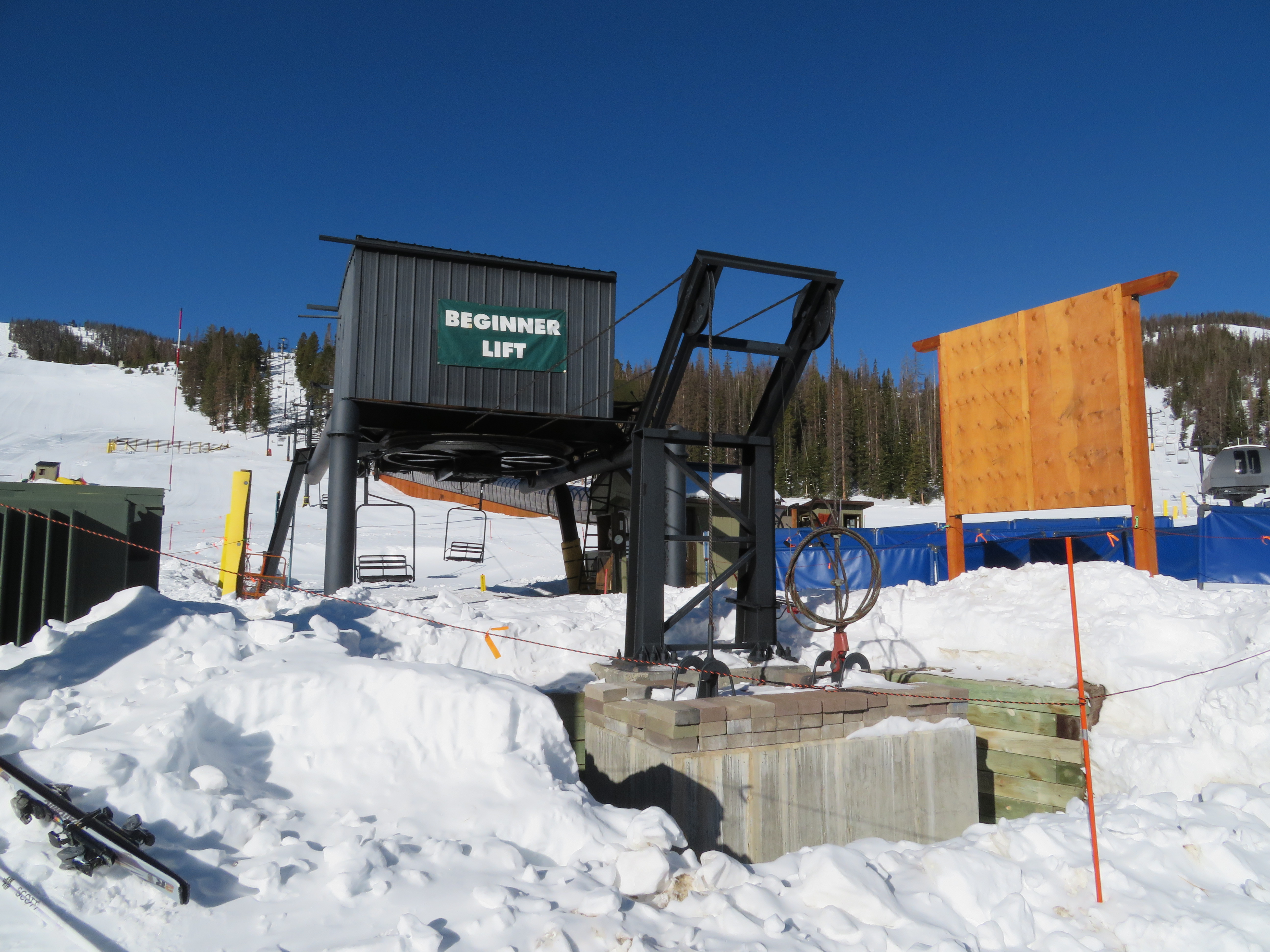 Tumbelina is Monarch’s beginner chairlift. There used to be an unloading opportunity at the portal tower shown here. Now, never ever skiers simply ride the neighboring carpet.