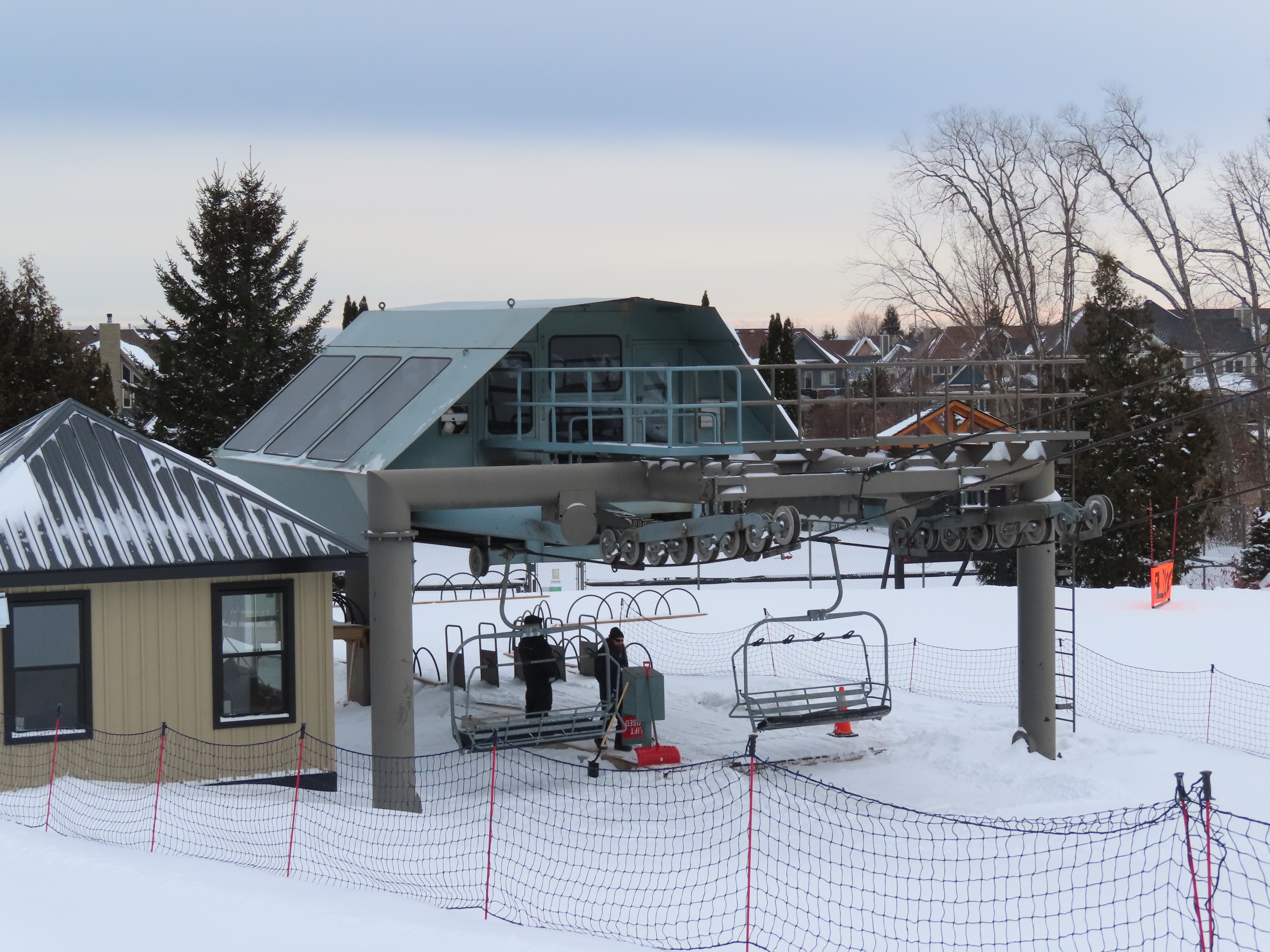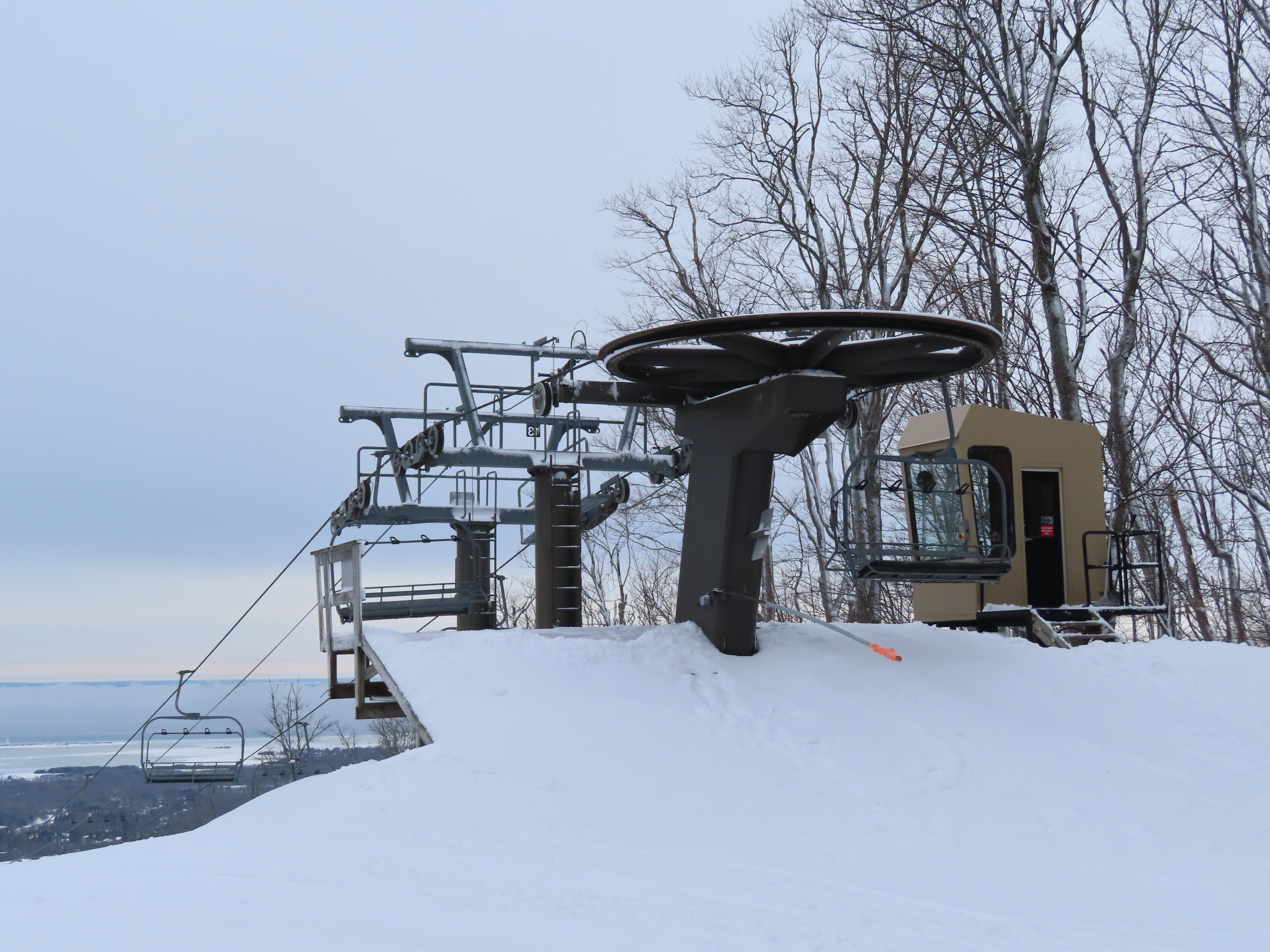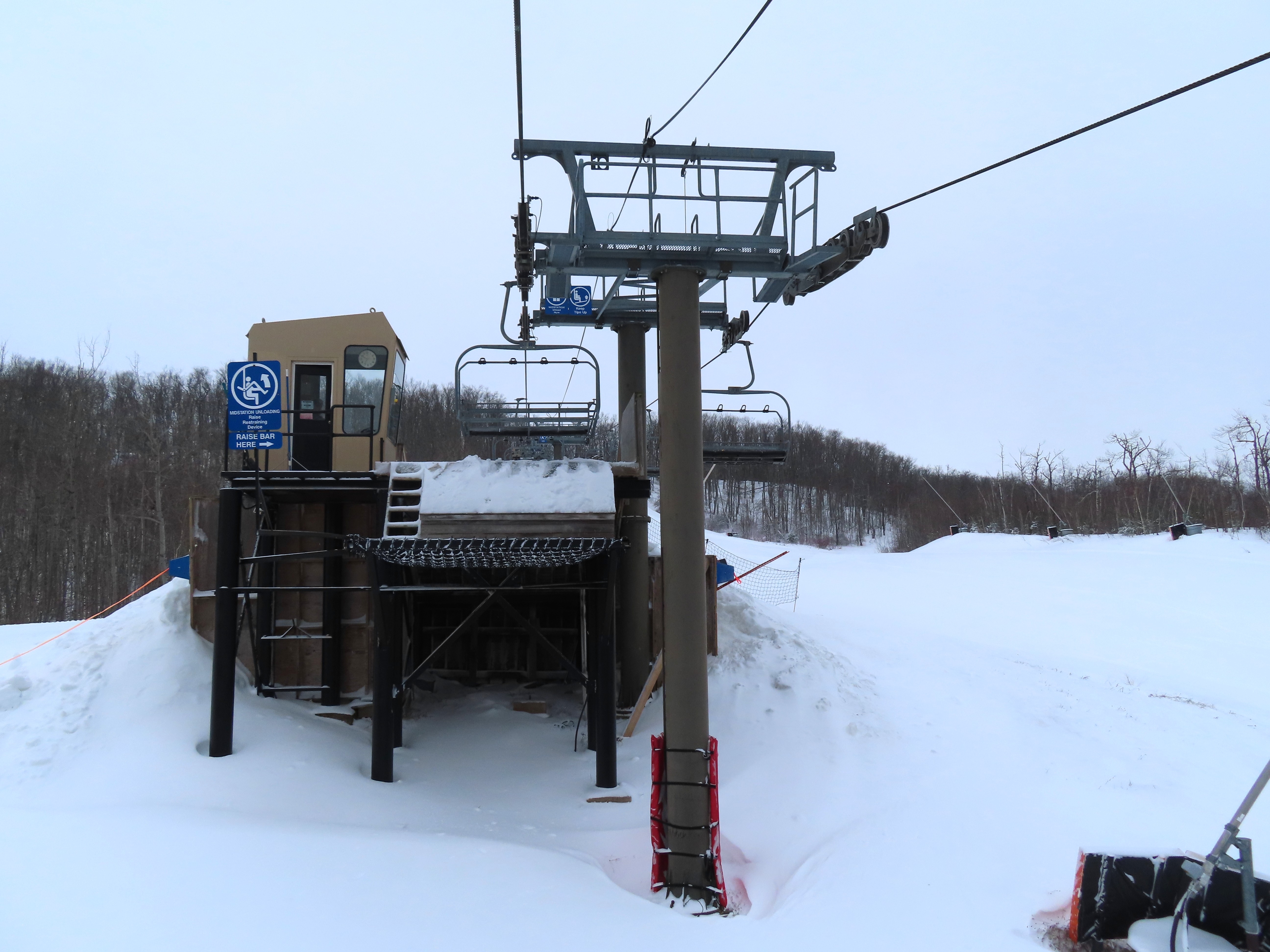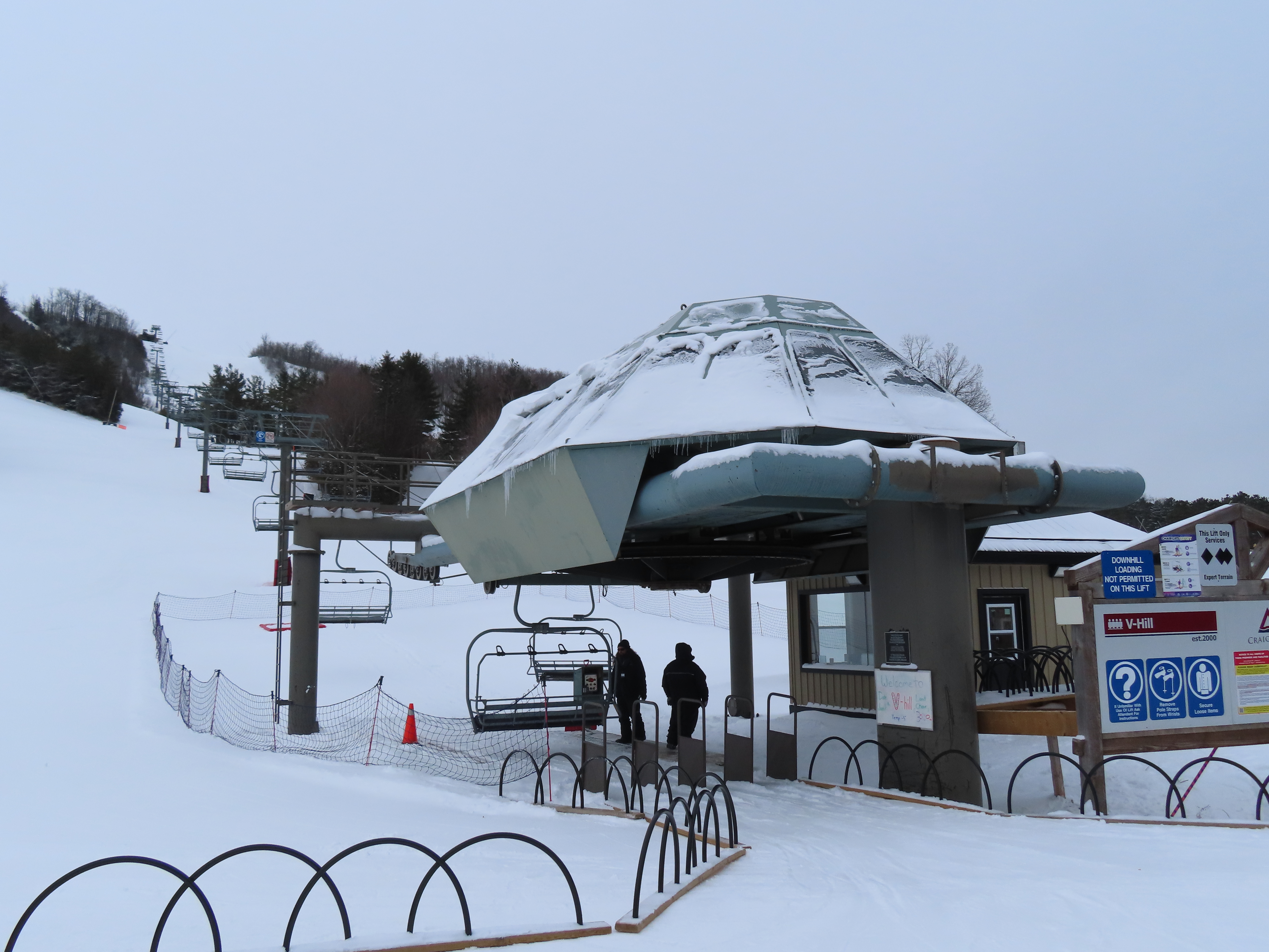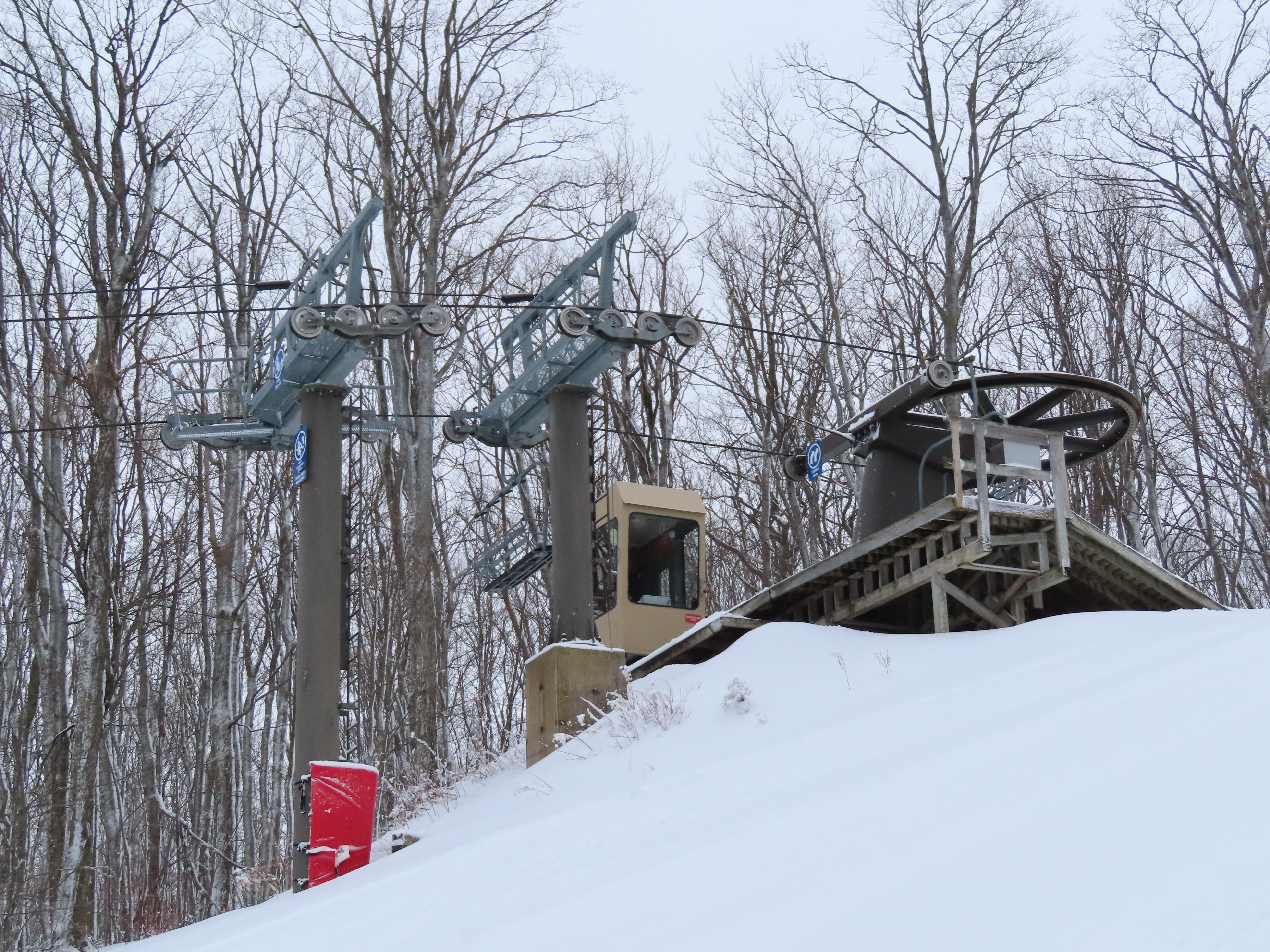This Garaventa CTEC quad services the easternmost portion of the mountain.View up the line at tower 2.Side view of the drive-tension station.Loading area.CTEC tower head.Super rare CTEC in eastern Canada.View back down the line.Middle station with optional unloading.Towers 10 and 10A.Very tall tower 12.Arriving at the summit.Orion return terminal.Unloading area.View from the summit.The last two towers.Mid-station overview.Upper line above the mid.Tall tower 7.Lower lift line.View up the main face of V-Hill.Lift overview.