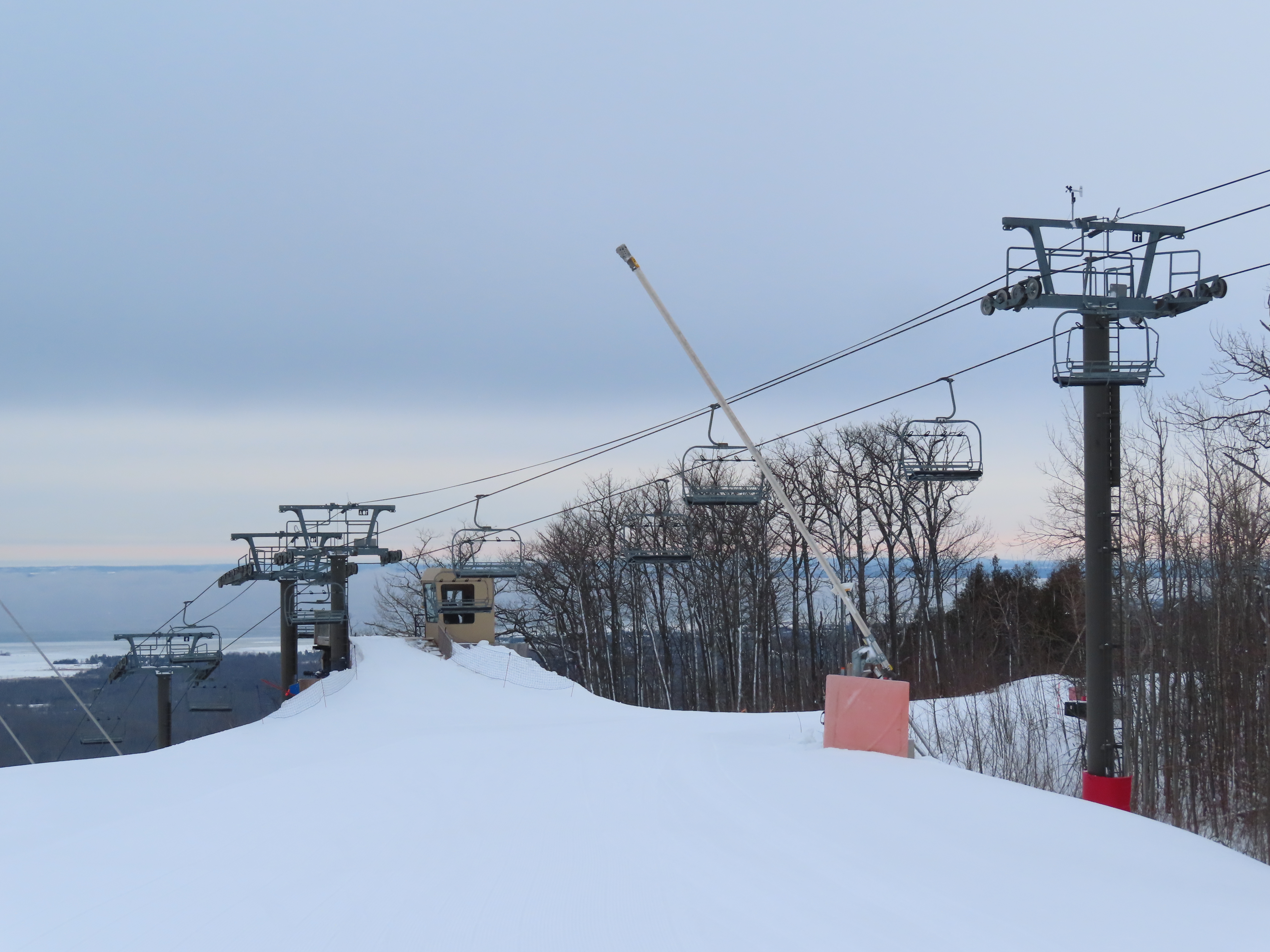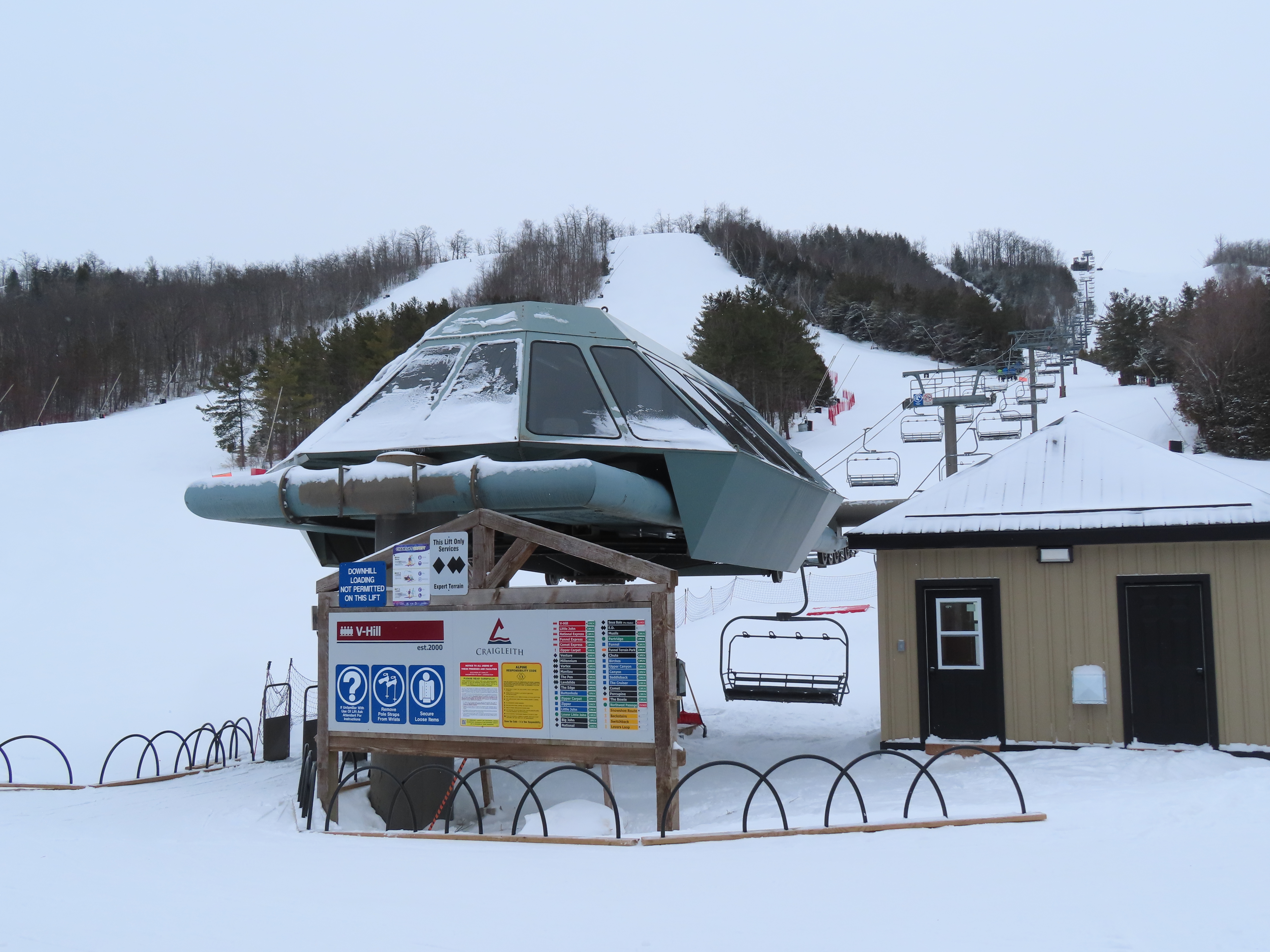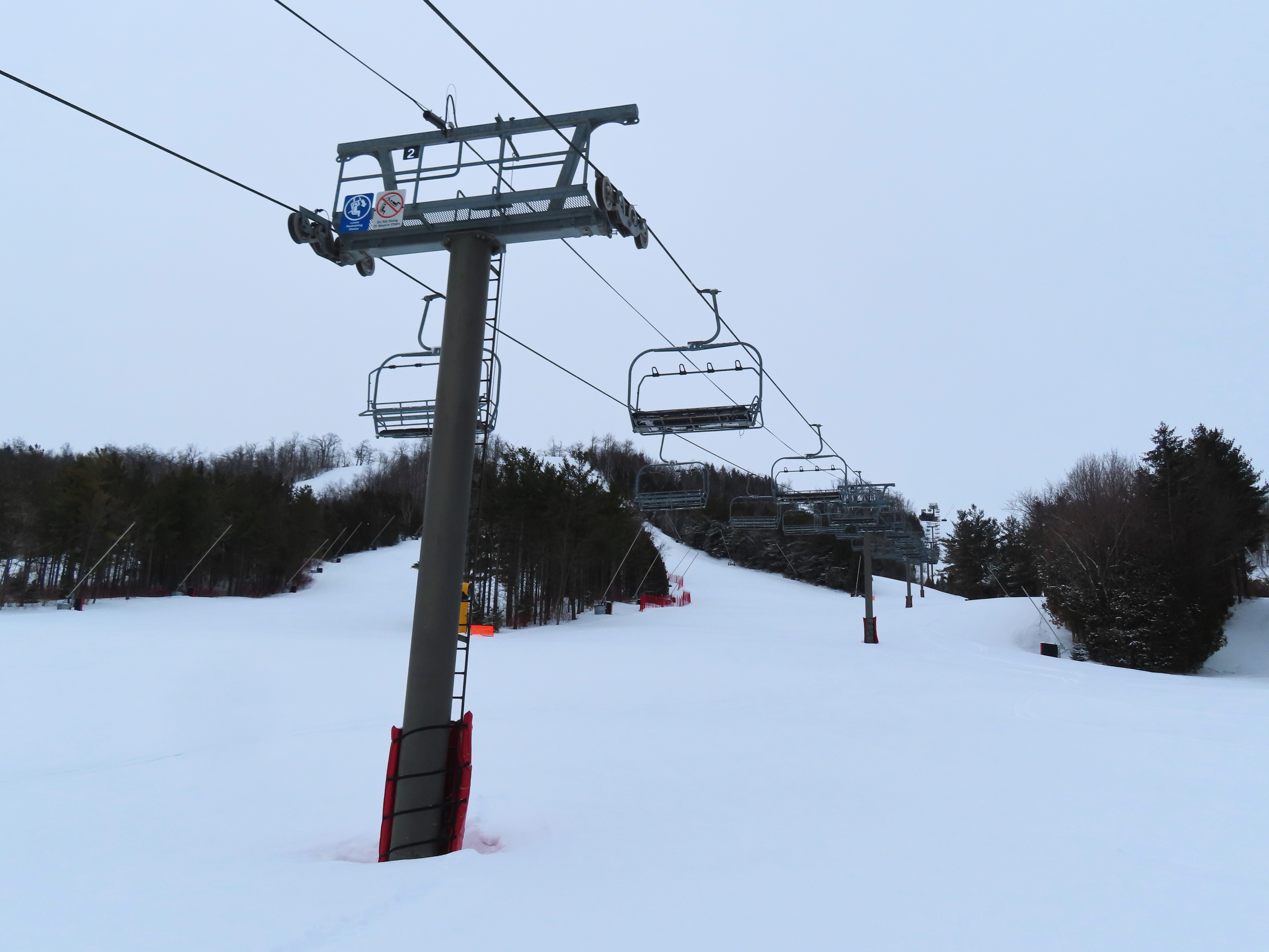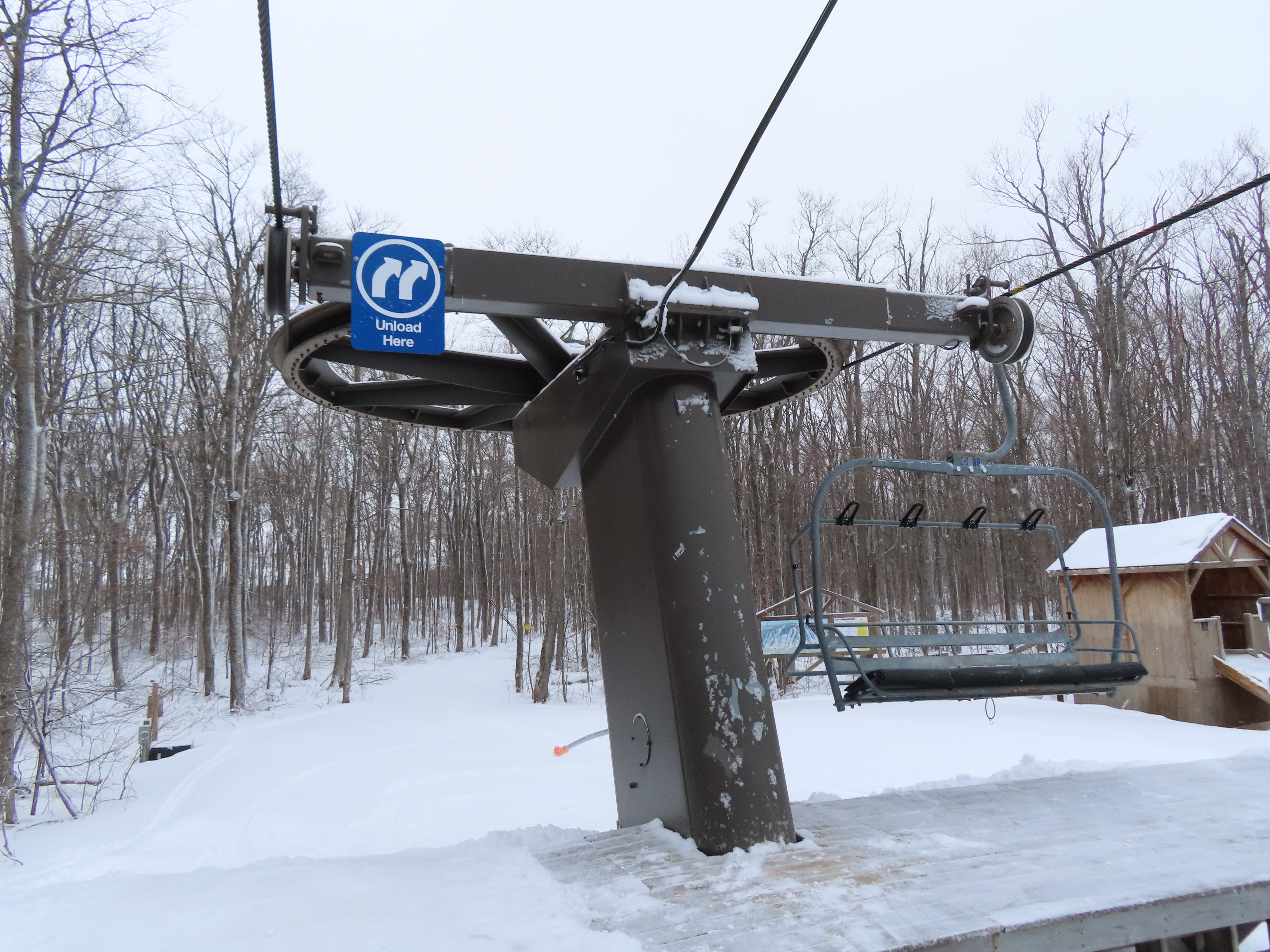 This Garaventa CTEC quad services the easternmost portion of the mountain.View up the line at tower 2.Side view of the drive-tension station.Loading area.CTEC tower head.Super rare CTEC in eastern Canada.View back down the line.Middle station with optional unloading.Towers 10 and 10A.Very tall tower 12.Arriving at the summit.Orion return terminal.Unloading area.View from the summit.The last two towers.Mid-station overview.Upper line above the mid.Tall tower 7.Lower lift line.View up the main face of V-Hill.Lift overview.