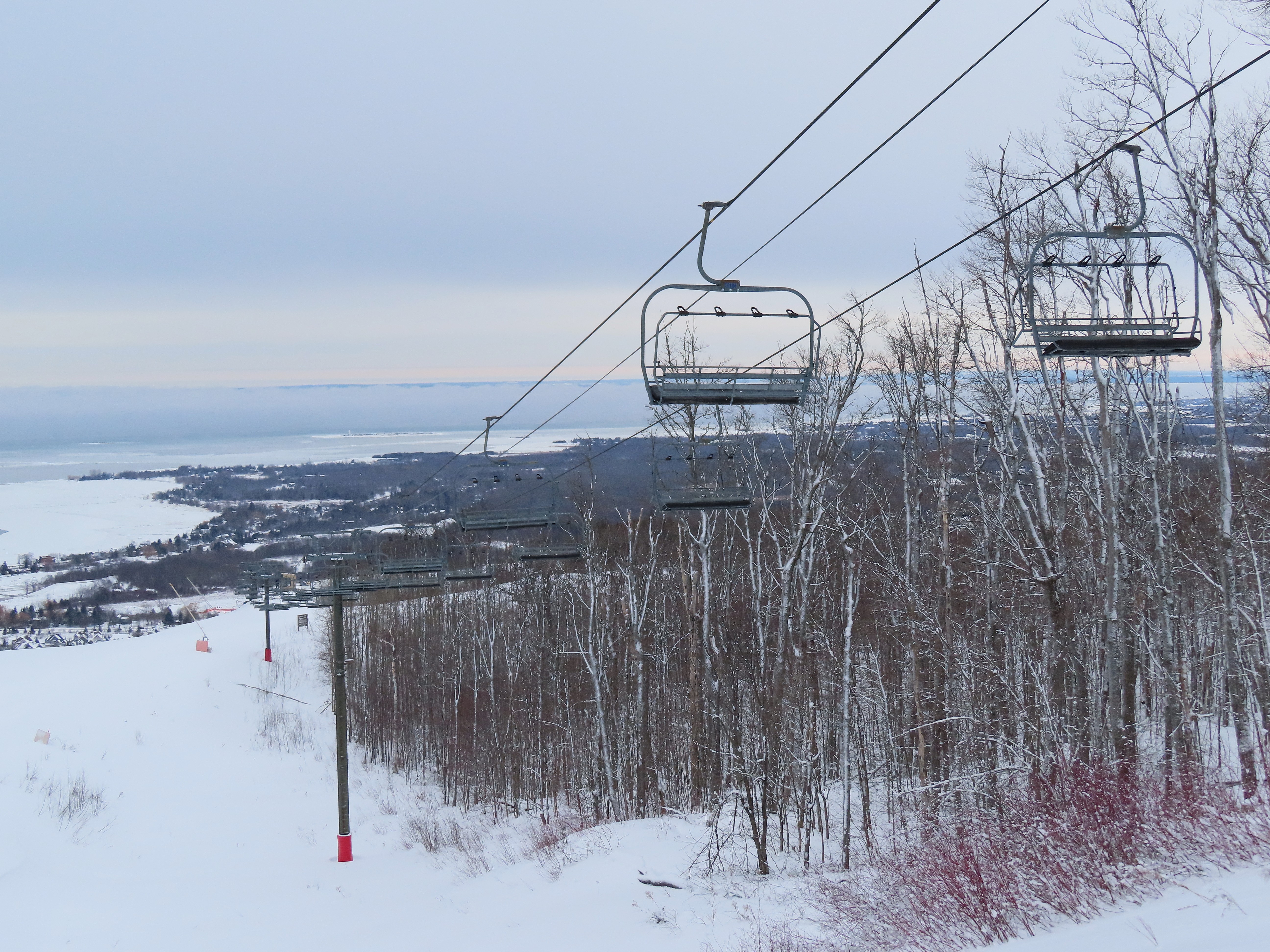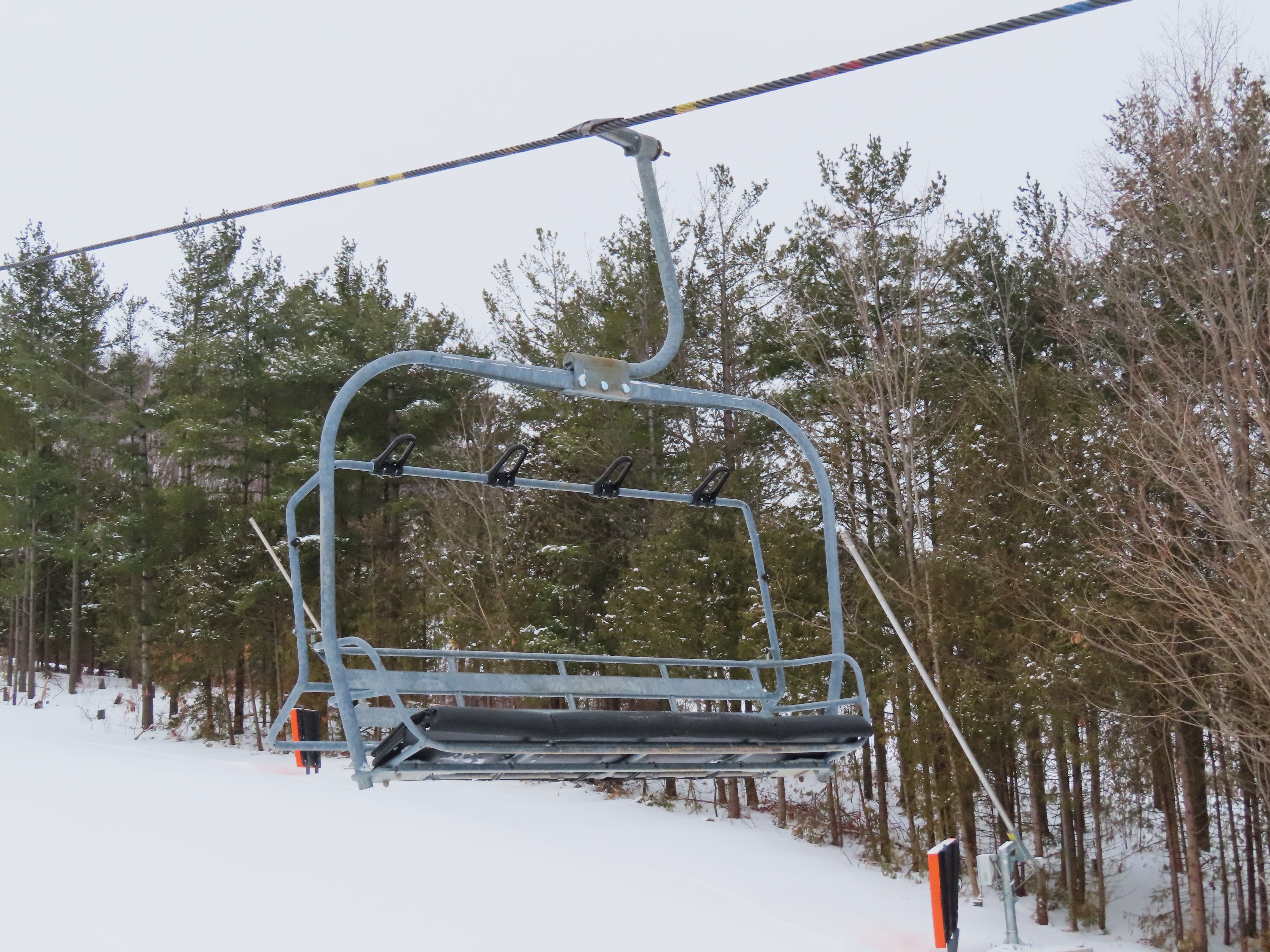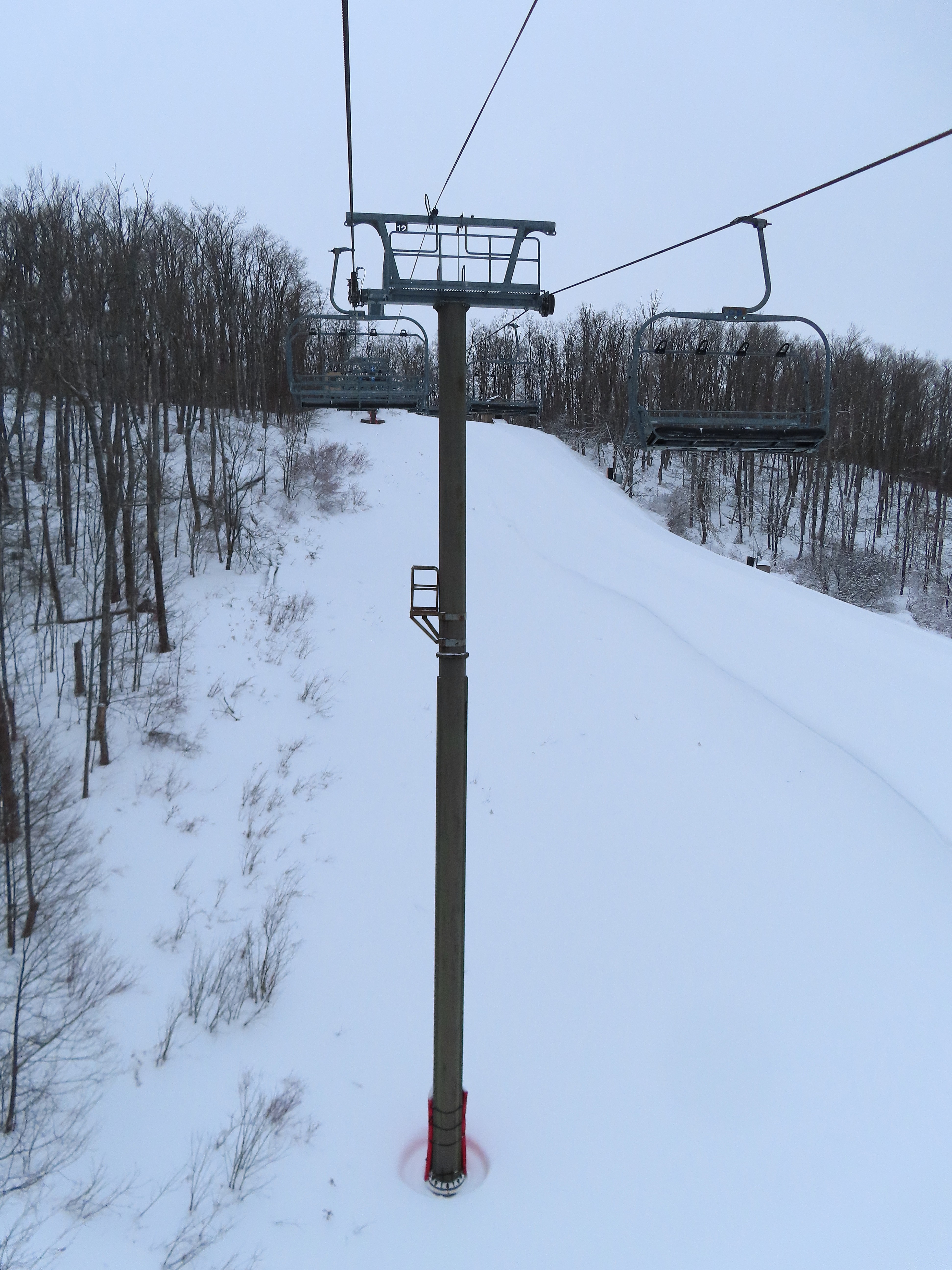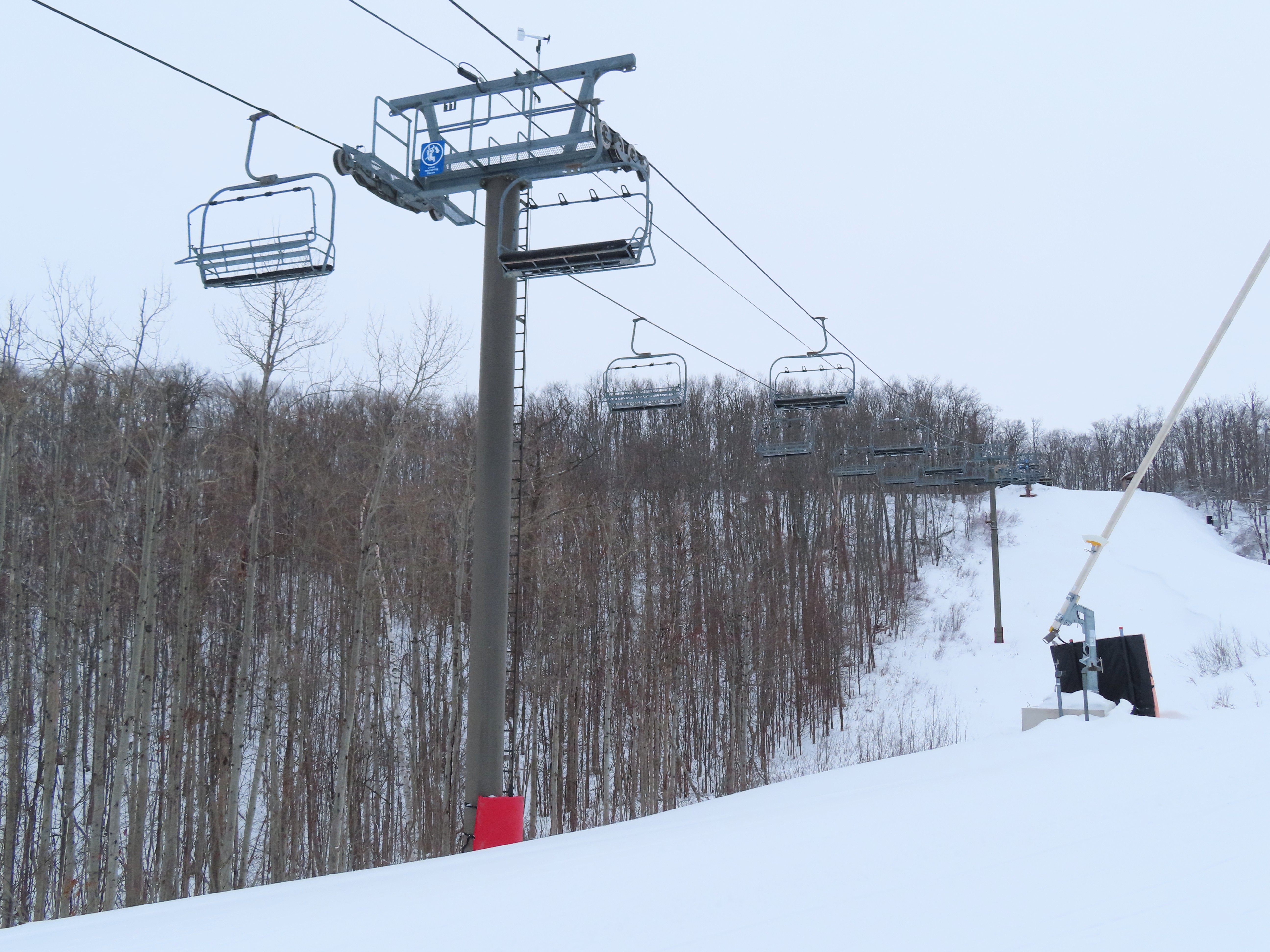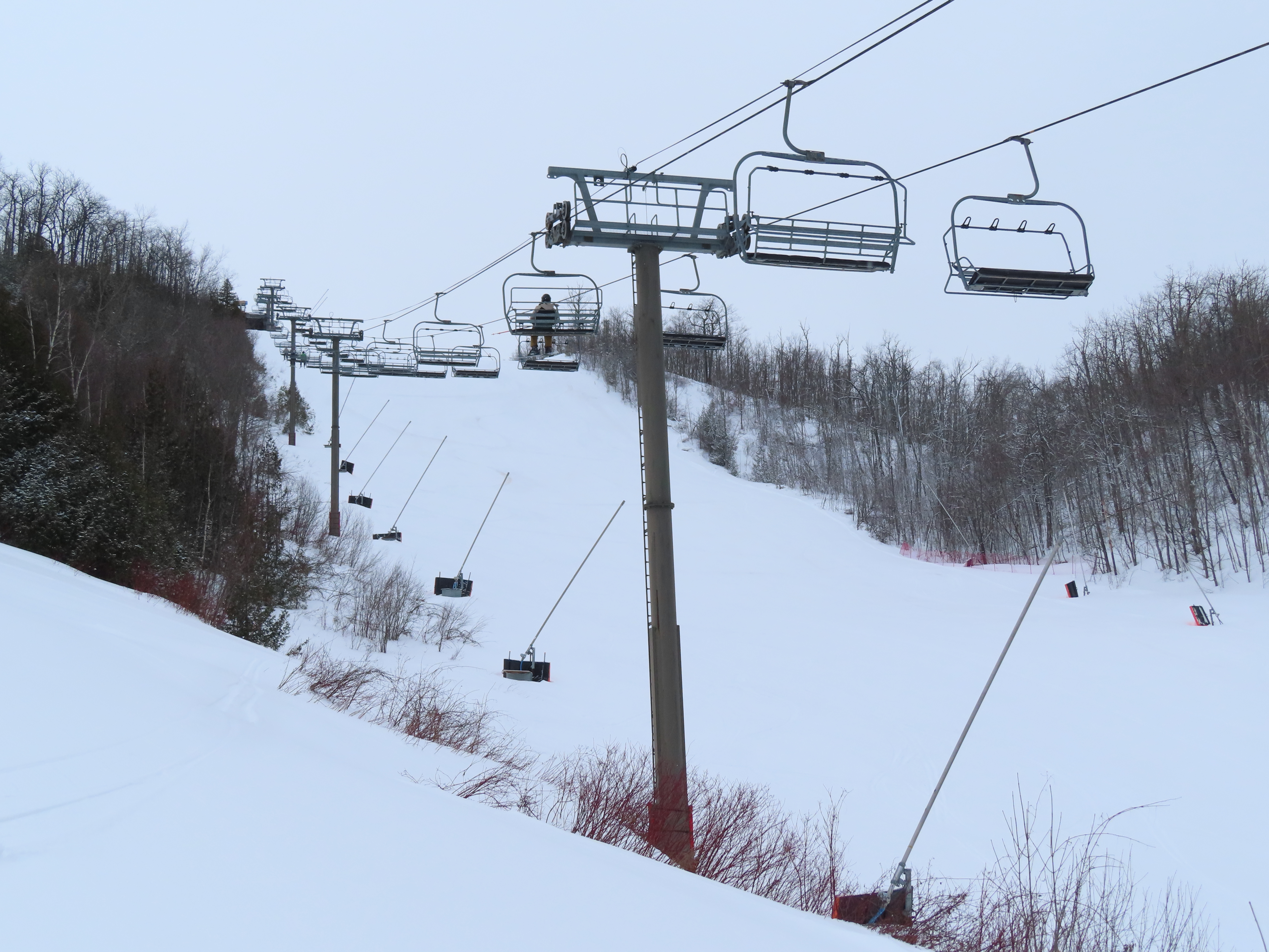 This Garaventa CTEC quad services the easternmost portion of the mountain.View up the line at tower 2.Side view of the drive-tension station.Loading area.CTEC tower head.Super rare CTEC in eastern Canada.View back down the line.Middle station with optional unloading.Towers 10 and 10A.Very tall tower 12.Arriving at the summit.Orion return terminal.Unloading area.View from the summit.The last two towers.Mid-station overview.Upper line above the mid.Tall tower 7.Lower lift line.View up the main face of V-Hill.Lift overview.