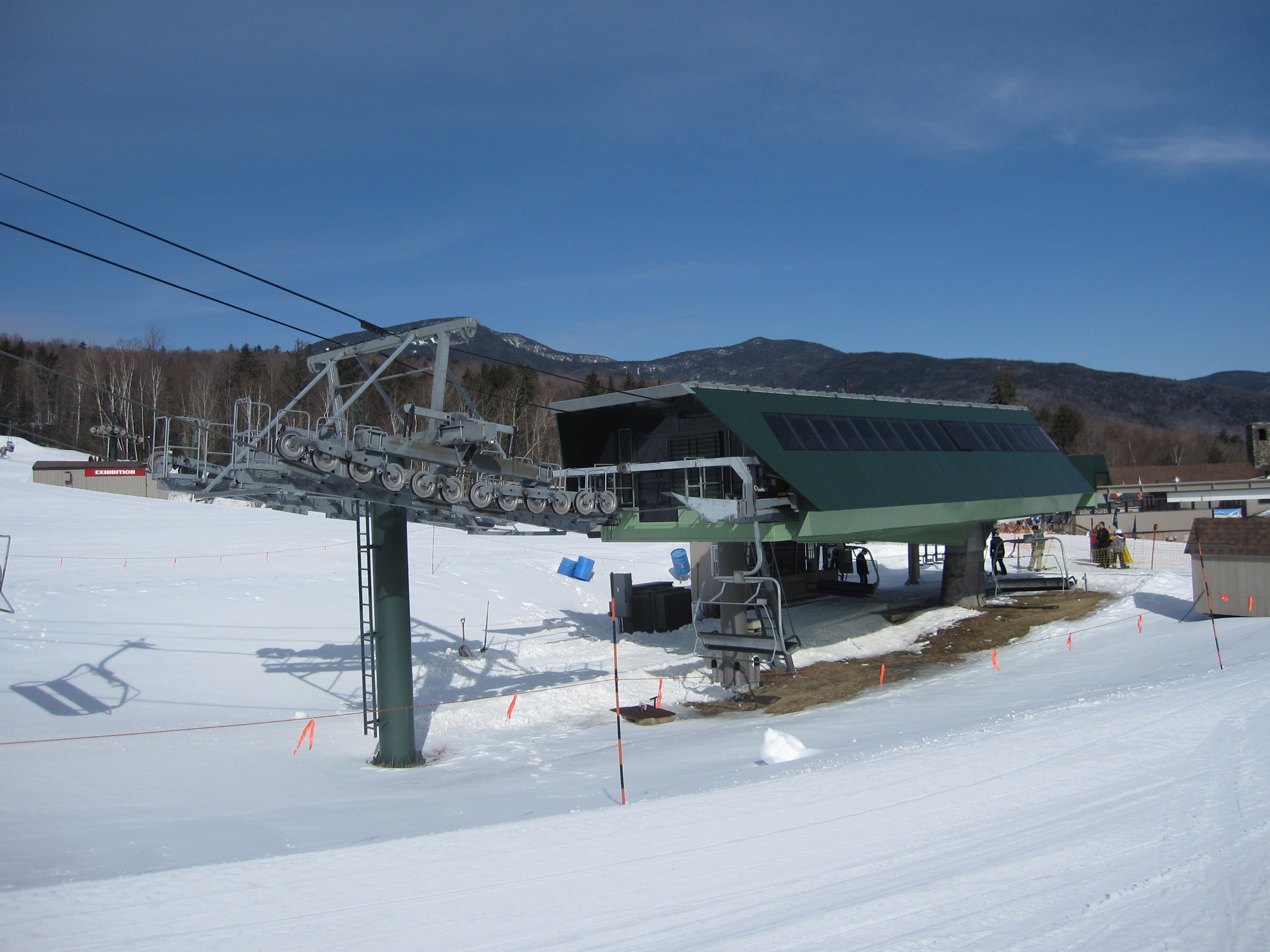 Top terminal in winter.Unloading area and lift shack.Top station from below.View down the lift line.Bottom terminal in green. It used to have a giant Waterville Valley basebell cap on the roof.Looking up from the base.Maintenance rail at the bottom.Departing the base station.Riding up.Arriving up top.Top station side view.Another view of the lift line.
