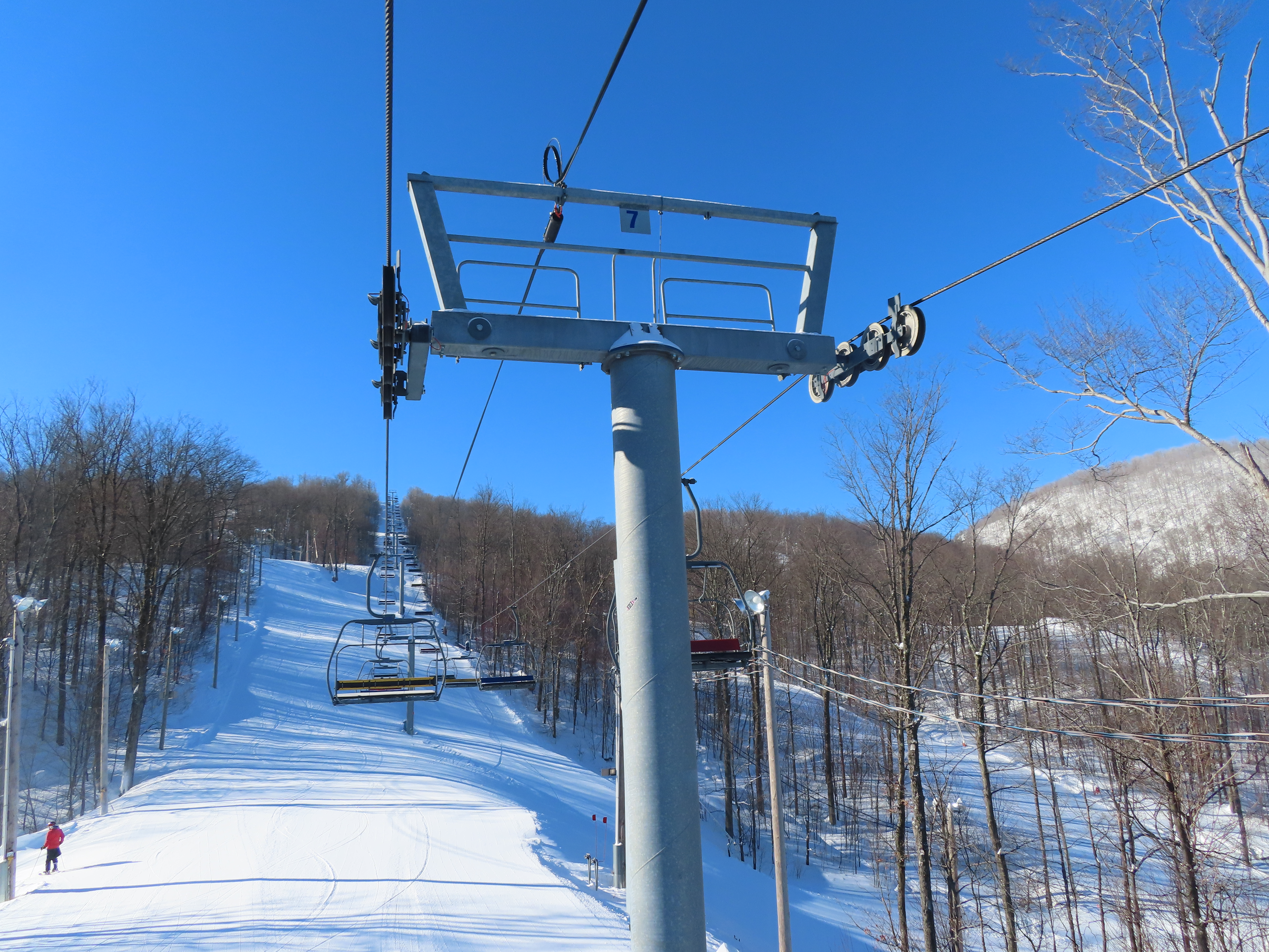 This Poma Alpha quad became the sixth new chairlift in six years for Bromont in 2011.The equipment came used from Montjoye.Lift overview.Leaving the bottom station.View up at tower 7.Nearing the summit.This is one of the longer lifts at Bromont despite being fixed grip.Middle part of the line.View up after the first pitch.Lower part of the lift.