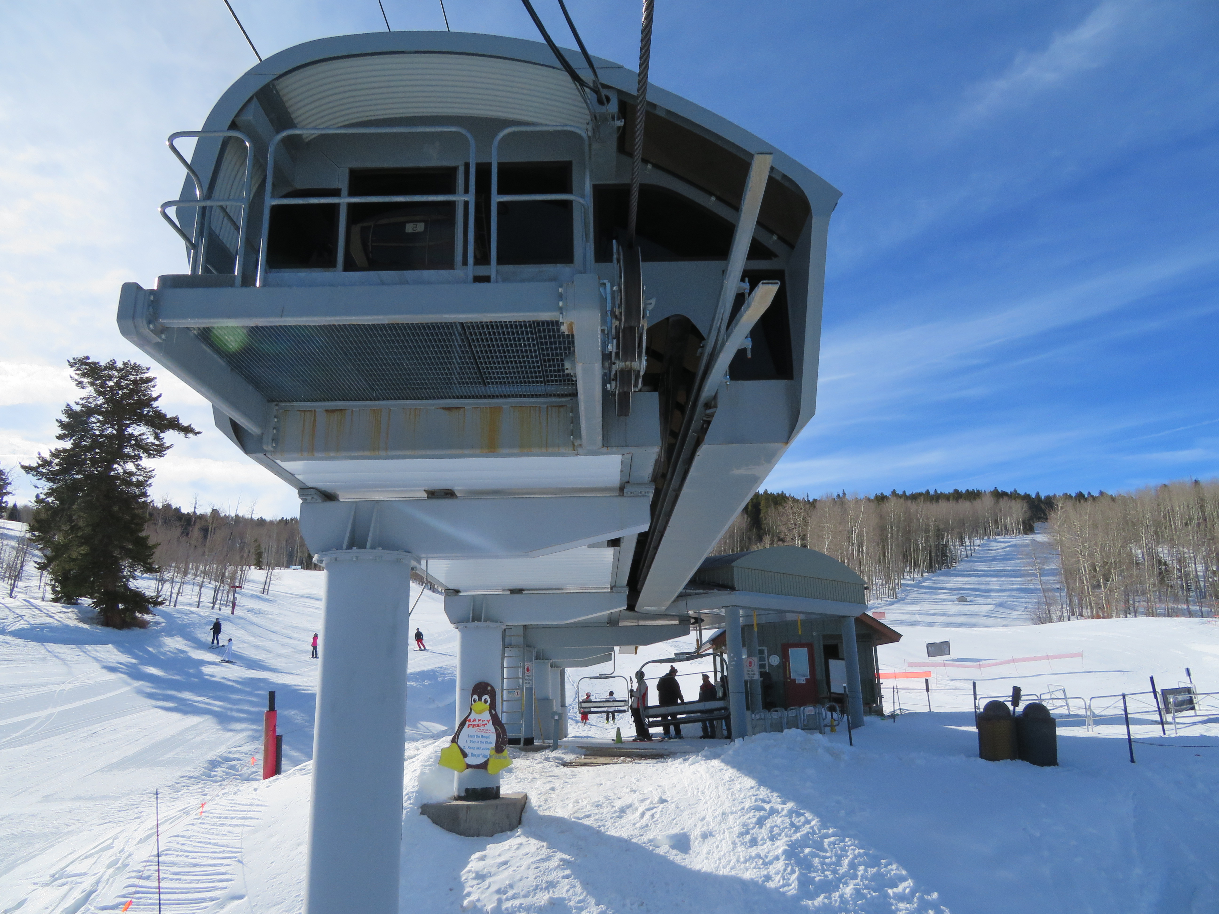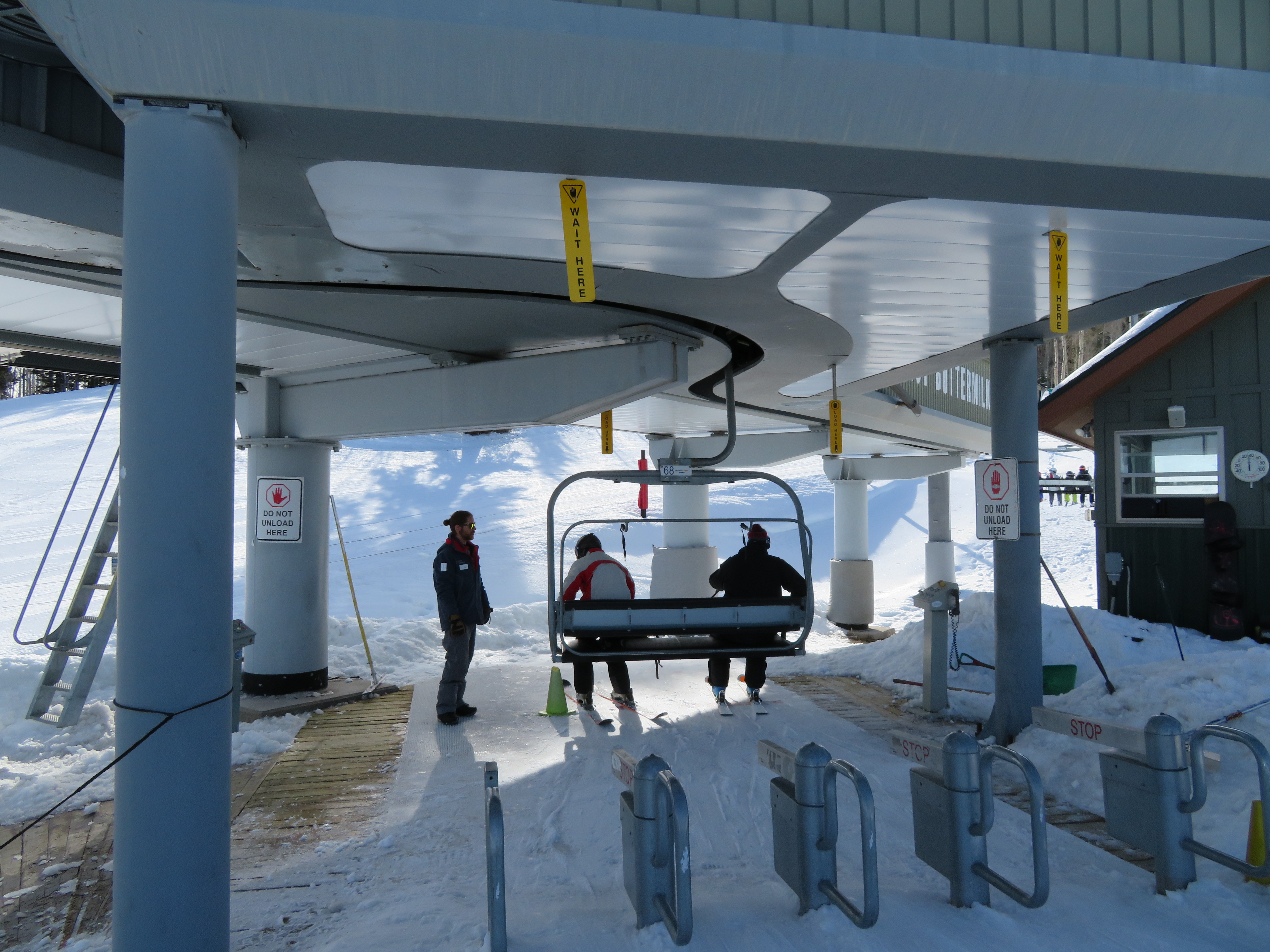 Interesting angled-load at midstation. Any idea why they went with this sort of arrangement? The straightline Doppelmayr version on Palmer seems to work fine with just the minimal decel/accel. Expected ability of customer base, maybe?