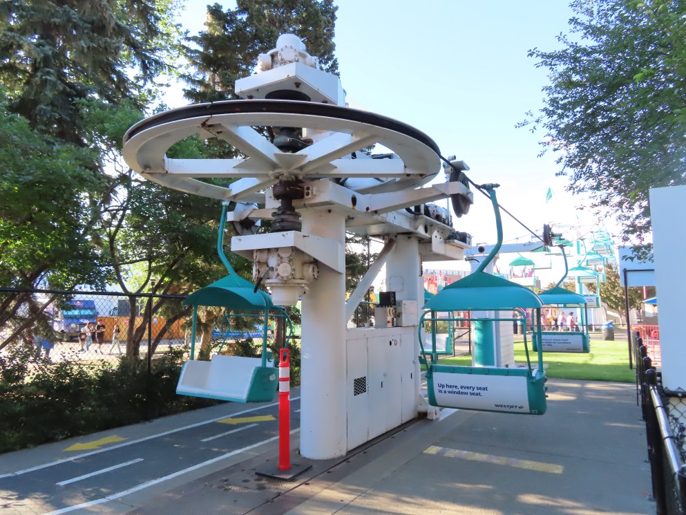 This is an OD Hopkins Skylark, now called the Westjet Skyride. It was installed in 1976 and my company has been maintaining and operating it each Stampede since 1978. I’ve been operating and maintaining it since 2017 when I took over ownership of Quadra Industrial. This is not operated by North American Midway but they do operate (and own?) the one in Toronto, not the one in Calgary.