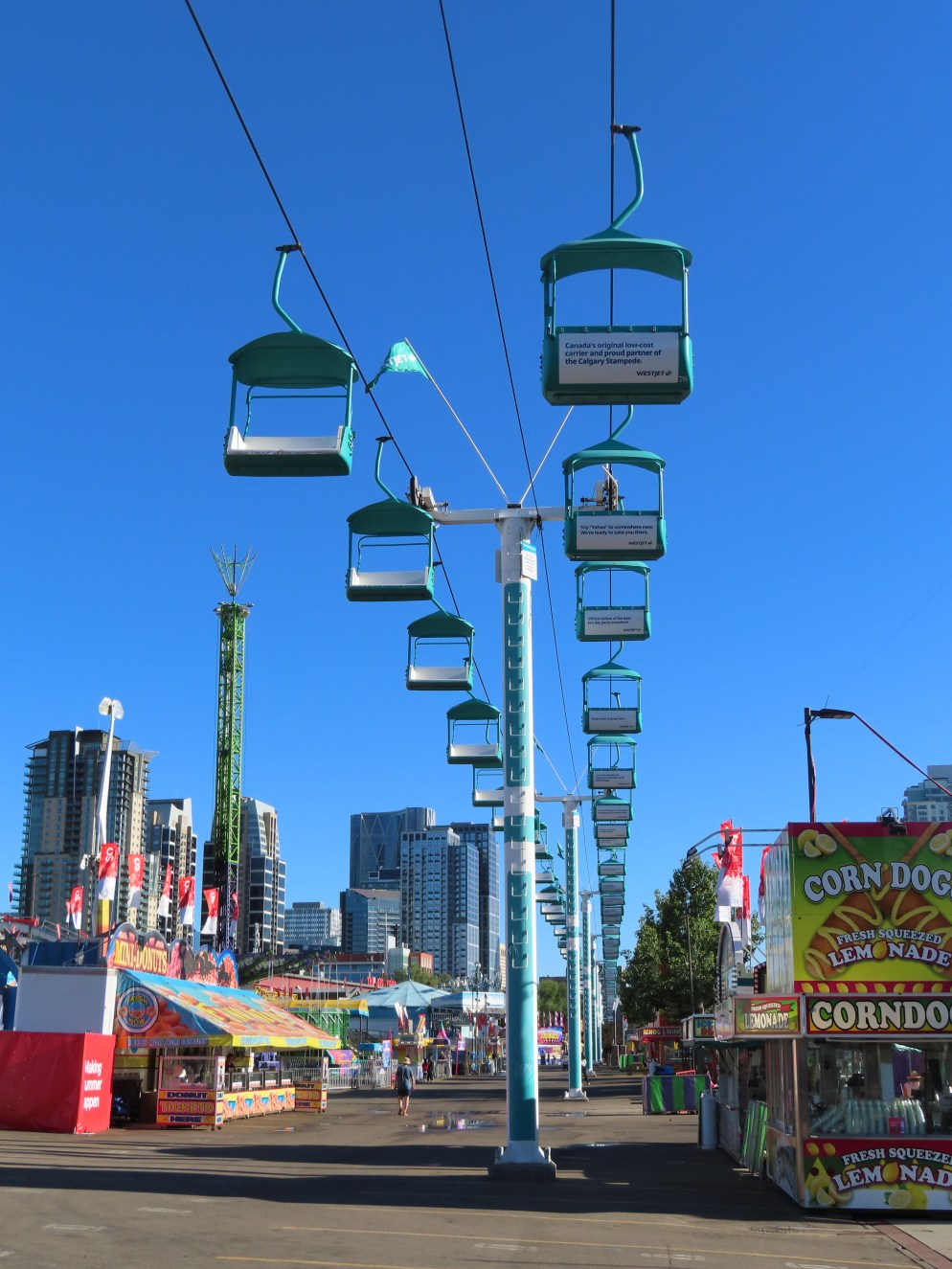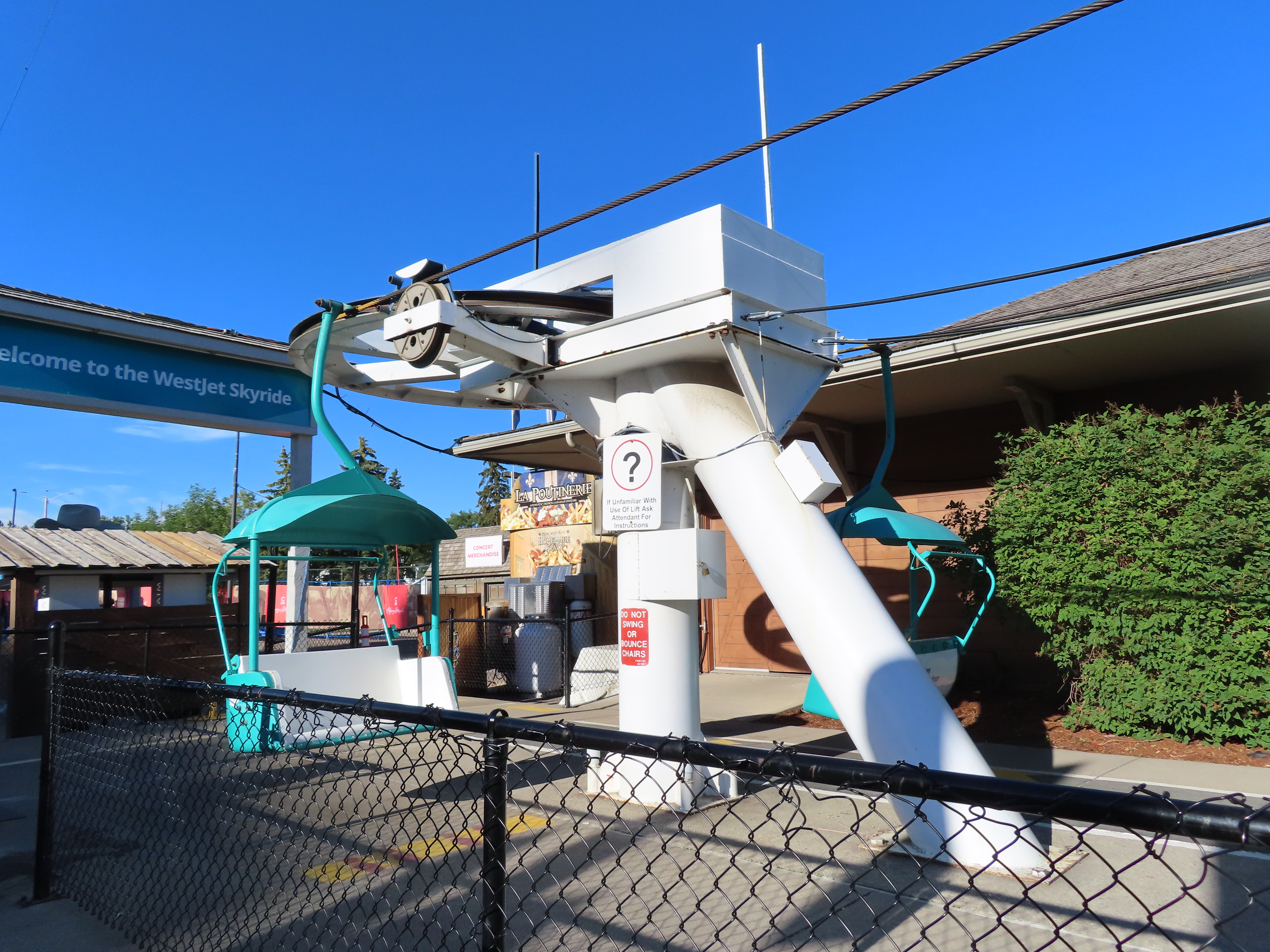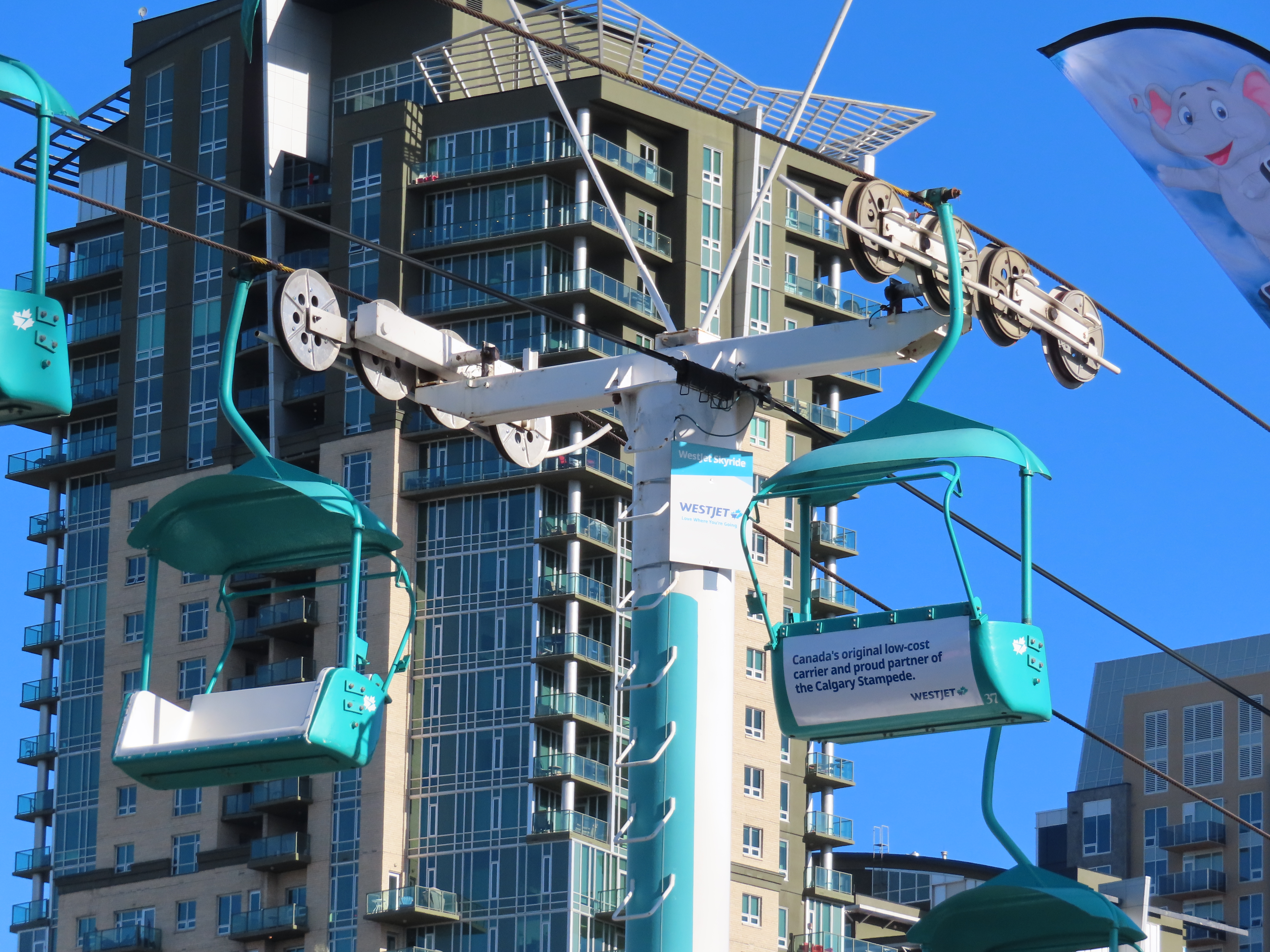 This Hopkins skyride, one of just two in Canada, operates 10 days a year during the Calgary Stampede.In recent times the ride has been sponsored by Canadian airline WestJet.Chairs over the midway.Although WestJet sponsors the ride, it is operated by Quadra Industrial Group.View south.Towers and chairs in WestJet colours.The southern end of the lift line.View toward downtown Calgary.The southern return station.Loading area.Side view of the return station.View north.A chair for two adults.Each chair features a different message on the back.Drive bullwheel.View south from the north station.