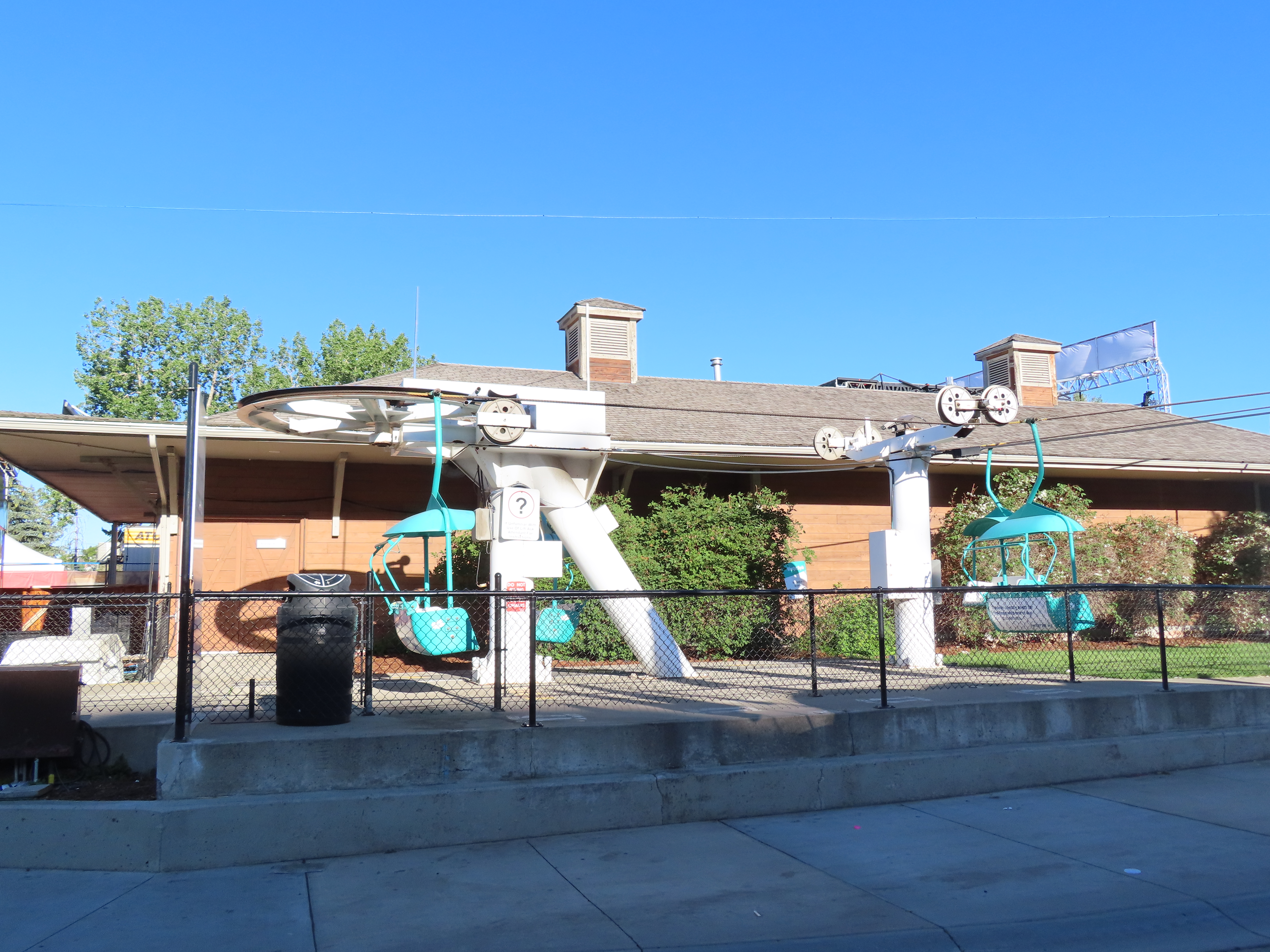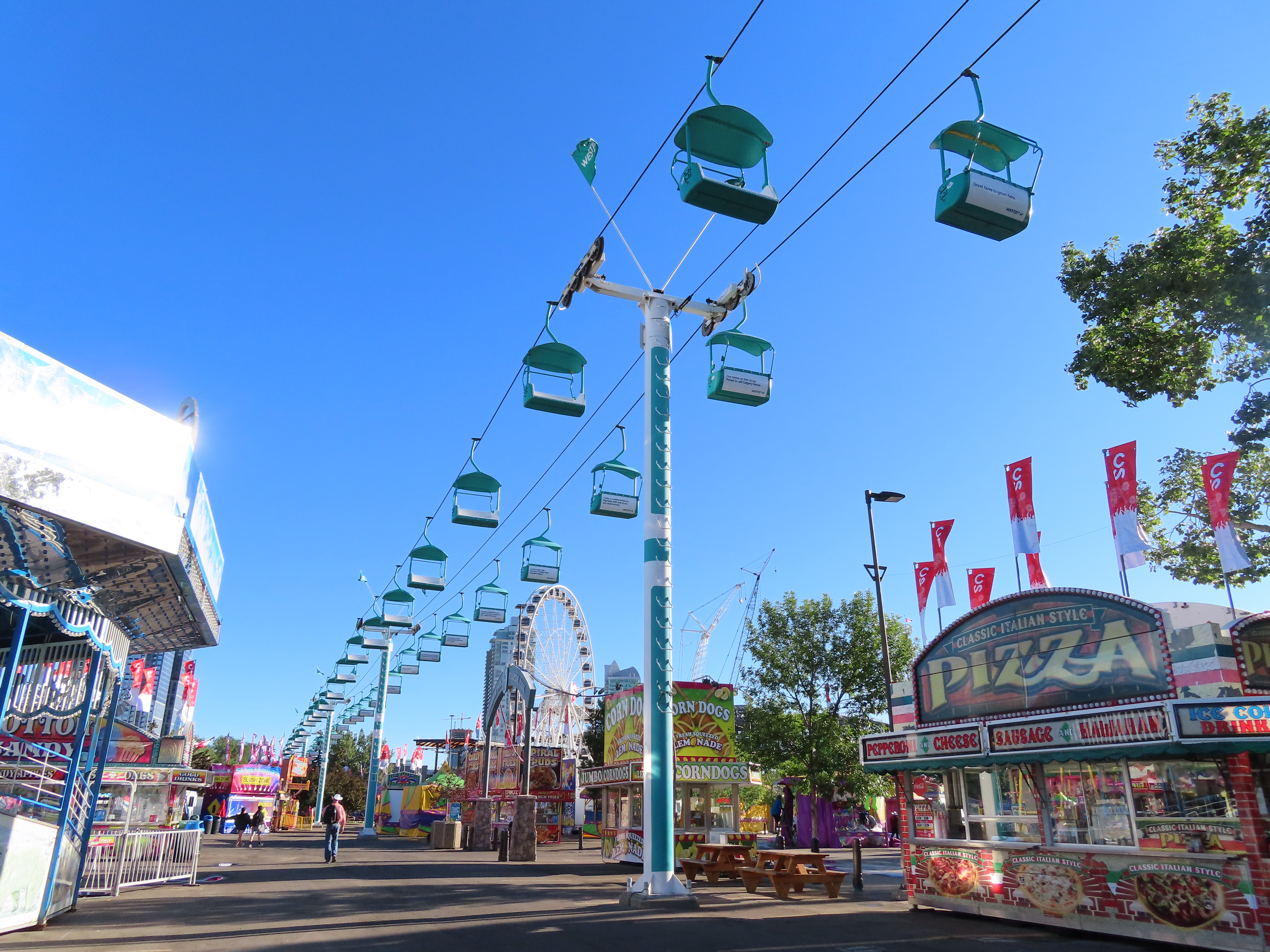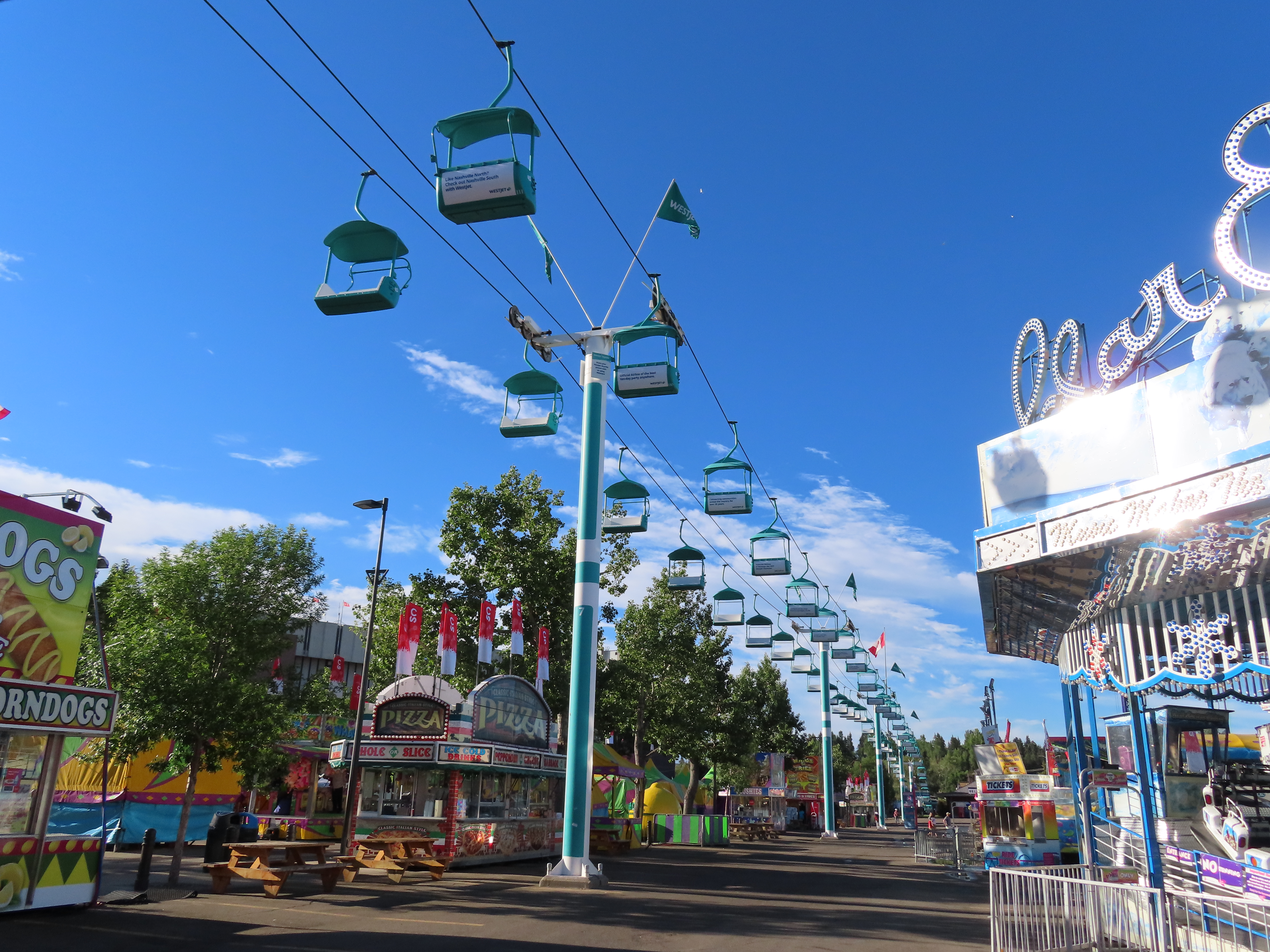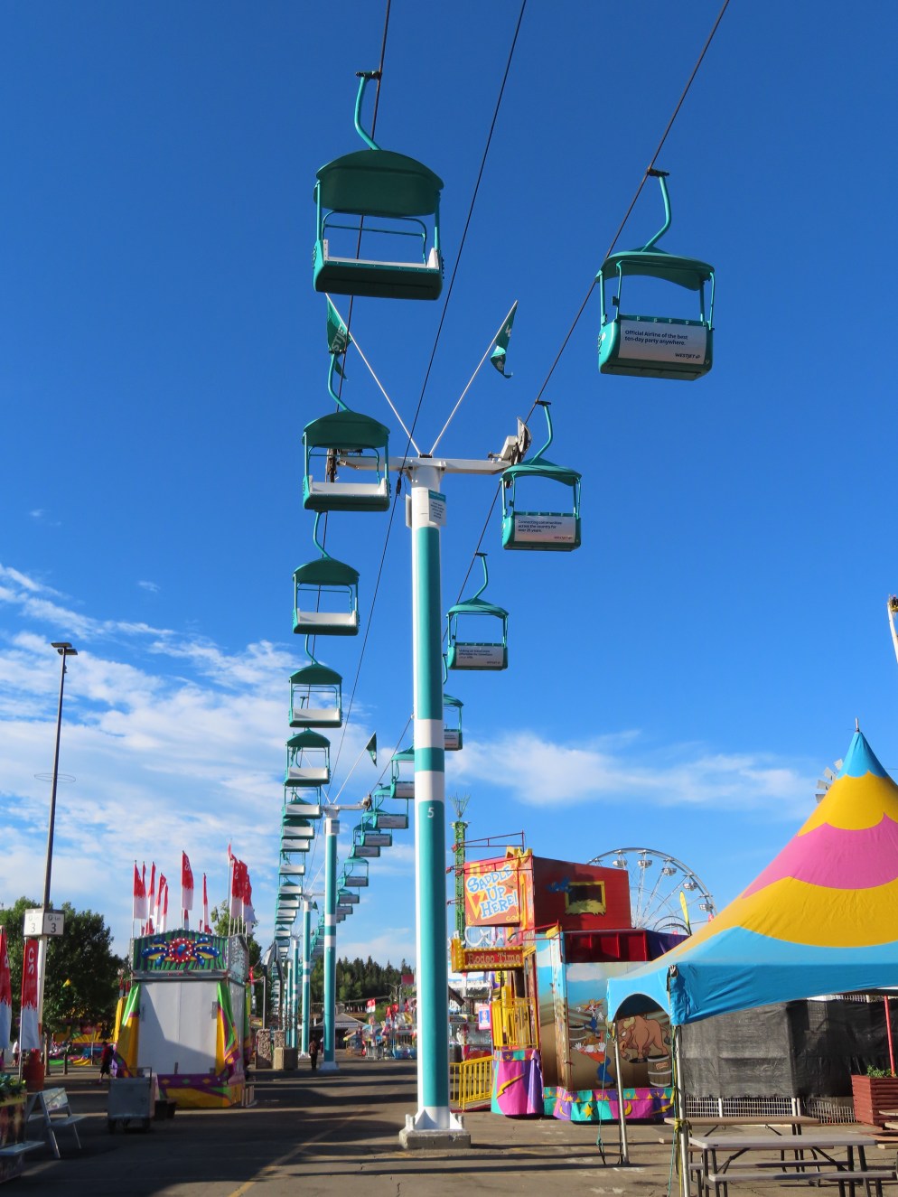 This Hopkins skyride, one of just two in Canada, operates 10 days a year during the Calgary Stampede.In recent times the ride has been sponsored by Canadian airline WestJet.Chairs over the midway.Although WestJet sponsors the ride, it is operated by Quadra Industrial Group.View south.Towers and chairs in WestJet colours.The southern end of the lift line.View toward downtown Calgary.The southern return station.Loading area.Side view of the return station.View north.A chair for two adults.Each chair features a different message on the back.Drive bullwheel.View south from the north station.
